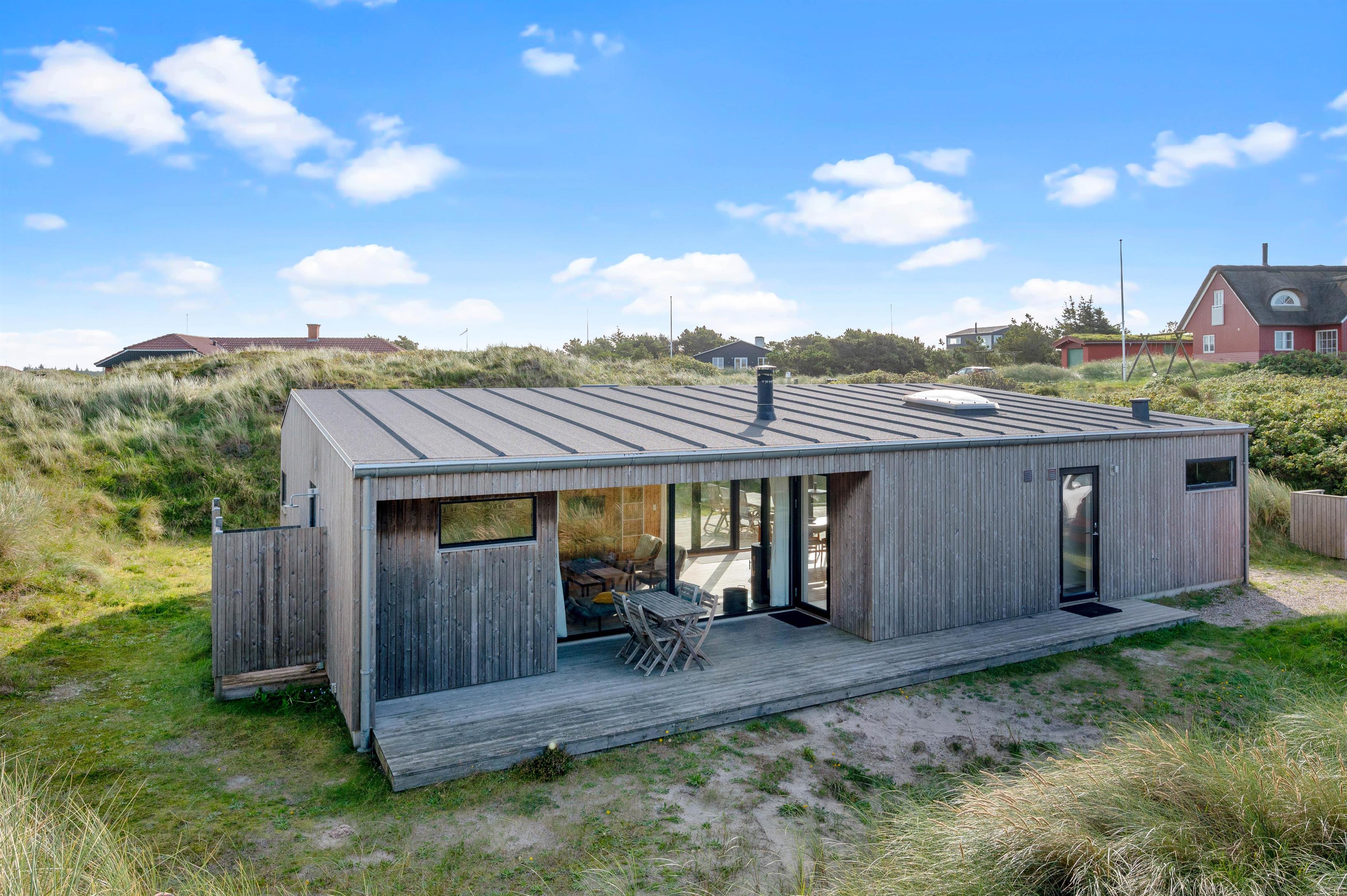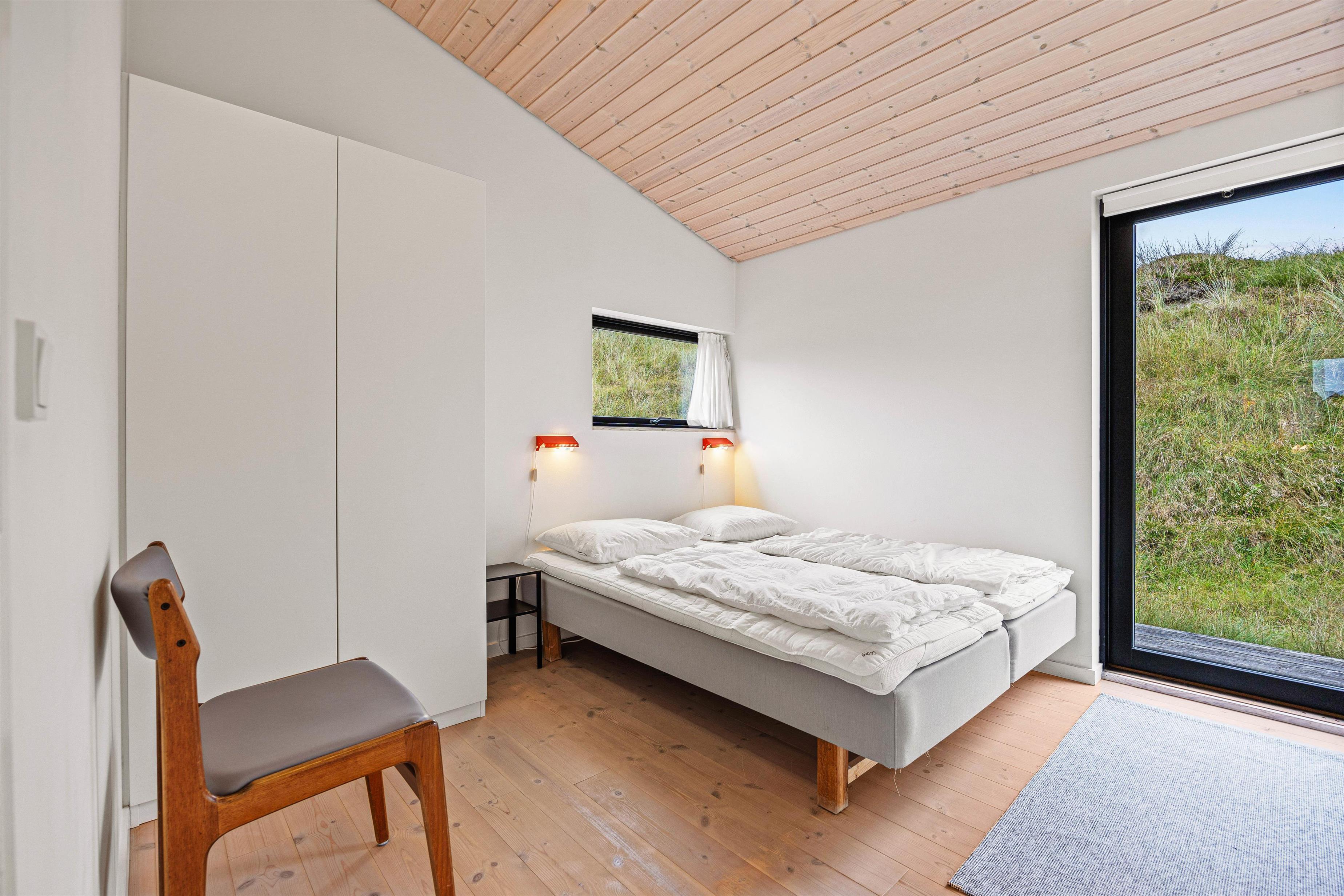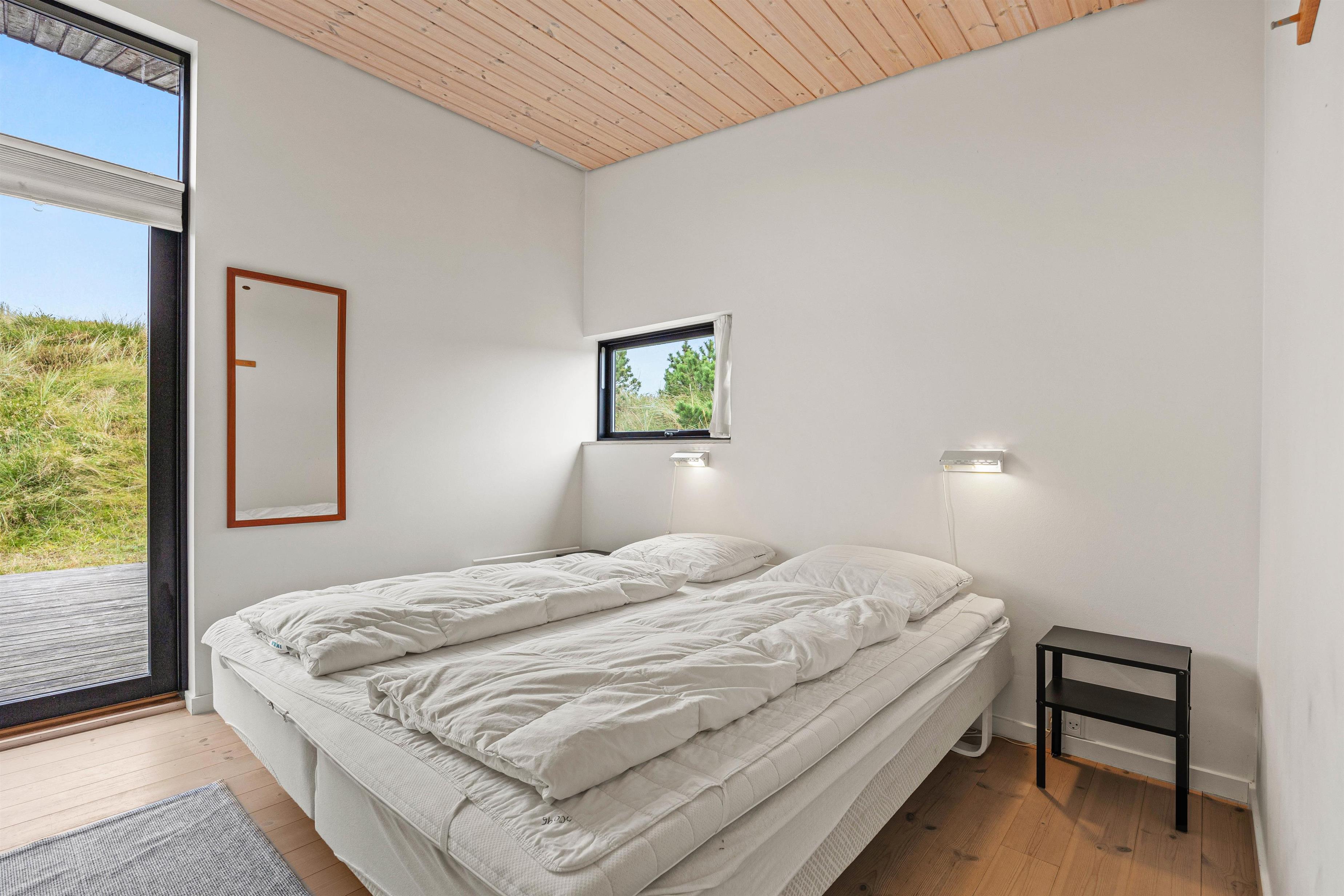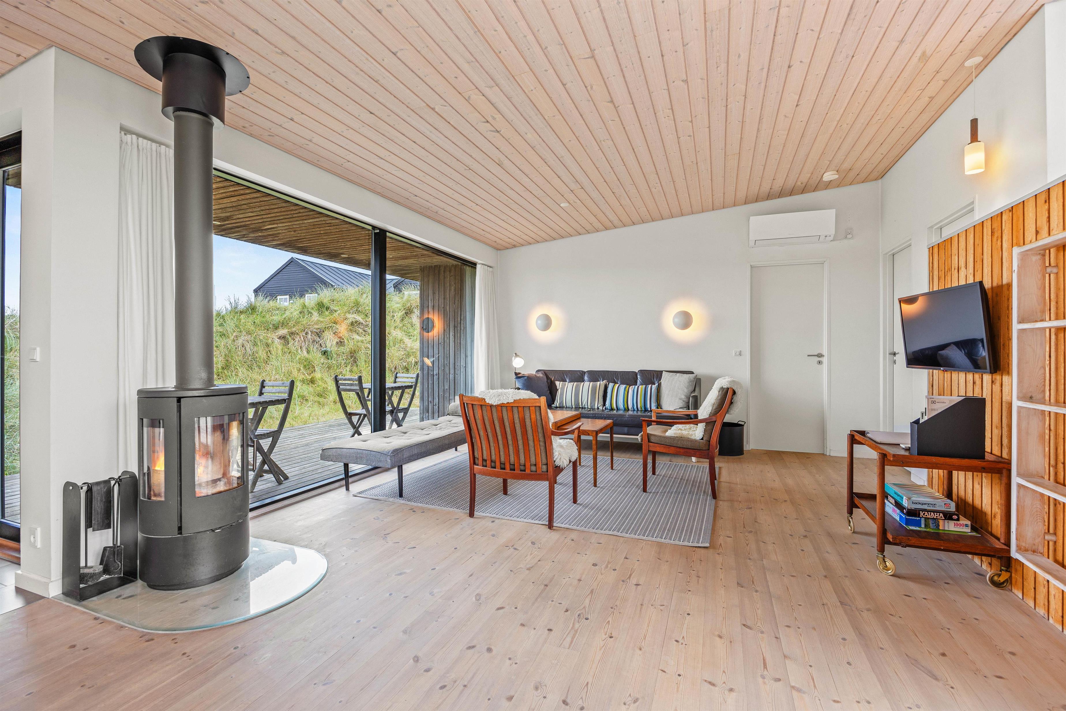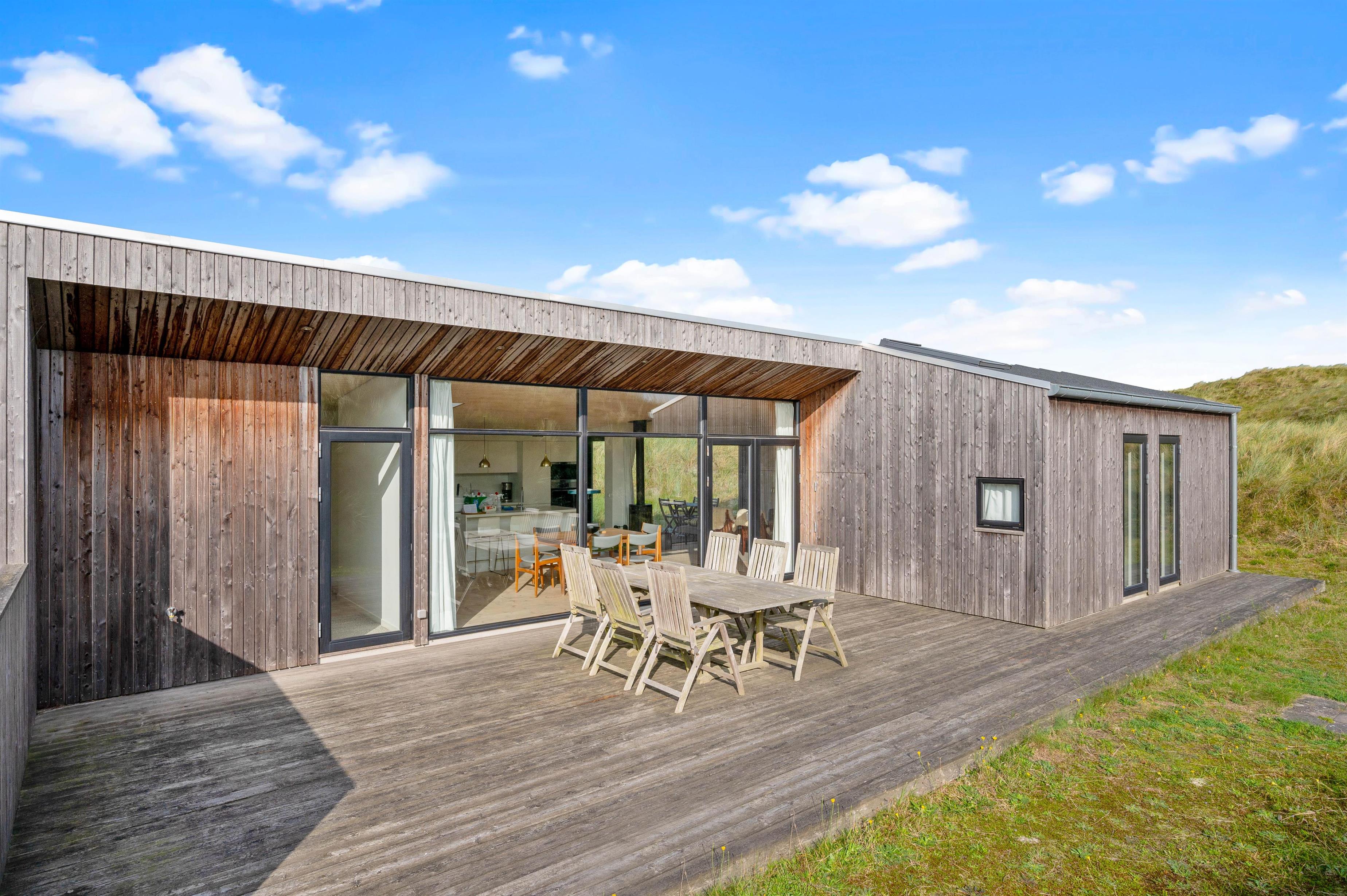 De store vinduespartier og ovenlysvinduer lukker masser af lys ind i sommerhuset, der skaber en god atmosfære at være i, og giver en god udsigt til den omkringliggende natur og de smukke klitter.