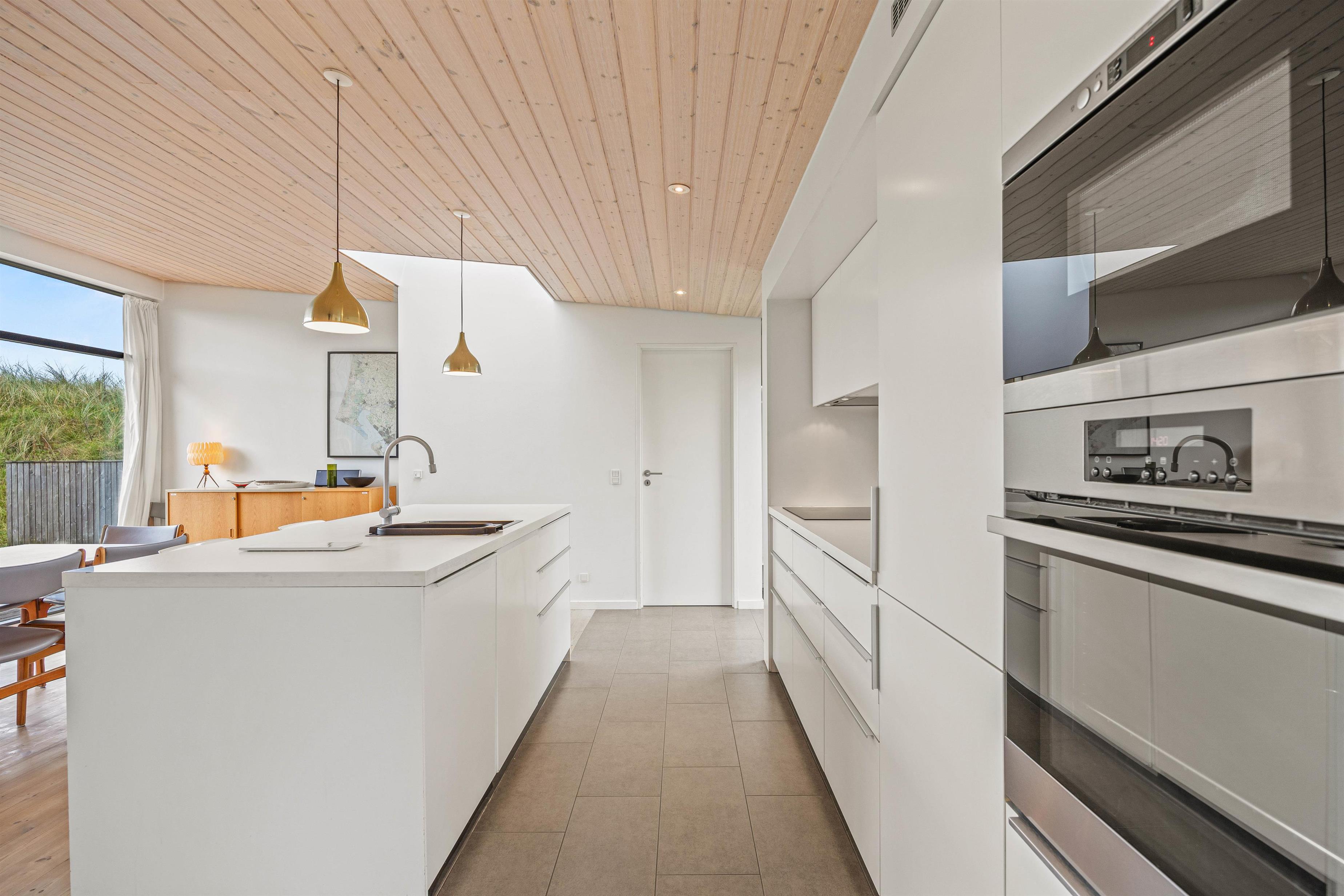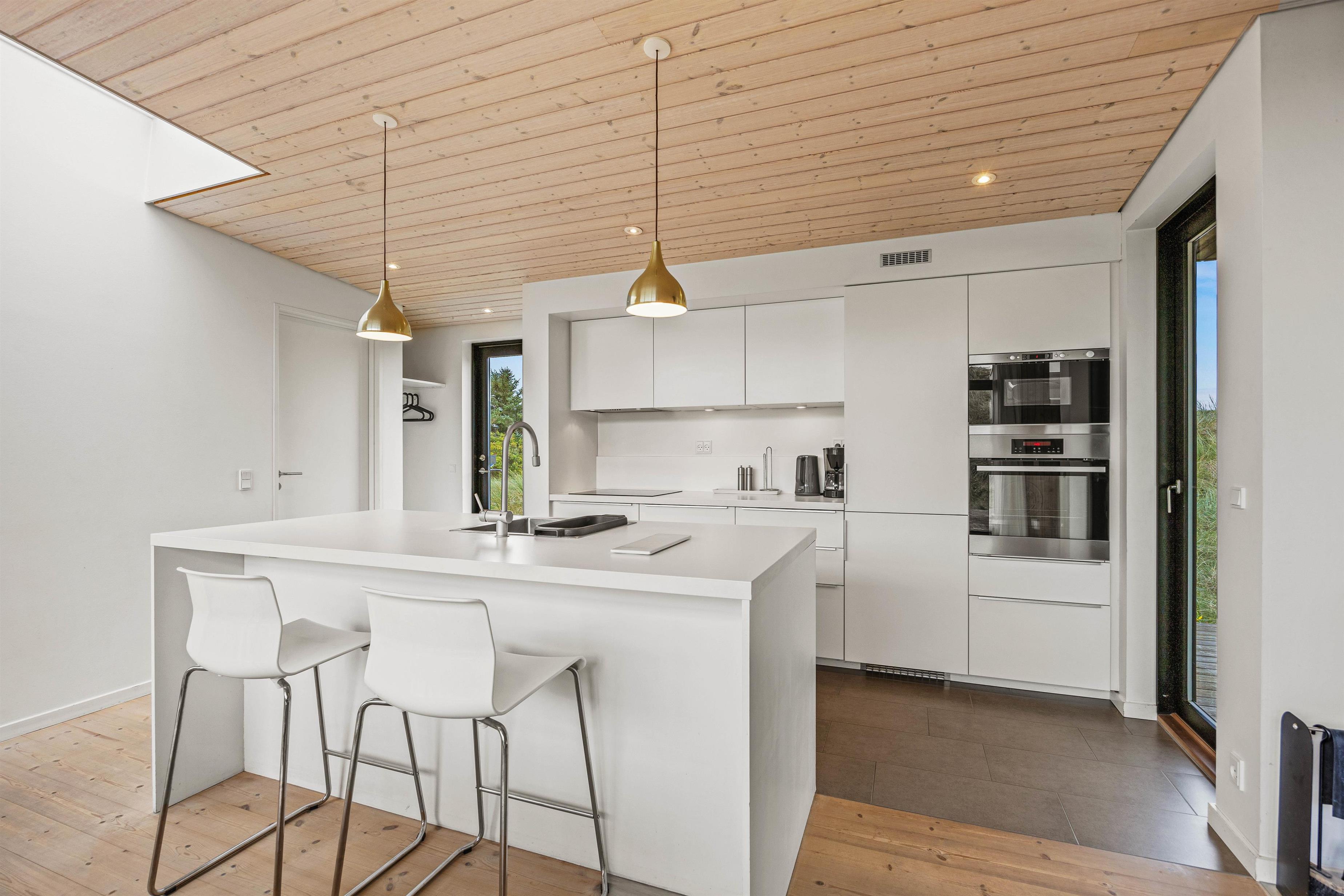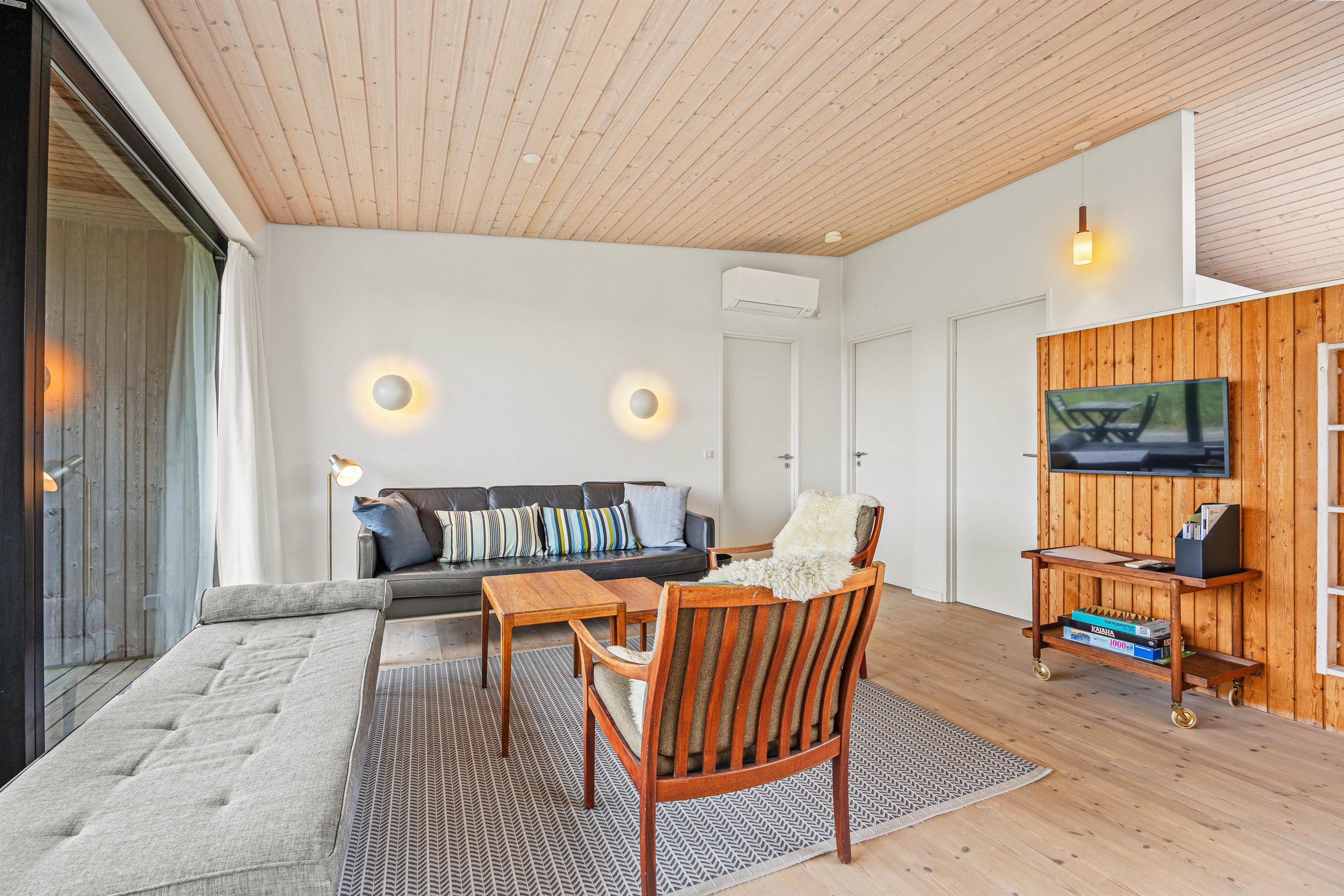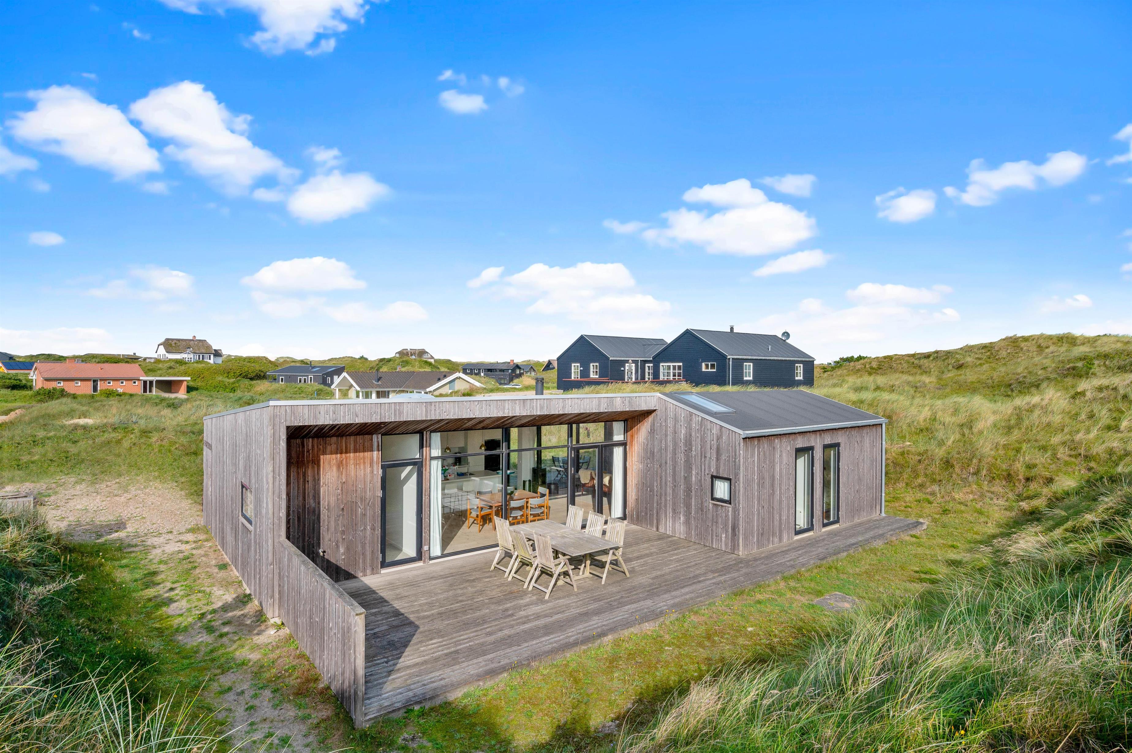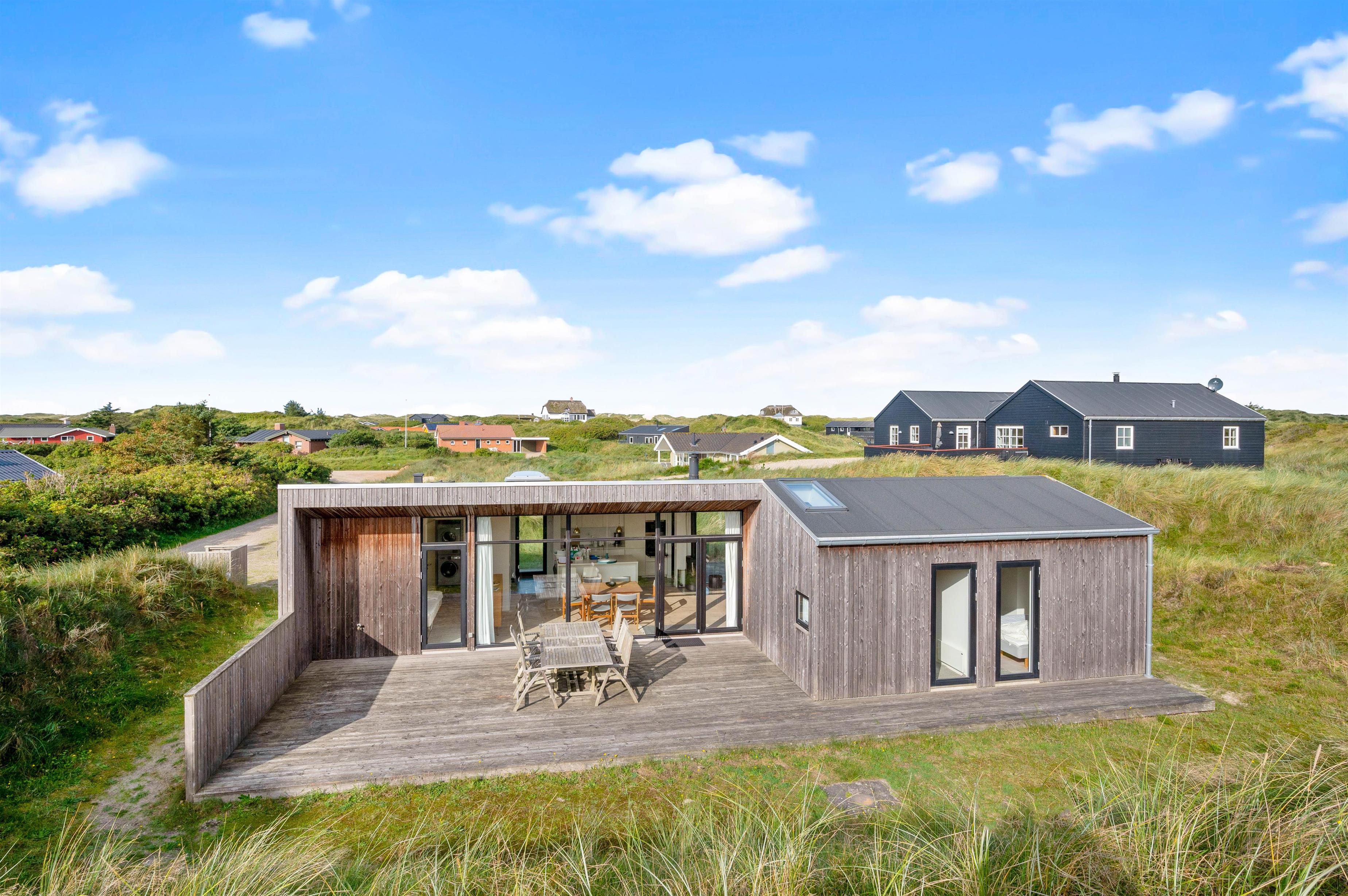 De store vinduespartier og ovenlysvinduer lukker masser af lys ind i sommerhuset, der skaber en god atmosfære at være i, og giver en god udsigt til den omkringliggende natur og de smukke klitter.