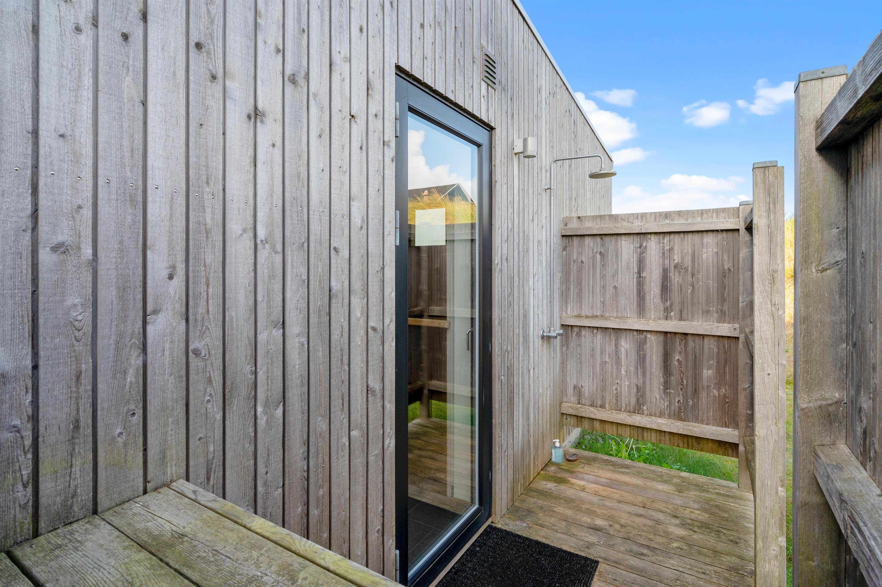 Særligt praktisk er, at der på sommerhusets nordside er anbragt en udebruser. Her kan I skylle jer af efter en tur på stranden. Fra udebruseren kan I gå direkte ind på det ene af sommerhusets badeværelser og evt. videre til saunaen, så I rigtigt kan få varmen igen efter strandturen. Udebruser er lukket fra 1. november til 1. april på grund af frosten.