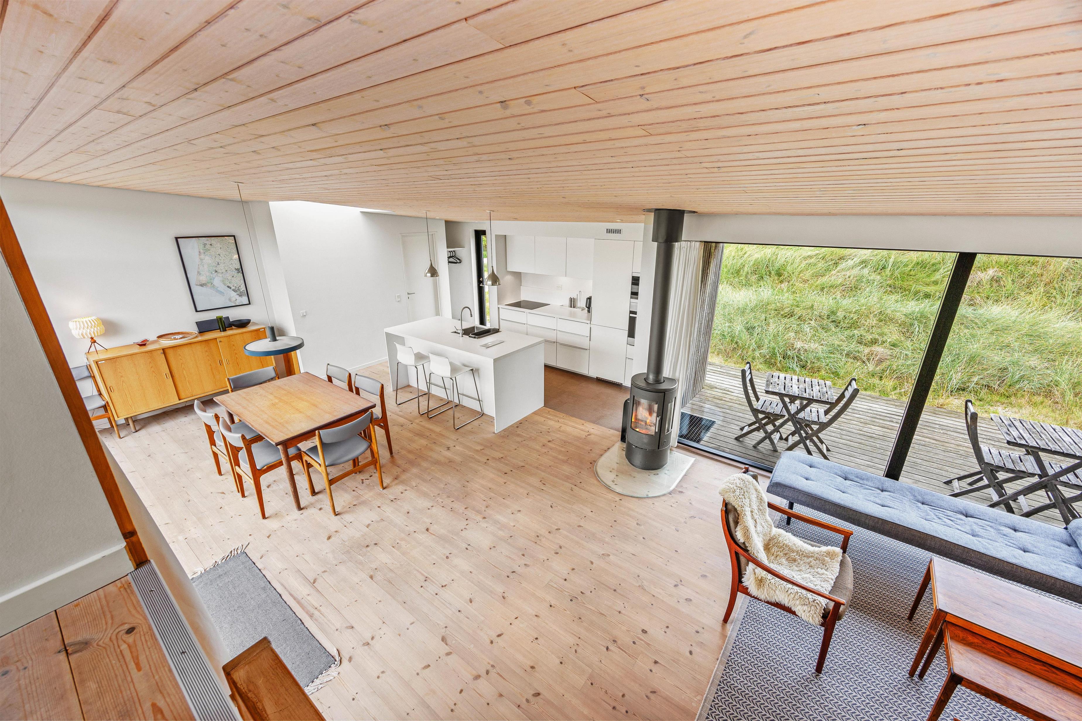 Sommerhusets samlingspunkt er opholdsrummet, hvor køkken, spisestue og stue bliver forenet i ét. Det er det perfekte sted at mødes, når de kommende feriedage skal planlægges eller til en hyggelig stund med en god film eller et sjovt spil omkring spisebordet. Brændeovnen i stuen fuldender den gode feriestemning.