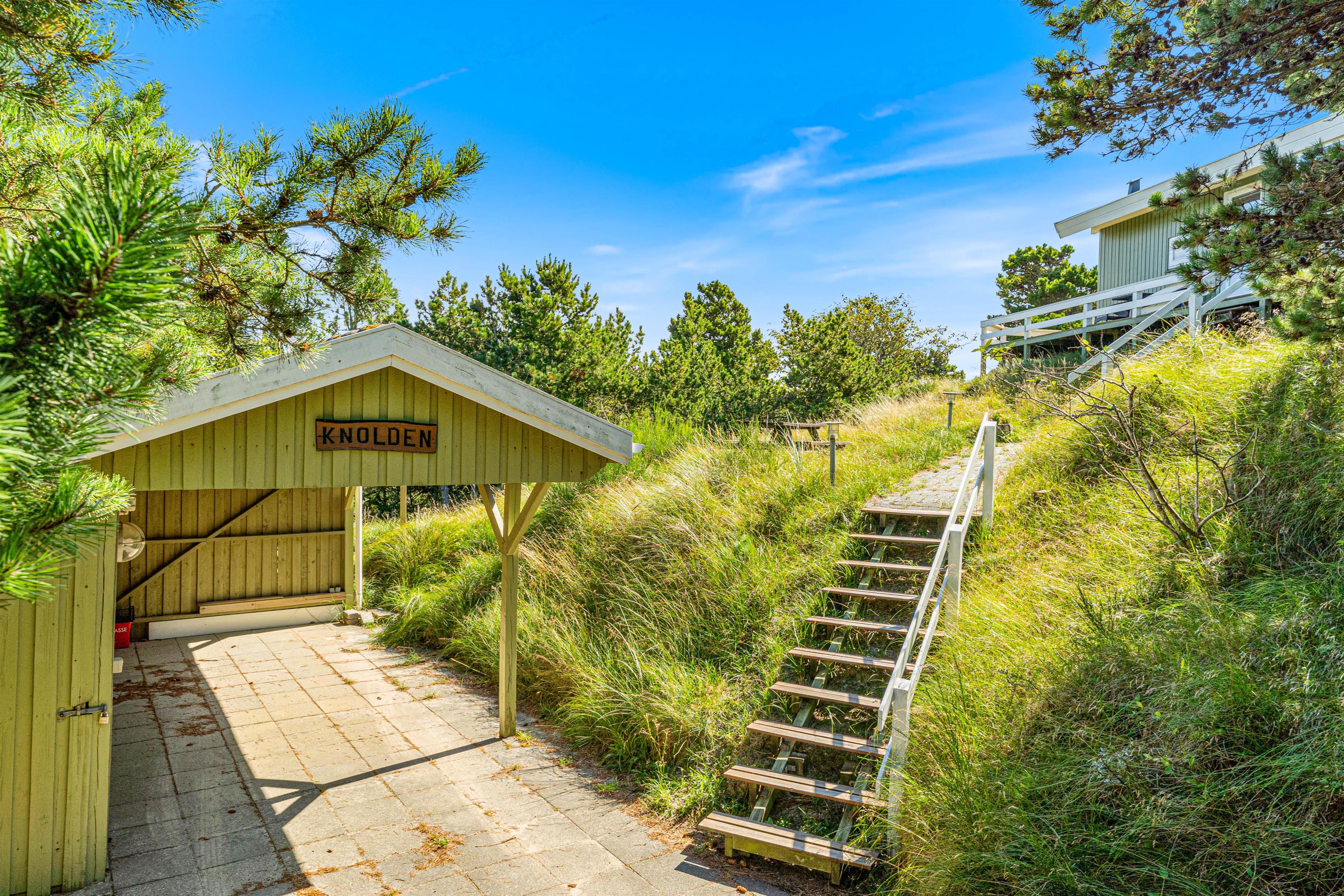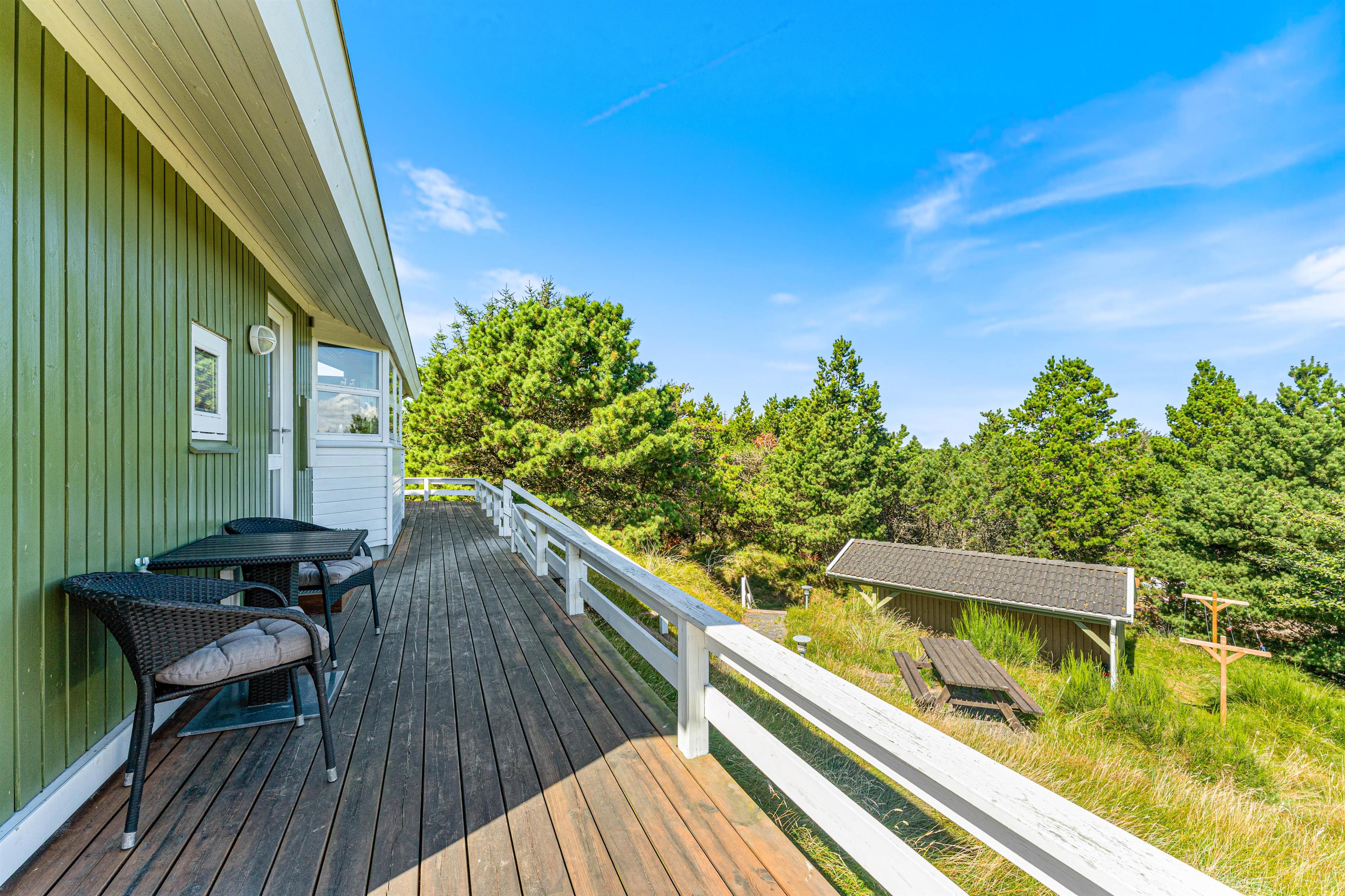 Stil bilen i carporten, inden I tager trappen op til feriehuset. Når I ankommer på terrassen, er feriestemningen sat! Her er udsigten slående, og I kan rigtigt fornemme områdets duft af Vesterhavet og fyrretræer. Terrassen bliver hurtigt omdrejningspunkt for dagens mange aktiviteter. Den er delvist overdækket og praktisk indrettet, så der altid er et hjørne til liggestolene med læ og sol, samtidig med at I har det store udsyn over området.