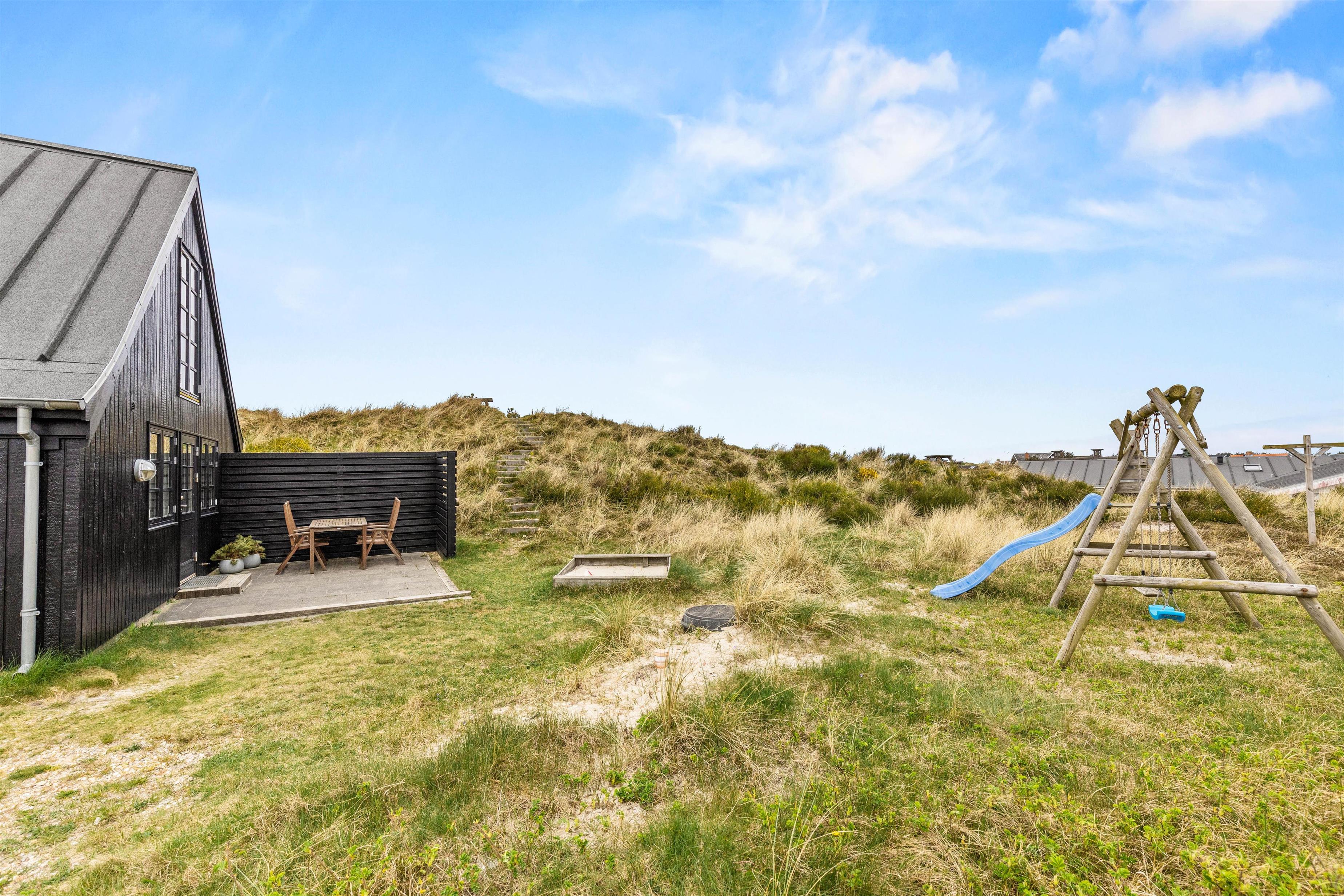 Blæst og rusk er intet problem på Ternevej 12, på grund af den store lukket og delvist overdækket terrasse.For børnene er der både sandkasse og gyngestativ, så de heller ikke keder sig når mor og far ligger og hviler på liggestolene.