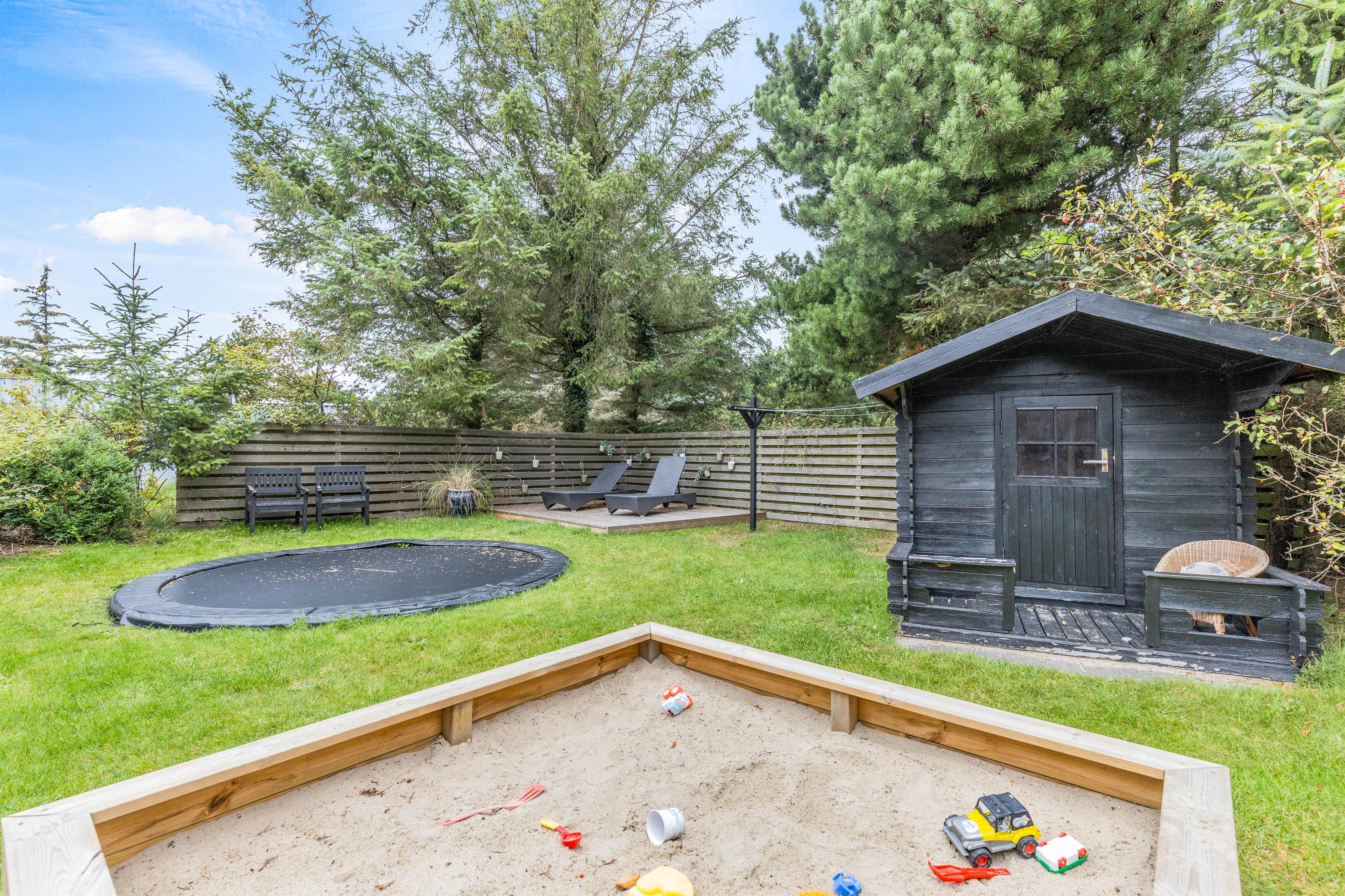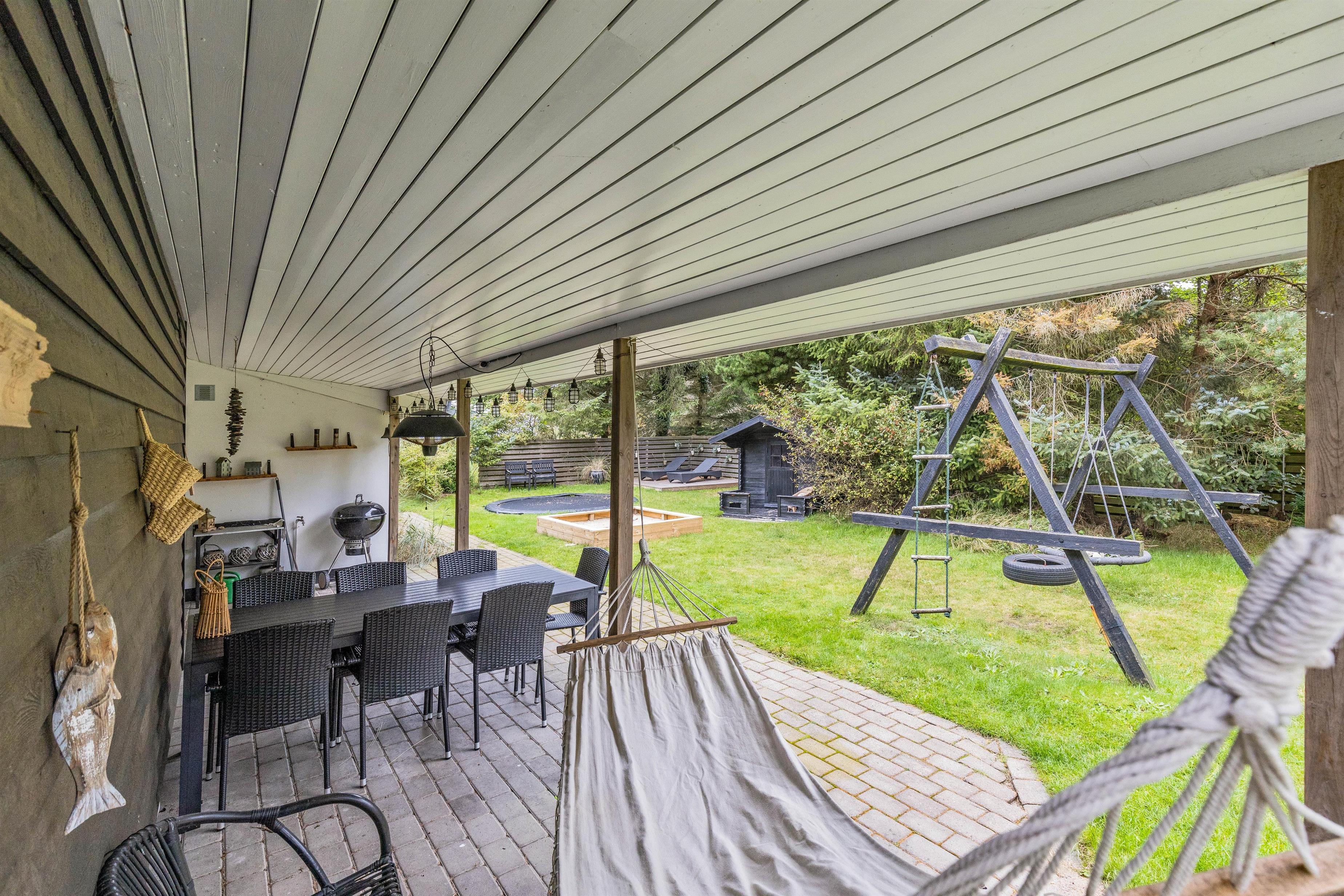 Mens afslapning er i højsædet for de voksne på terrasserne, kan børnene lege i sommerhusets have. Her er der både et gyngestativ og en sandkasse til dem, som de kan få glæde af i løbet af ferien.