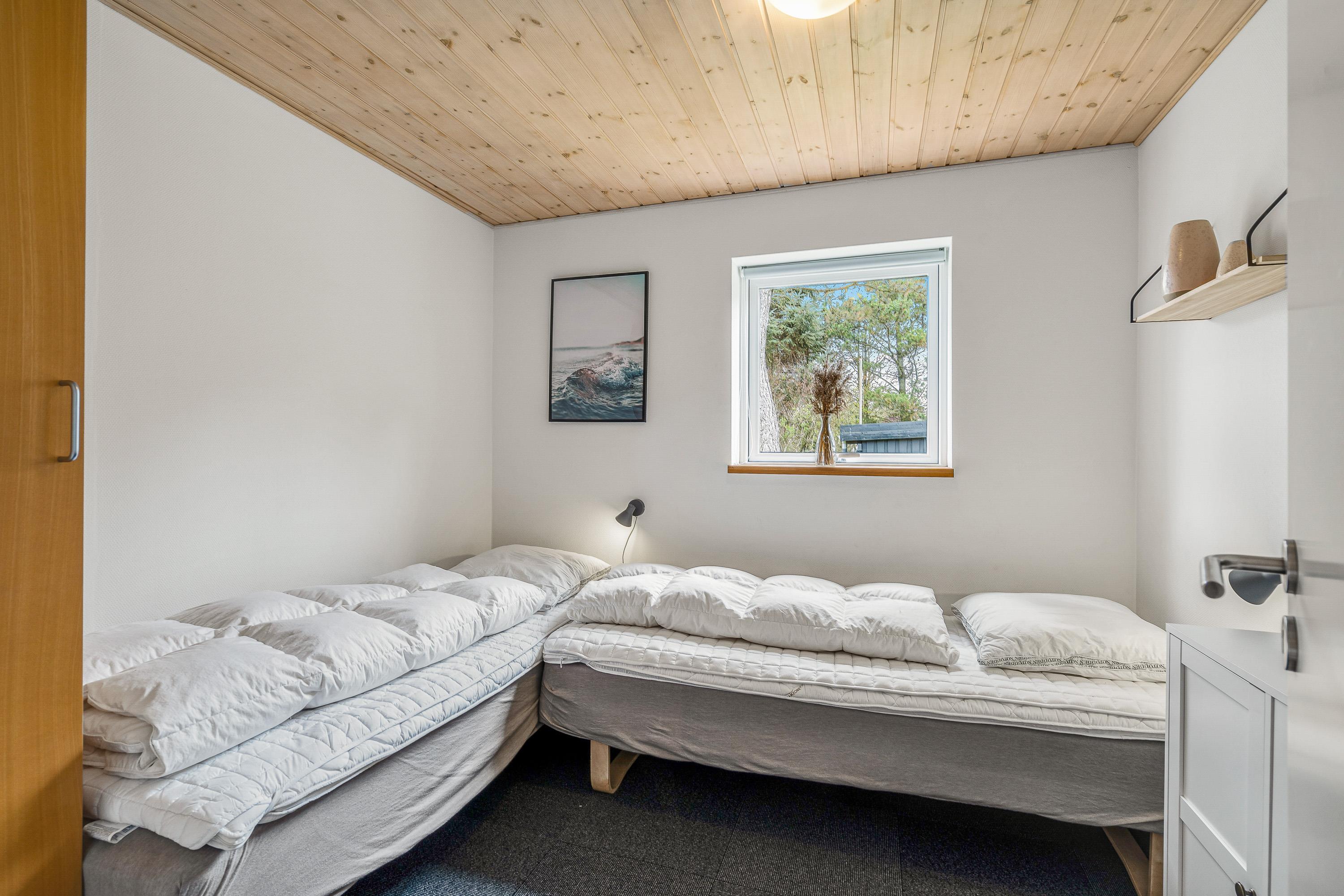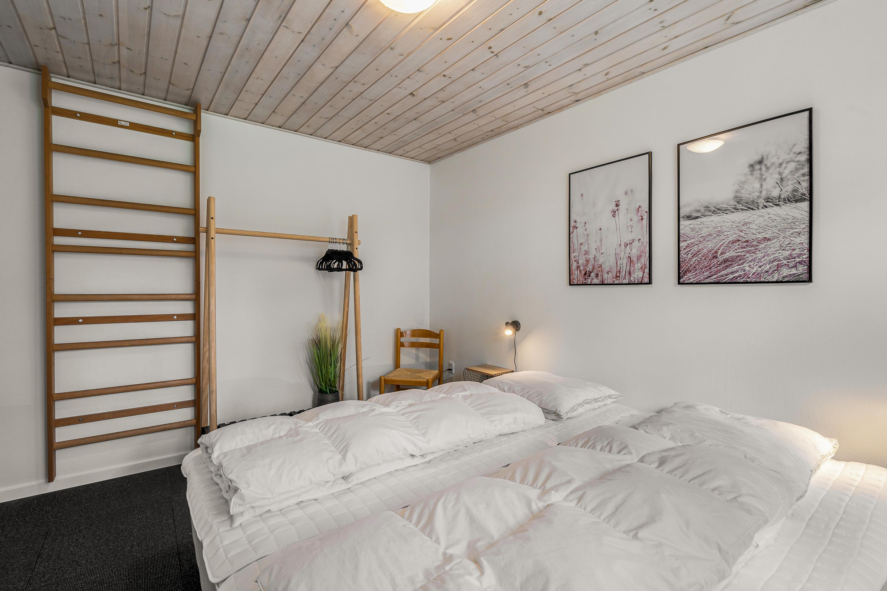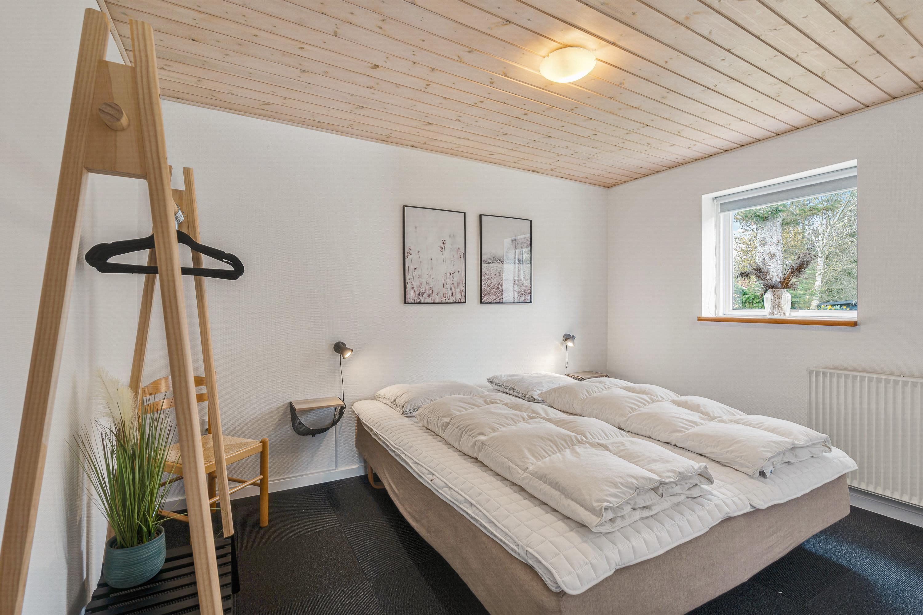 Det 129 kvadratmeter store sommerhus har en indretning, der er særdeles praktisk, hvis I er 2 familier på ferie sammen, da hver familie her kan få hver sin afdeling. I den ene ende af sommerhuset finder I 2 soveværelser og 1 badeværelse, og i den anden ende af sommerhuset finder I ligeledes 2 soveværelser og 1 badeværelse.