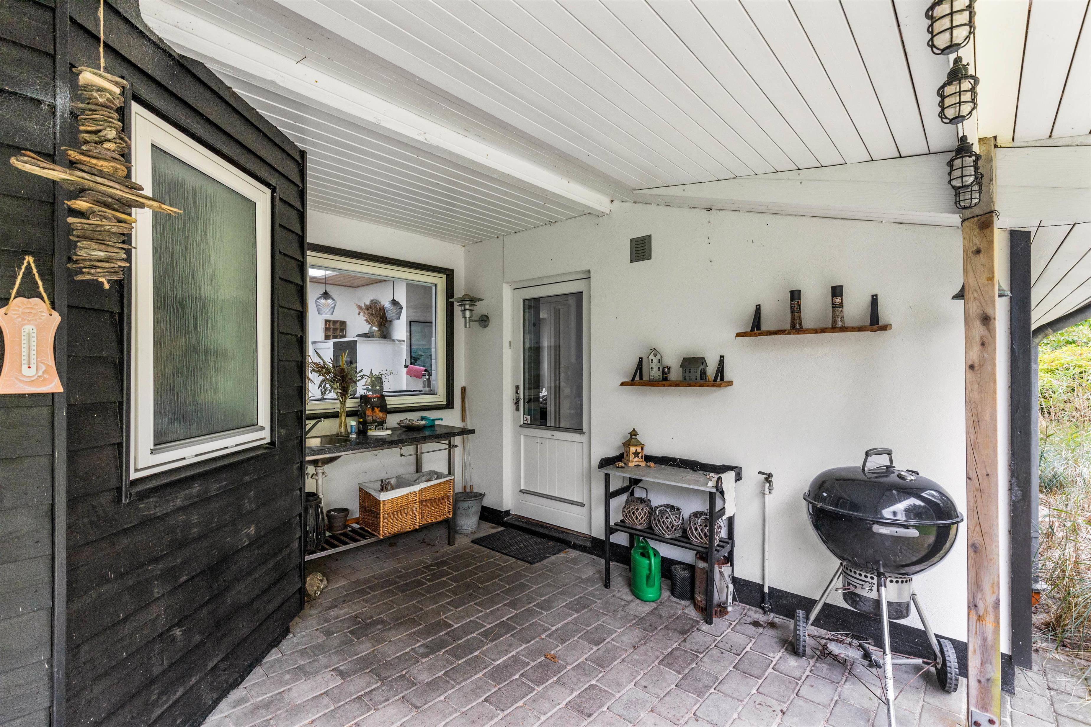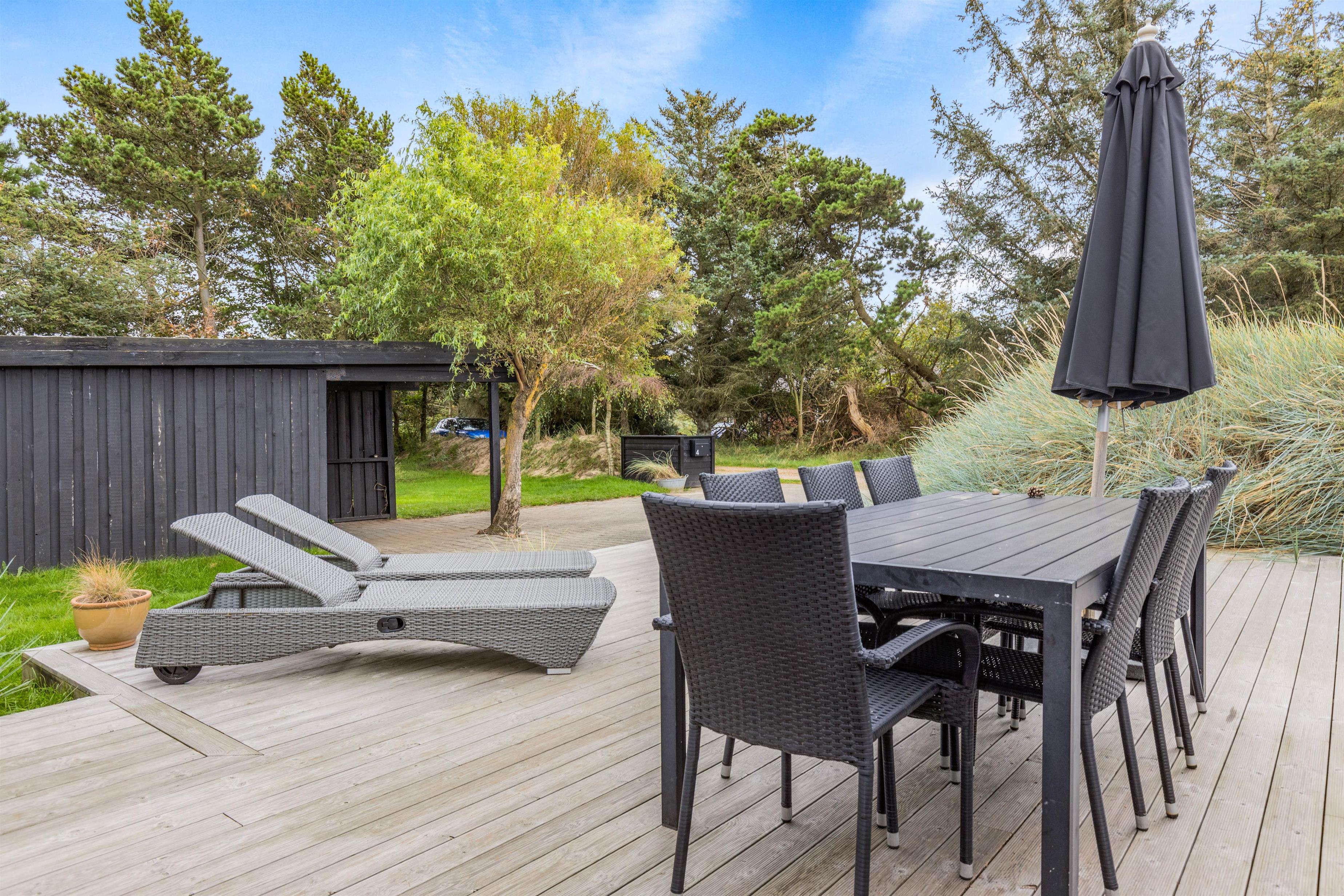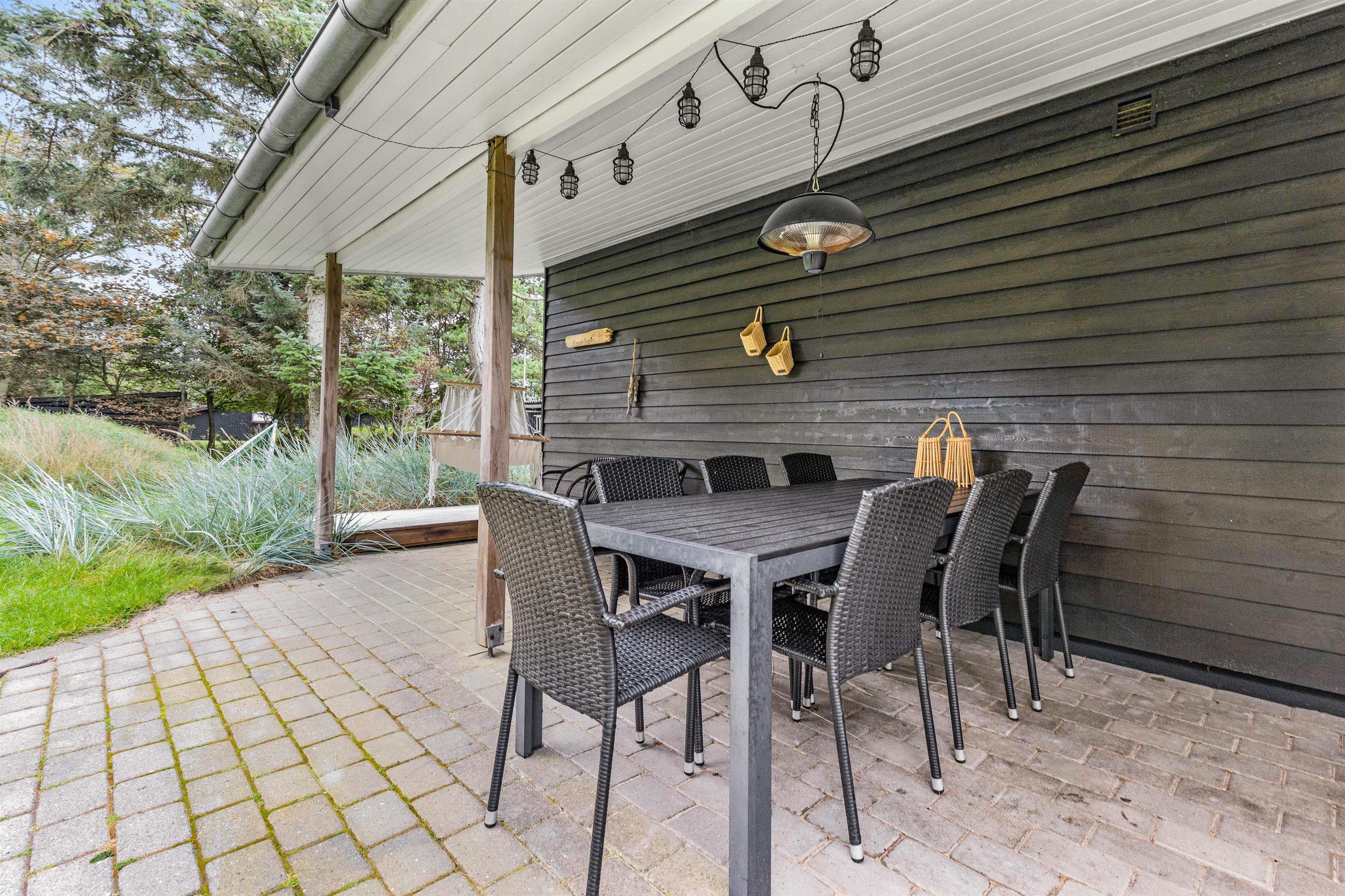 Omkring sommerhuset flere skønne terrasser, som I kan tilbringe de solrige dage af jeres ferie på. På terrasserne står der både havemøbler og liggestole klar, som I kan finde jer godt til rette i på en plads i solens stråler. En af terrasserne er delvist overdækket, så I har også mulighed for at nyde en stund i skyggen, når I skulle få brug for det.