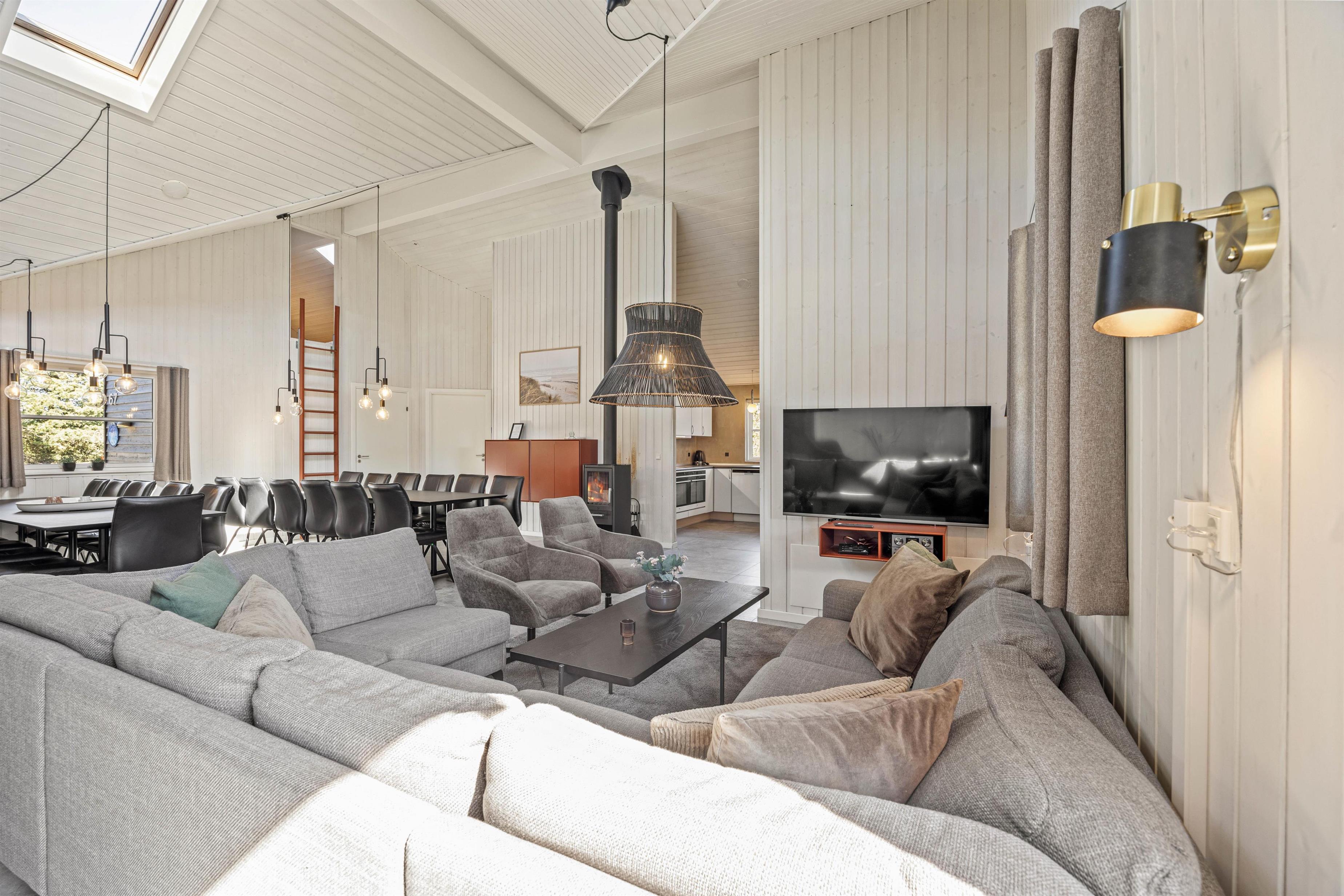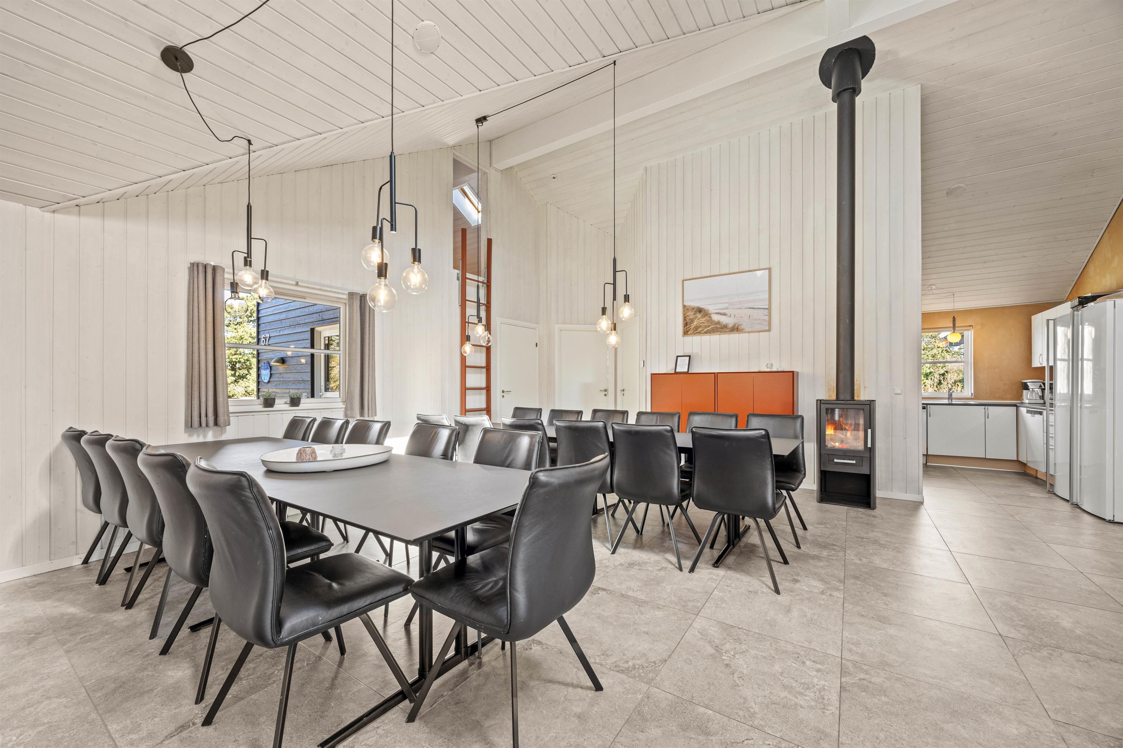 Med i alt 9 smagfuldt indrettede soveværelser og en kombination af 6 dobbeltsenge og 6 enkeltsenge, og 2 hems med hver 3 enkeltmadrasser, giver sommerhuset i Vejers rigelig plads til op til 24 personer. Bekvemt og komfortabelt kan du slappe af med din familie eller venner i disse indbydende rum. De 4 badeværelser er moderne udstyret, så der opstår ingen ventetider, og alle kan starte friske på dagen. Opholdsområdet kompletteres af en hyggelig brændeovn, der giver behagelig varme på køligere aftener.