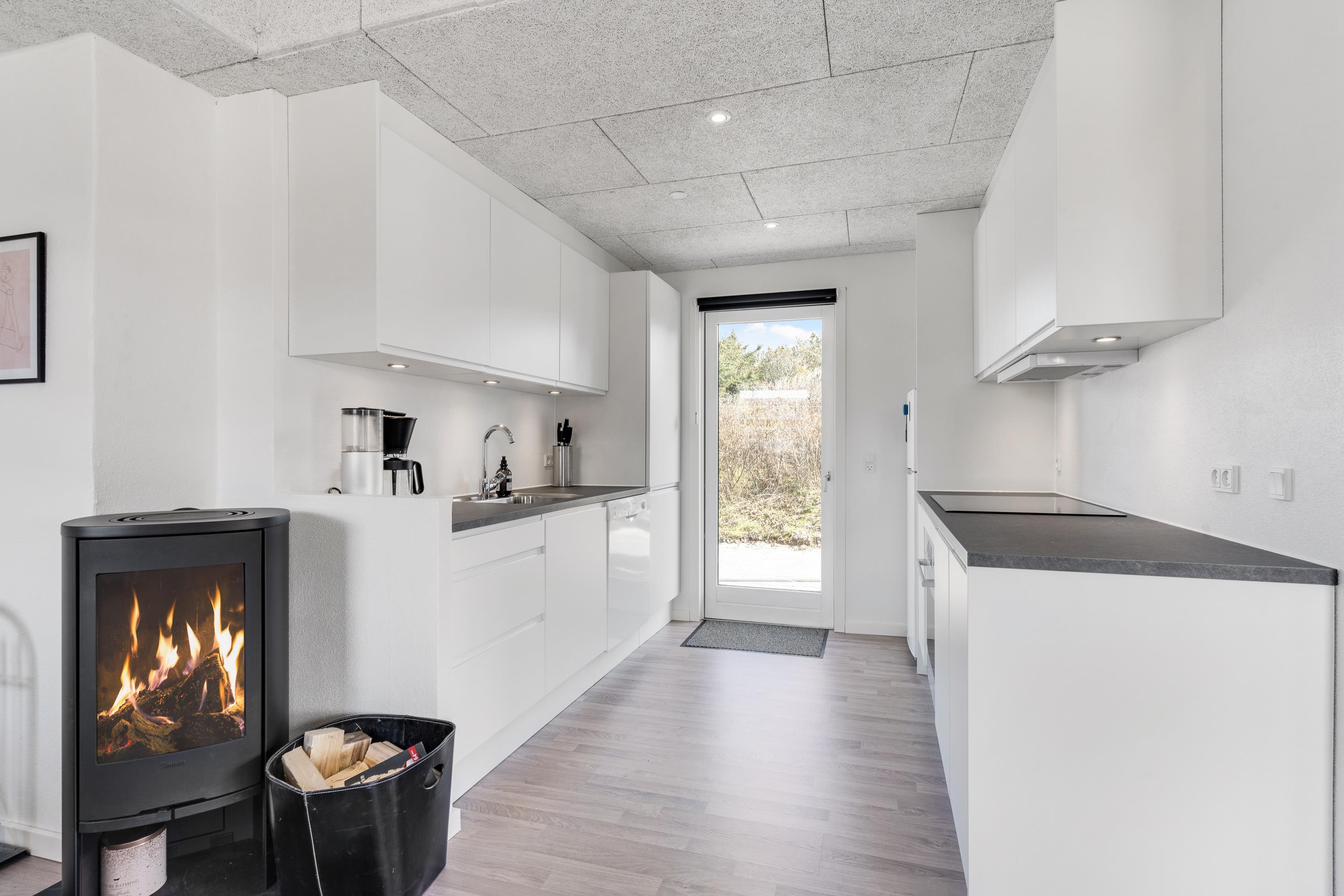 Fra det lyse køkken er der direkte udgang til husets terrasse, som inviterer til afslapning og hygge på solrige sommerdage. Her kan I tænde op i grille og hygge med lækker mad og drikke, når vejret er godt.