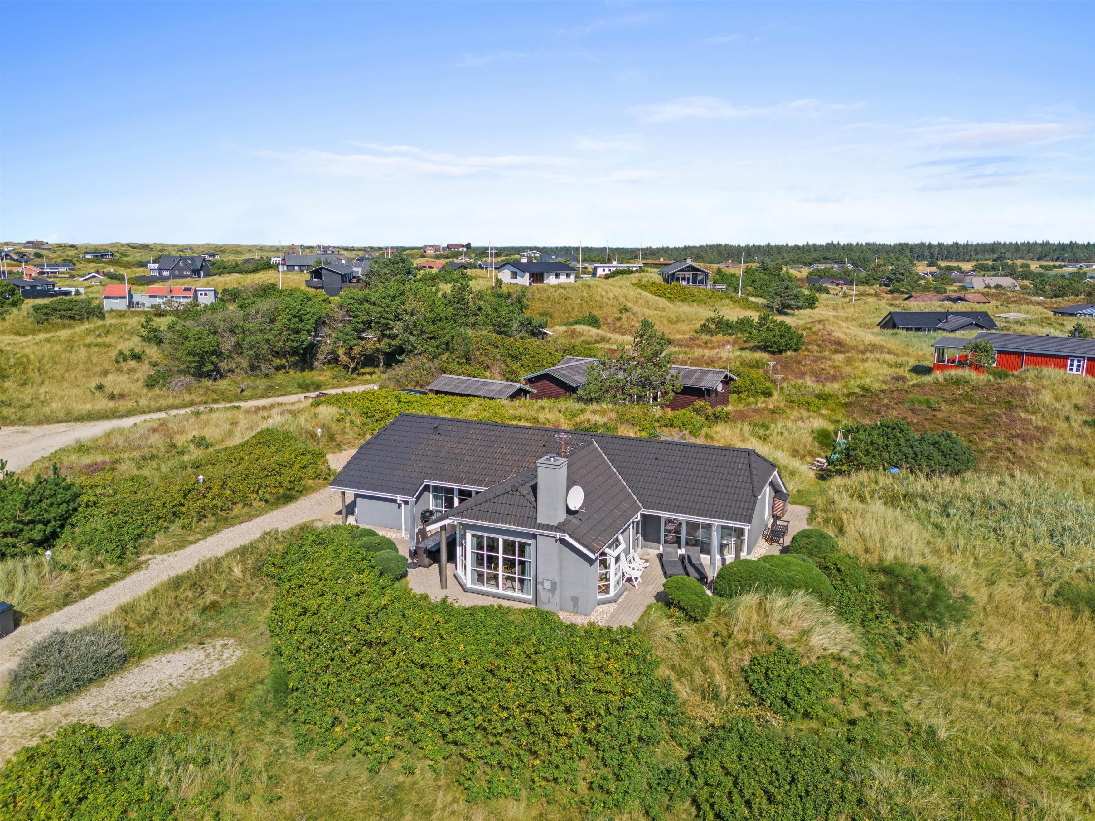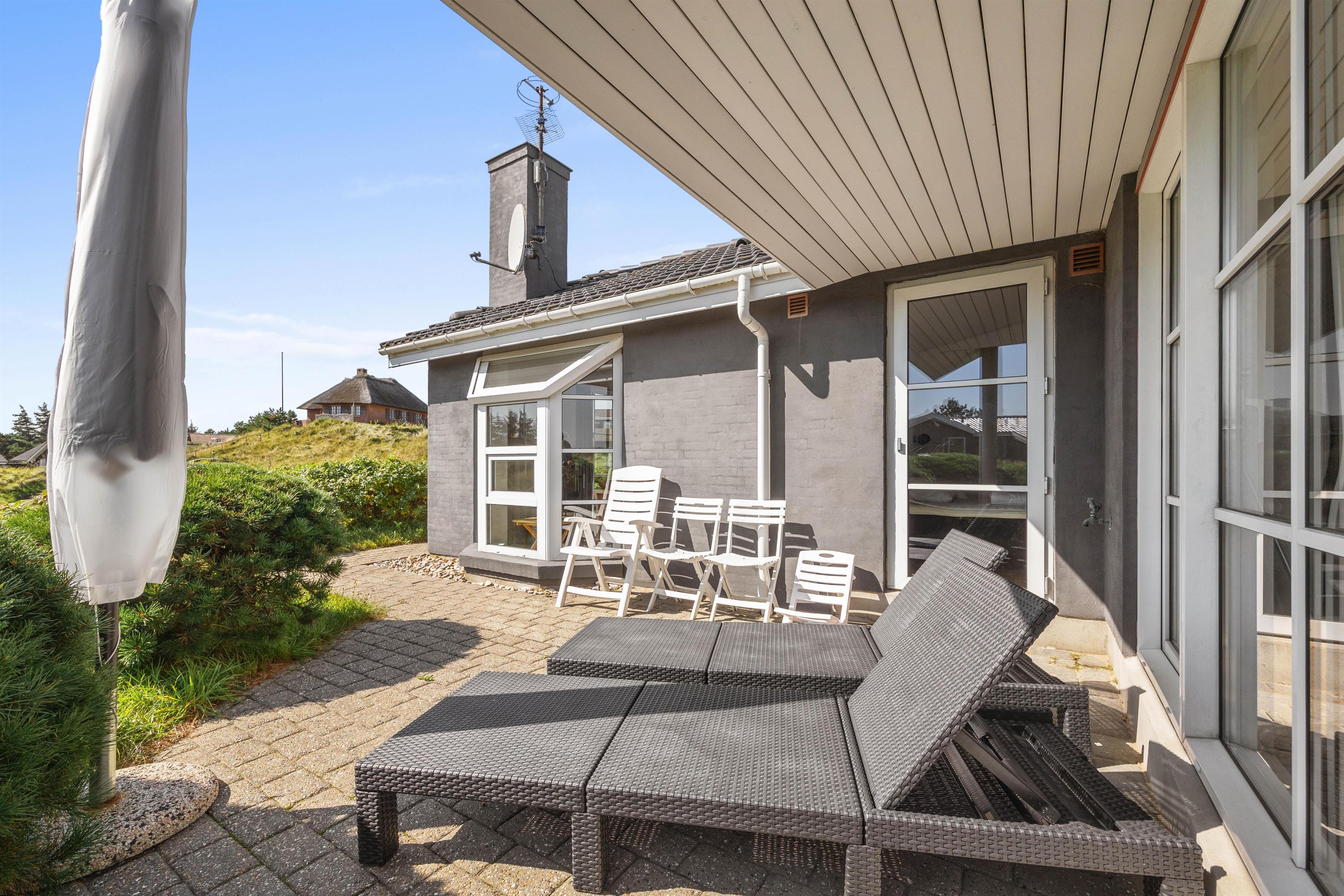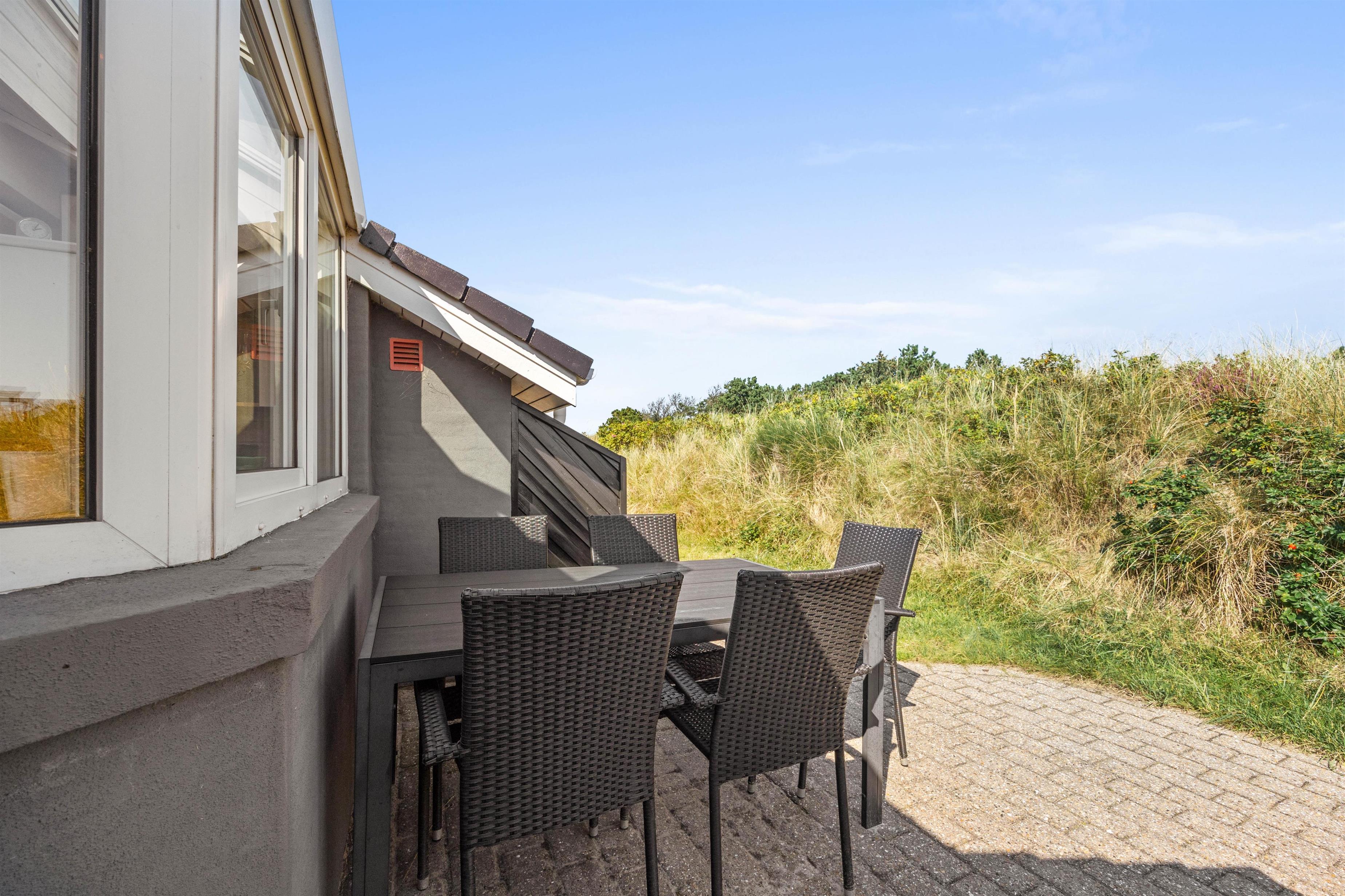 Omkring huset er der både en delvis overdækket terrasse og flere andre hyggepladser, så I har mulighed i at finde hver jeres yndlingsplads, hvor I kan slappe af, læse en bog eller nyde solen. Et lille eventyr for børnene er husets legeplads, som ligger gemt i en klit. Her er der mulighed for masser af sjov og spil ligesom der for hunden er spændende spor i det høje græs.