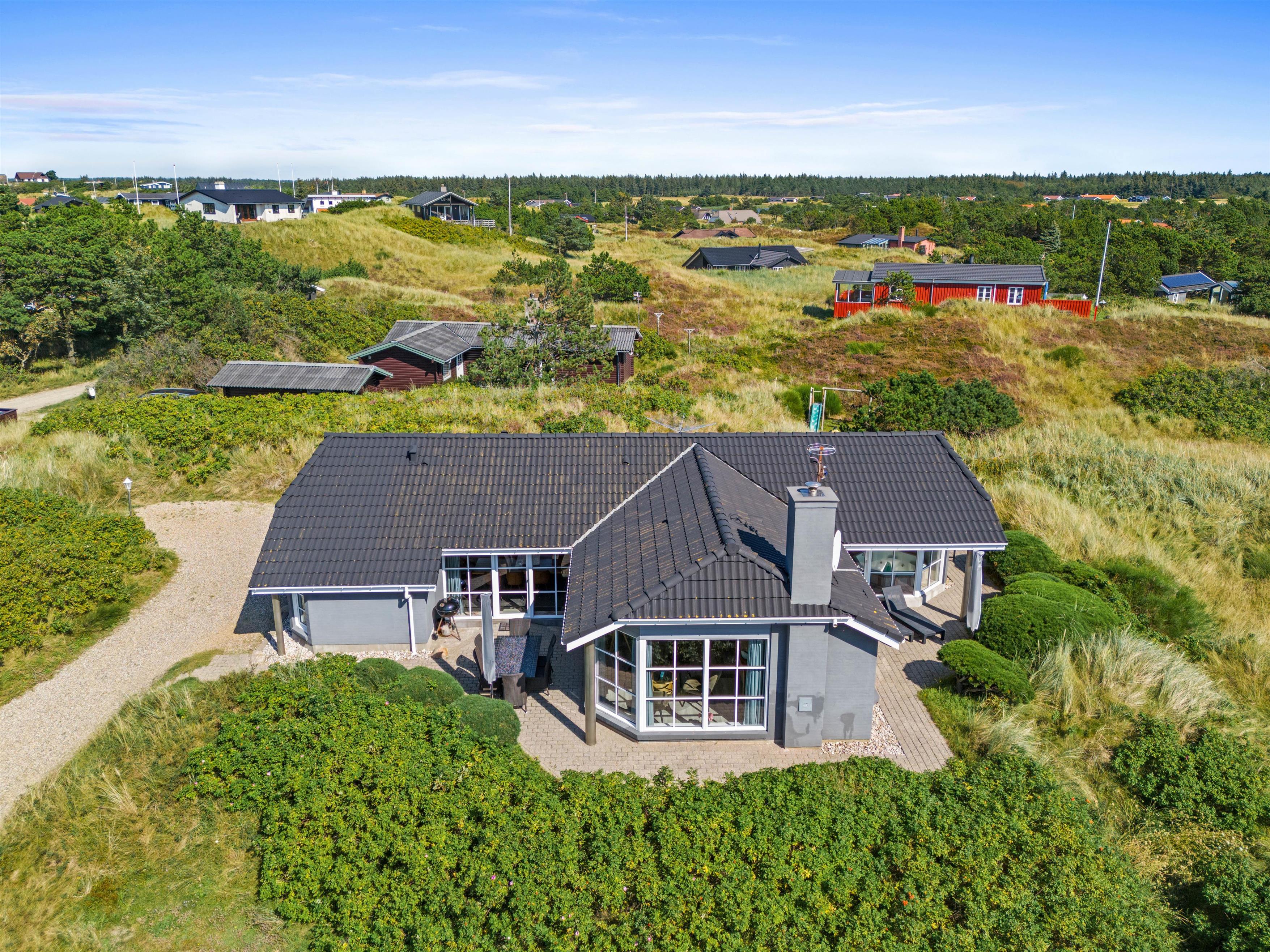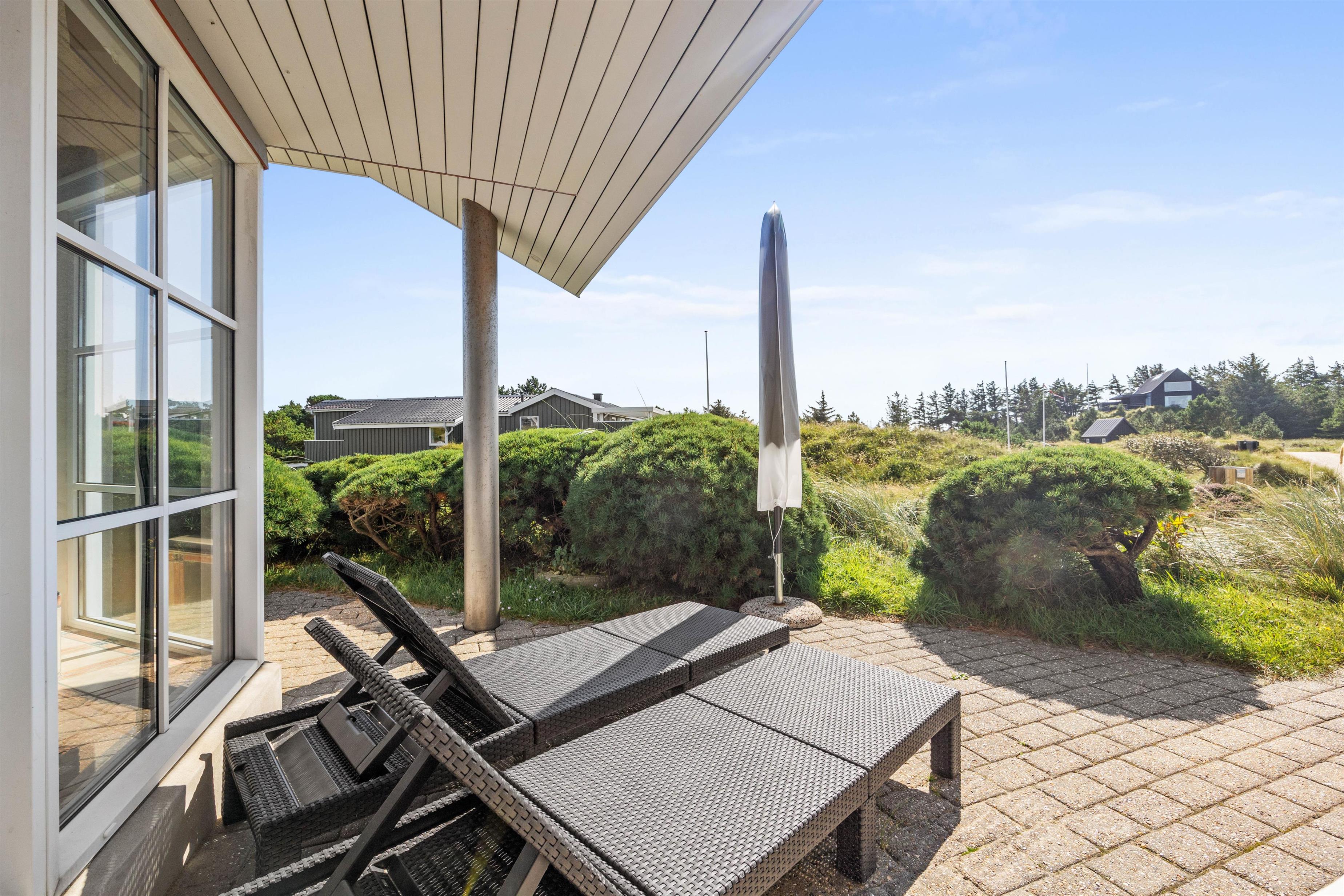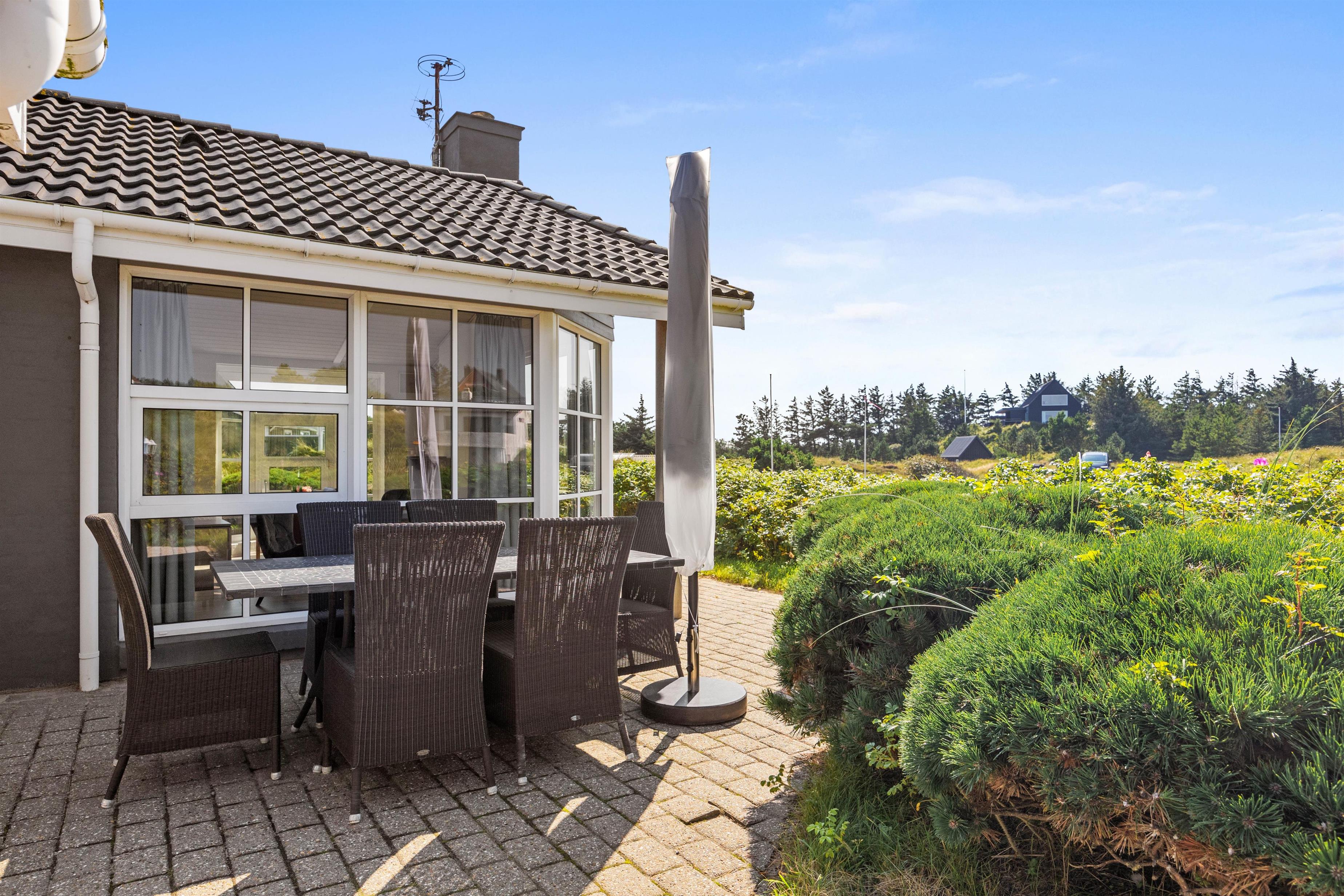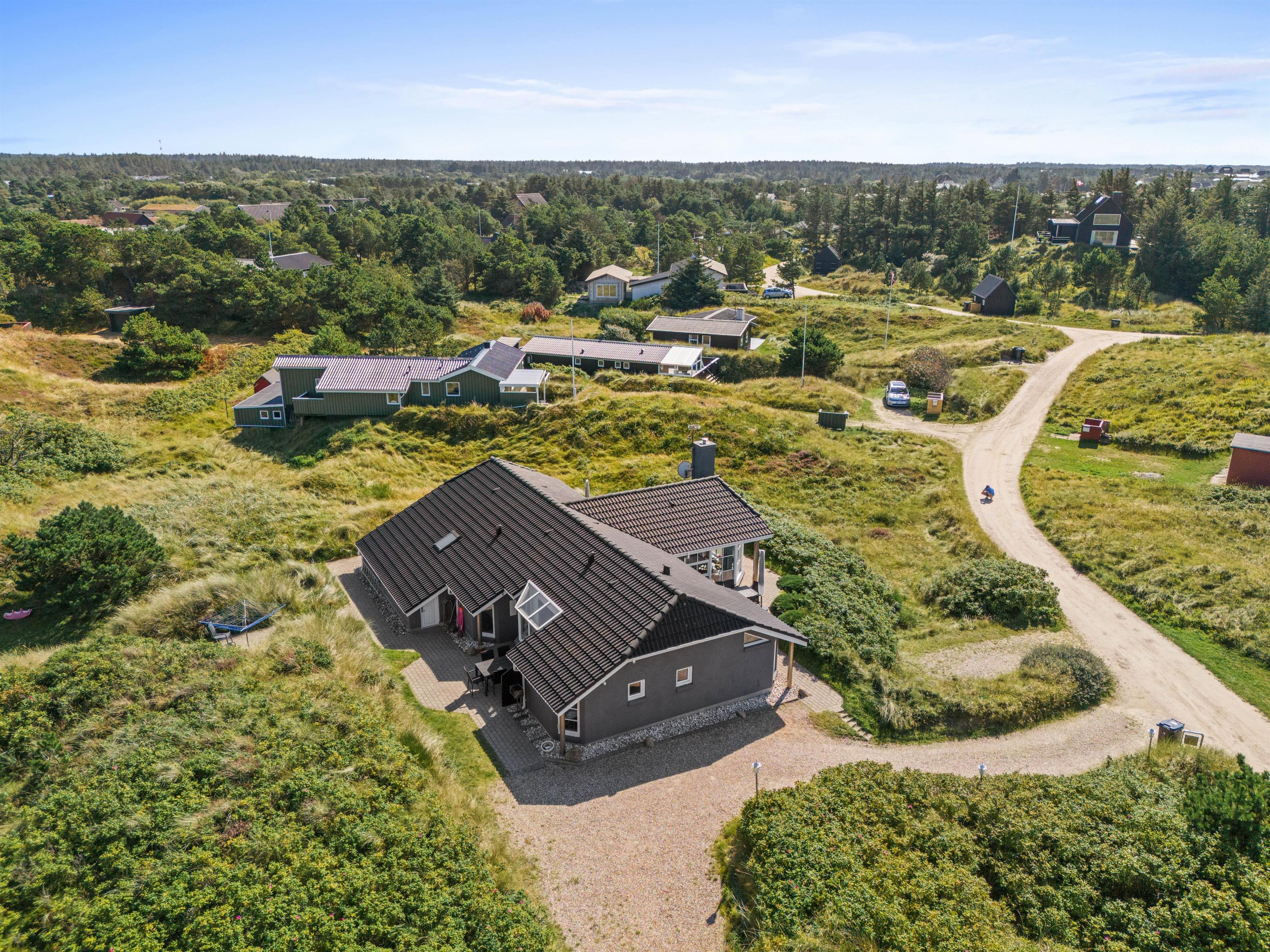 Omkring huset er der både en delvis overdækket terrasse og flere andre hyggepladser, så I har mulighed i at finde hver jeres yndlingsplads, hvor I kan slappe af, læse en bog eller nyde solen. Et lille eventyr for børnene er husets legeplads, som ligger gemt i en klit. Her er der mulighed for masser af sjov og spil ligesom der for hunden er spændende spor i det høje græs.
