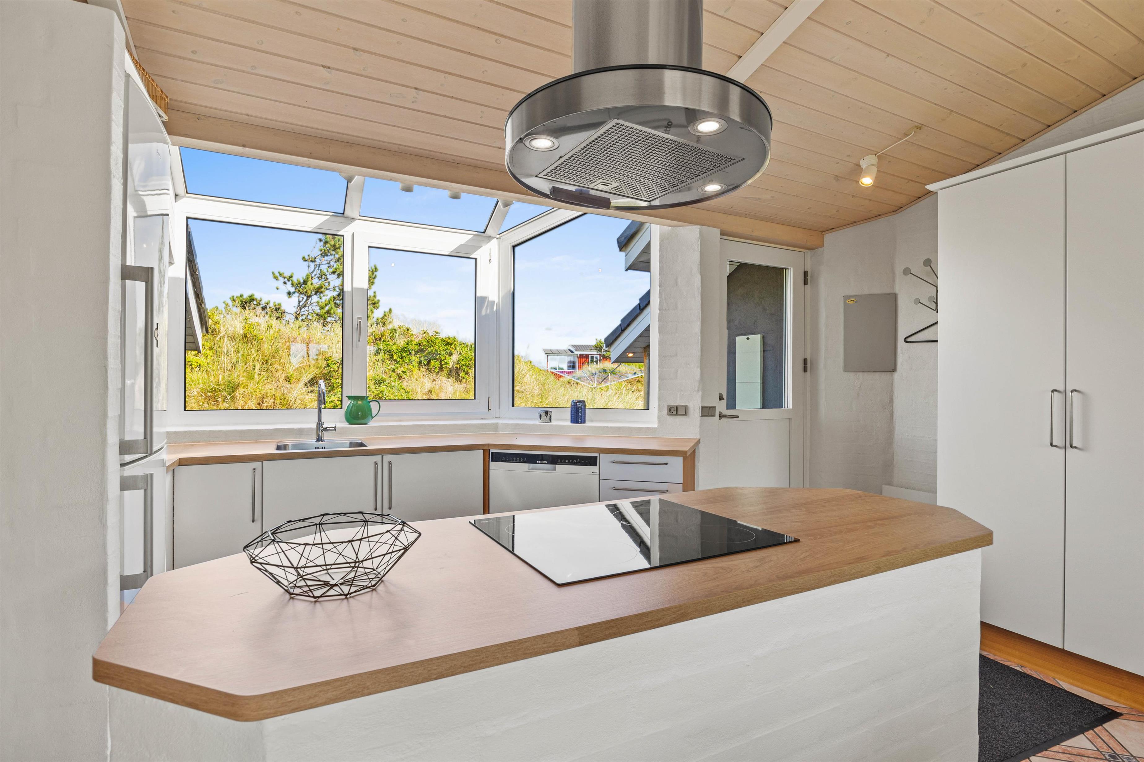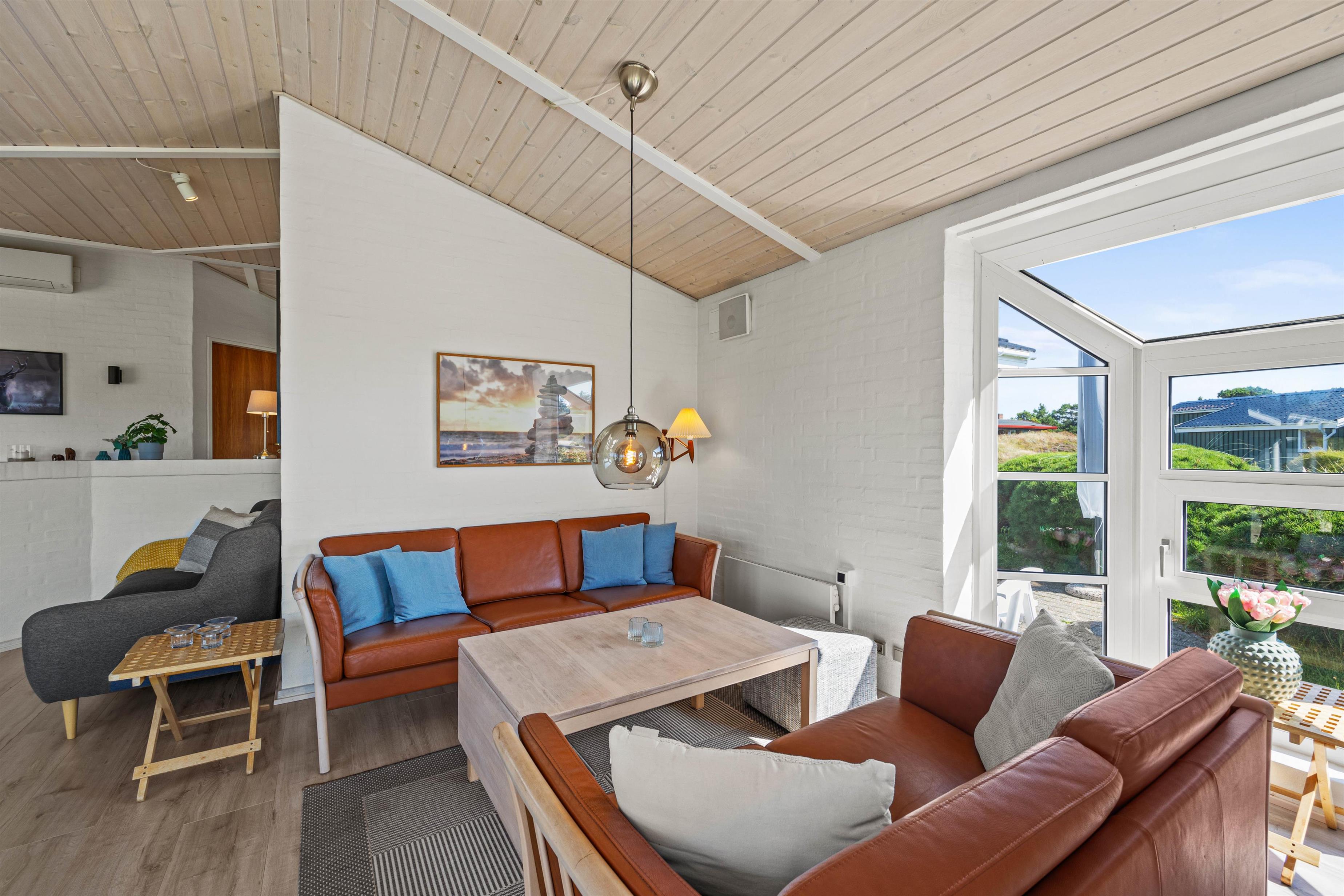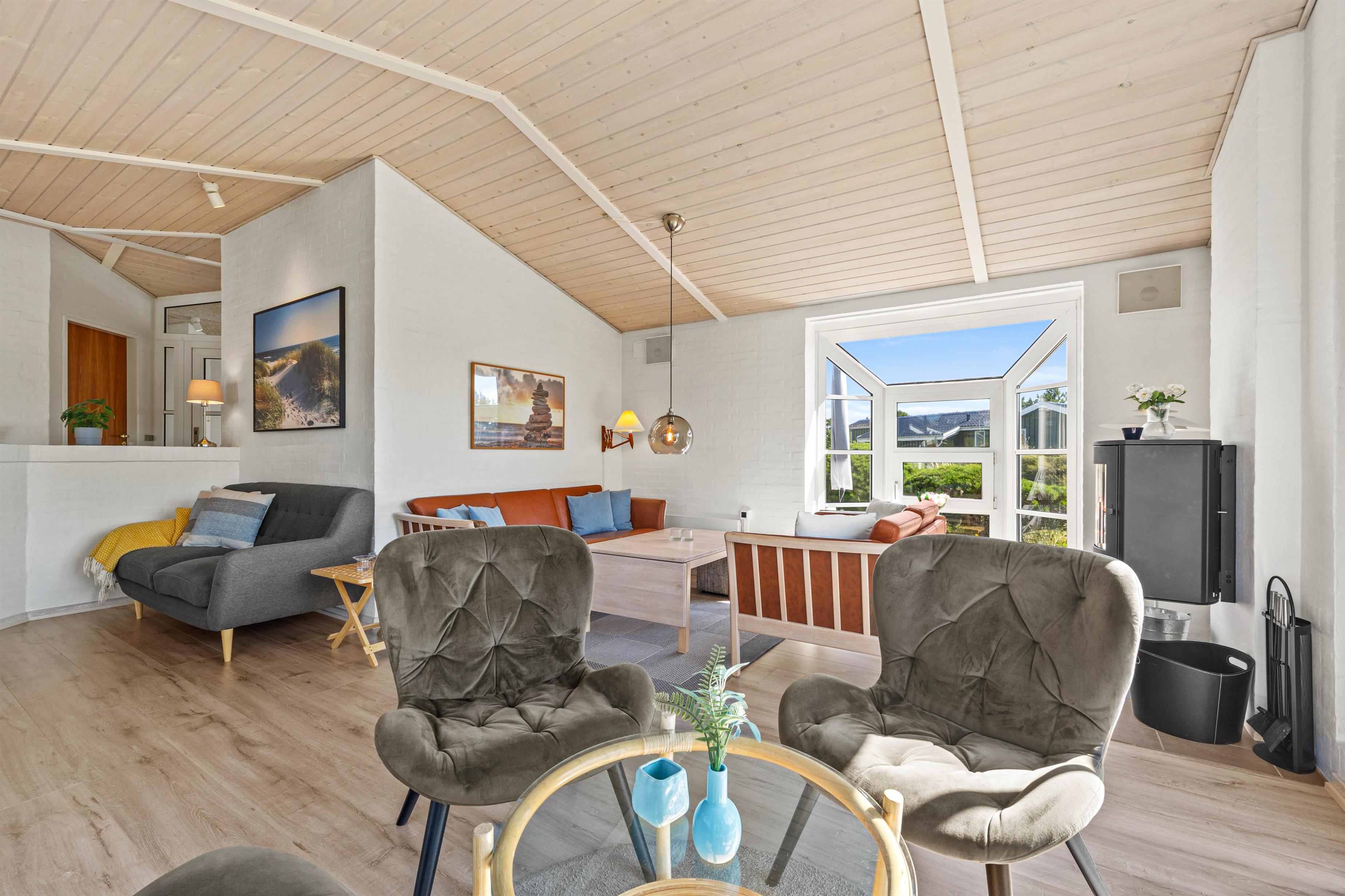 I det hele taget er det et feriehus med masser af lysindfald, så I kan nyde lyset i det lyse forår eller varme jer i solen på en kølig sommerdag. Om efteråret og vinteren kan I sidde ved brændeovnen i den velindrettede stue og se ud på Vesterhavets vilde vejr. Der er flere siddemuligheder, så man også kan trække sig lidt med en god bog eller sidde sammen i sofaen til en god film.