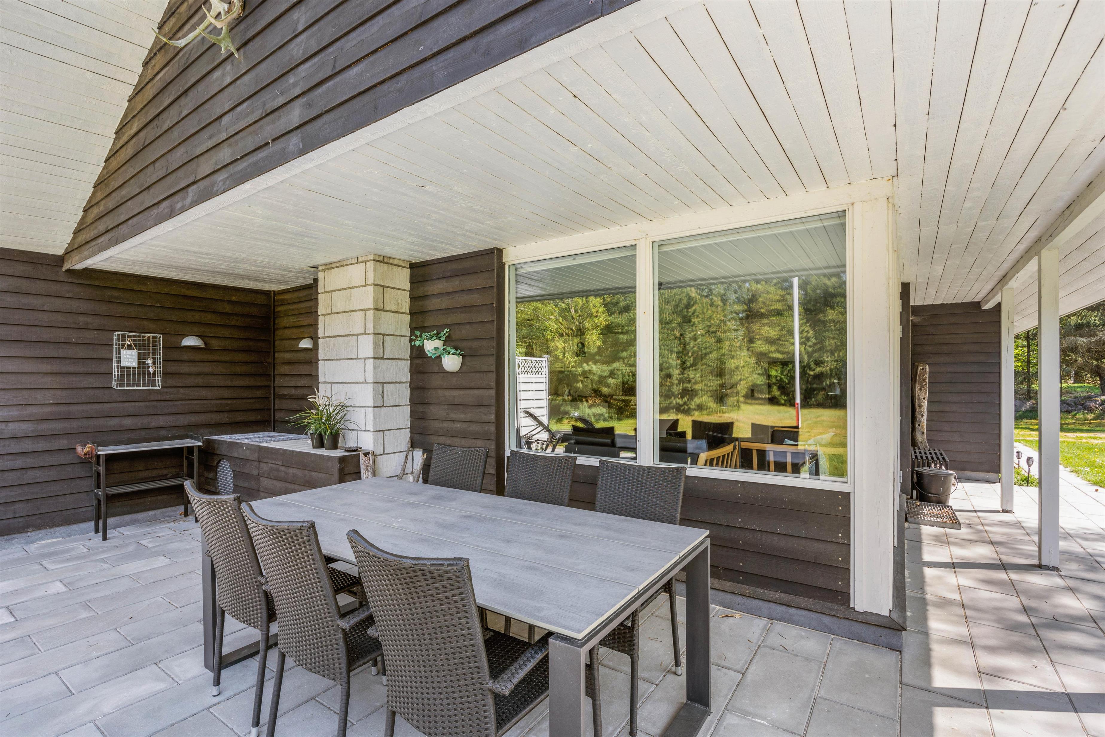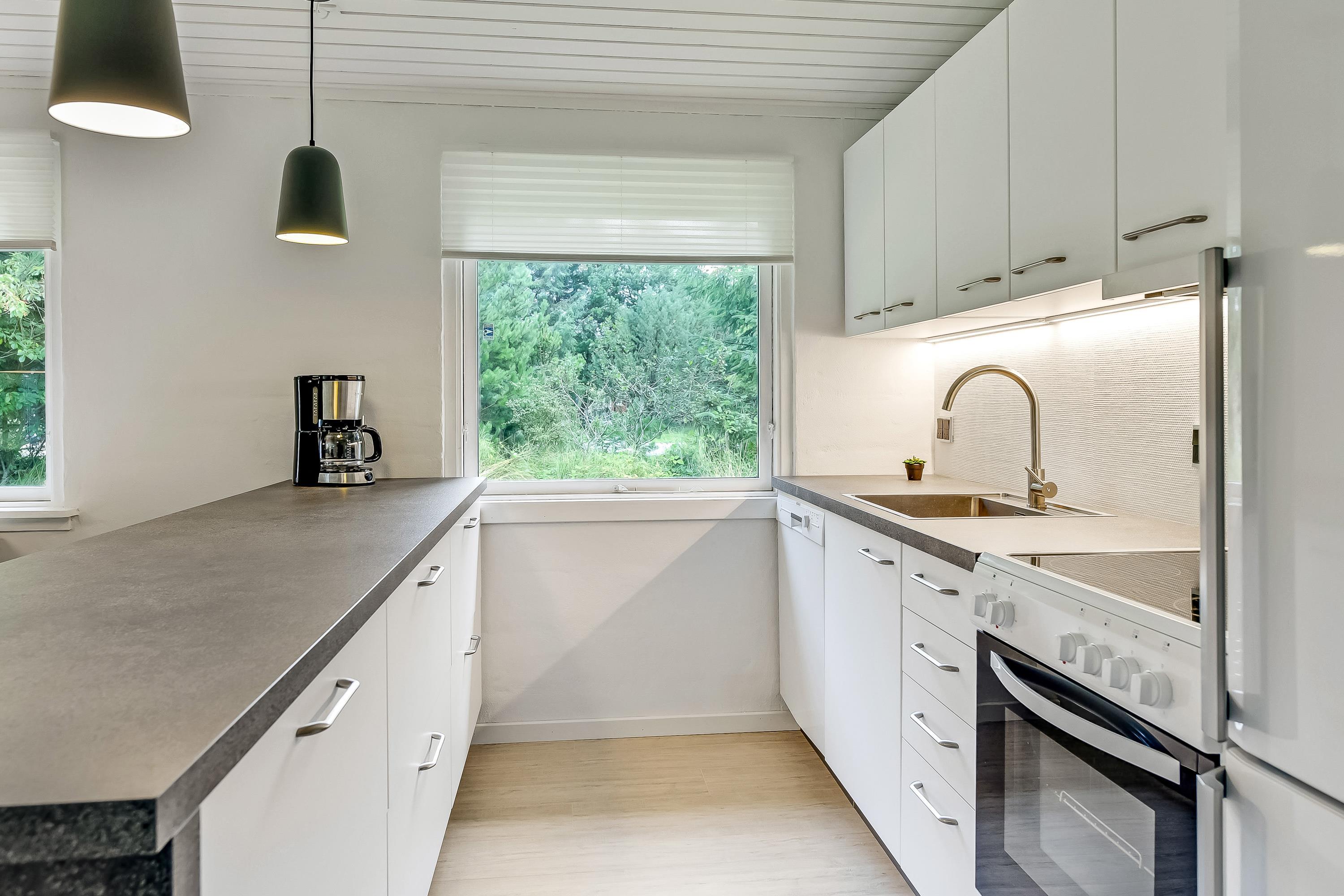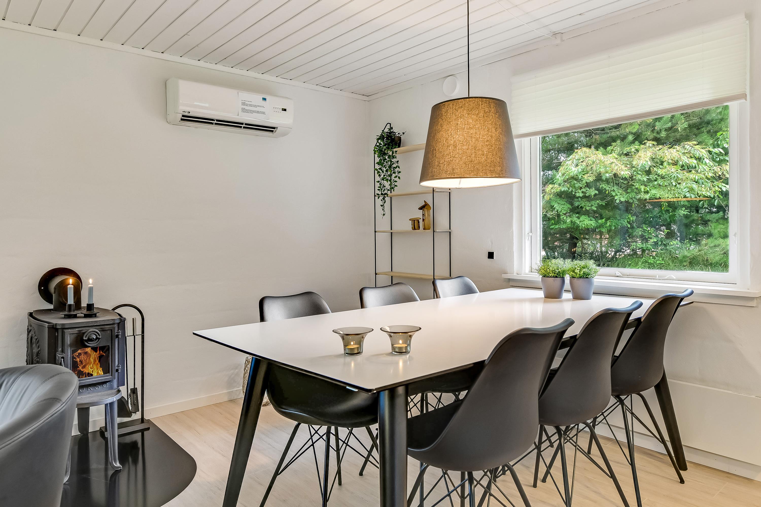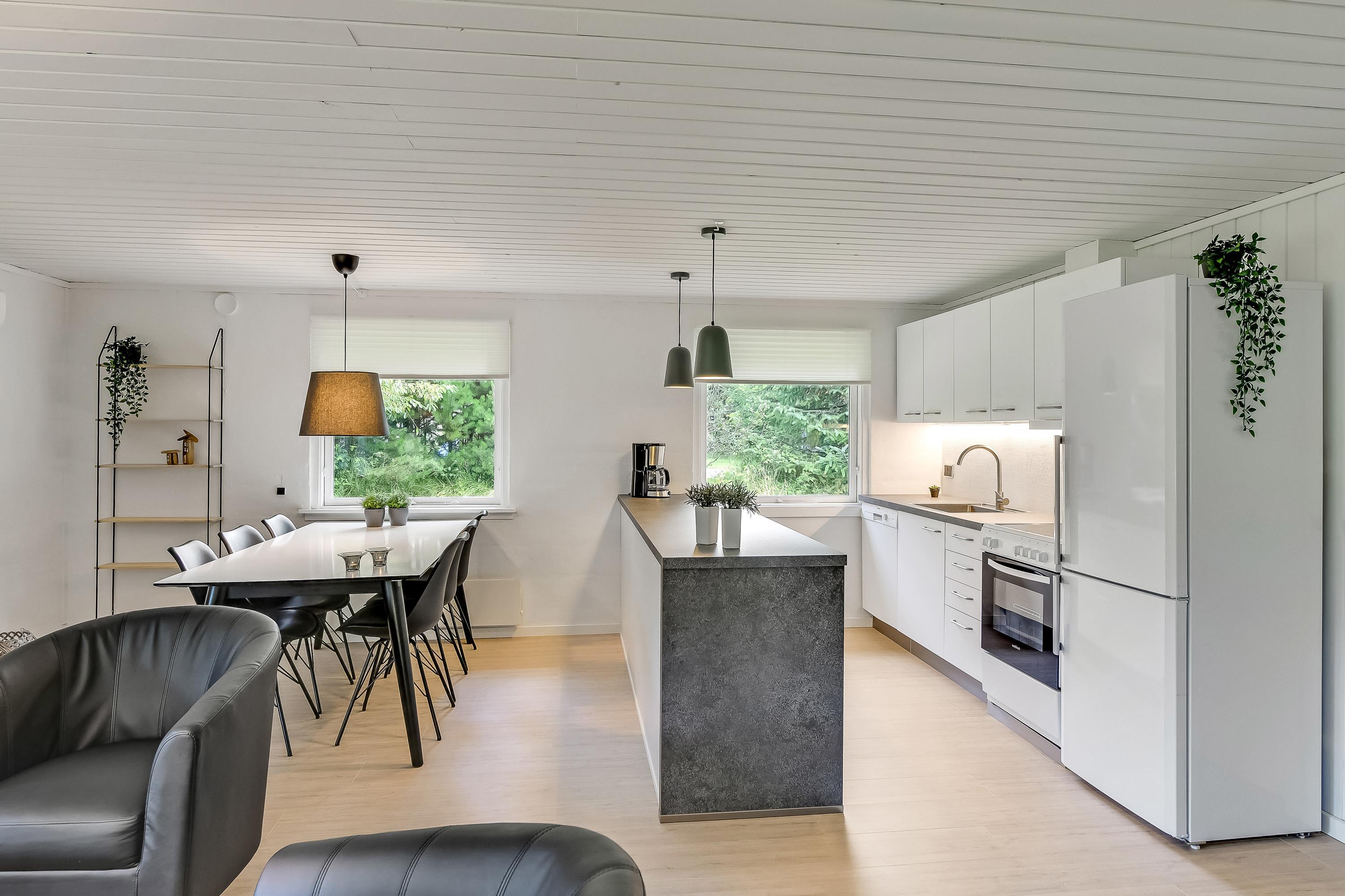 Indenfor venter jer en kombineret stue- og spiseafdeling med integreret køkken - smagfuldt indrettet i sort-hvide toner og med masser af komfort, der fuldender den afslappende sommerhusferie. På den moderne lædersofa er der lagt op til hyggelige filmaftener og læsning foran den knitrende brændeovn.