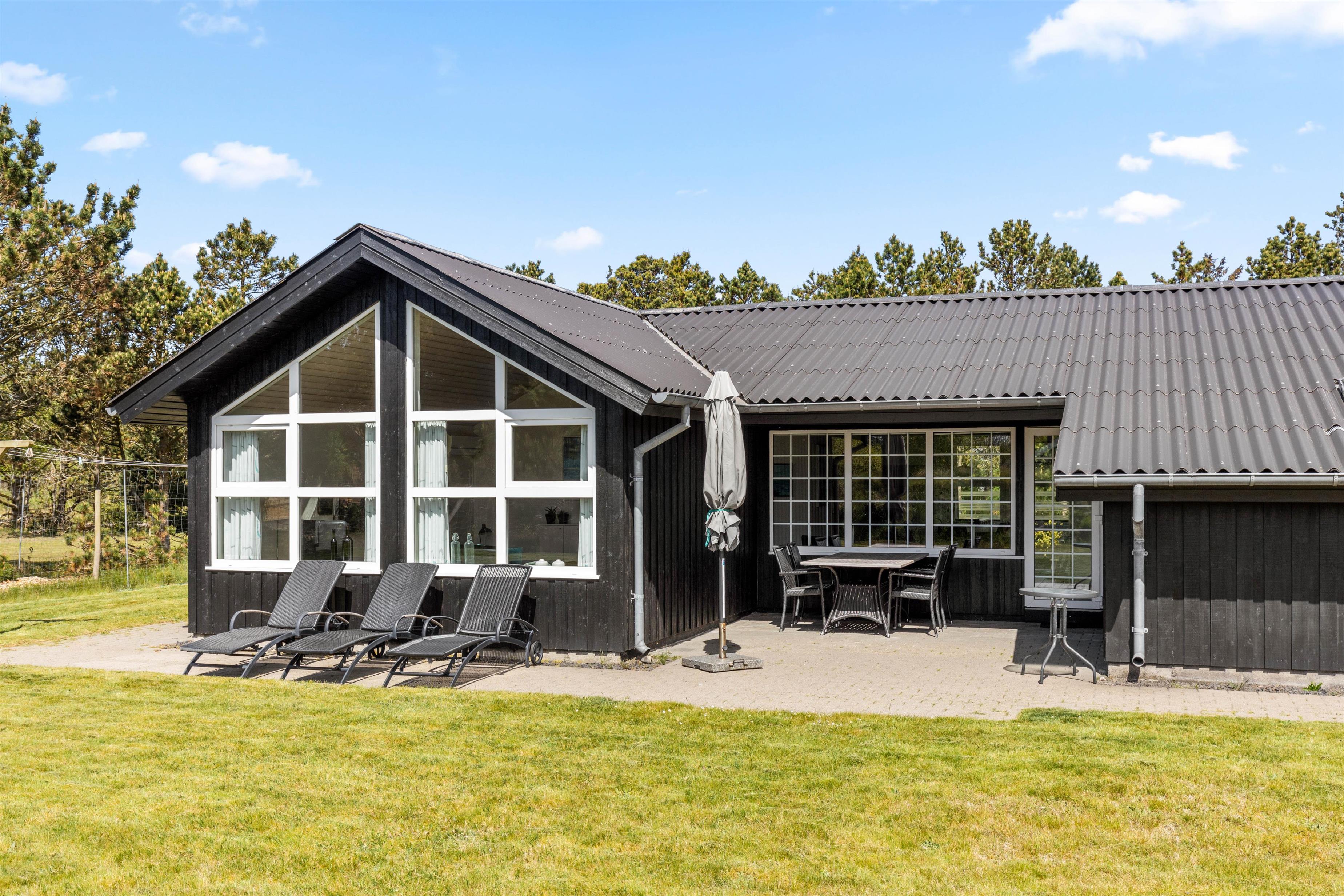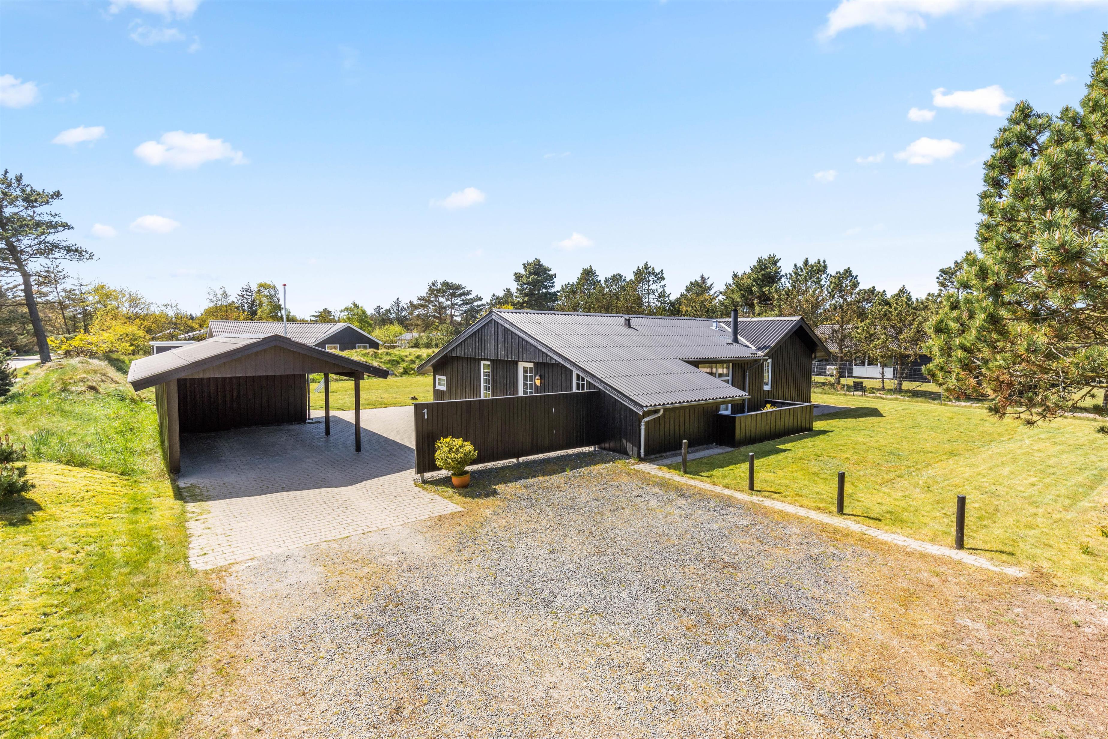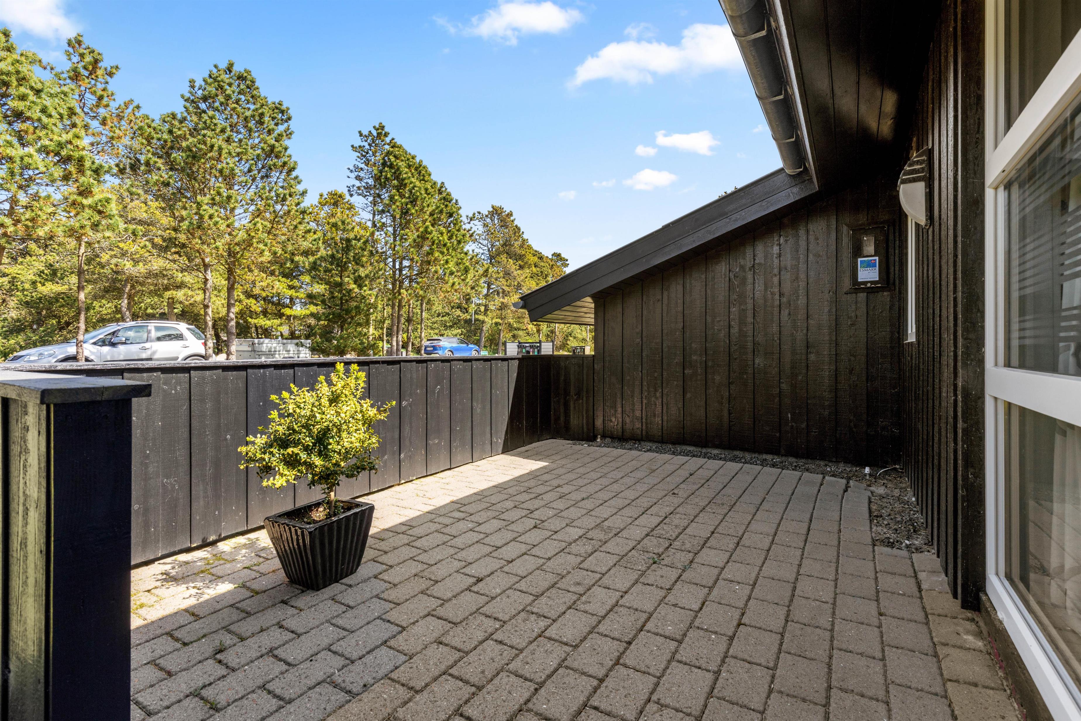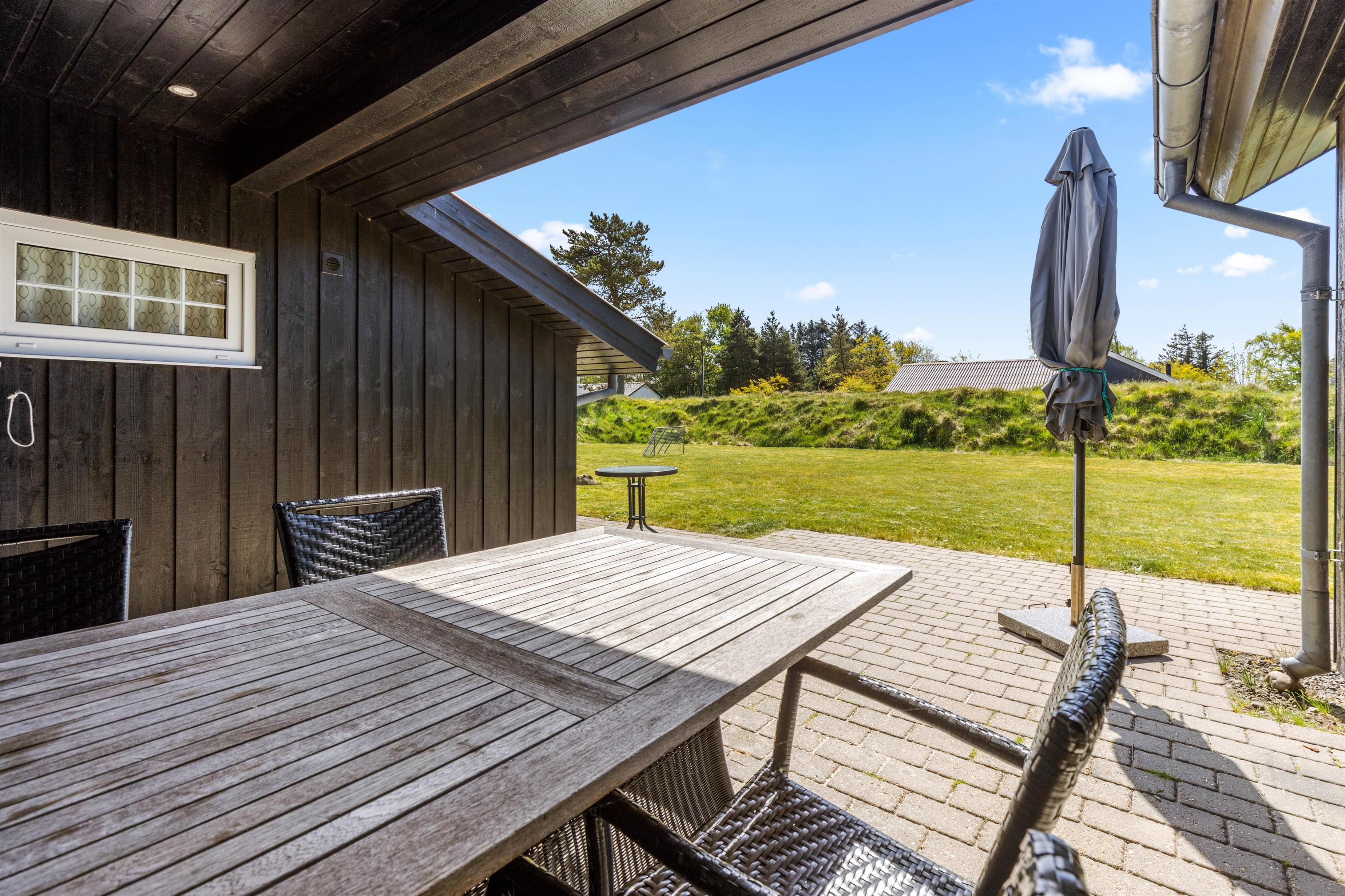 Jeres feriehjem på Muffparken 1 er en del af Vejers Strands elskede ferieområde. Den 1.900 m² store grund er omgivet af træer, og her har I masser af privatliv og god plads til at opholde jer udenfor på de varme feriedage.