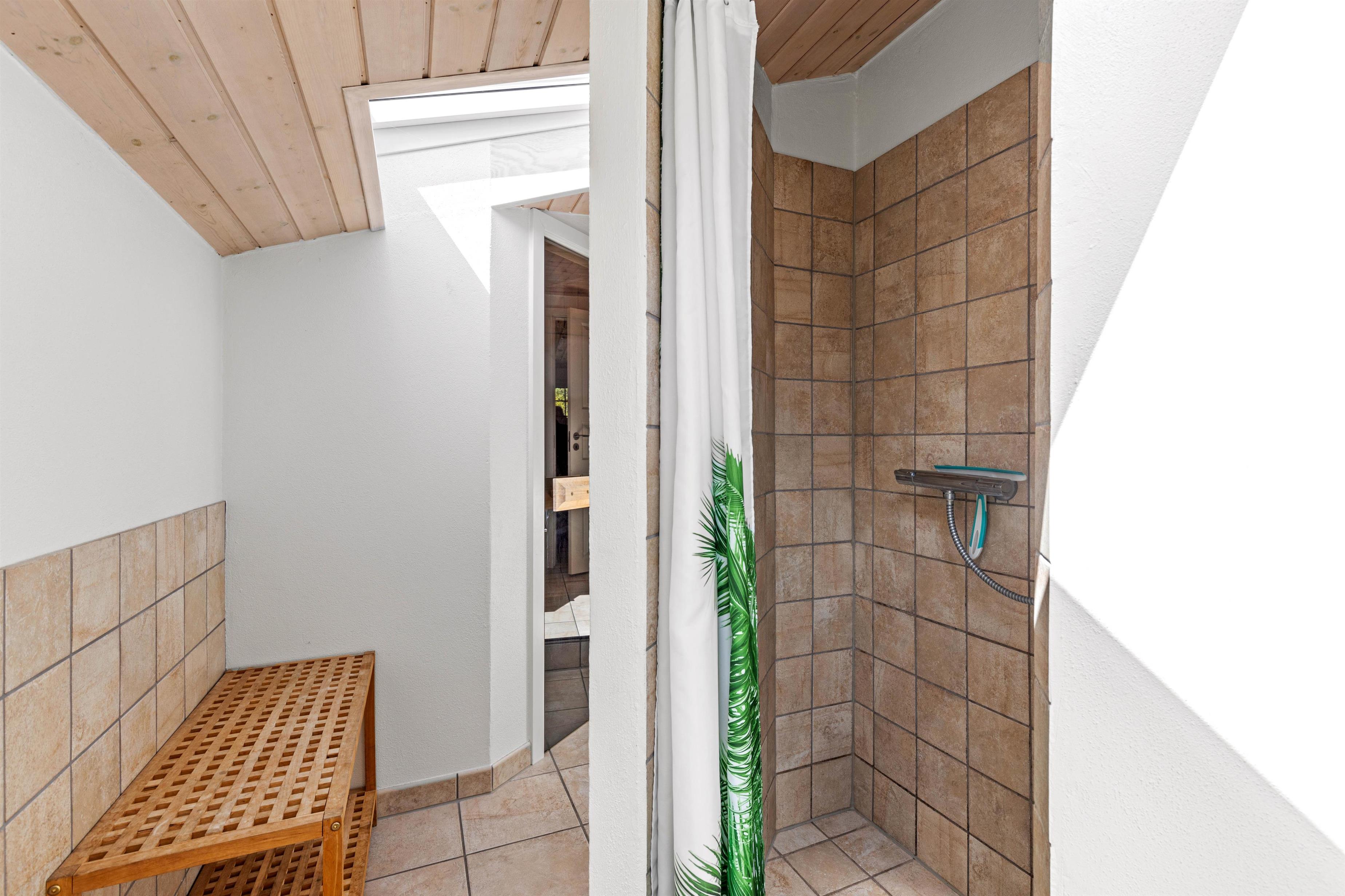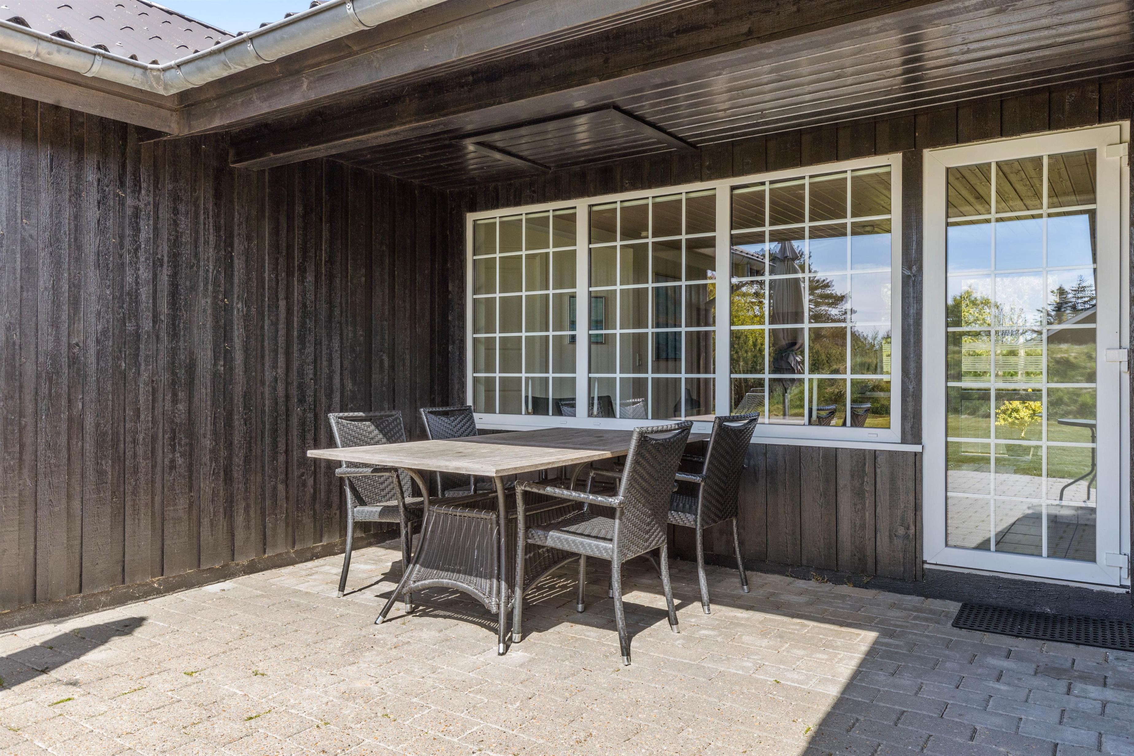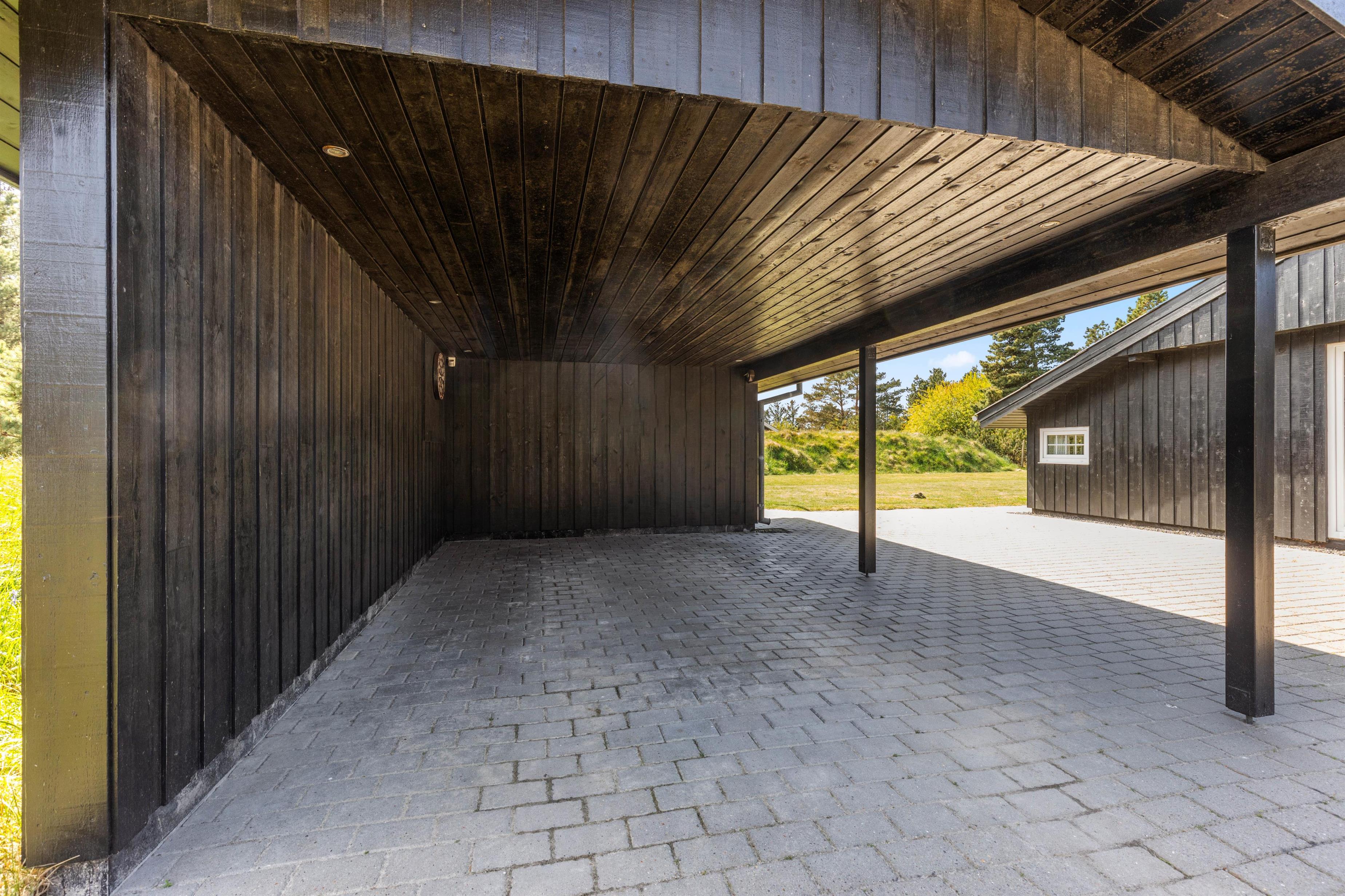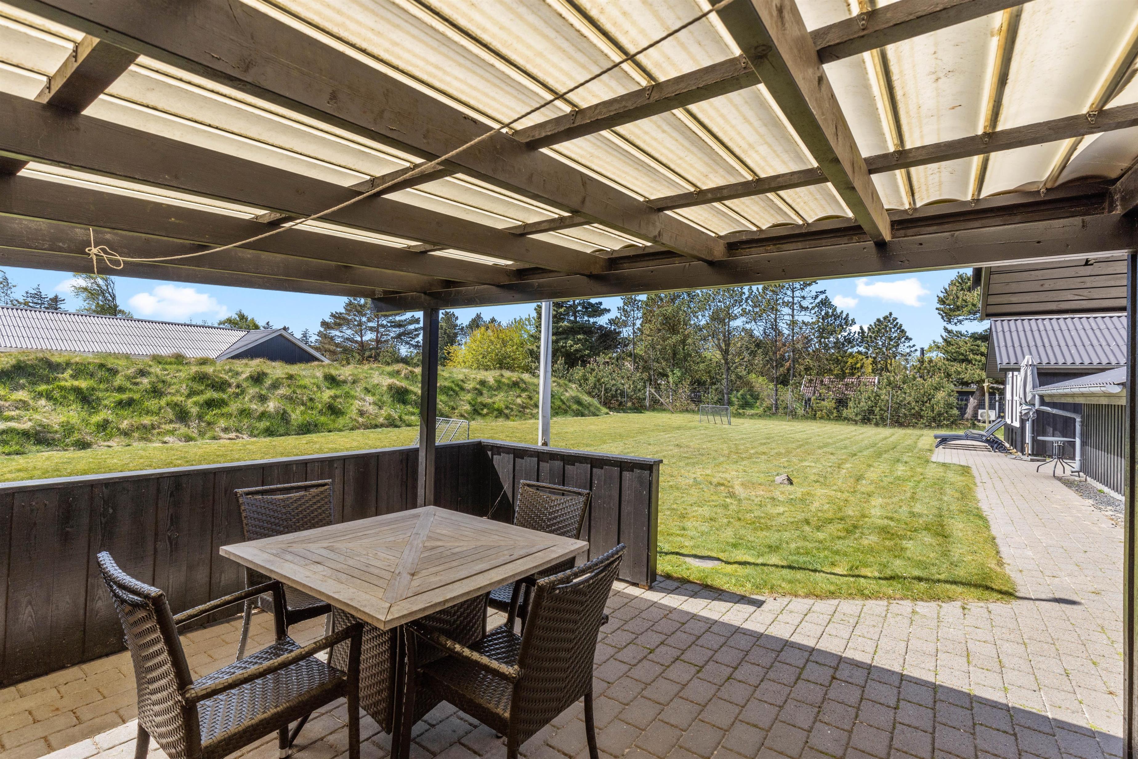 Udenfor venter tre skønne, delvist overdækkede terrasser. Havemøbler, liggestole, grill m.m. står selvfølgelig allerede klar til jer. Og en lille bonusinfo: Bilen kan I parkere i carporten ved siden af huset, hvor den står godt beskyttet.