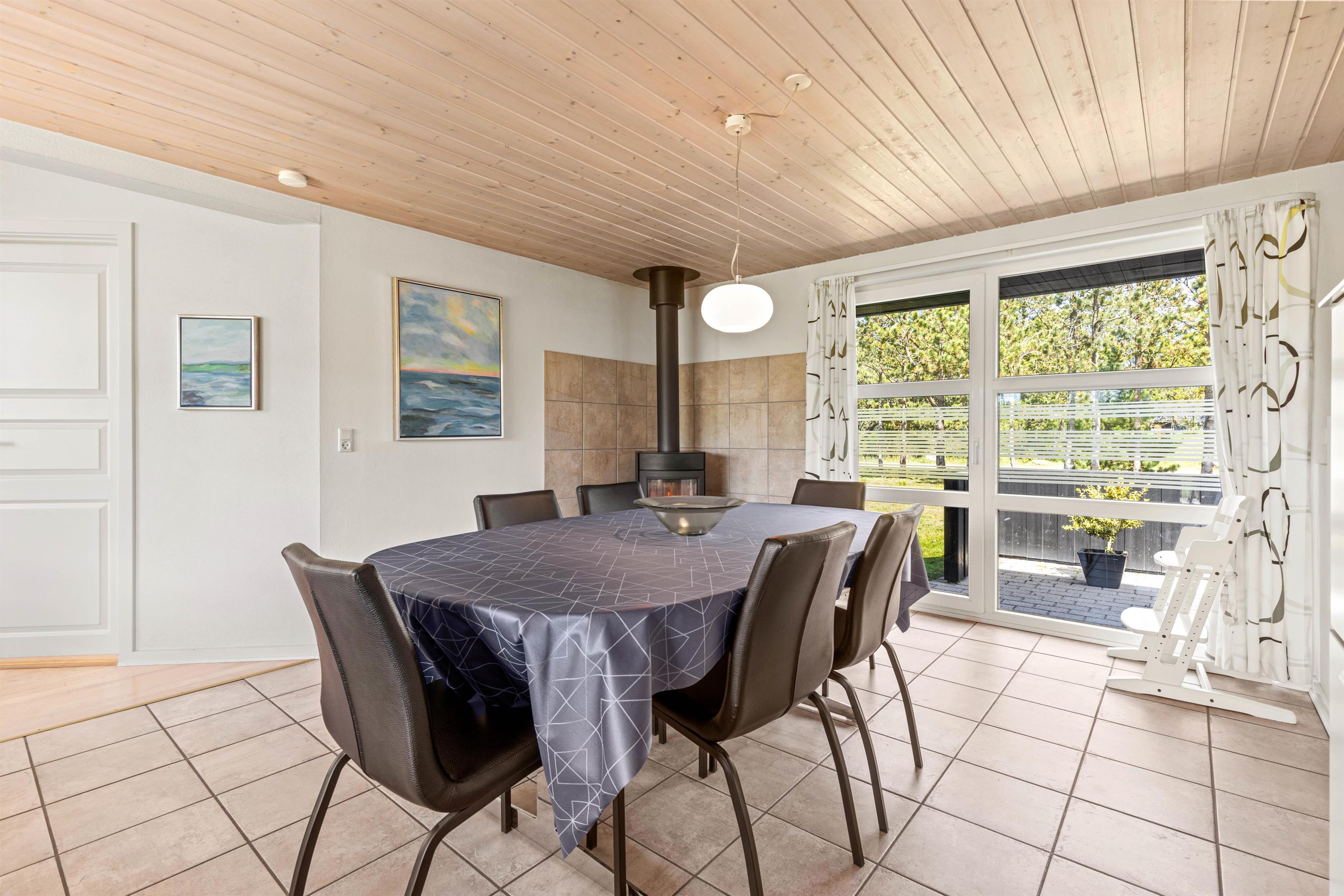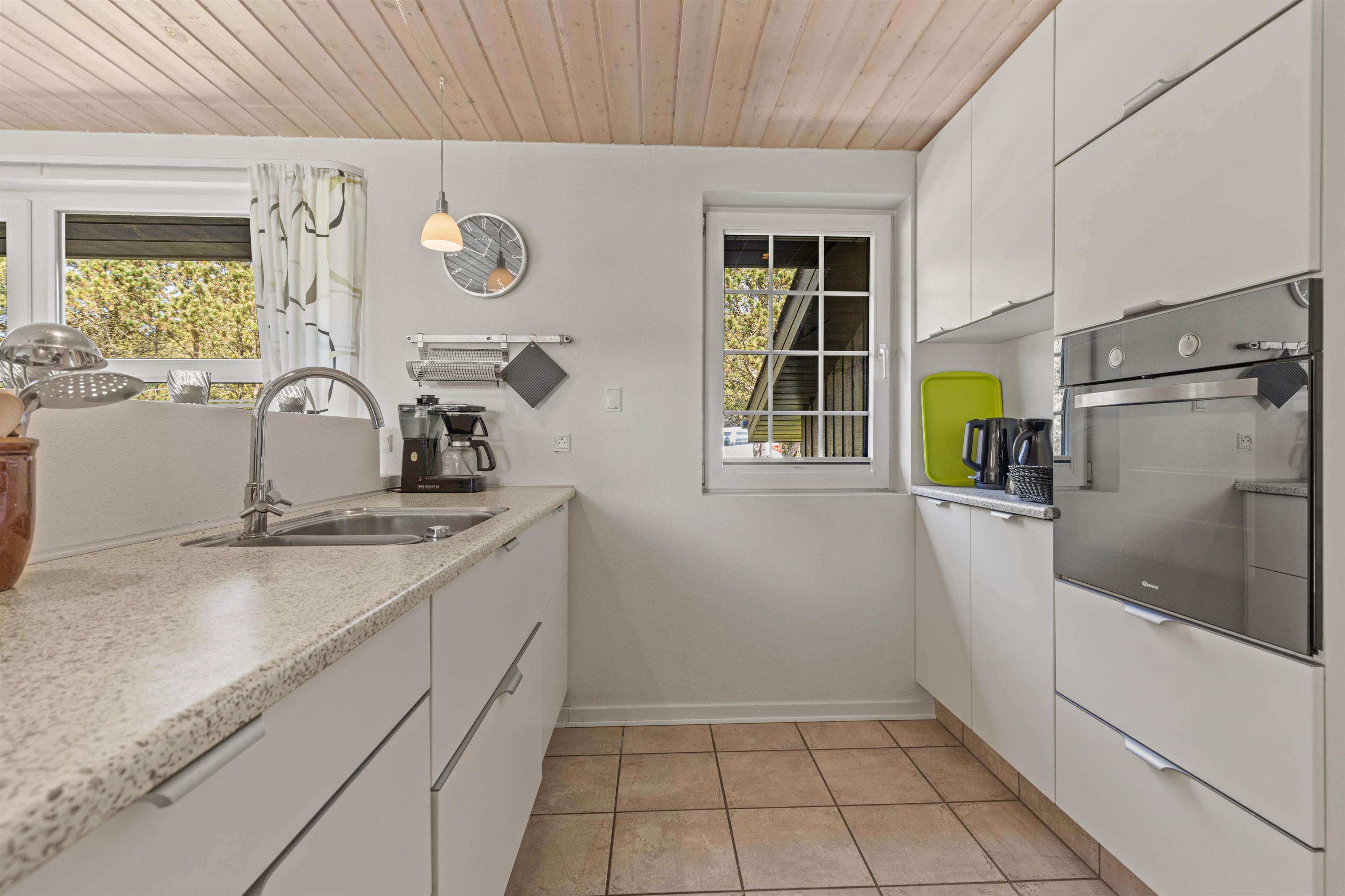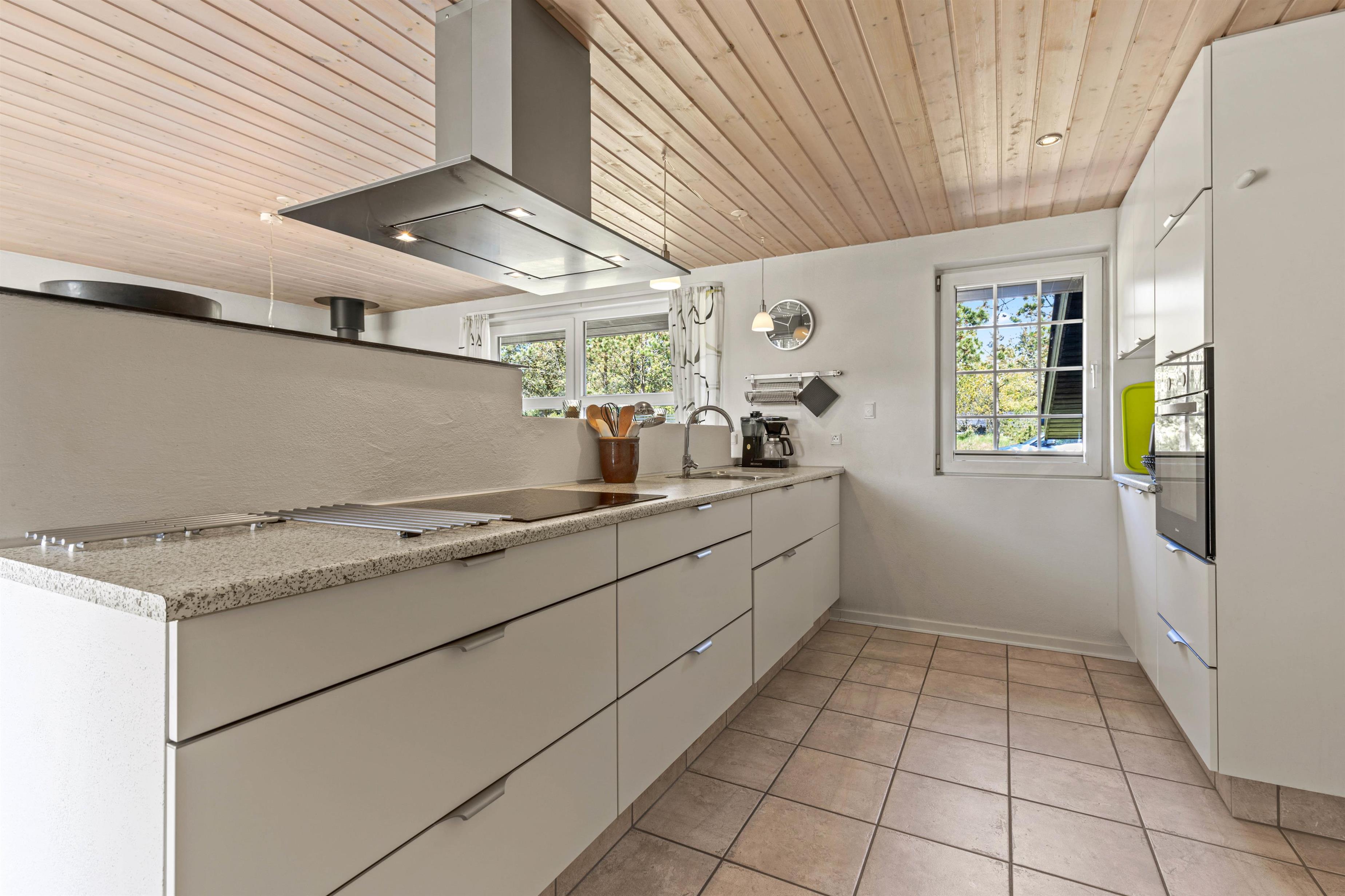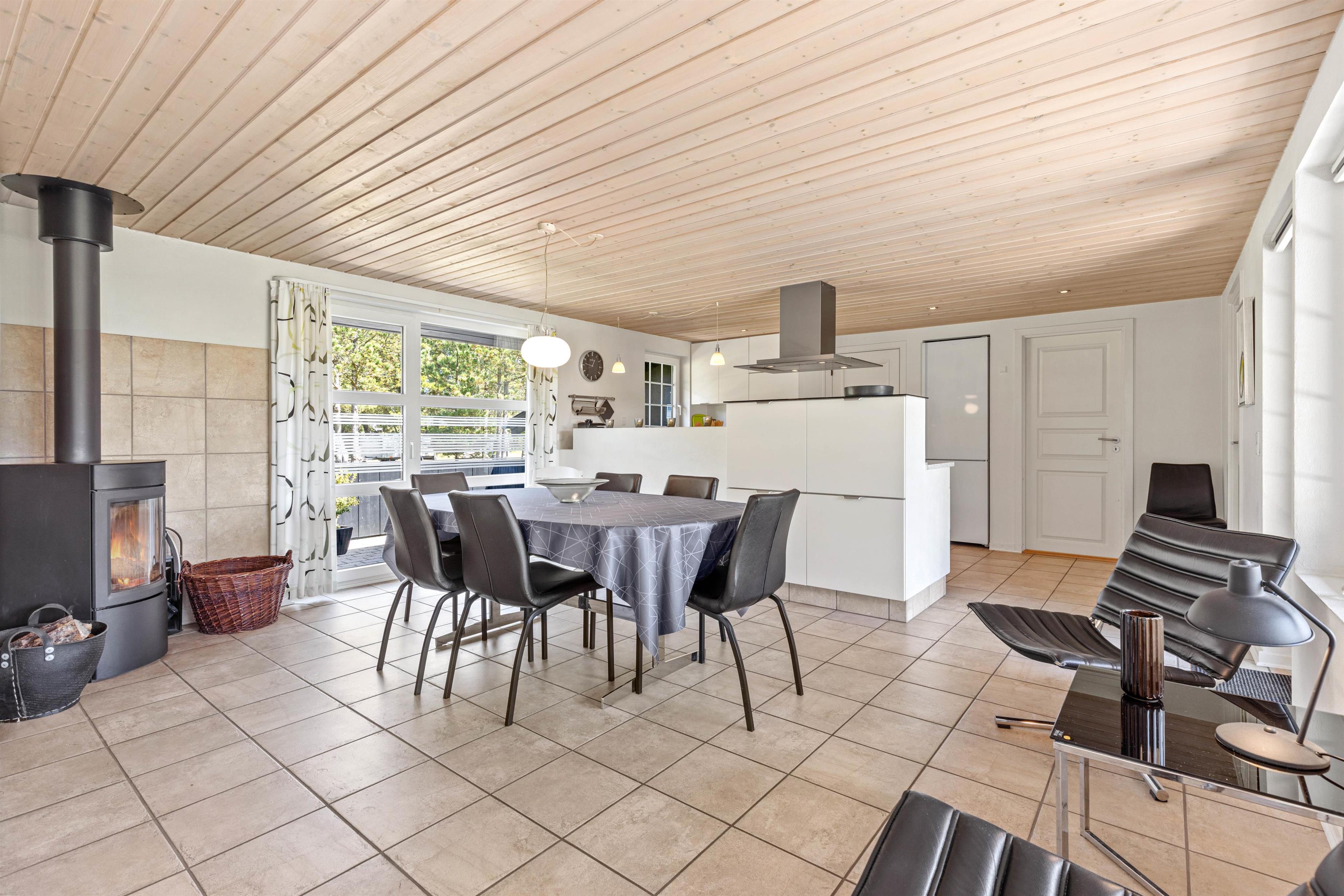 Fra stuen kommer I videre til det moderne og lyse køkken med opvaskemaskine, mikroovn, spisebord og brændeovn. Her kan I sammen tilberede et par lækre feriemiddage eller brygge morgenkaffen, mens andre er på vej efter friskbagte rundstykker.