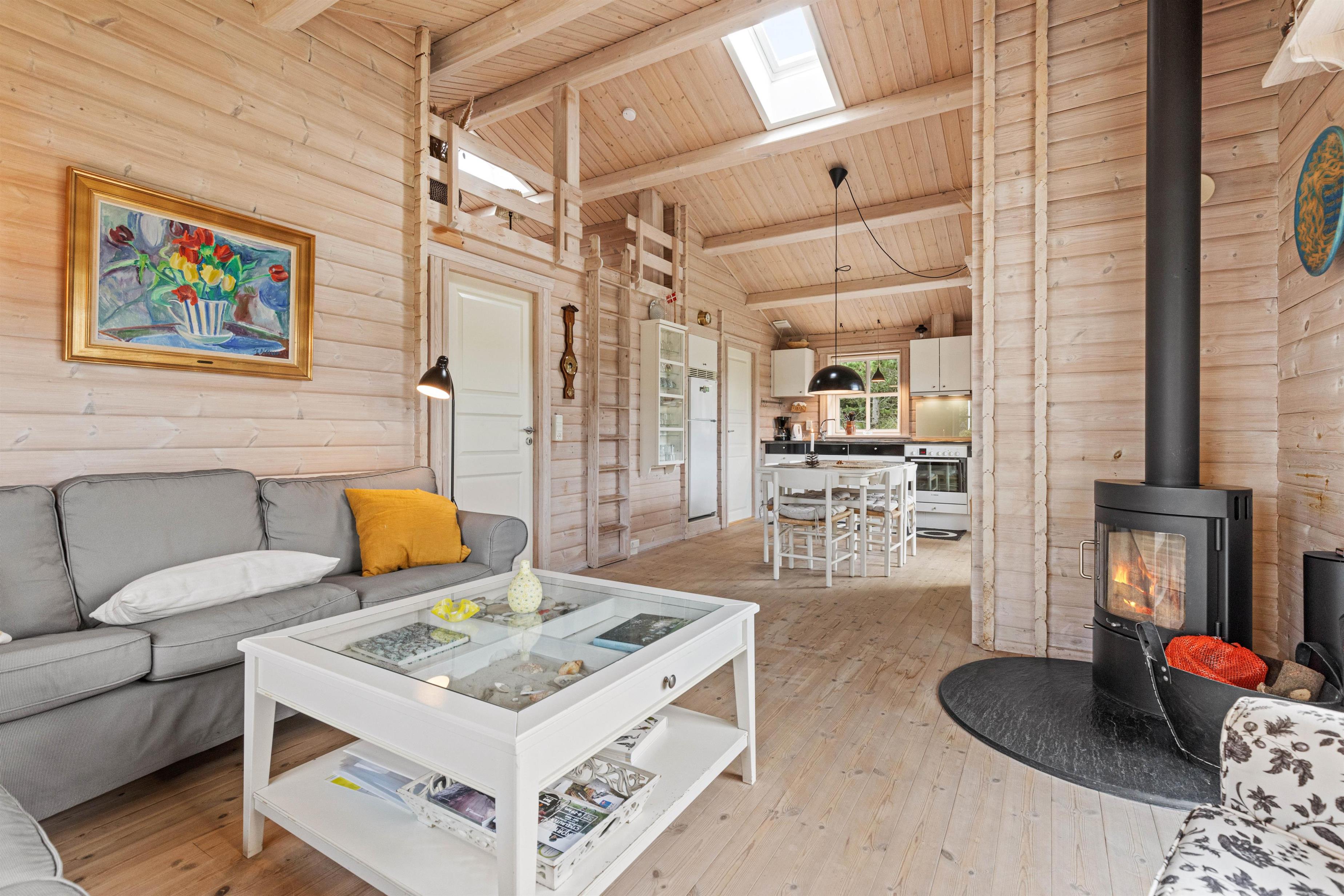 Stuen og køkkenet hænger sammen i ét stort fællesrum, og her vil I kunne nyde mange hyggelige stunder sammen. Sommerhusets brændeovn vil med sine knitrende flammer være med til at skabe en hyggelig stemning.