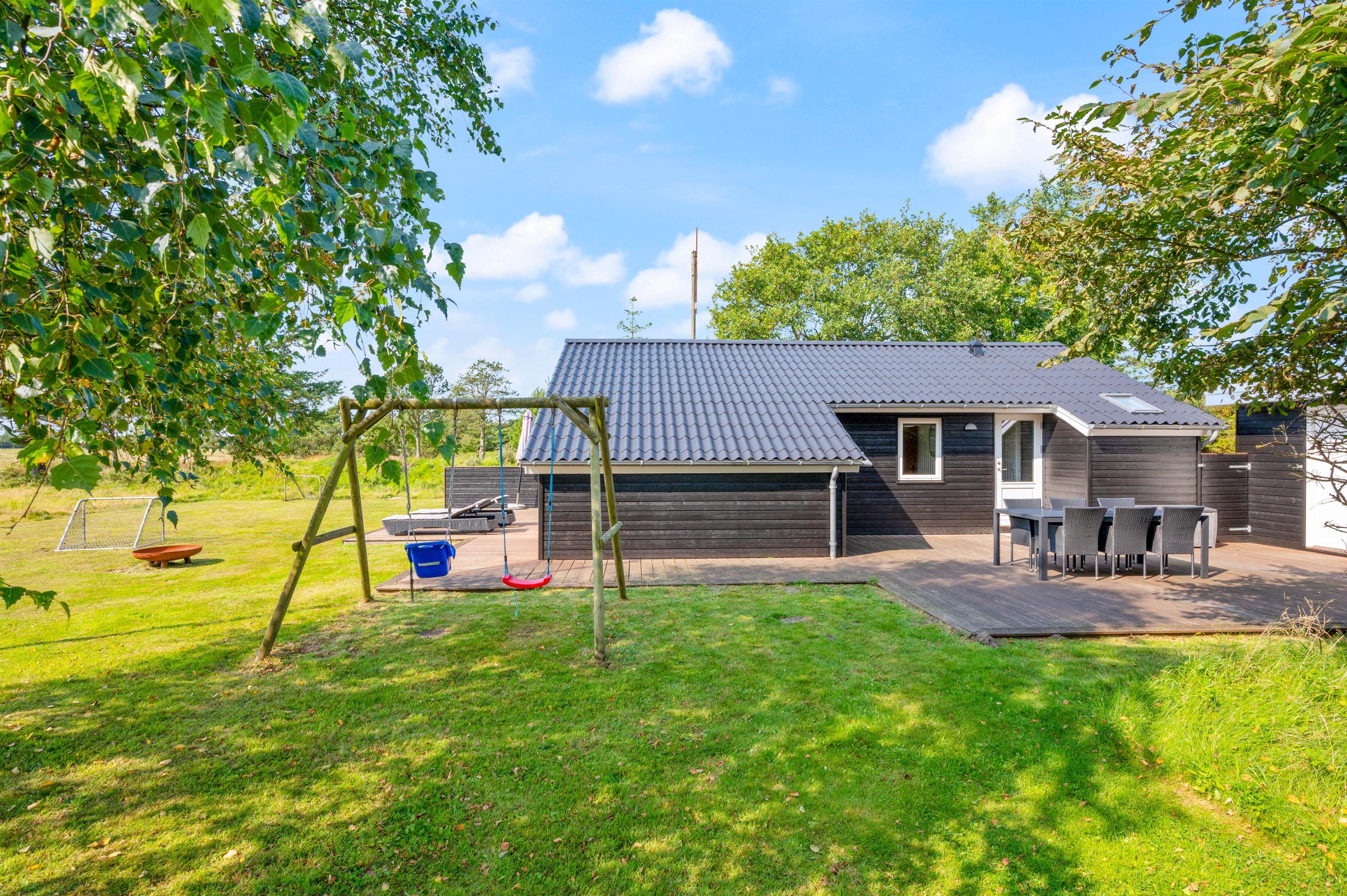 En stor åben sydvendt grund med udsigt over enge omkranset af ældre fyrre, ege- og grantræer er det første I ser, når I ankommer til huset. Her er altid udsigt, om I drikker jeres morgenkaffe i læ på østsiden af huset eller hygger jer med lange grillaftener på den delvist overdækkede terrasse mod syd-vest. Der er sørget for læ uden at forstyrre udsynet.