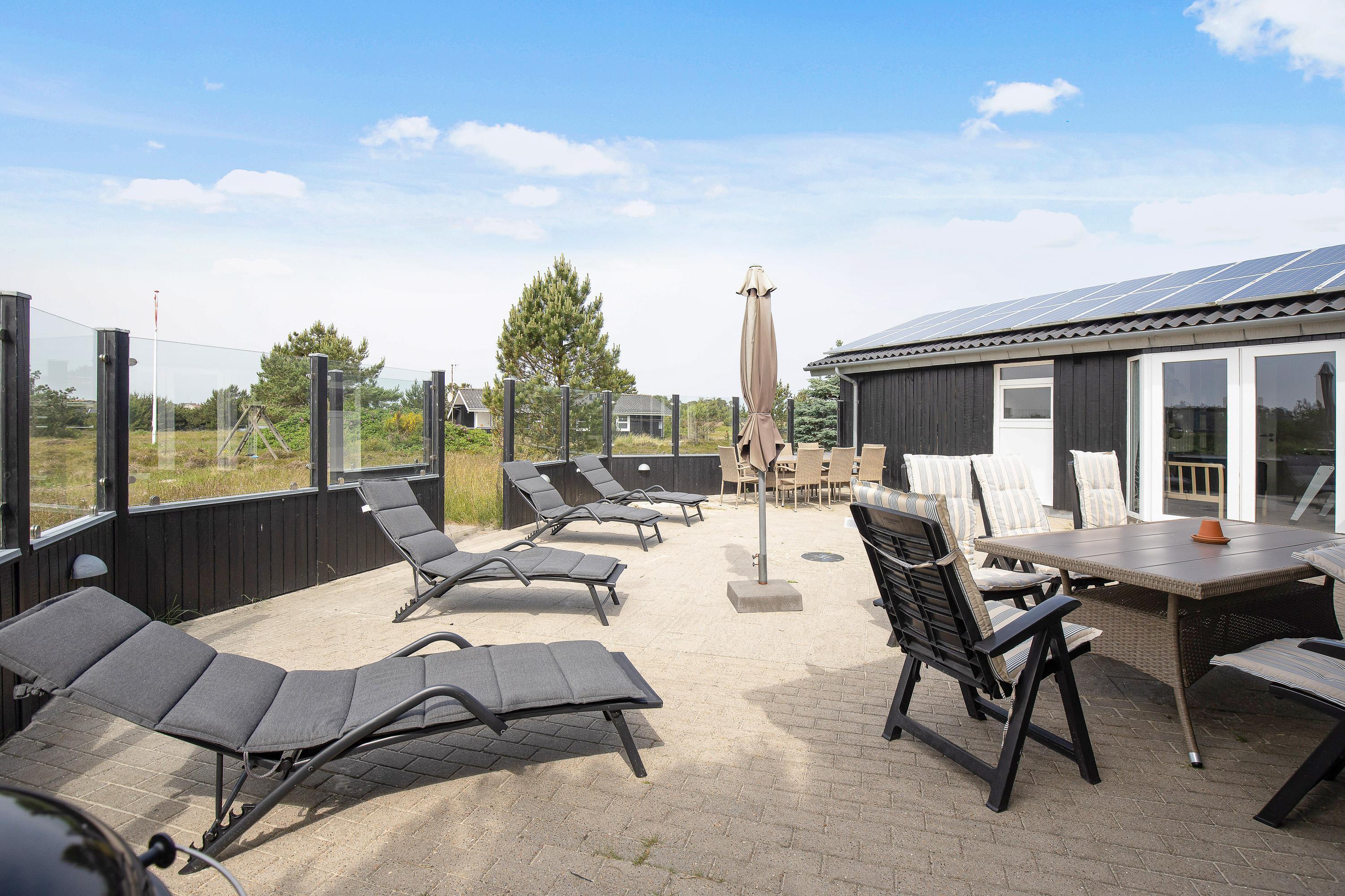 Sommerhuset har en skøn lukket terrasse, hvor hele feriebesætningen kan tilbringe de solrige feriedage – fordi terrassen er lukket, kan I nemlig have jeres hunde med, uden at de går på opdagelse i området på egen hånd.