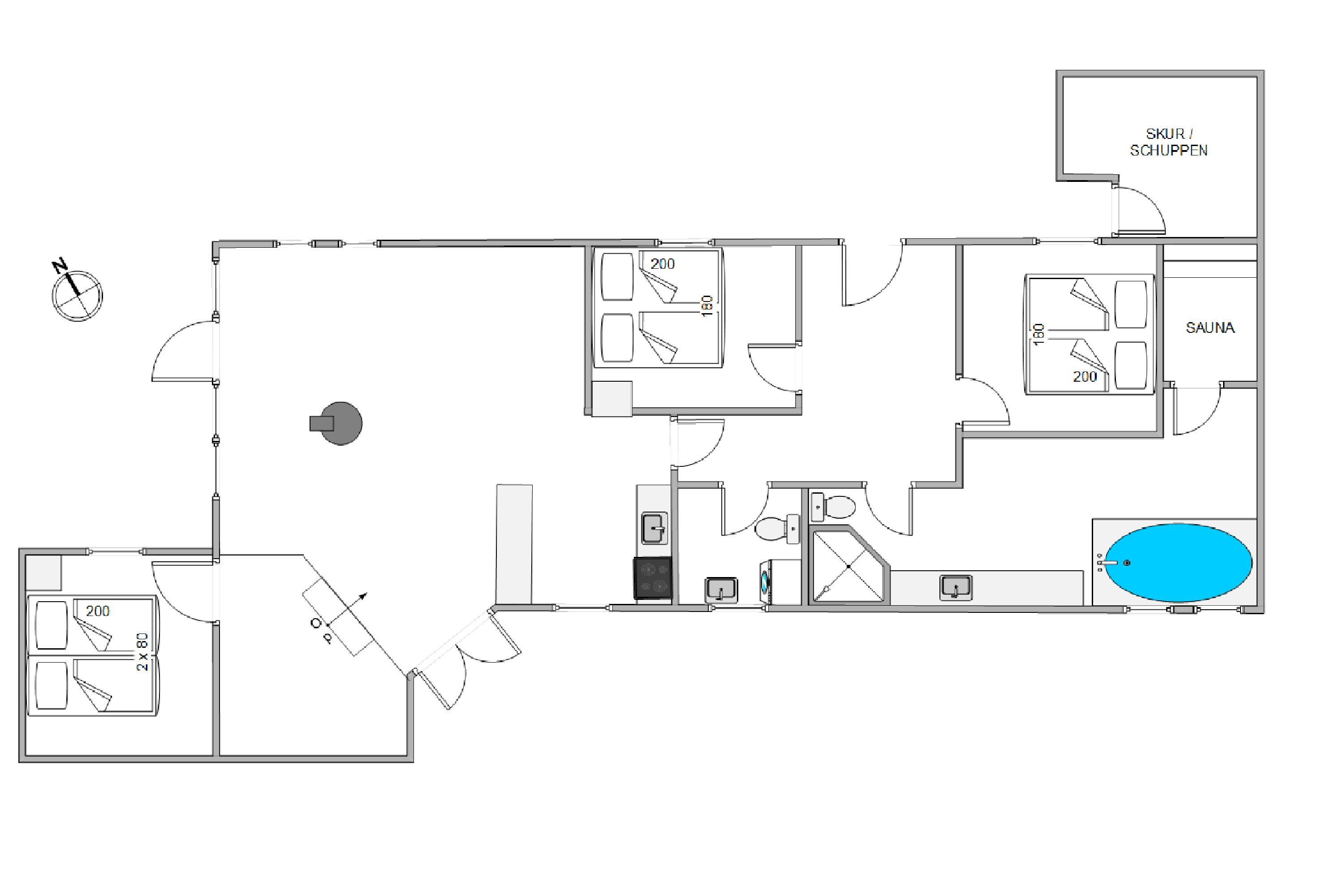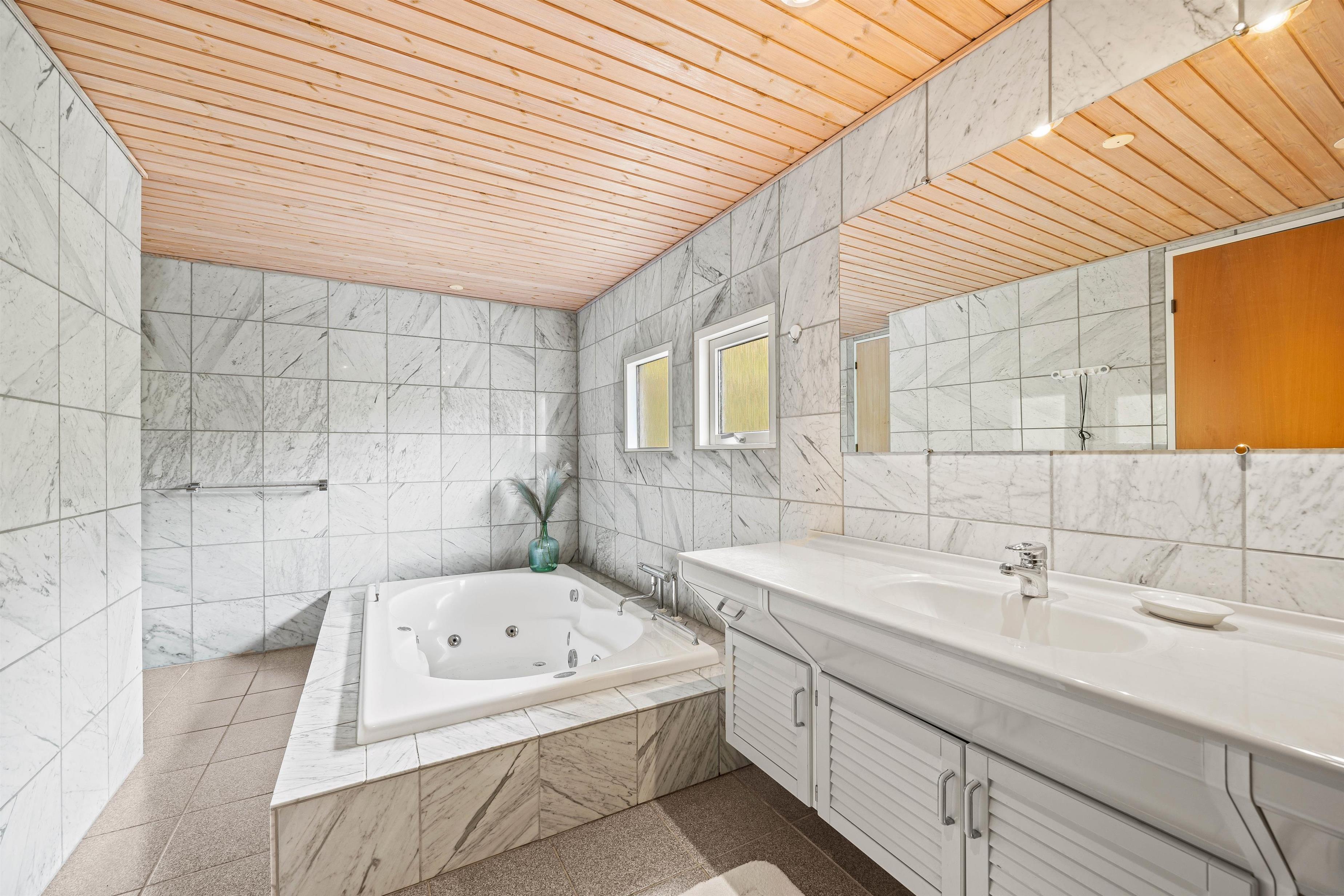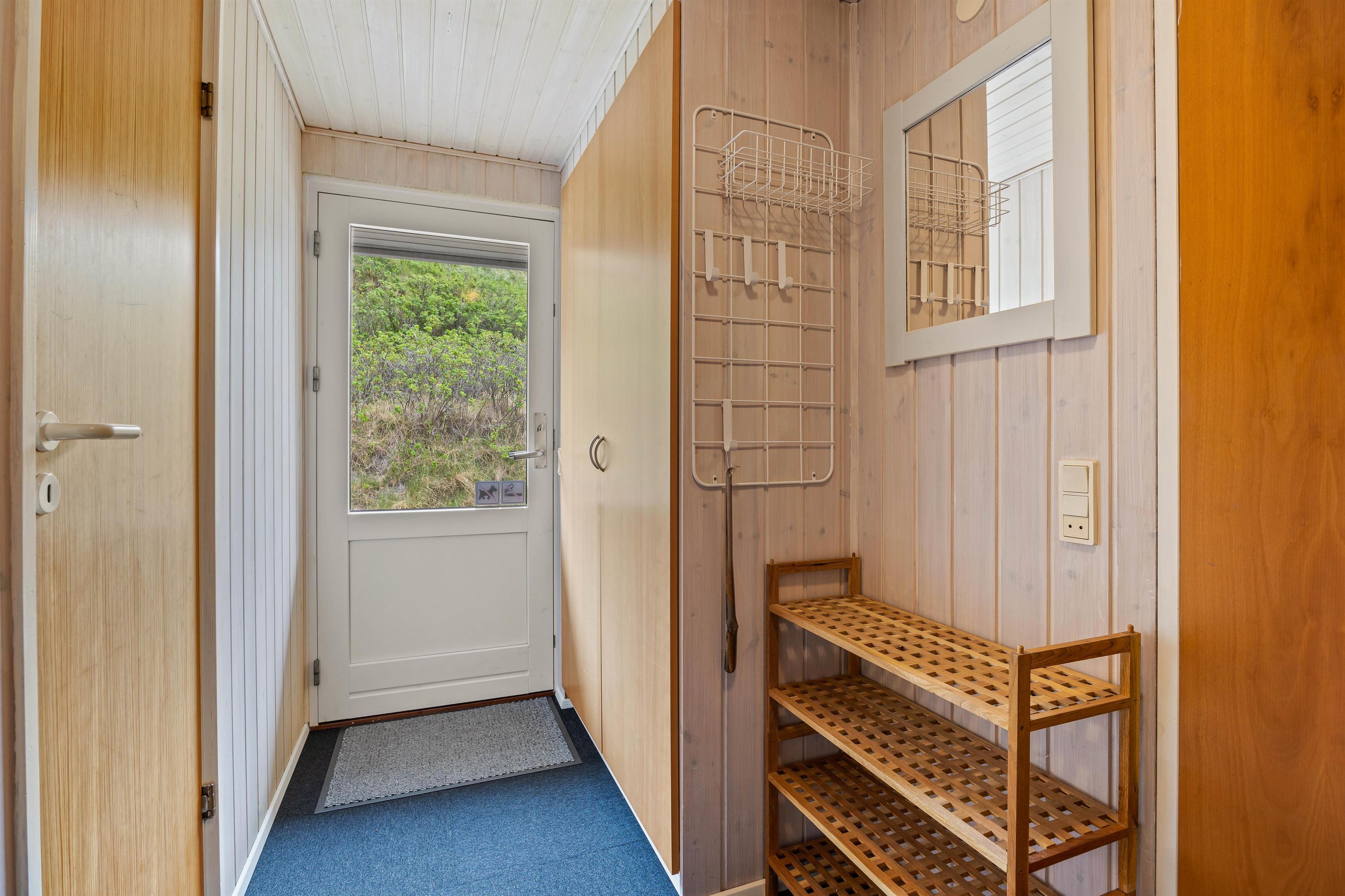Feriehuset har 3 soveværelser, hvoraf de 2 er indrettet med dobbeltsenge. Det 3. soveværelse har 2 enkeltsenge. Soveværelserne er alle med gulvtæpper. Badeværelset med lyse fliser har spabad. Her kan I slappe af efter en lang tur i naturen. Praktisk er der også et gæstetoilet i sommerhuset, så der ikke bliver for lang kø om morgenen.