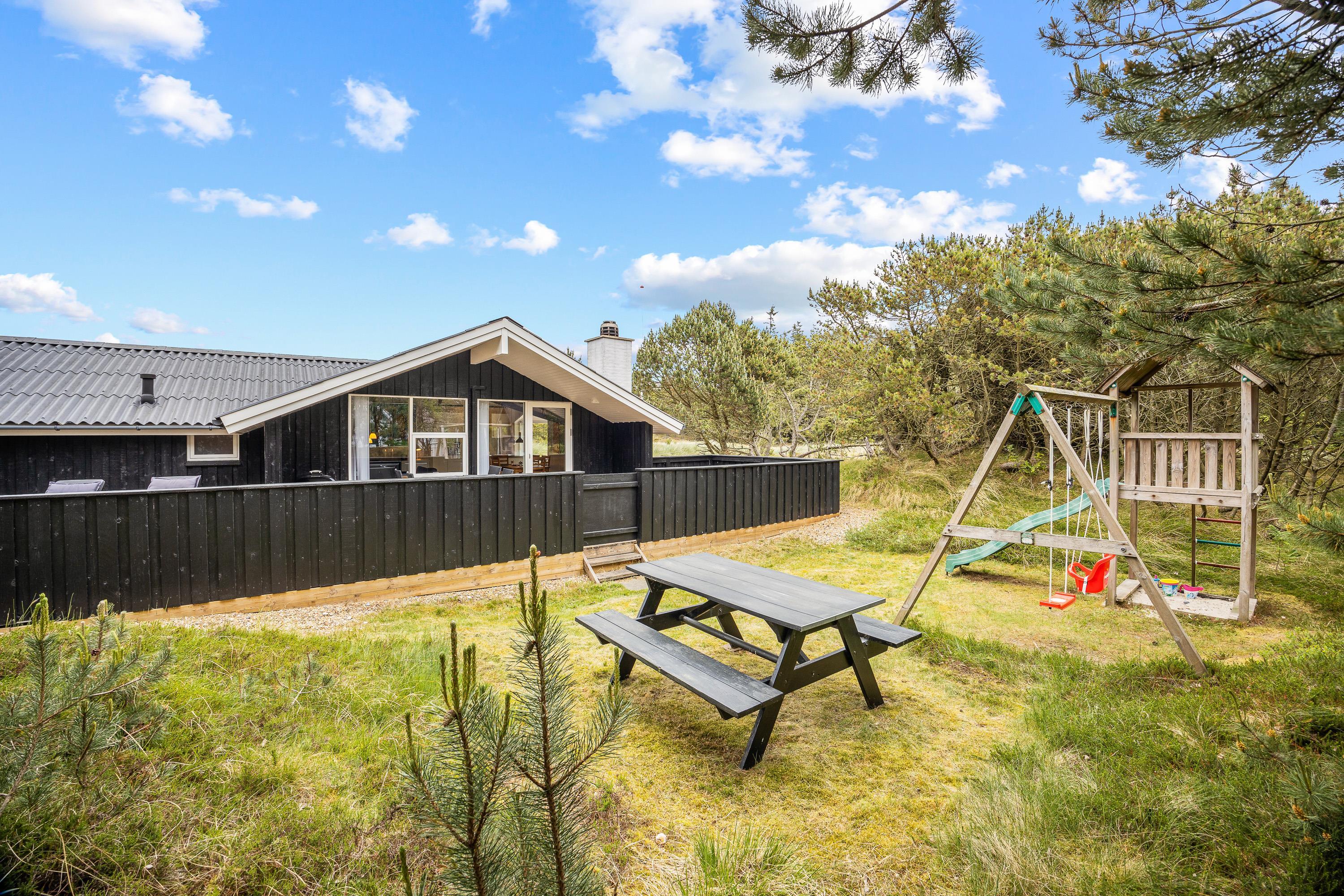 Den grønne græsplæne er et paradis for børnene og hundene, og der står et legetårn med rutsjebane og gyngestativ til de små feriegæster.