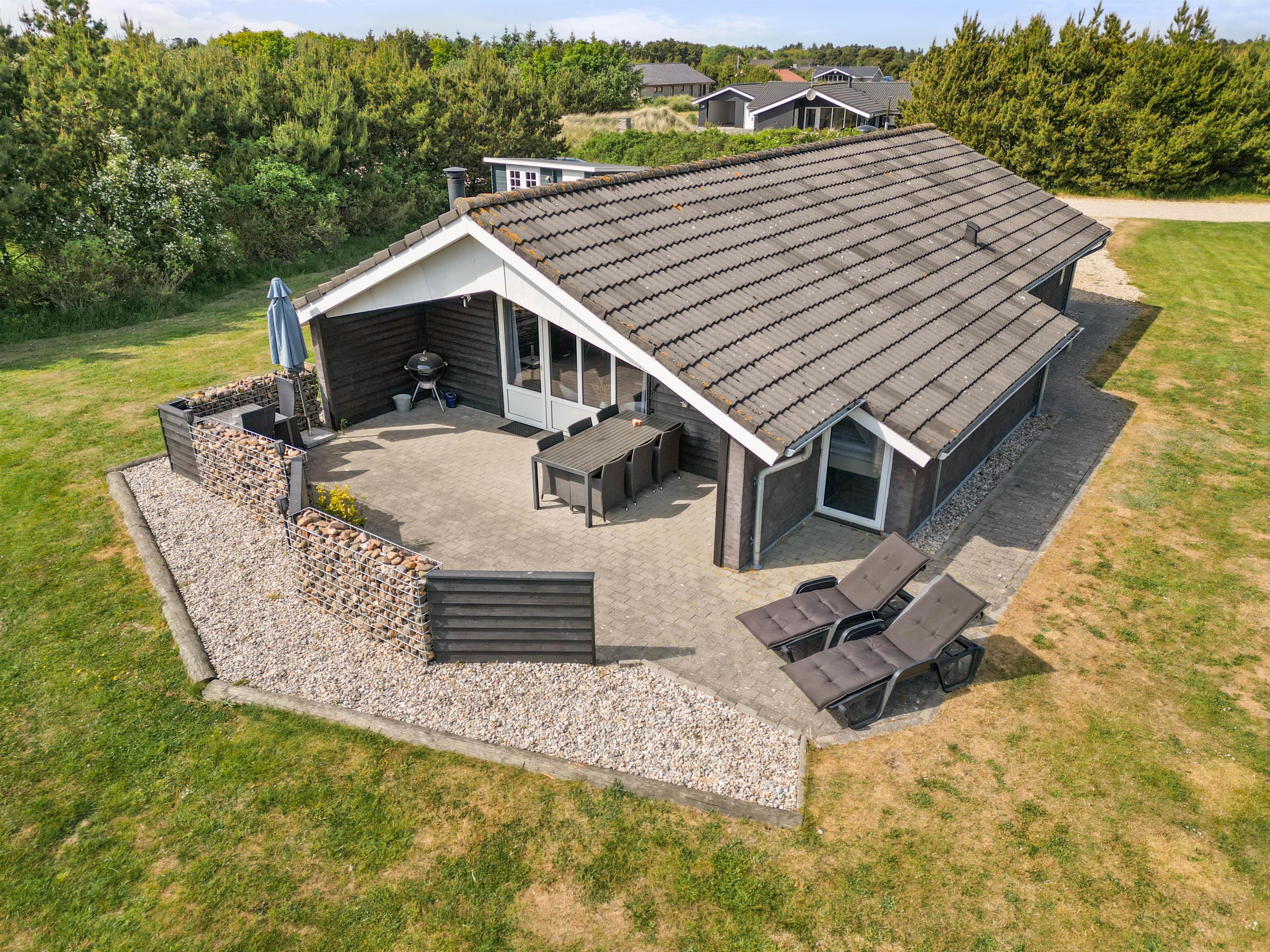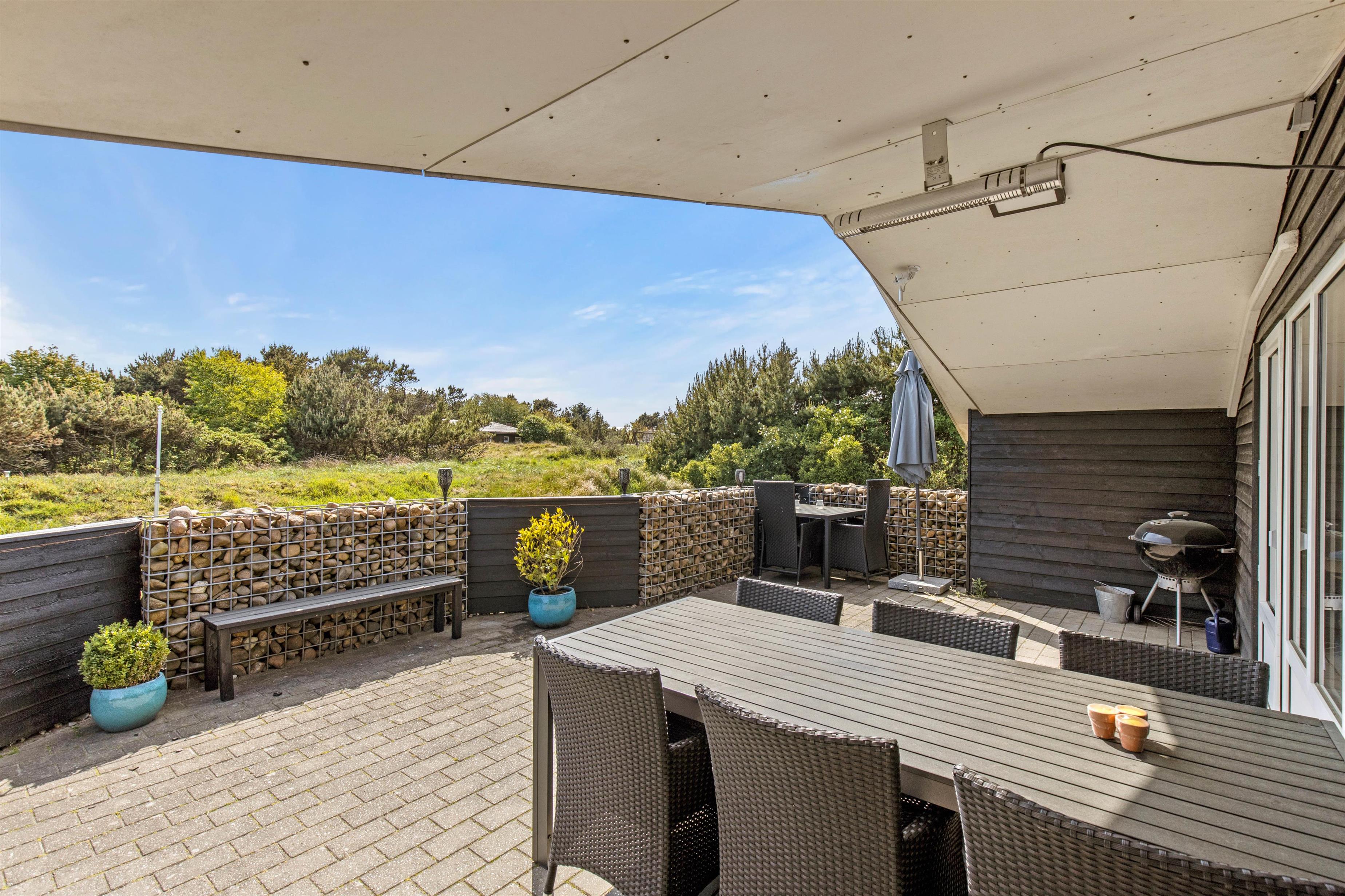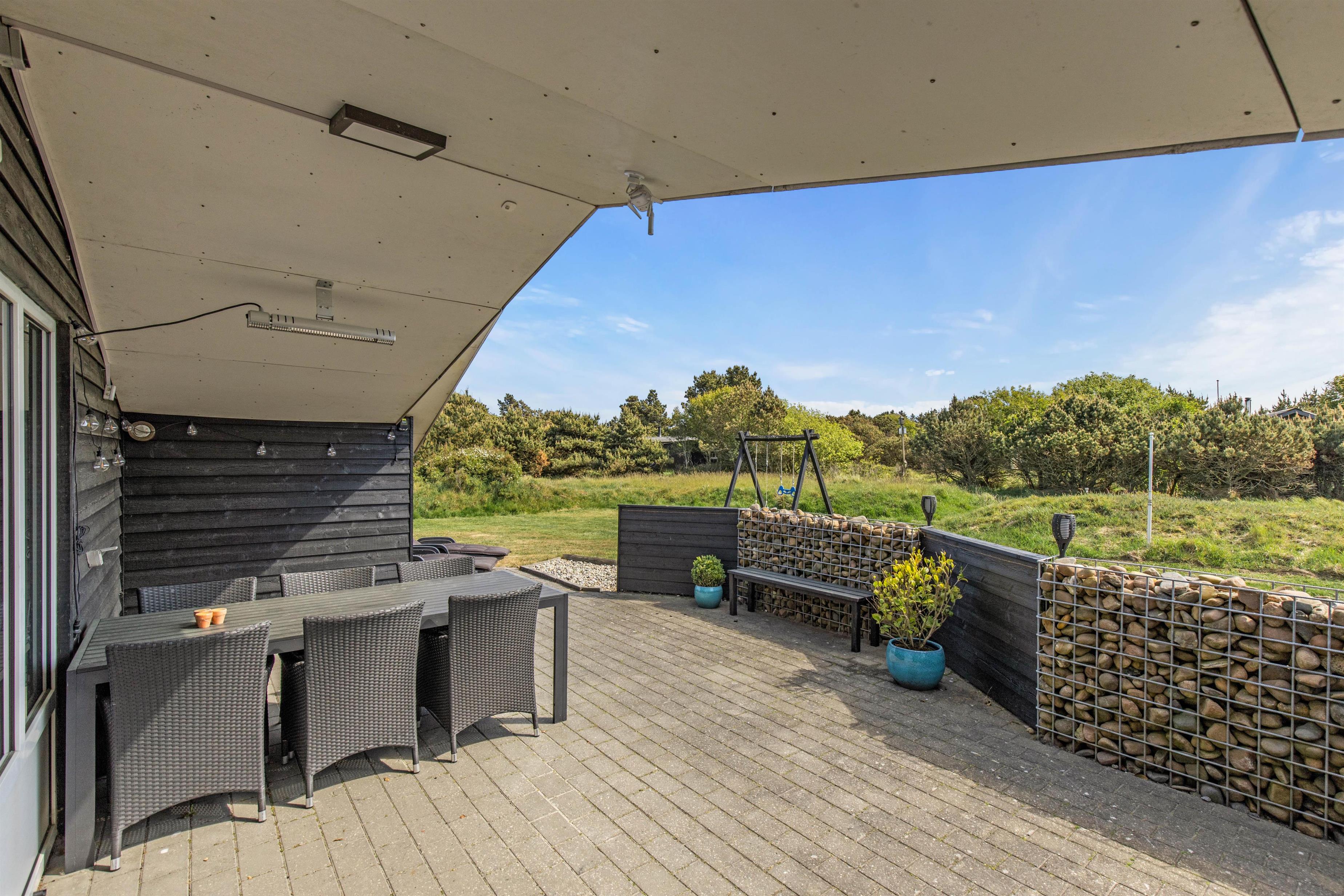 Efter de mange timers hygge ude i naturen, kan aftensolens sidste stråler nydes fra feriehusets åbne og afskærmede sydvendte terrasse. Her finder I både liggestole og komfortable havemøbler, og lækker mad kan nydes fra feriehusets grill. På solrige dage skaber en parasol skygge på terrassen, mens familiens mindste leger på gyngestativet.