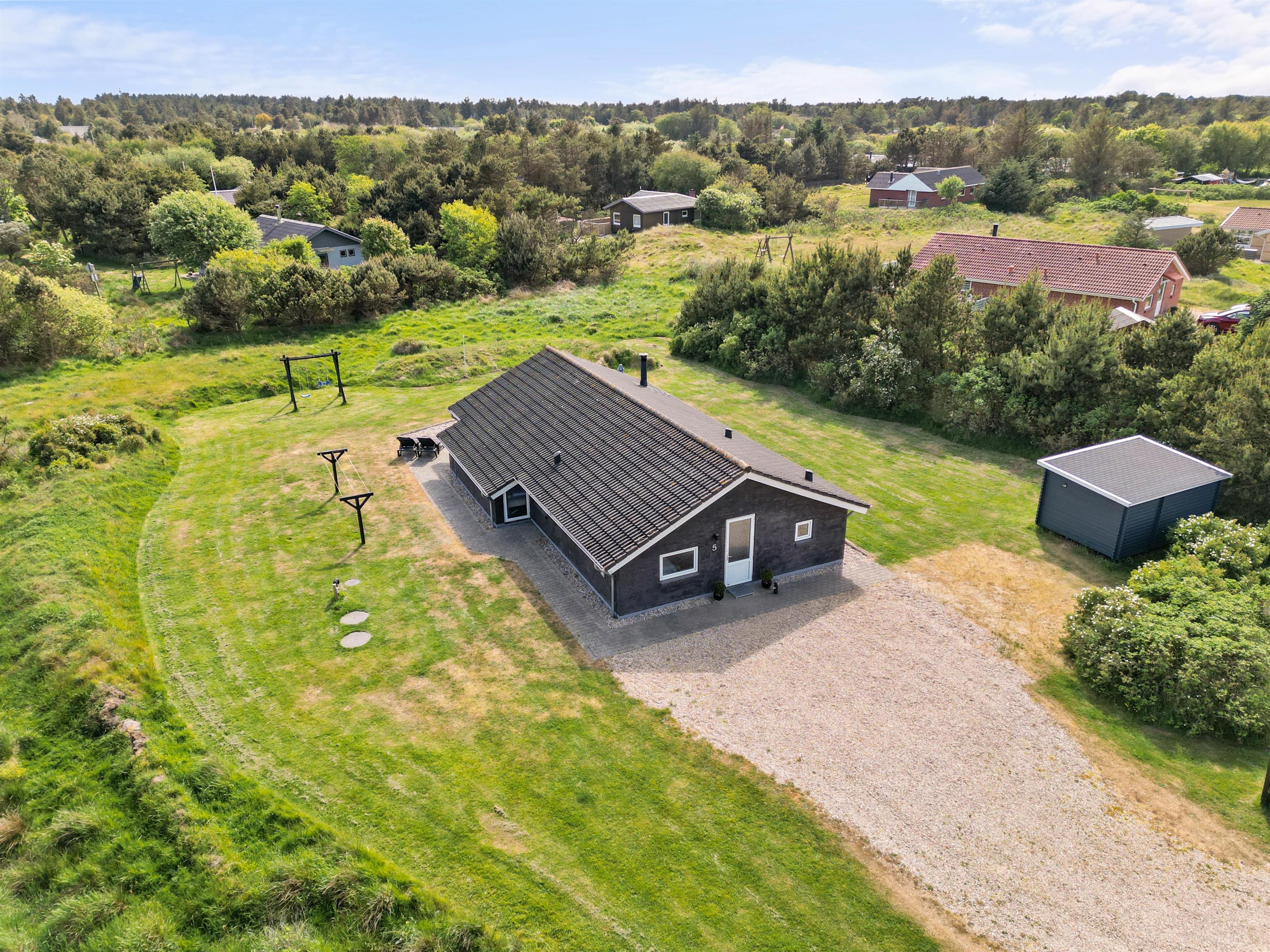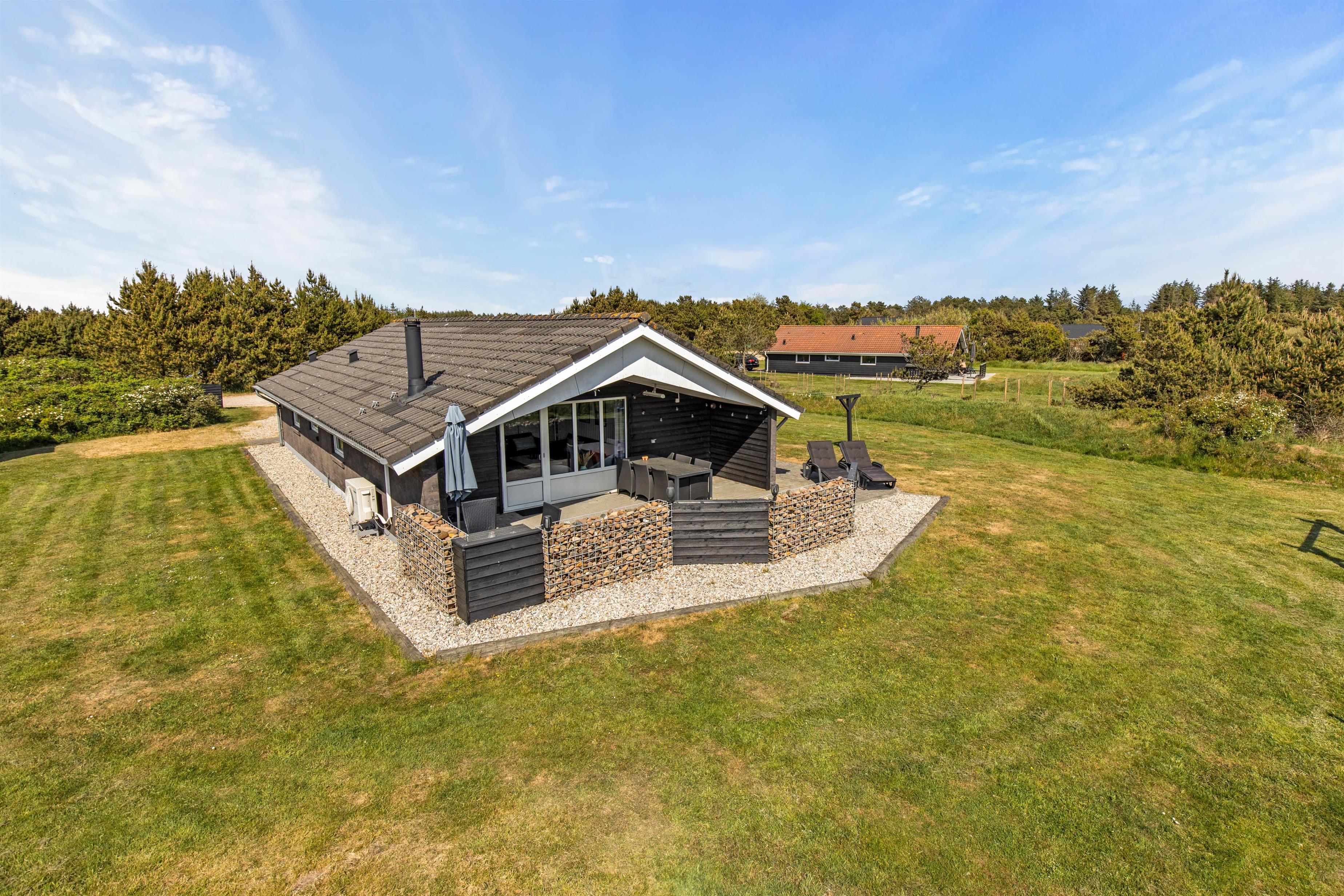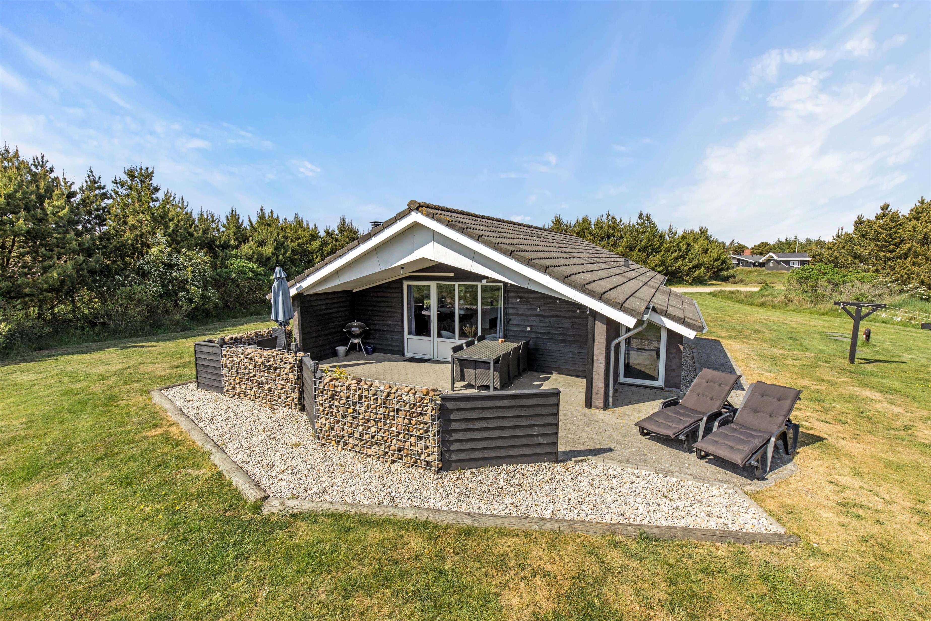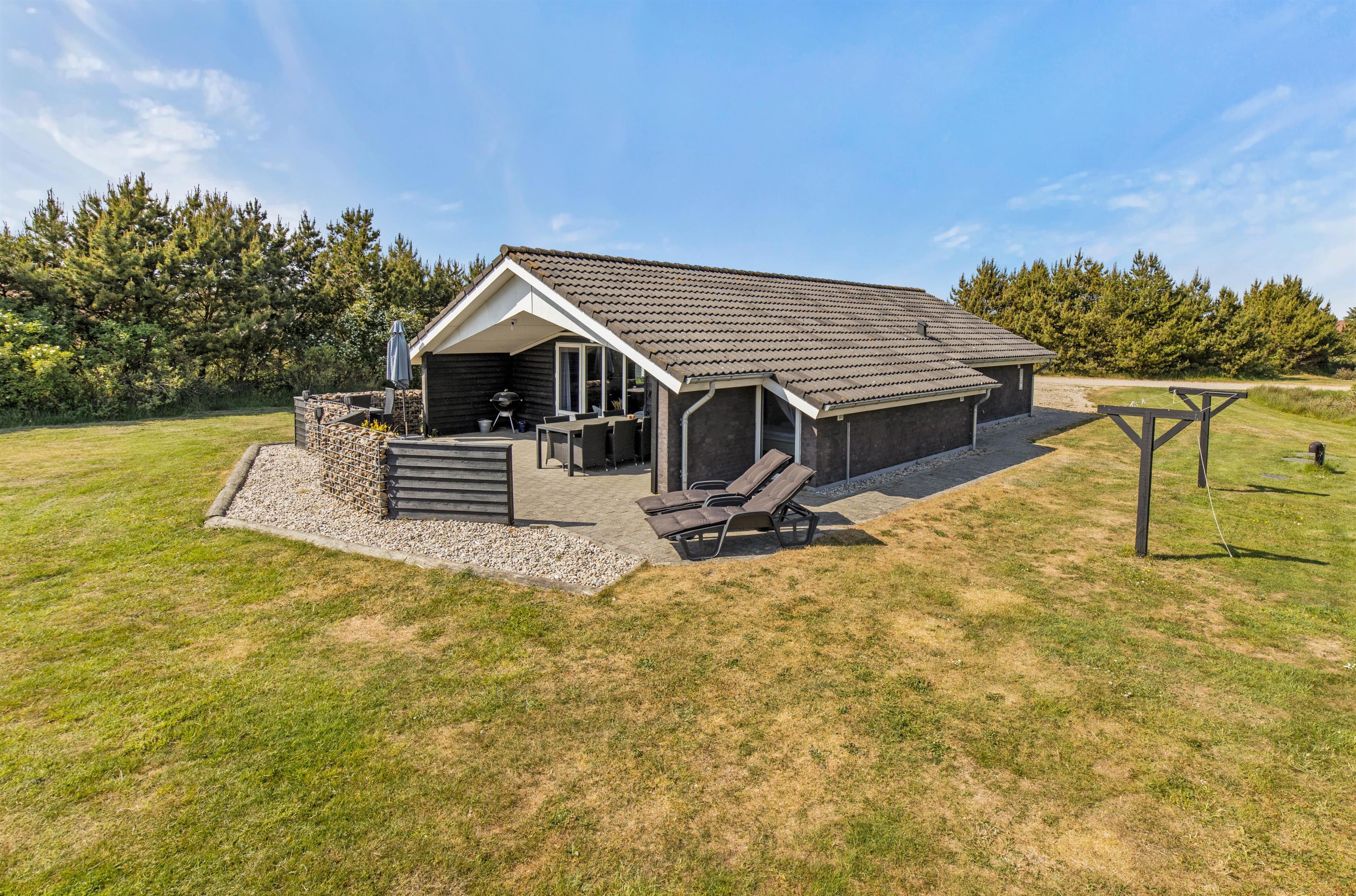 Efter de mange timers hygge ude i naturen, kan aftensolens sidste stråler nydes fra feriehusets åbne og afskærmede sydvendte terrasse. Her finder I både liggestole og komfortable havemøbler, og lækker mad kan nydes fra feriehusets grill. På solrige dage skaber en parasol skygge på terrassen, mens familiens mindste leger på gyngestativet.