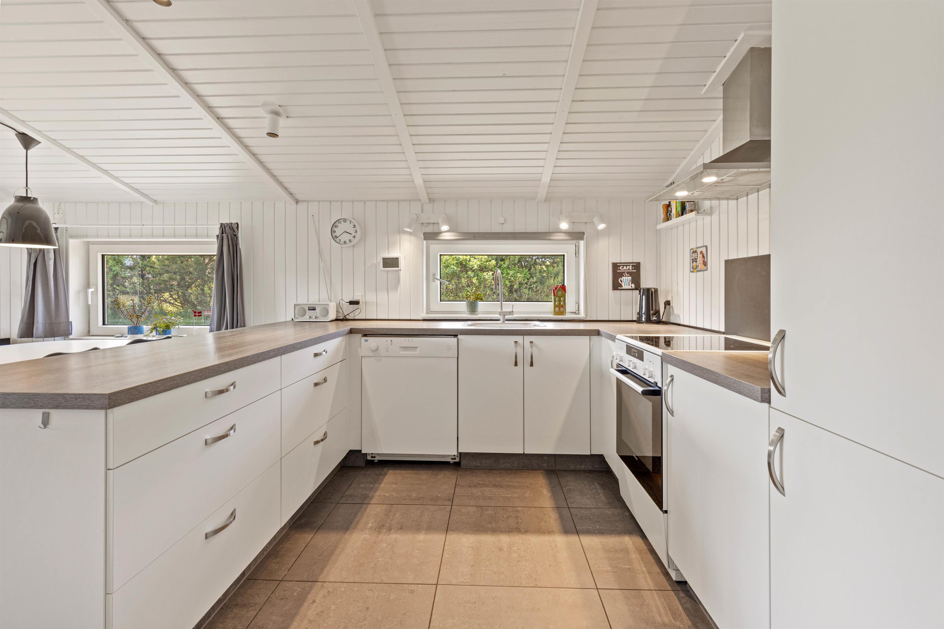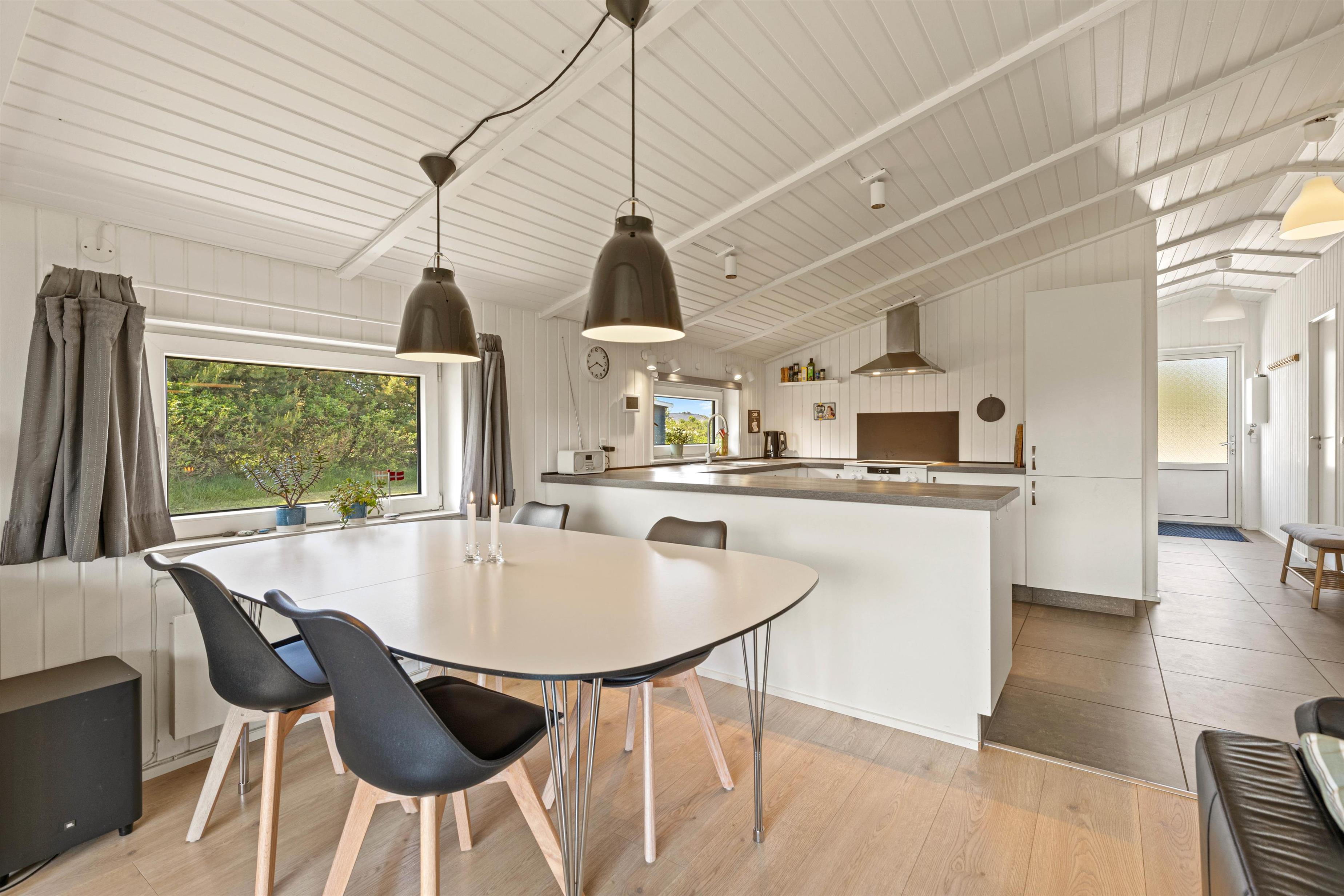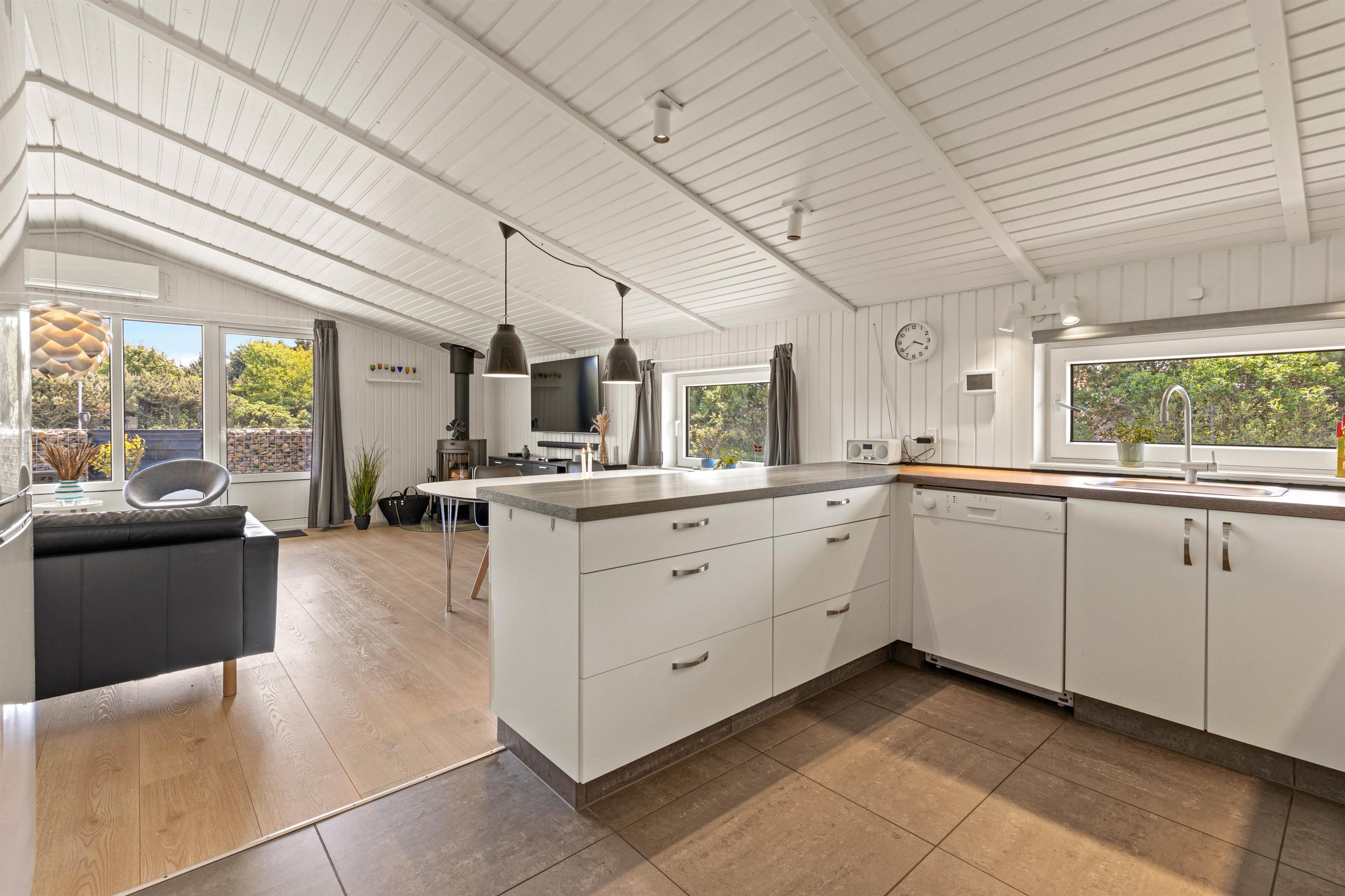 Sommerhuset er lyst og åbent med stue og køkken i ét. Her er der god plads til hele familien, og husets kok er stadig med, hvor det hele sker. Feriehuset er også udstyret med såvel opvaskemaskine, vaskemaskine og tørretumbler, der især er praktisk for småbørnsfamilier.