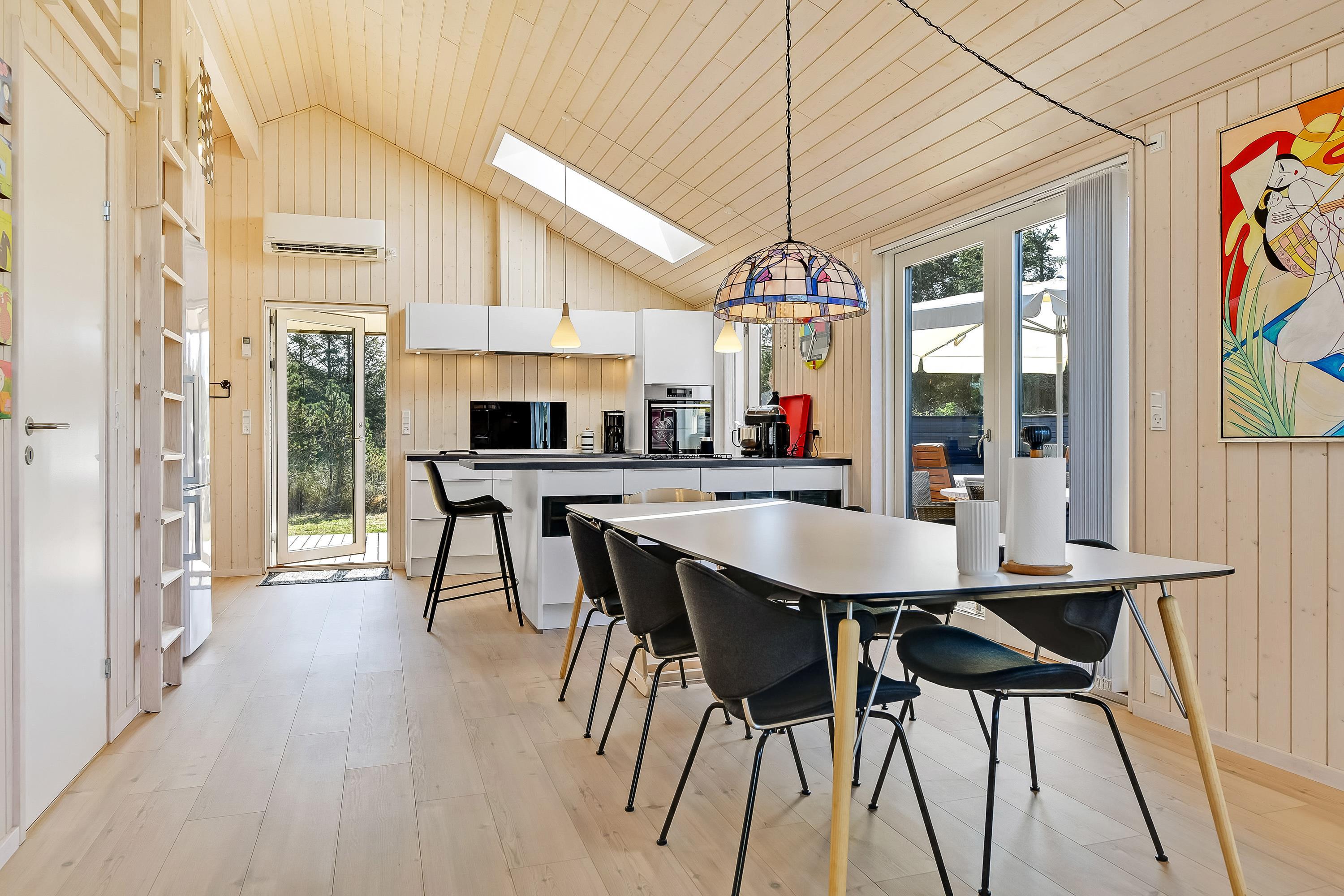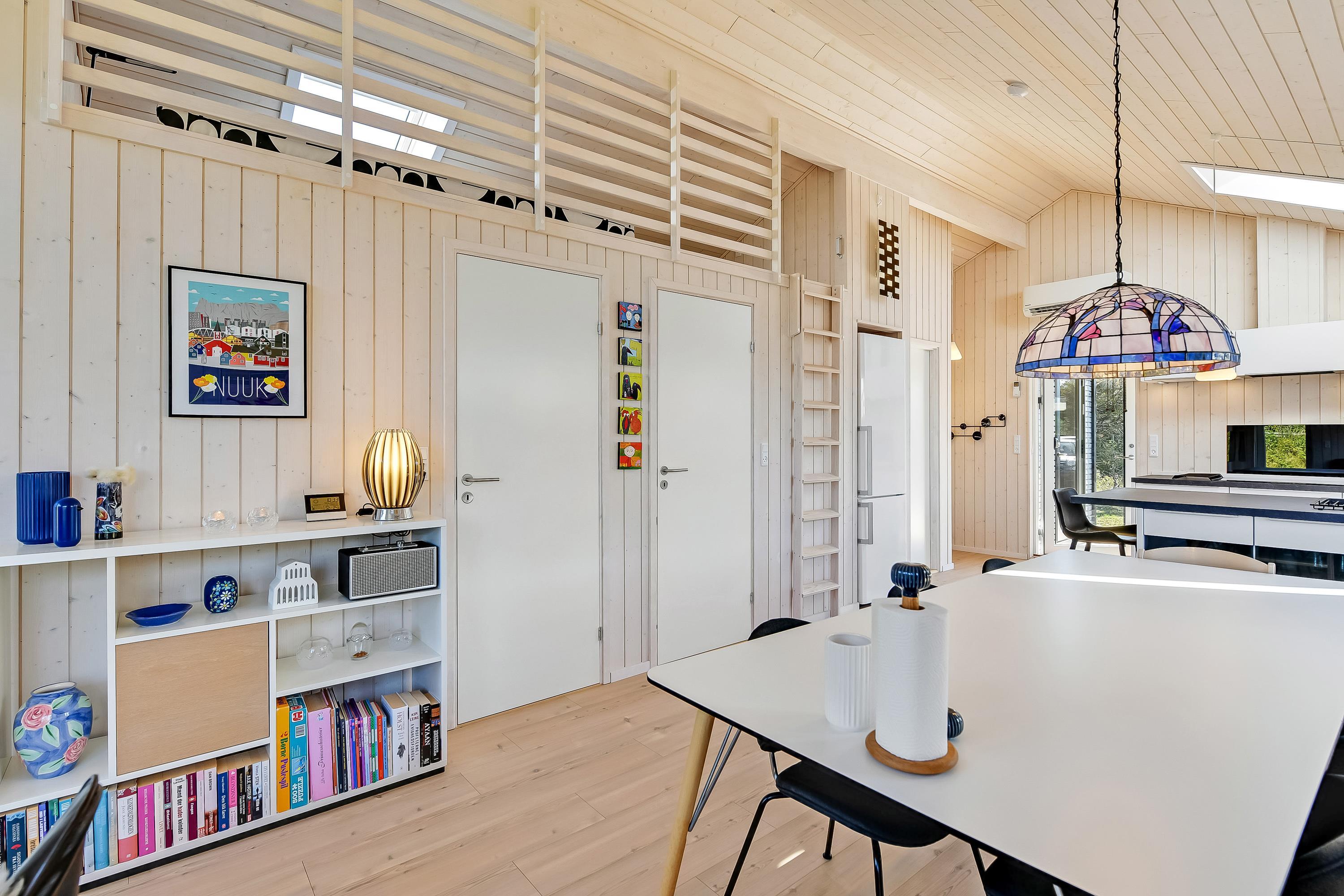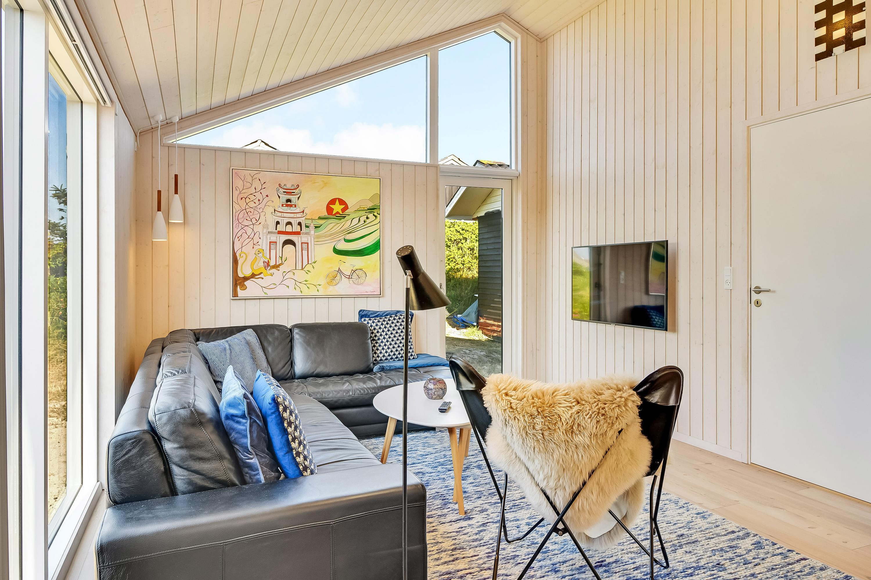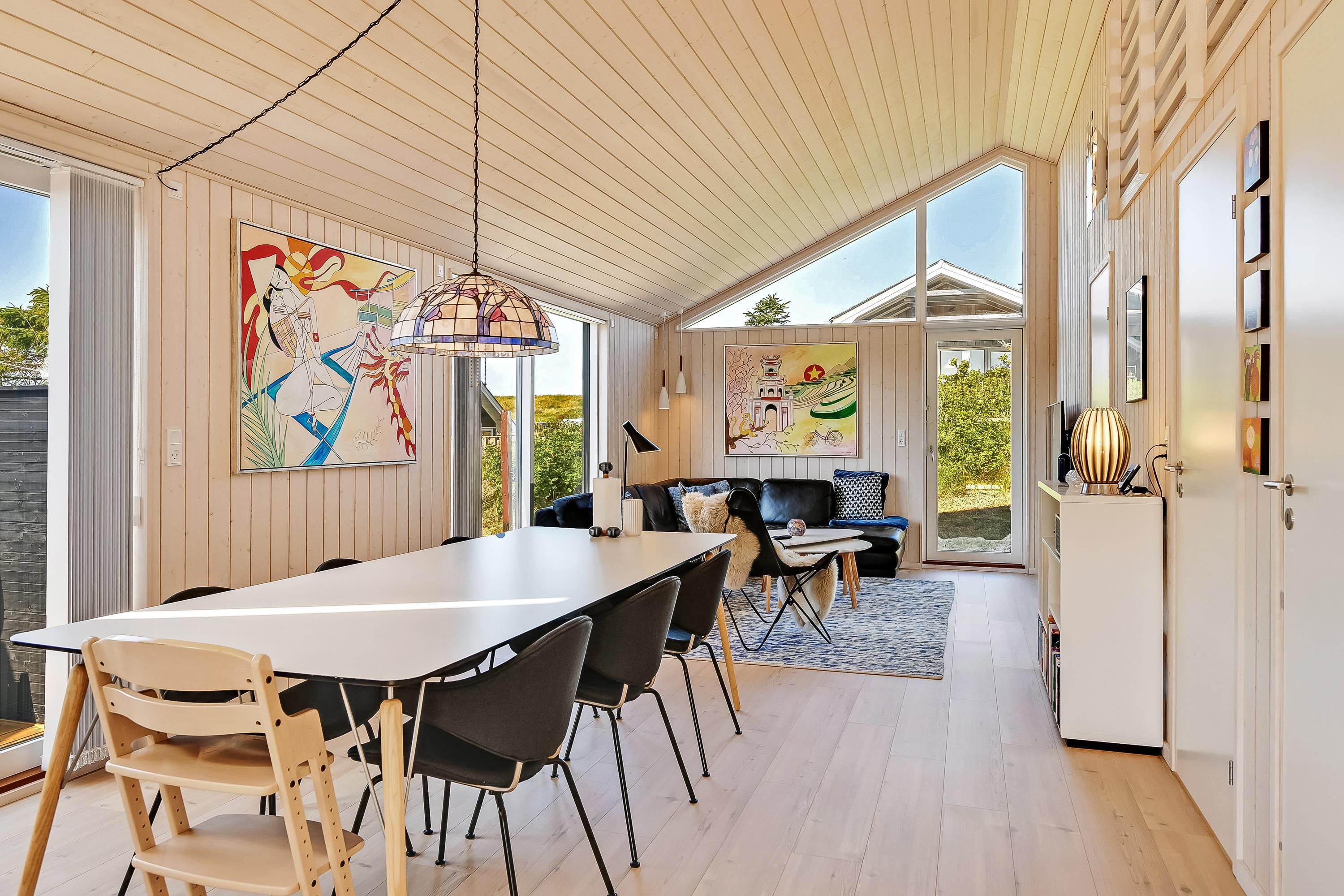 Indretningsstilen er et velafstemt miks mellem det moderne og hyggelige, og med højt til loftet og store vinduer bliver rummene åbnet op, så der skabes en indbydende atmosfære i hele sommerhuset.
