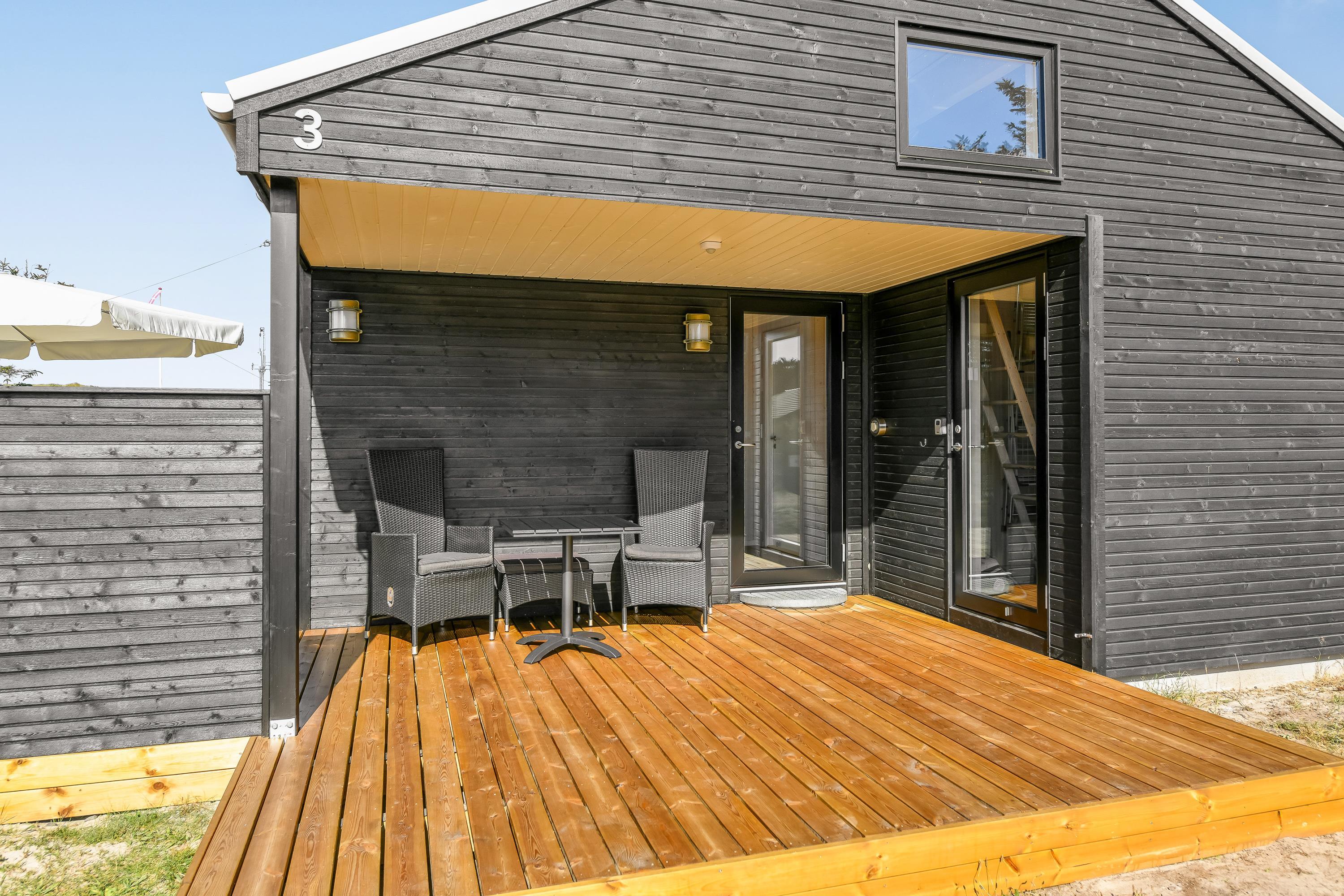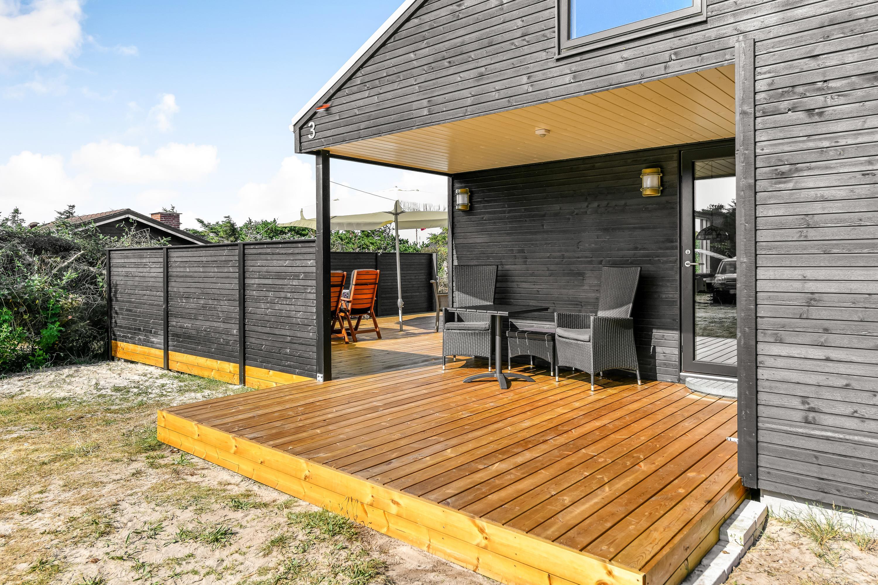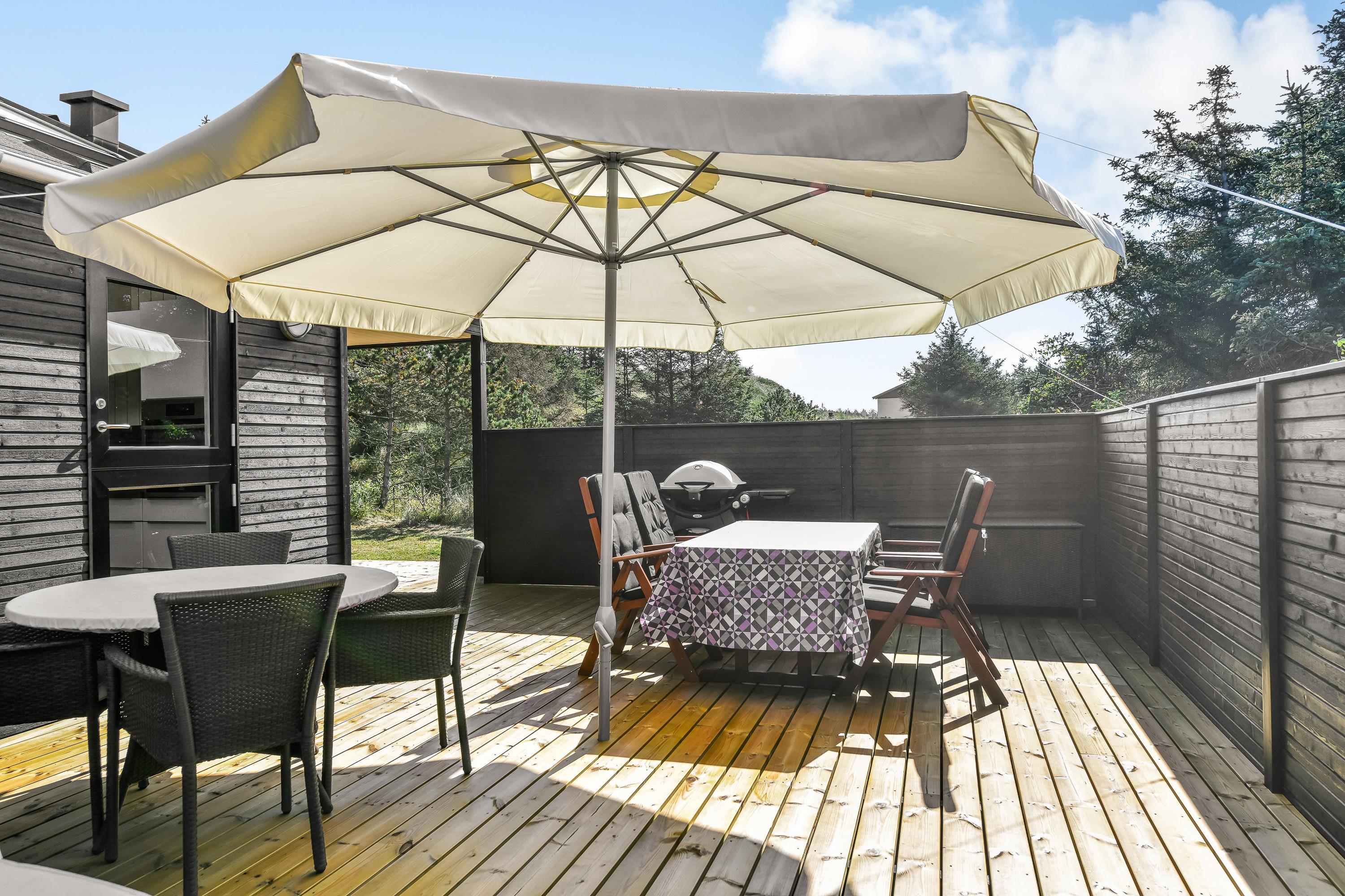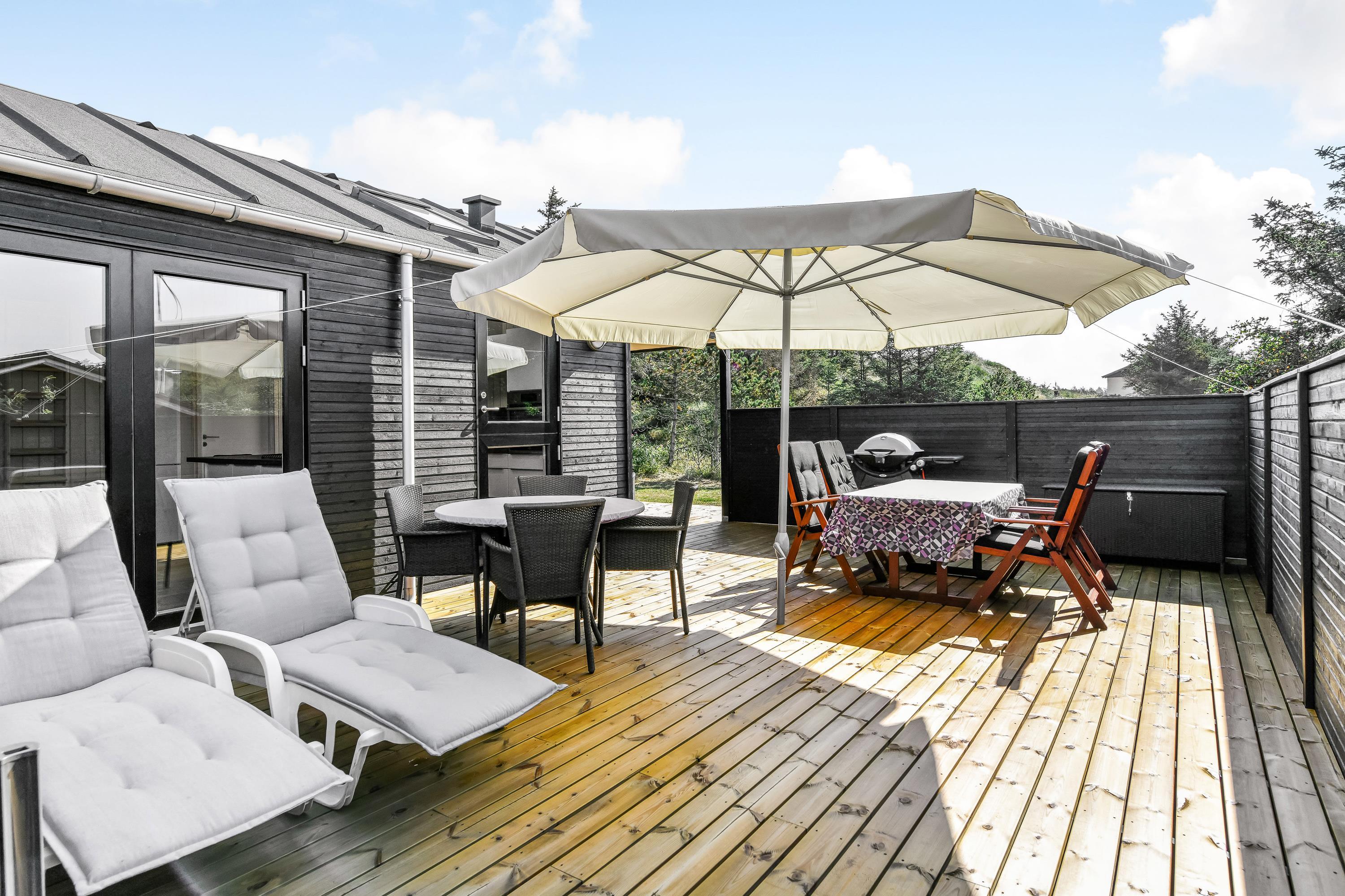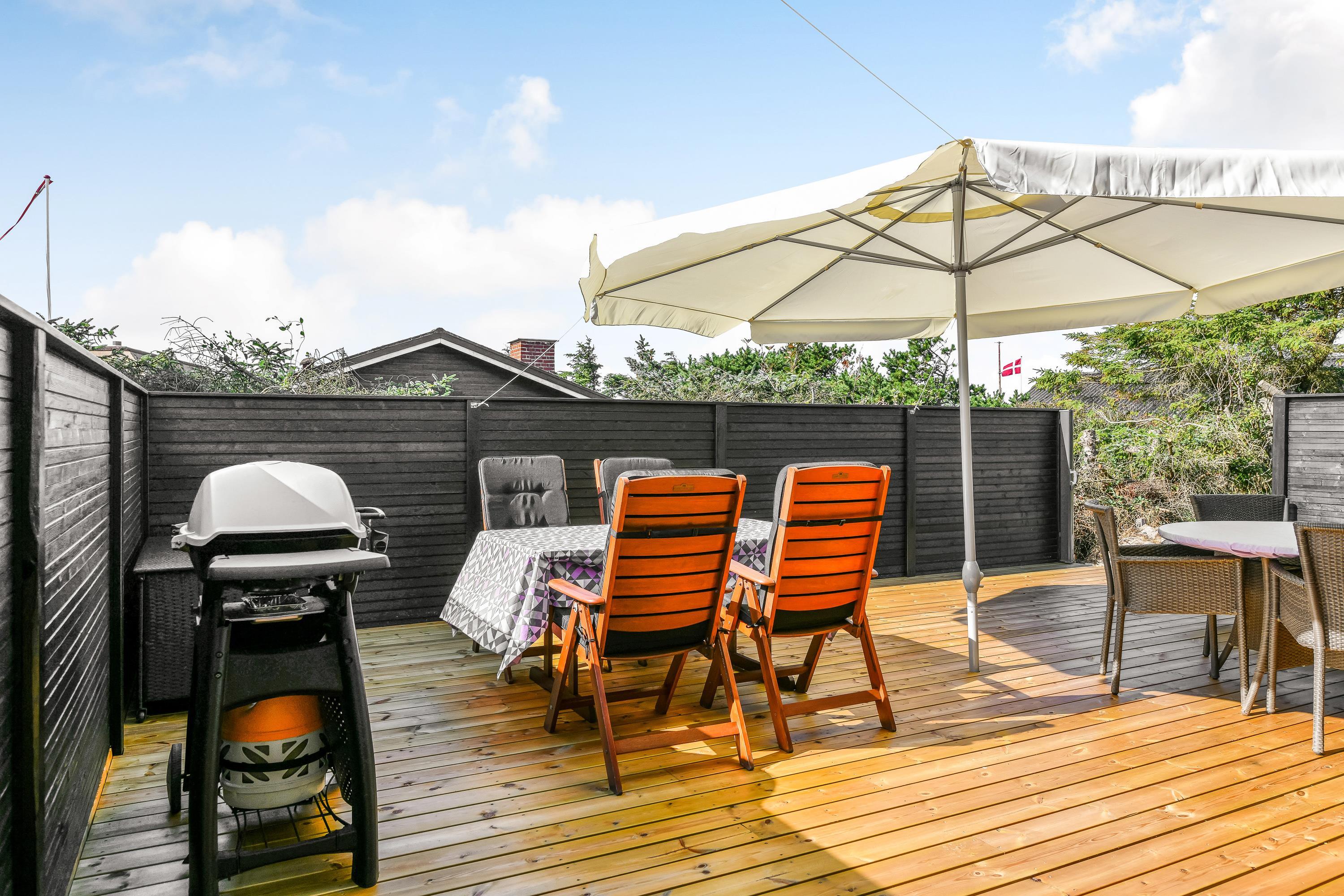 Med til feriehuset i Vejers Strand hører en afskærmet terrasse. Med havemøbler, liggestole og grill har I de bedste forudsætninger for at nyde den friske luft og det unikke klitlandskab. Mens I solbader på terrasse kan I høre Vesterhavet bruse.