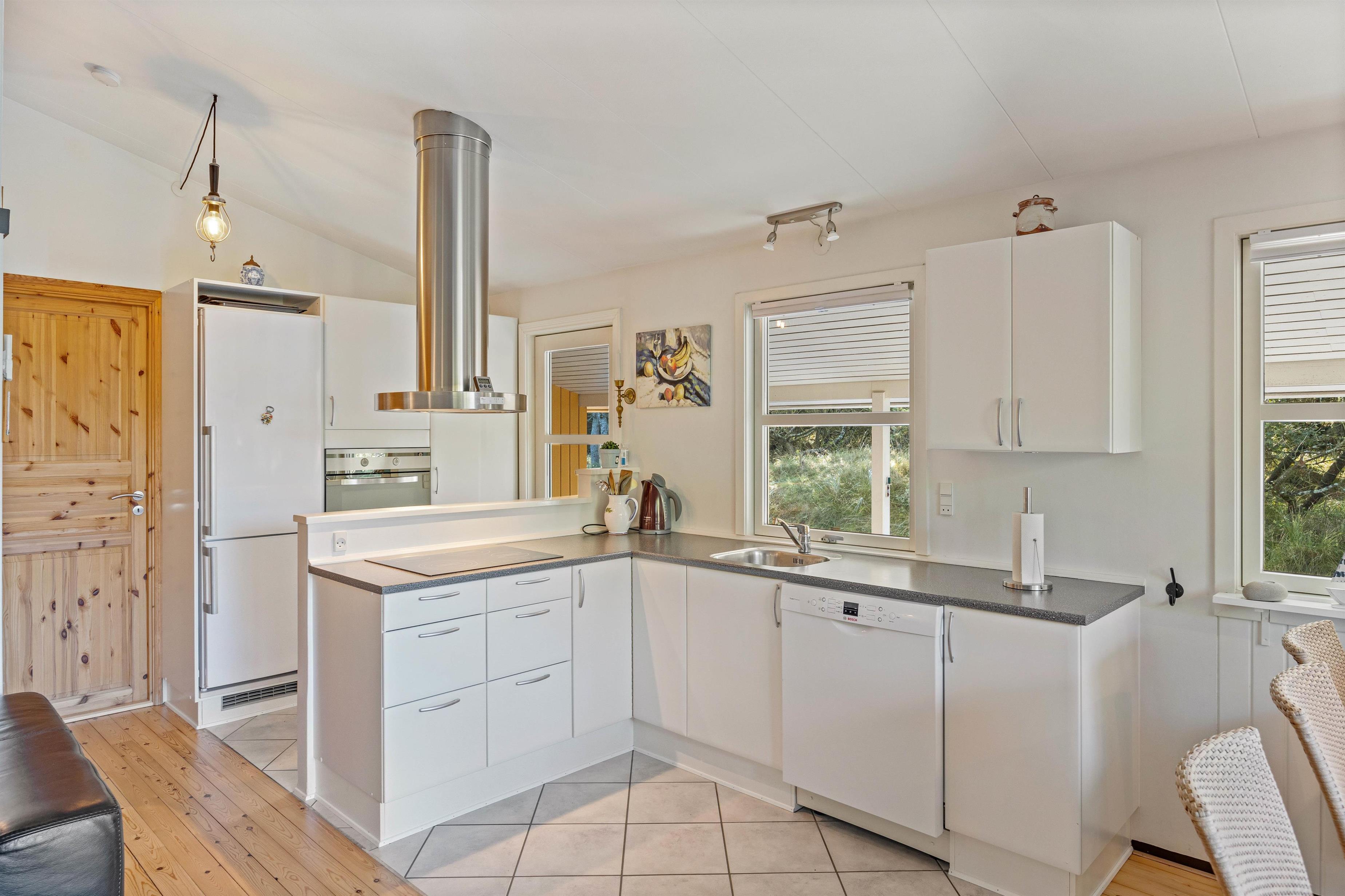 Hjertet i sommerhuset på Torskevej 29 i Vejers er det lyse, hyggelige alrum, der samler køkken, stue og spiseplads. Her kan alle 6 feriegæster tilbringe mange skønne feriestunder med bl.a. film i tv’et og madlavning i køkkenet.