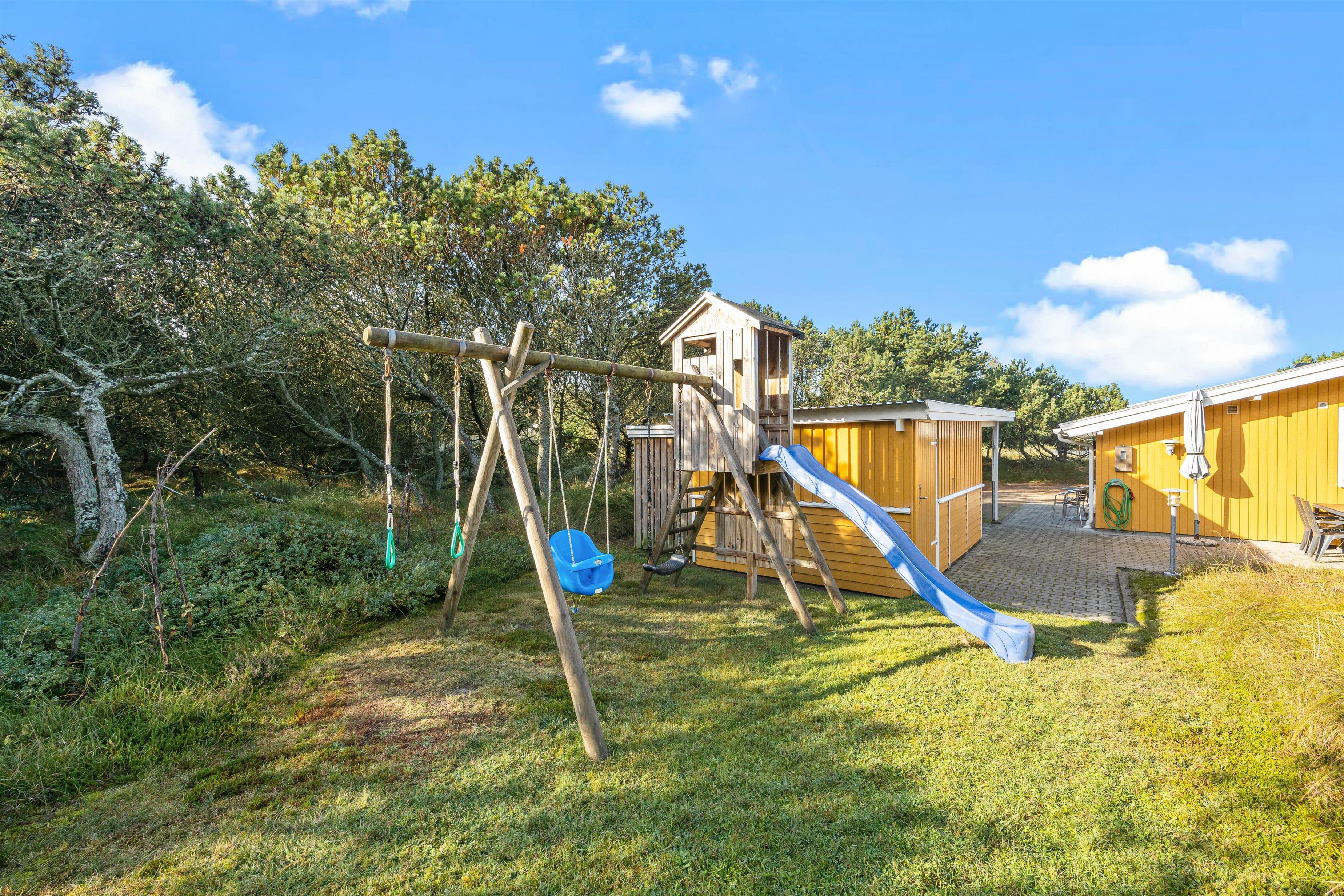 På sommerhusets udeområde kan I finde jer til rette på terrassen, hvoraf de 25 m2 er overdækket mod vest og syd, så man kan være udenfor hele dagen uanset vejret og om aftenen, hvor duggen falder, og så du kan smide skoene og slappe af uden at skulle tænke på, om de bliver våde. Udenfor har I også havemøbler og liggestole til rådighed, og mens I slapper af i dem, kan børnene lege i den hyggelige have, der tillige byder på et gyngestativ til feriens yngste gæster.