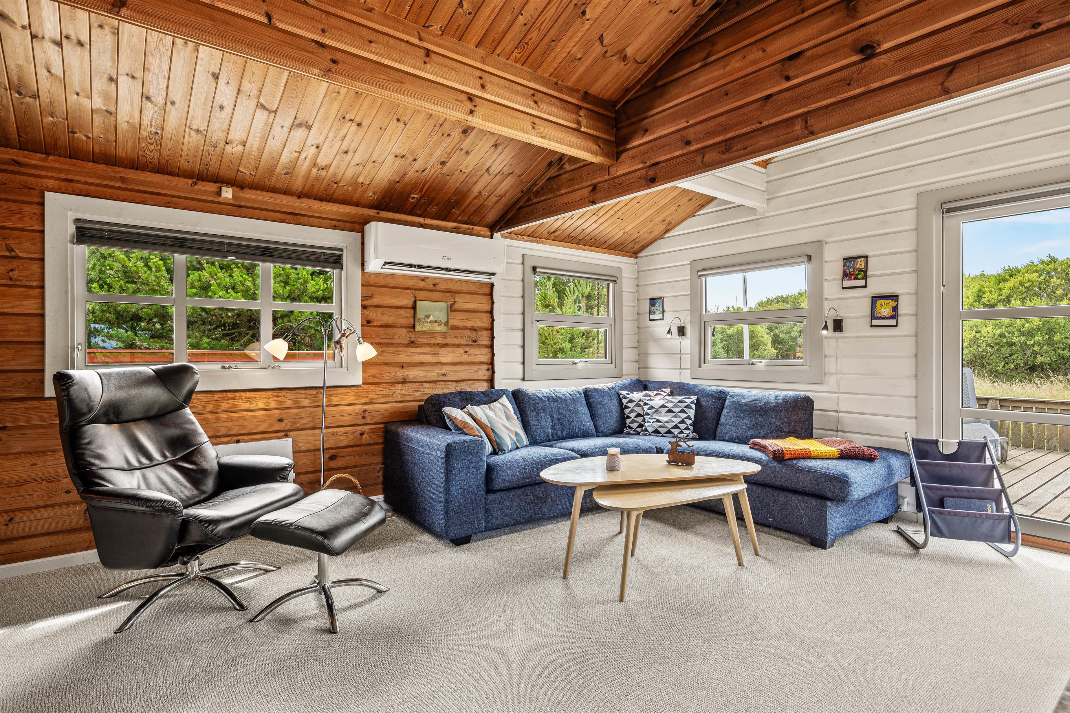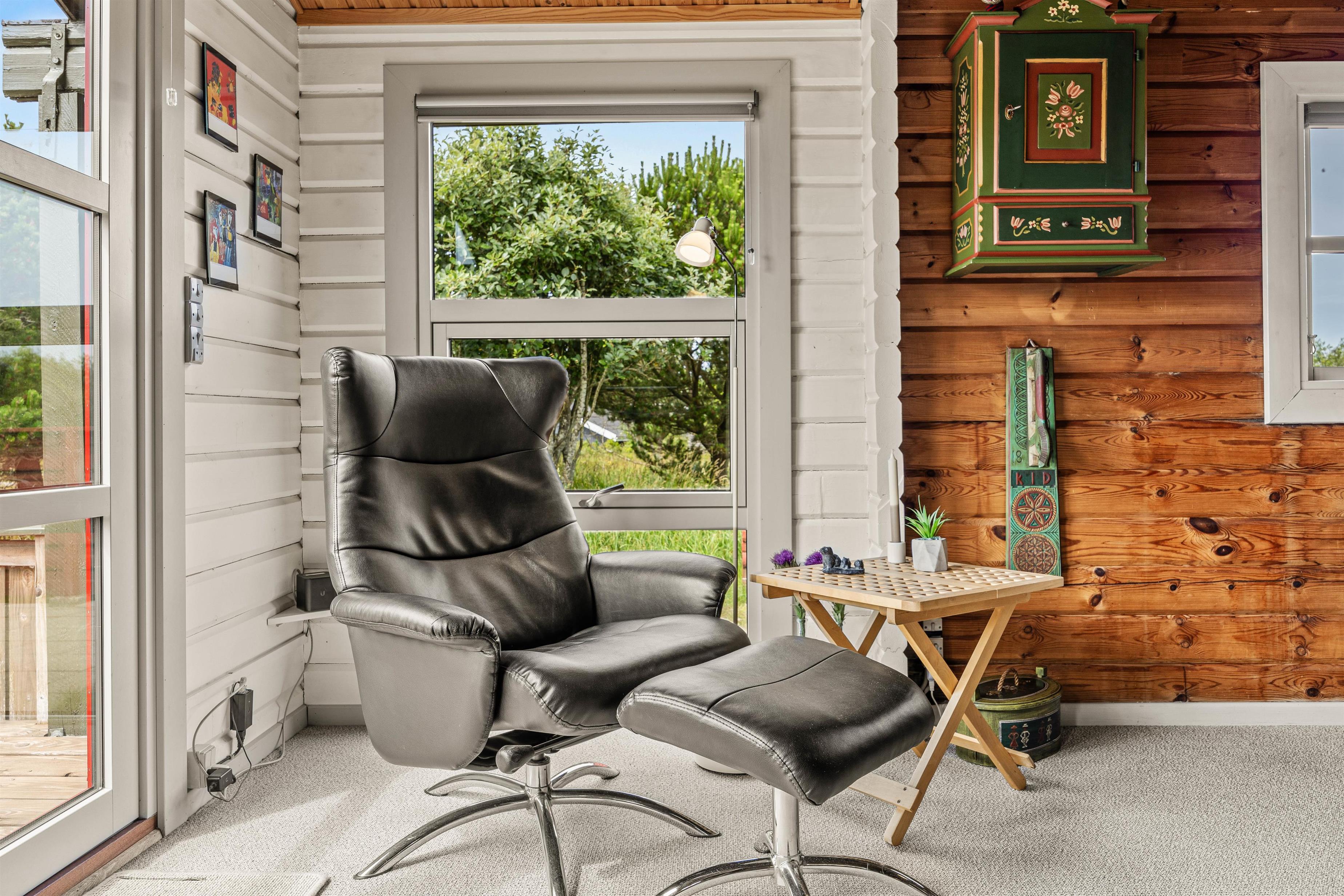 Fra stuen er der direkte udgang til sommerhusets dejlige naturomgivelser. Den ene terrasse skærmer for vejr og vind, og gør det muligt for jer at sidde ude fra det tidlige forår til langt ud på efteråret.