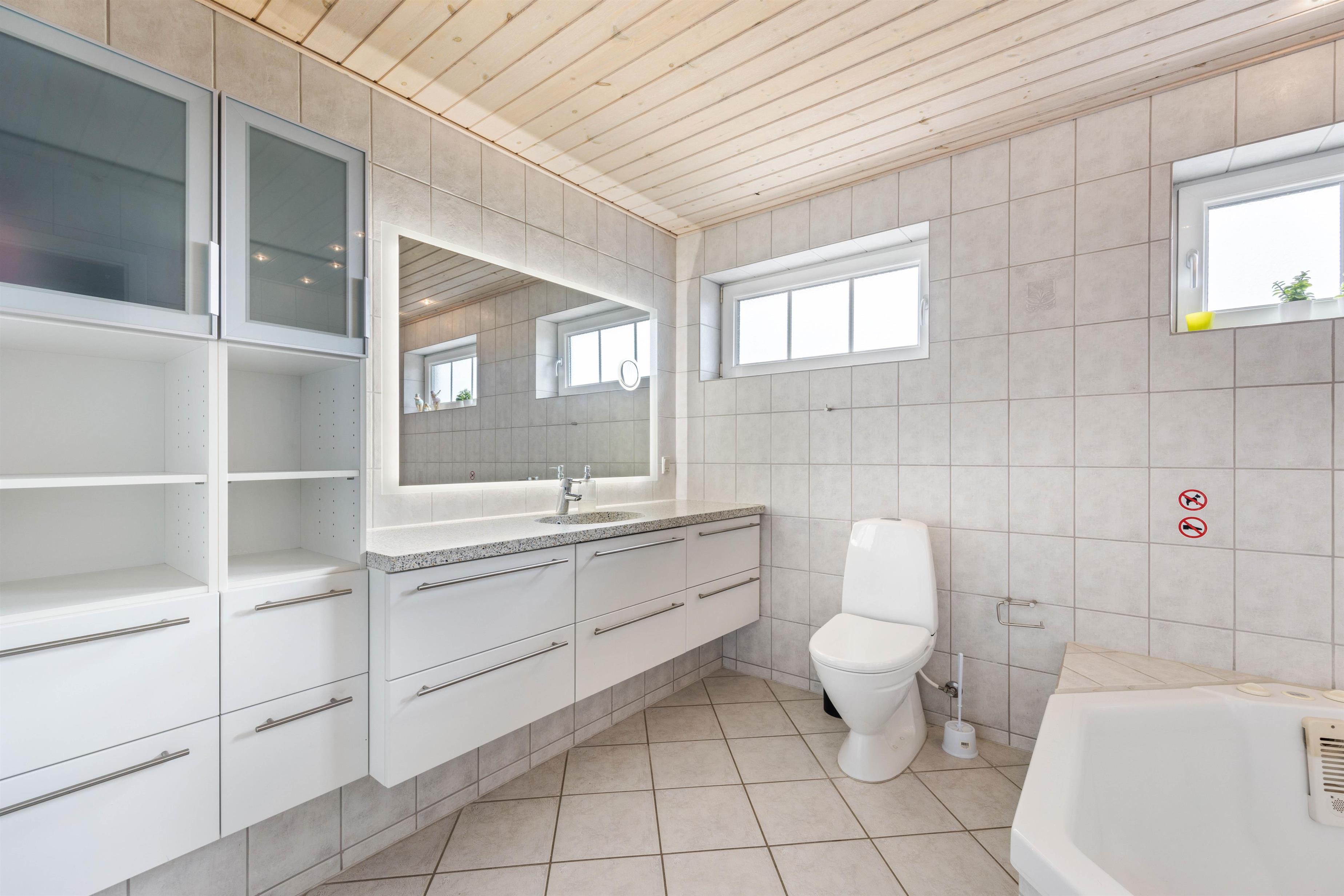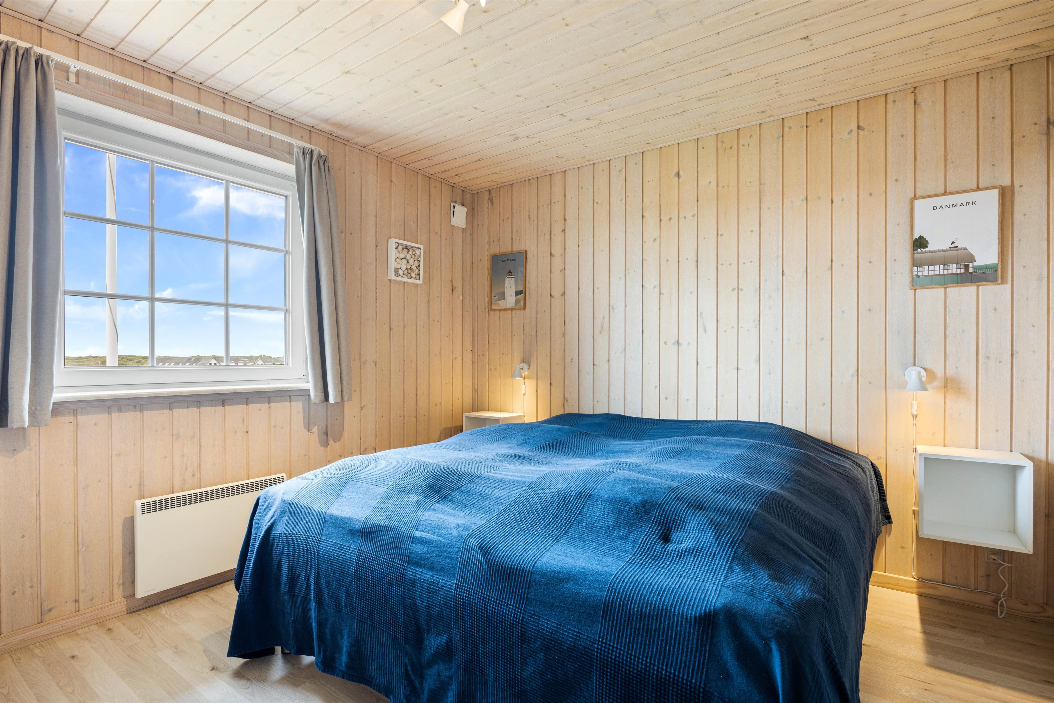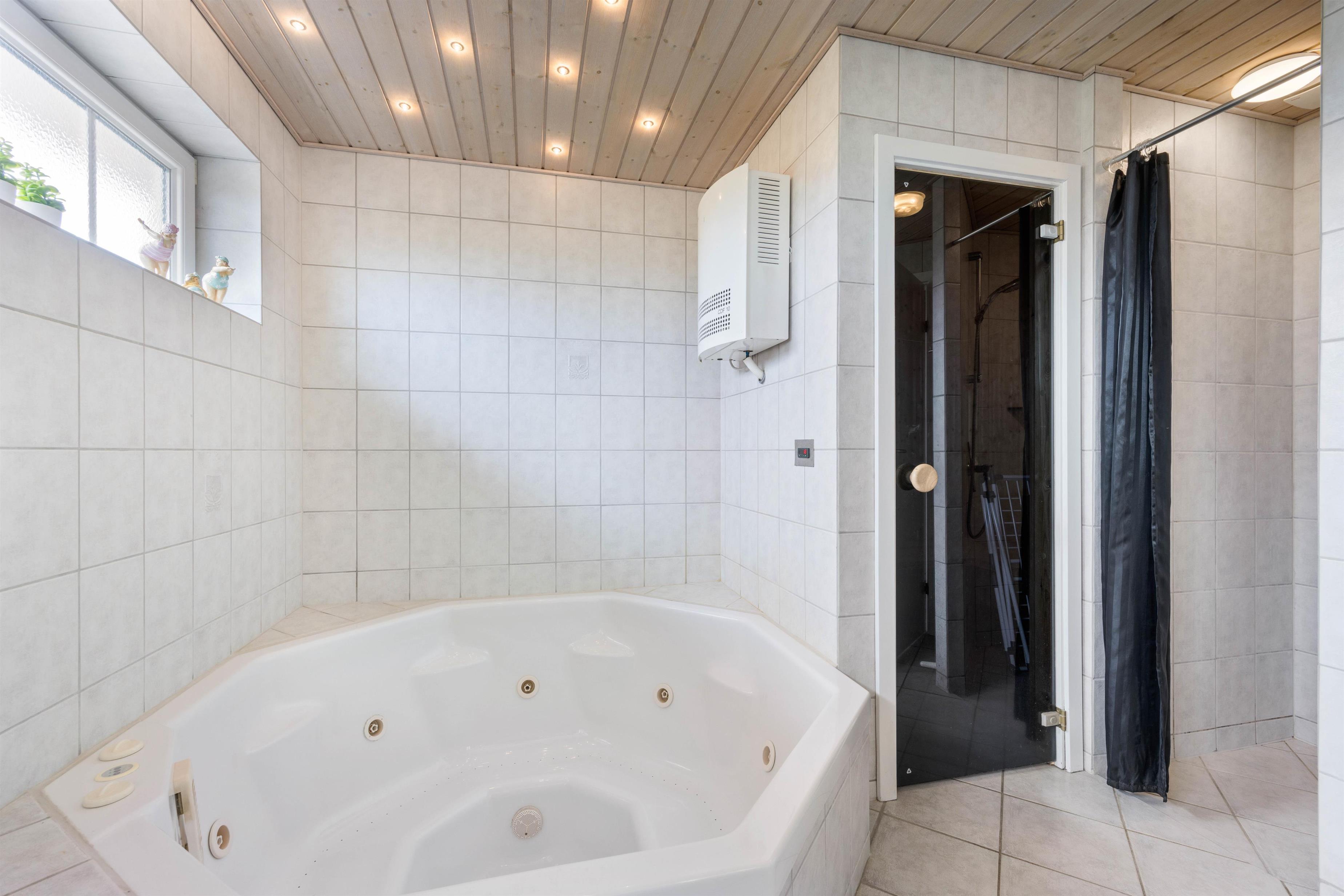 Praktisk er her 2 fine badeværelse, begge med gulvvarme og brus, så I undgår morgenkøen. På det store badeværelse finder I også feriehusets sauna og spabad. Her kan I slappe af i det varme boblende vand. De 8 sovepladser er fordelt på 4 fine værelser, som alle er udstyret med behagelige dobbeltsenge.