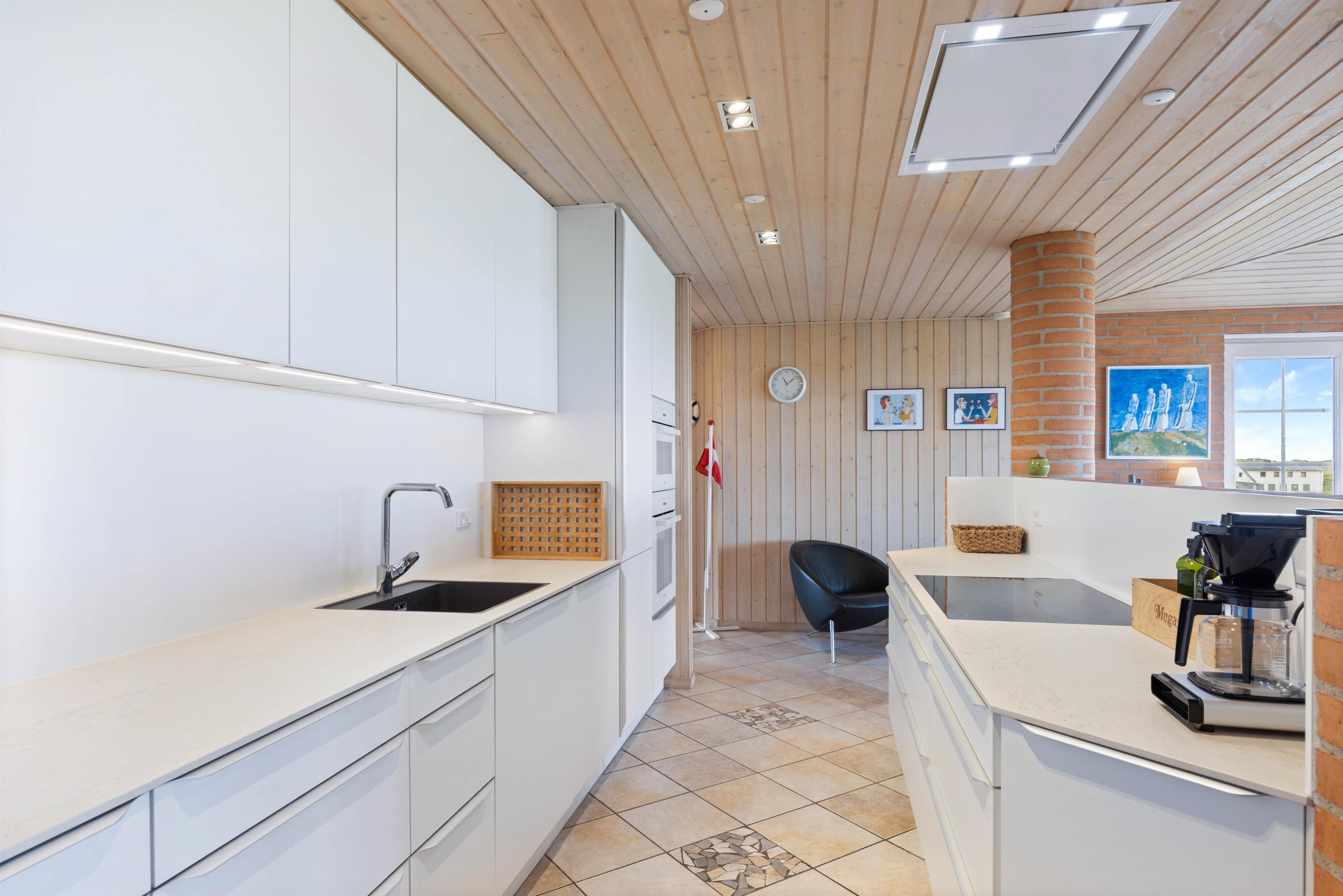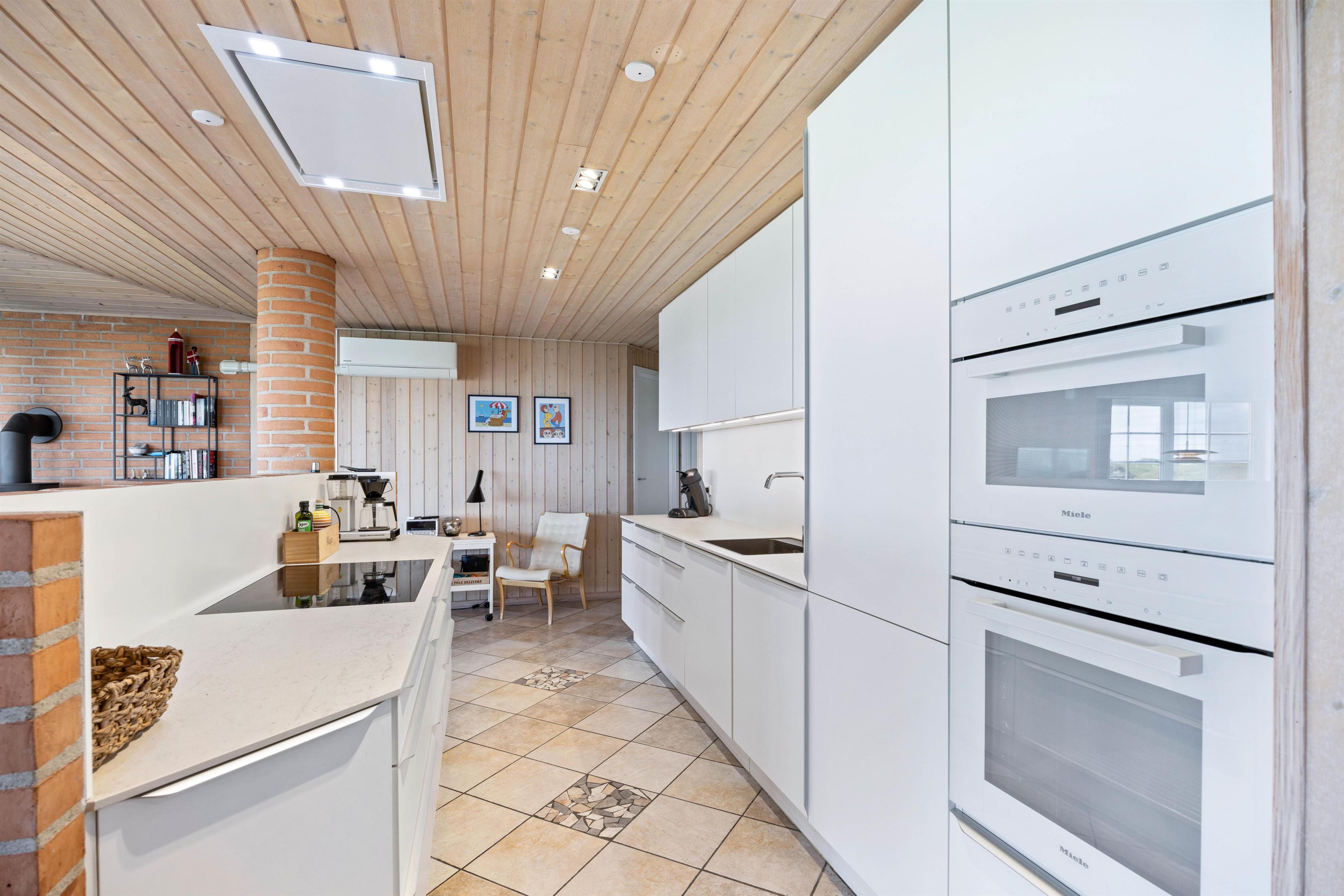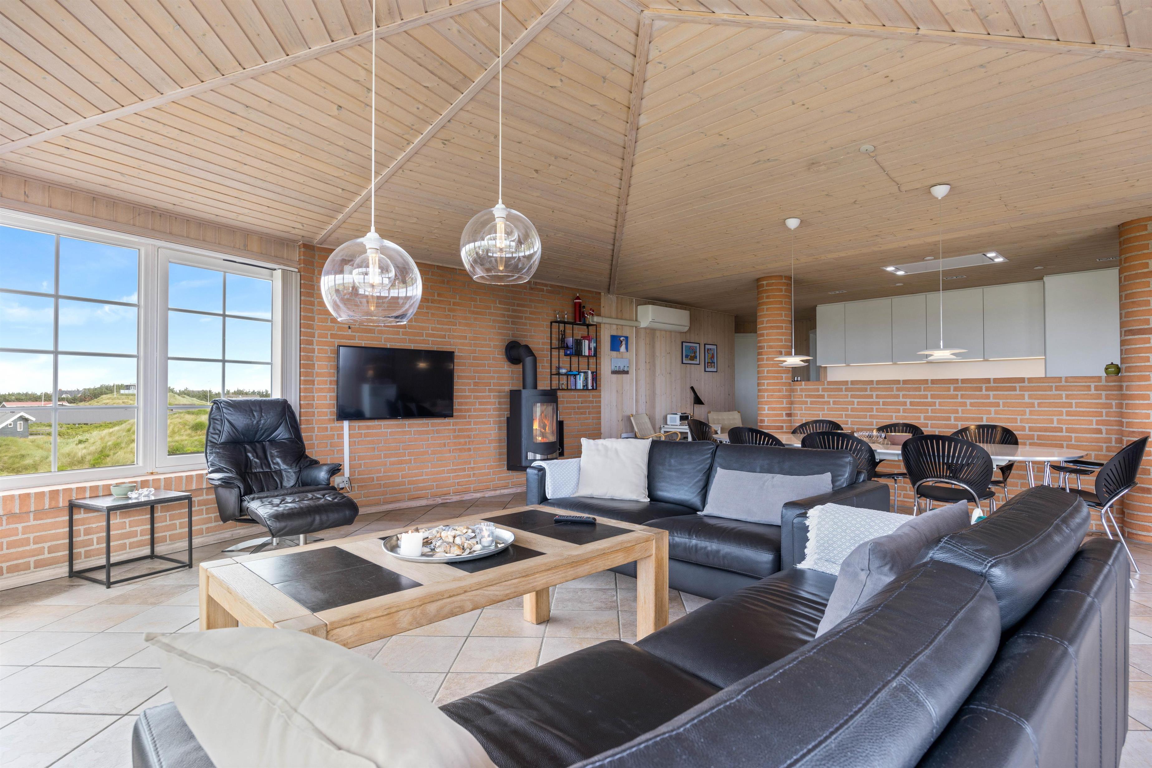 Hjerterummet er store opholdsrum med stue, spiseplads og køkken i ét. Her er et stort smukt vinduesparti, som inviterer dagslyset indenfor og giver jer en smuk udsigt udover klitterne. Her kan I nyde hinandens nærvær – også selvom i hver især laver noget forskelligt. Nogle er måske gået i køkkenet for at bage, andre nyder duften deraf, mens de læser en god bog i sofaen eller planlægger morgendagens aktiviteter. Når hyggen skal helt til tops, kan I tænde op i brændeovnen og nyde varmen breder sig. Skønt er her både gulvvarme samt en energisparende varmepumpe, som sørger for et behageligt indeklima. Køkkenet er godt indrettet og udstyret med alt, hvad der skal bruges og renoveret i 2022.
