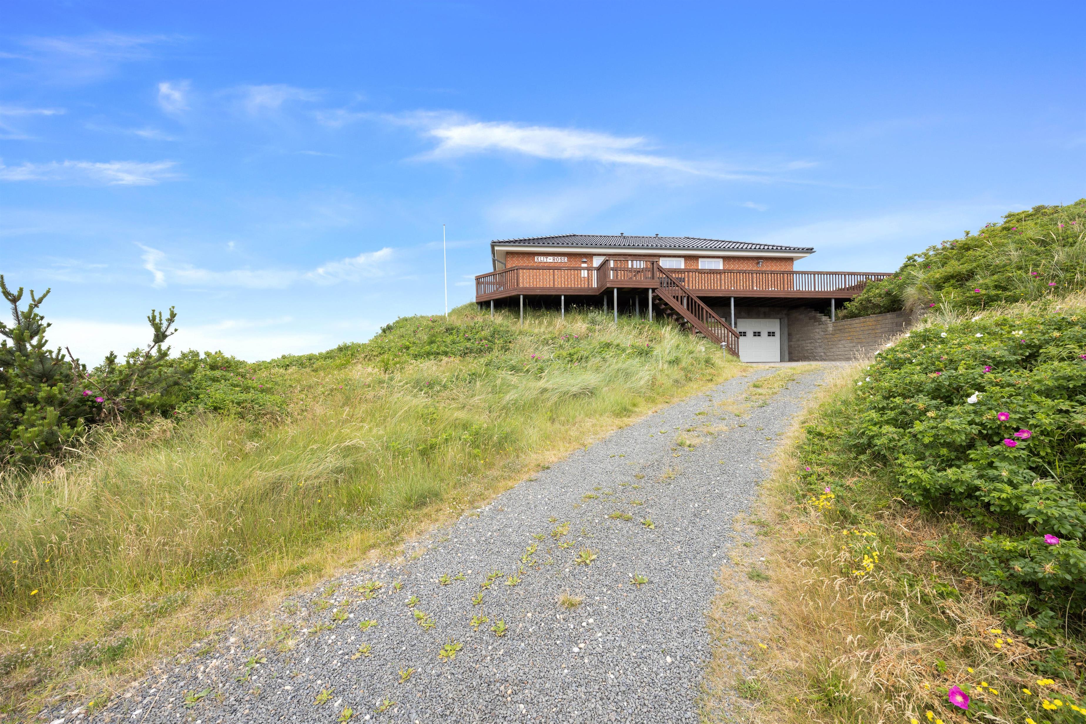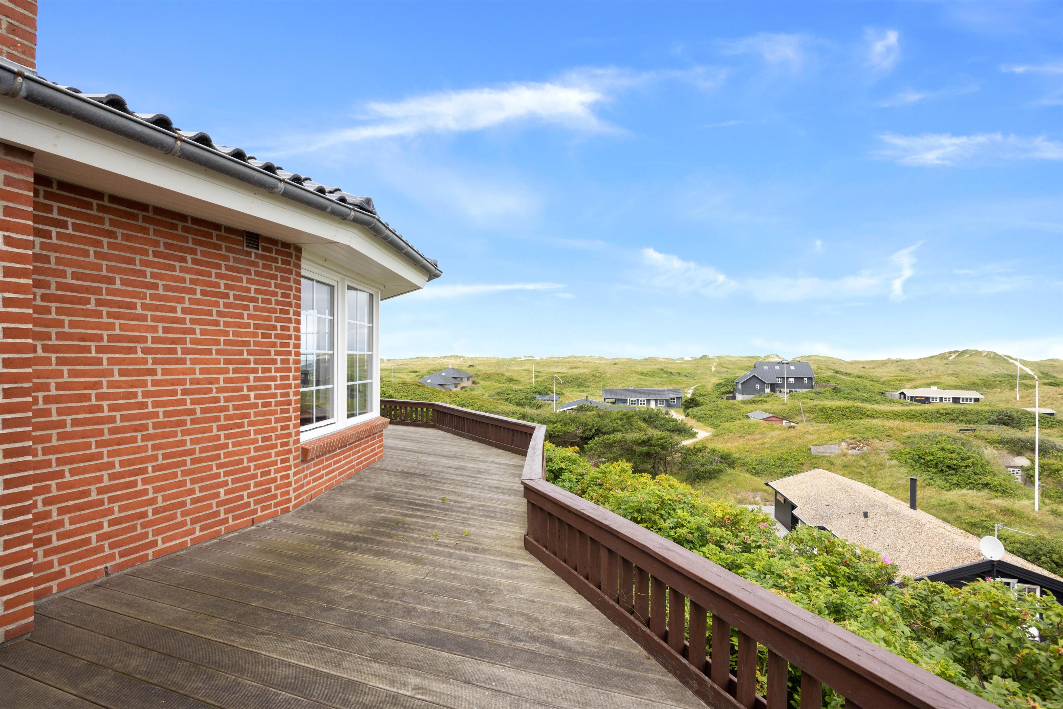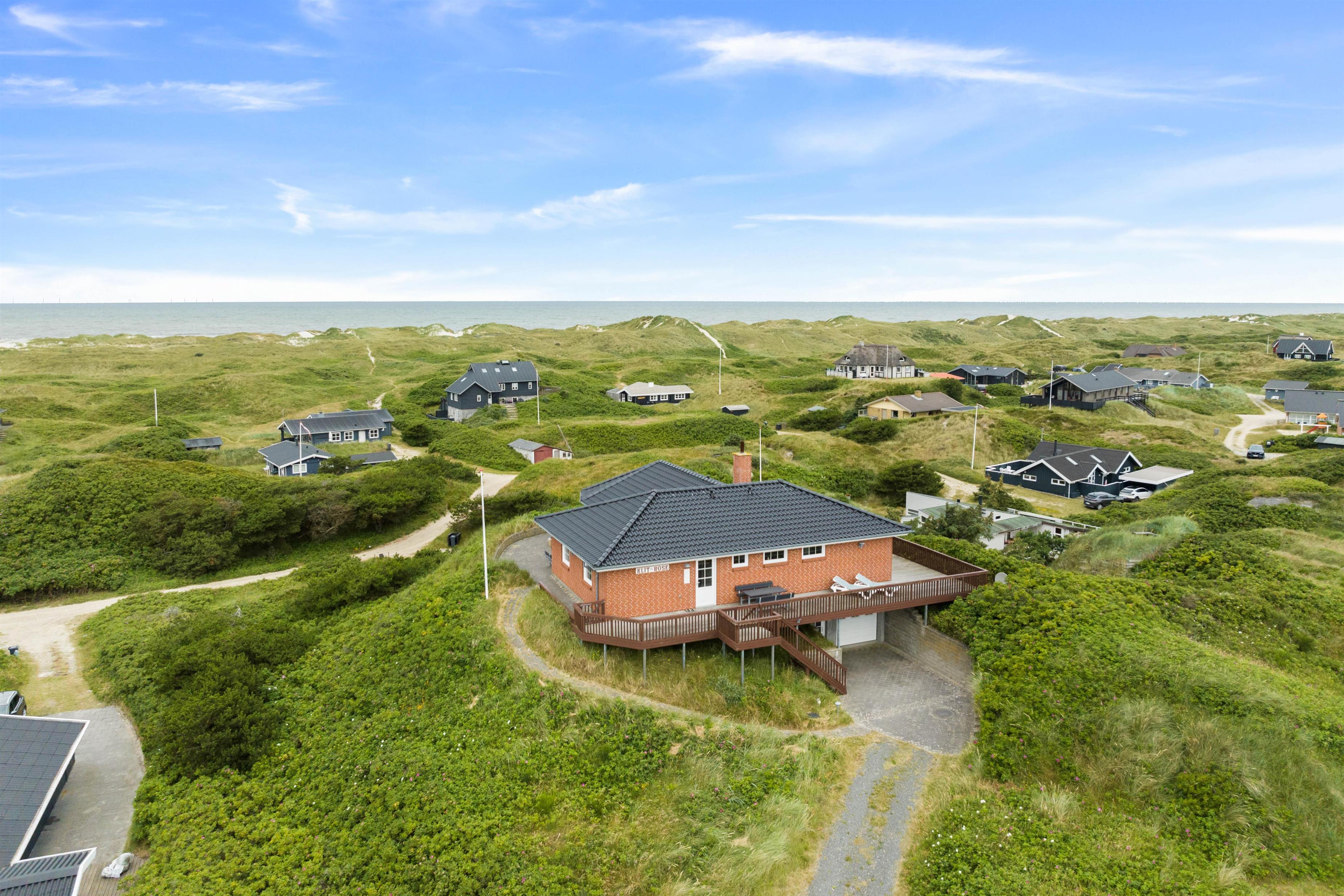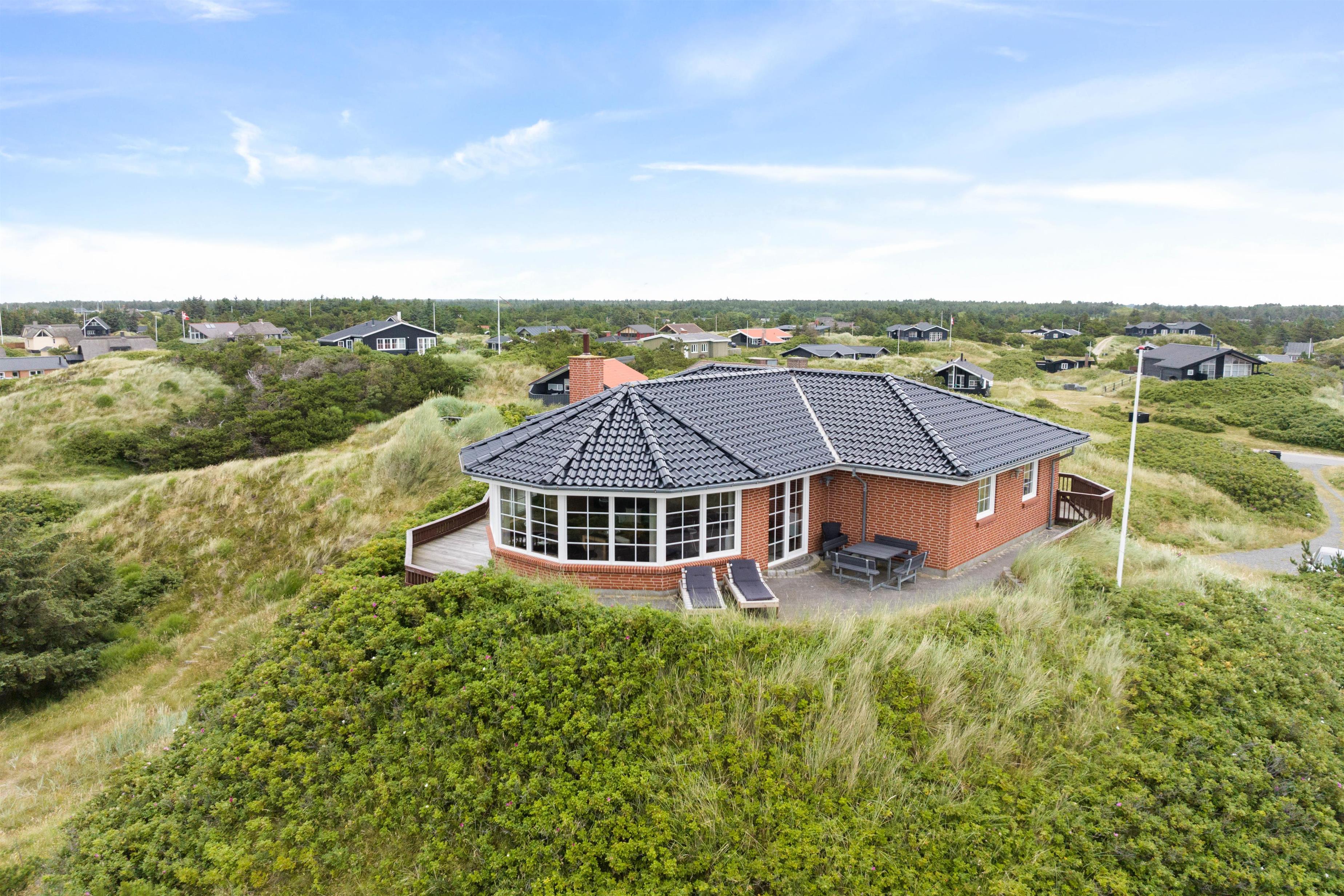 På toppen af en klit finder I dette fine sommerhus med plads til 8 personer. Et solidt og rummeligt feriehus med spa og sauna. Sommerhuset er beliggende på Nordvej 5 i feriebyen, Vejers, på en stor klitgrund (7.688 m2) med flot panoramaudsigt over klitlandskabet. Det er muligt via en sti, der hører til feriehuset, at gå direkte ned på Nordstranden og kun 150 meter fra det brusende Vesterhav. Hjertelig velkommen!
