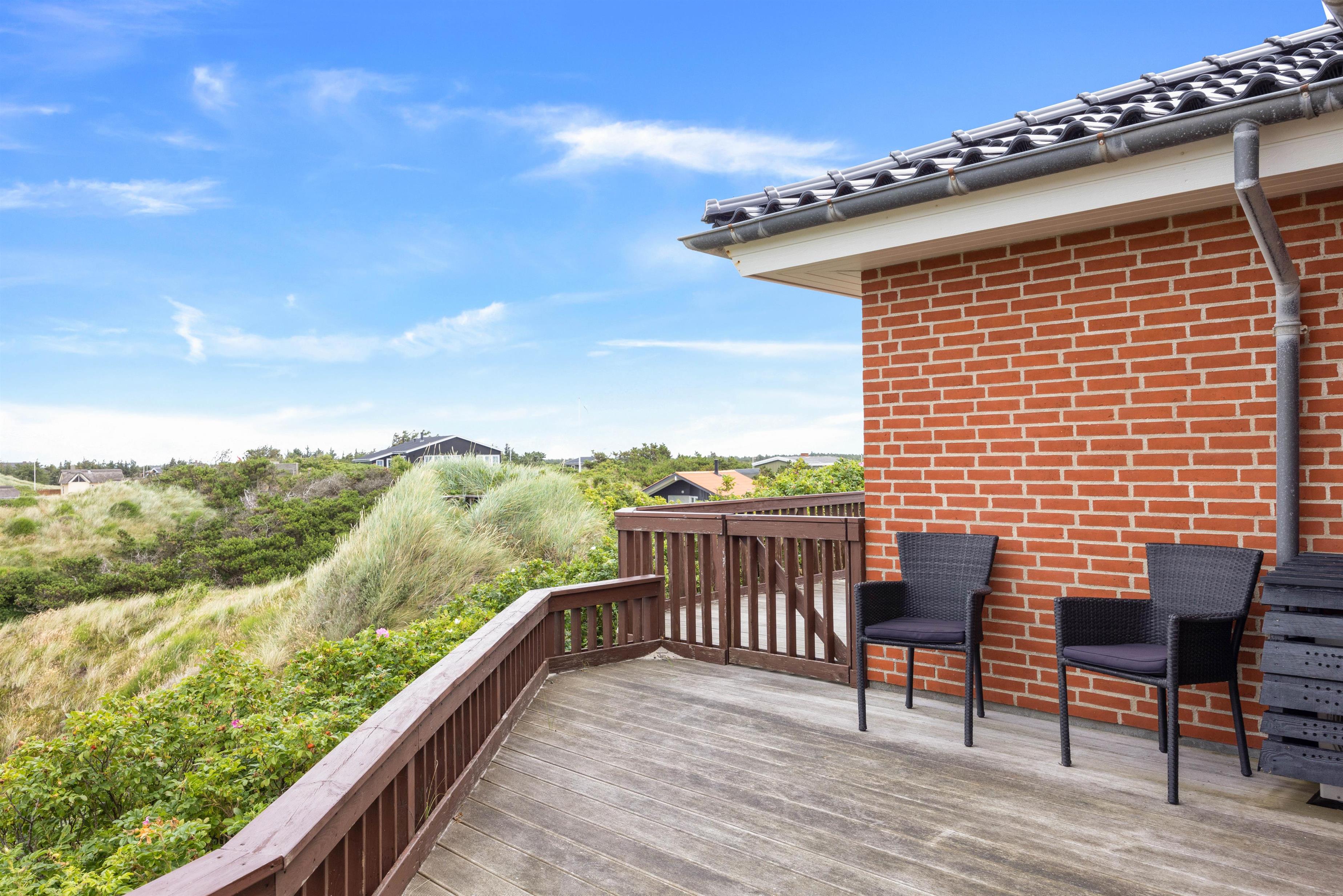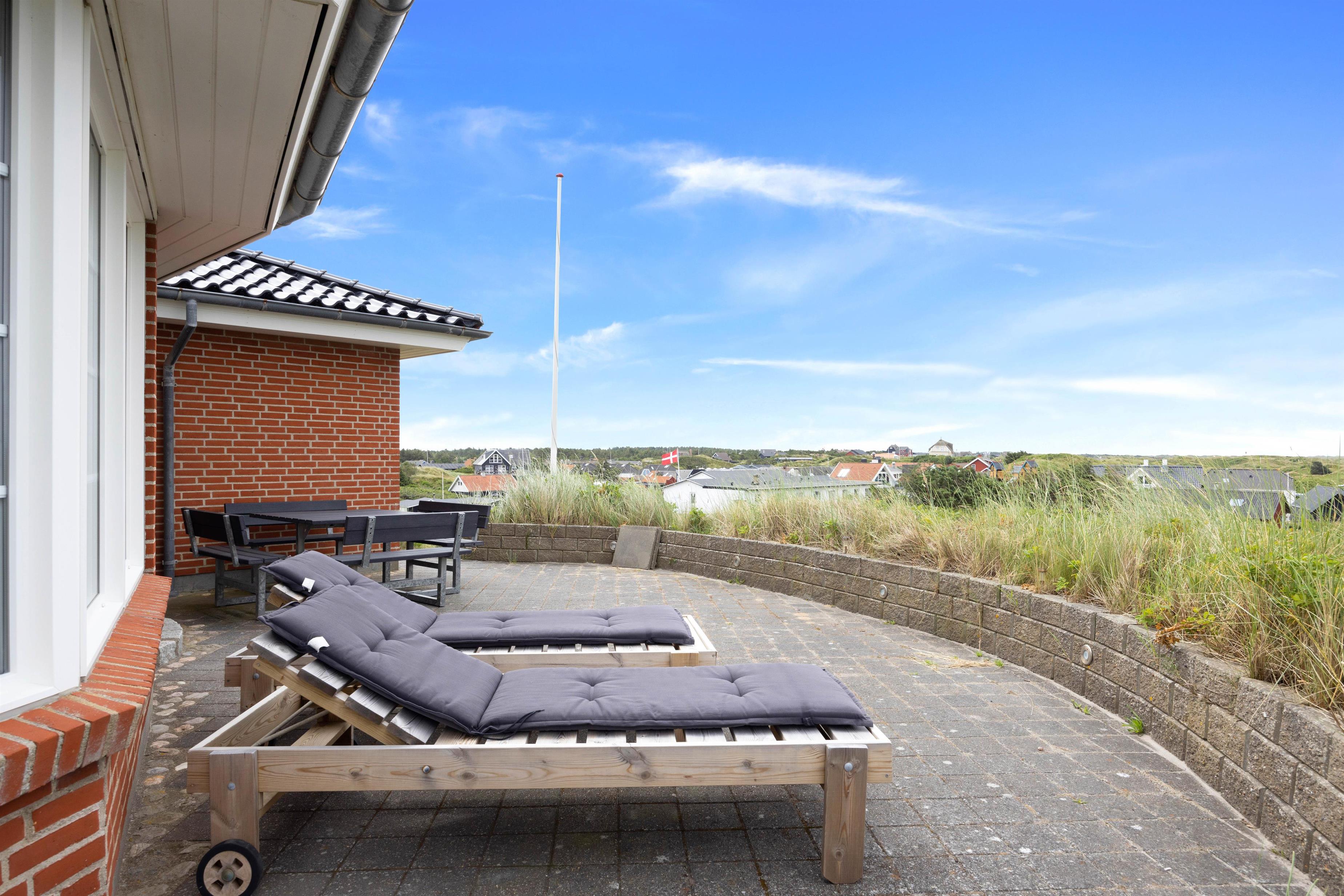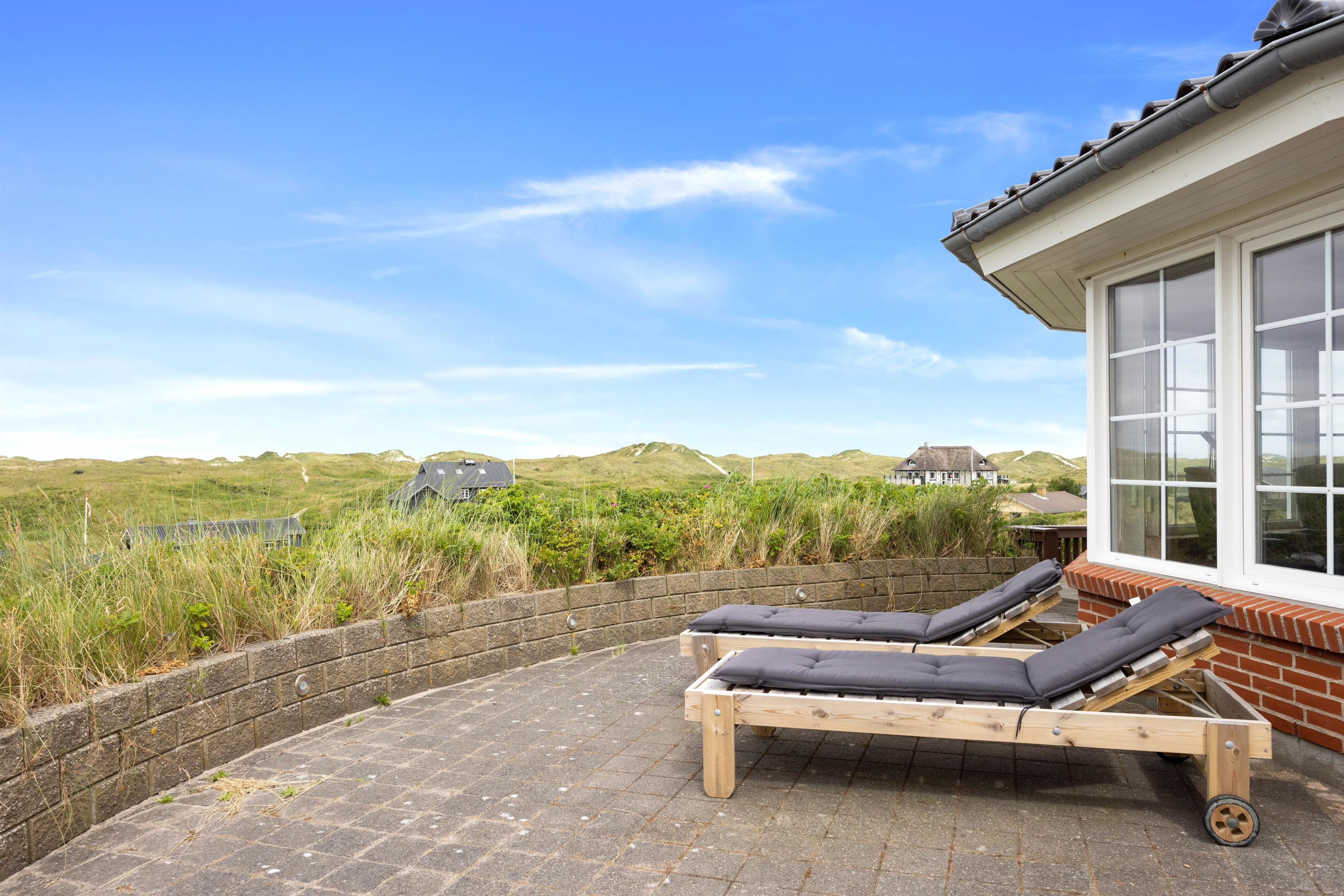 På toppen af en klit finder I dette fine sommerhus med plads til 8 personer. Et solidt og rummeligt feriehus med spa og sauna. Sommerhuset er beliggende på Nordvej 5 i feriebyen, Vejers, på en stor klitgrund (7.688 m2) med flot panoramaudsigt over klitlandskabet. Det er muligt via en sti, der hører til feriehuset, at gå direkte ned på Nordstranden og kun 150 meter fra det brusende Vesterhav. Hjertelig velkommen!