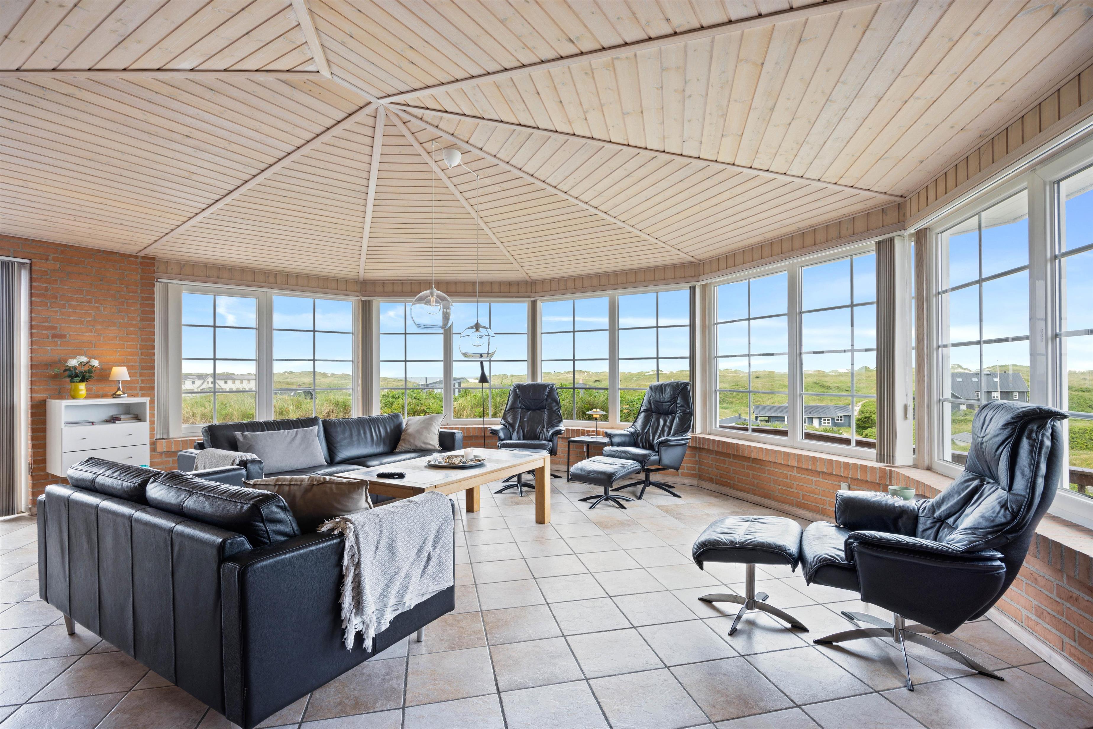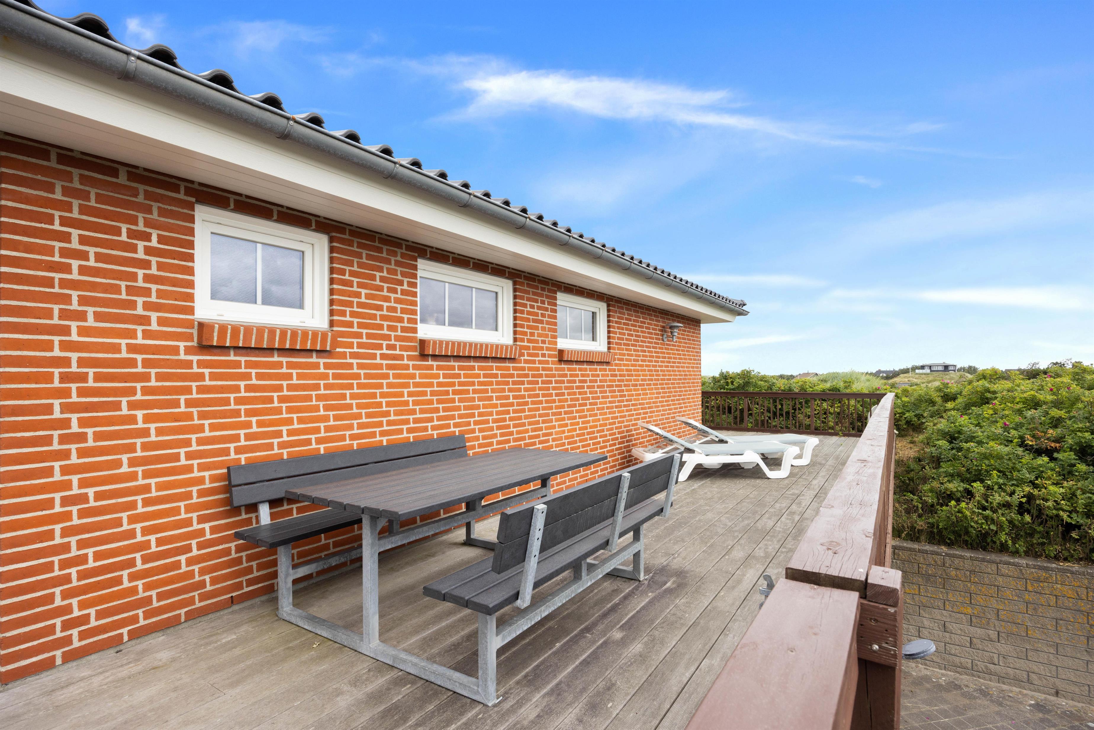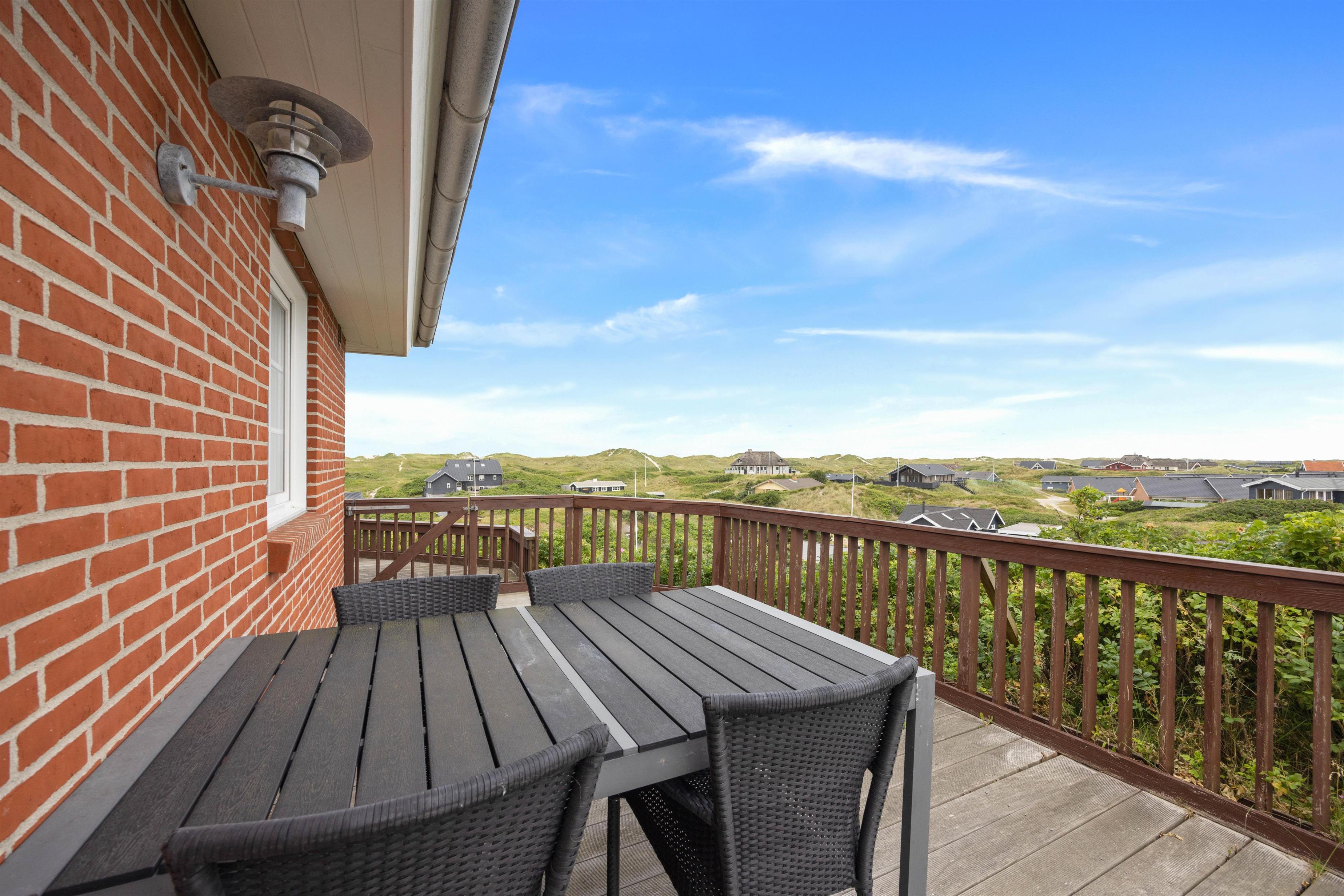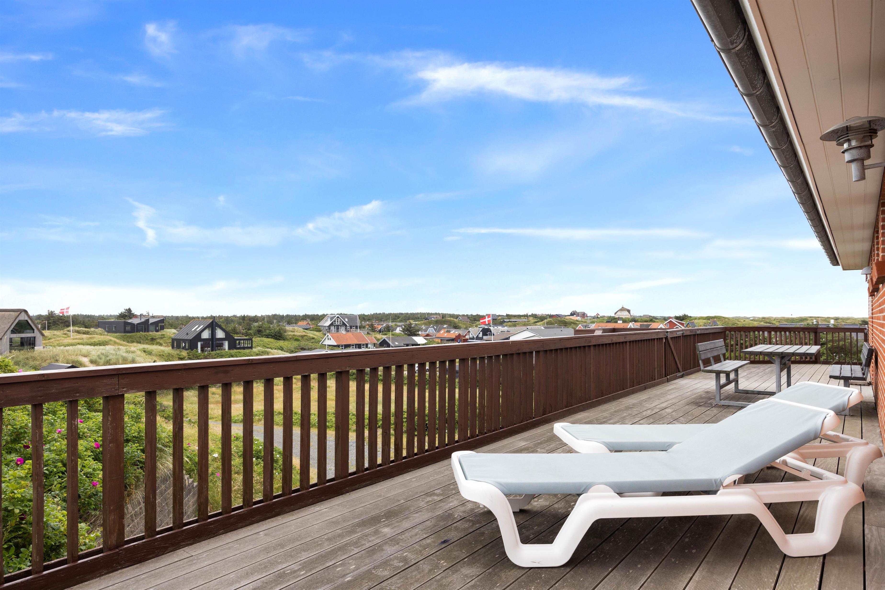 På toppen af en klit finder I dette fine sommerhus med plads til 8 personer. Et solidt og rummeligt feriehus med spa og sauna. Sommerhuset er beliggende på Nordvej 5 i feriebyen, Vejers, på en stor klitgrund (7.688 m2) med flot panoramaudsigt over klitlandskabet. Det er muligt via en sti, der hører til feriehuset, at gå direkte ned på Nordstranden og kun 150 meter fra det brusende Vesterhav. Hjertelig velkommen!