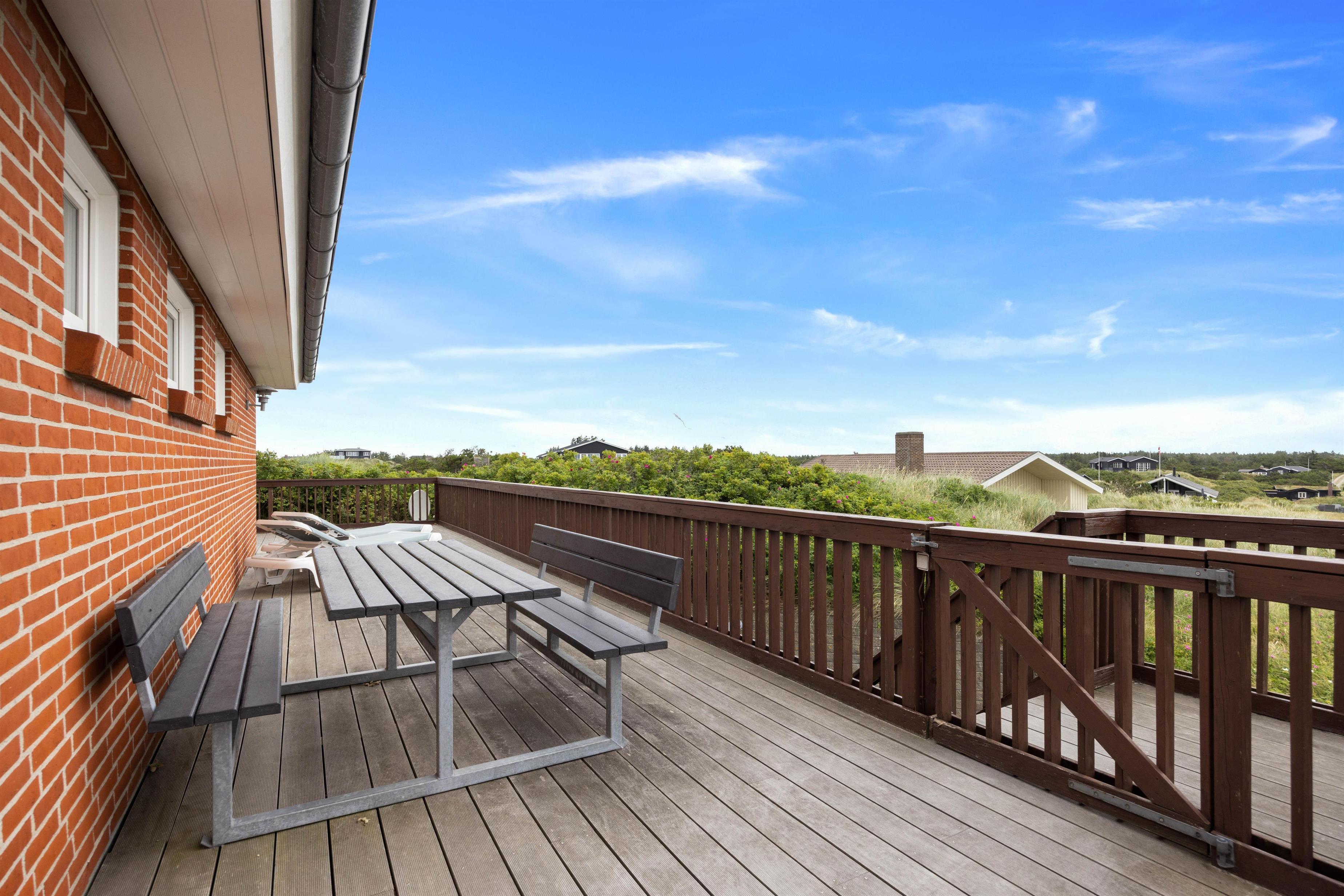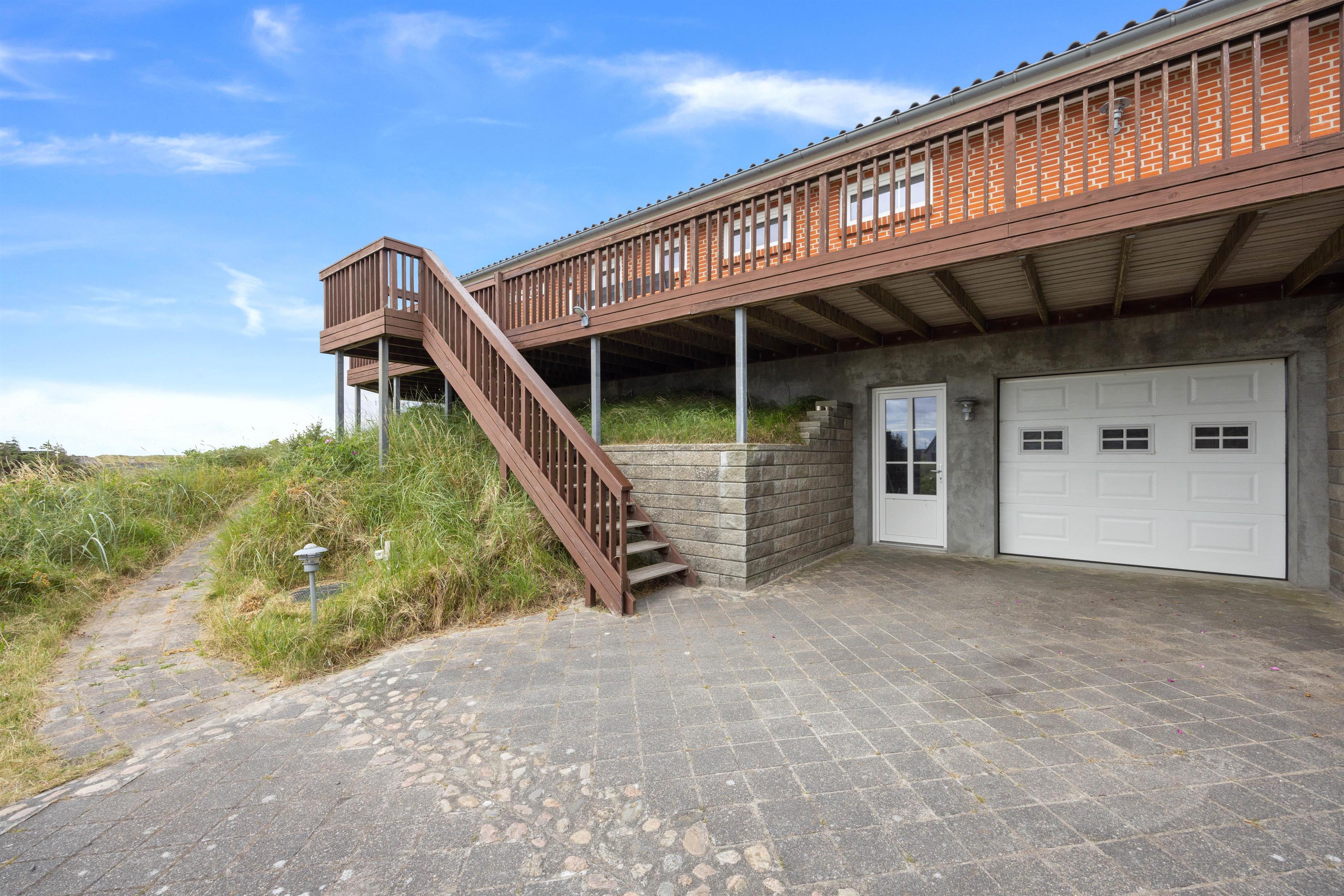Når I har parkeret bilen, vil en lang trappe føre jer op til feriehuset, der er beliggende højt oppe på en klit. Feriehuset er 152 m2 og funktionelt indrettet. Sommerhuset har en hyggelig rummelig atmosfære, og det fremstår lyst og venligt med den enkelte indretning. Her er god plads til familielivet!
