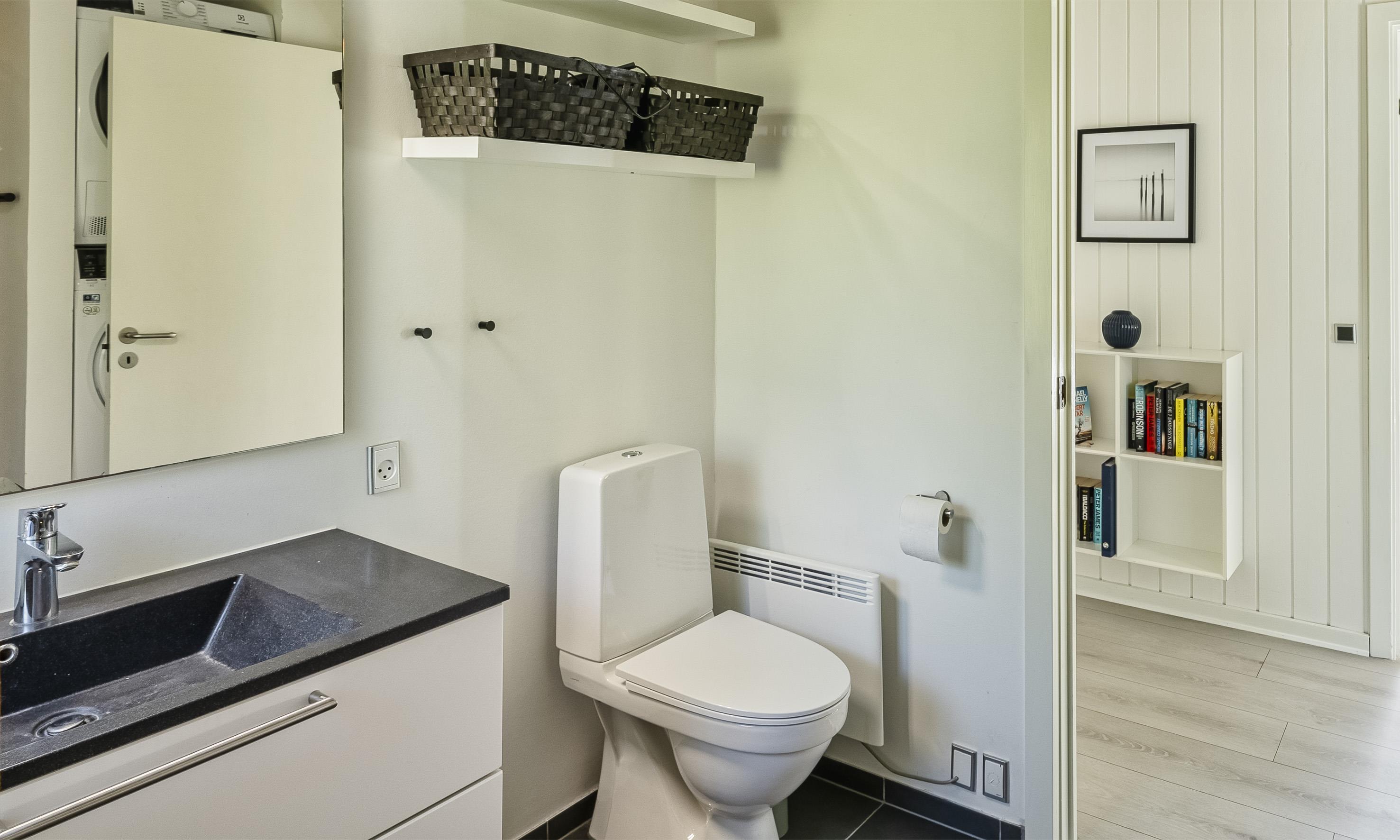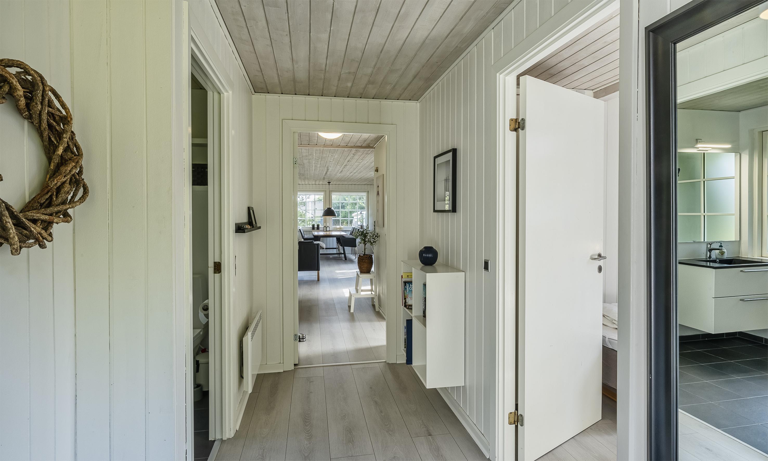Huset fremstår velindrettet med et godt lysindfald og indeholder, entre/baggang med god plads til overtøj og fodtøj. Veludstyret køkken, spiseplads og stue med udgang til terrasse. Brændeovn og varmepumpe. Badeværelse med toilet, håndvask, bruser, vaskemaskine og tørretumbler samt klinker med gulvvarme. 2 Soveværelser med skabsplads. I det ene soveværelse er der dobbeltseng, i det andet er der 2 enkeltsenge (DS + 2ES).