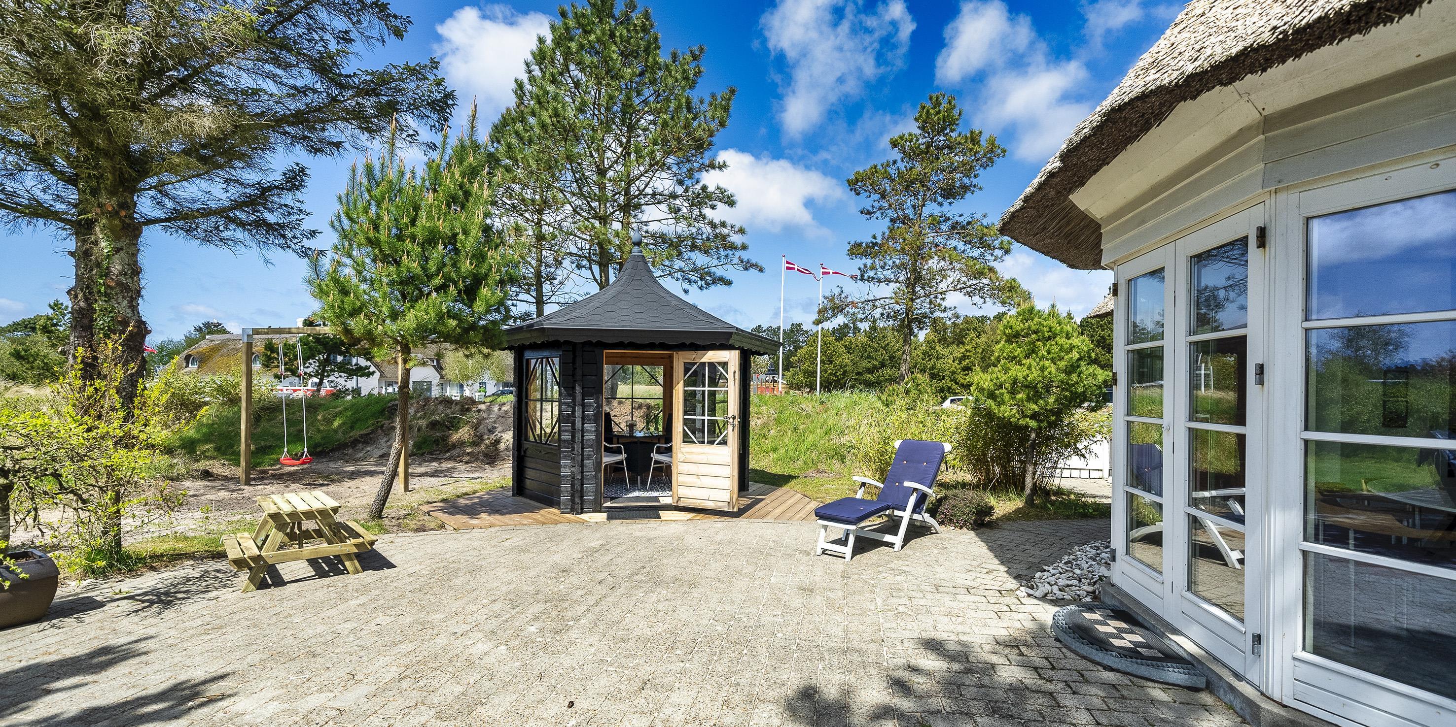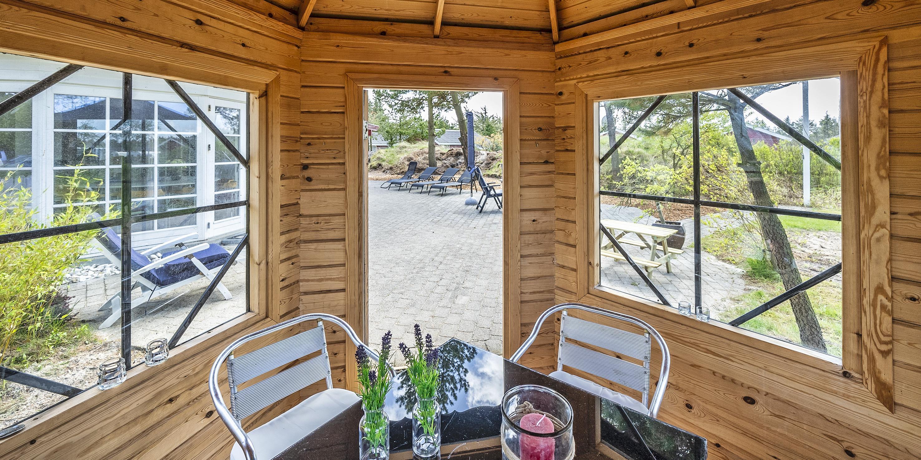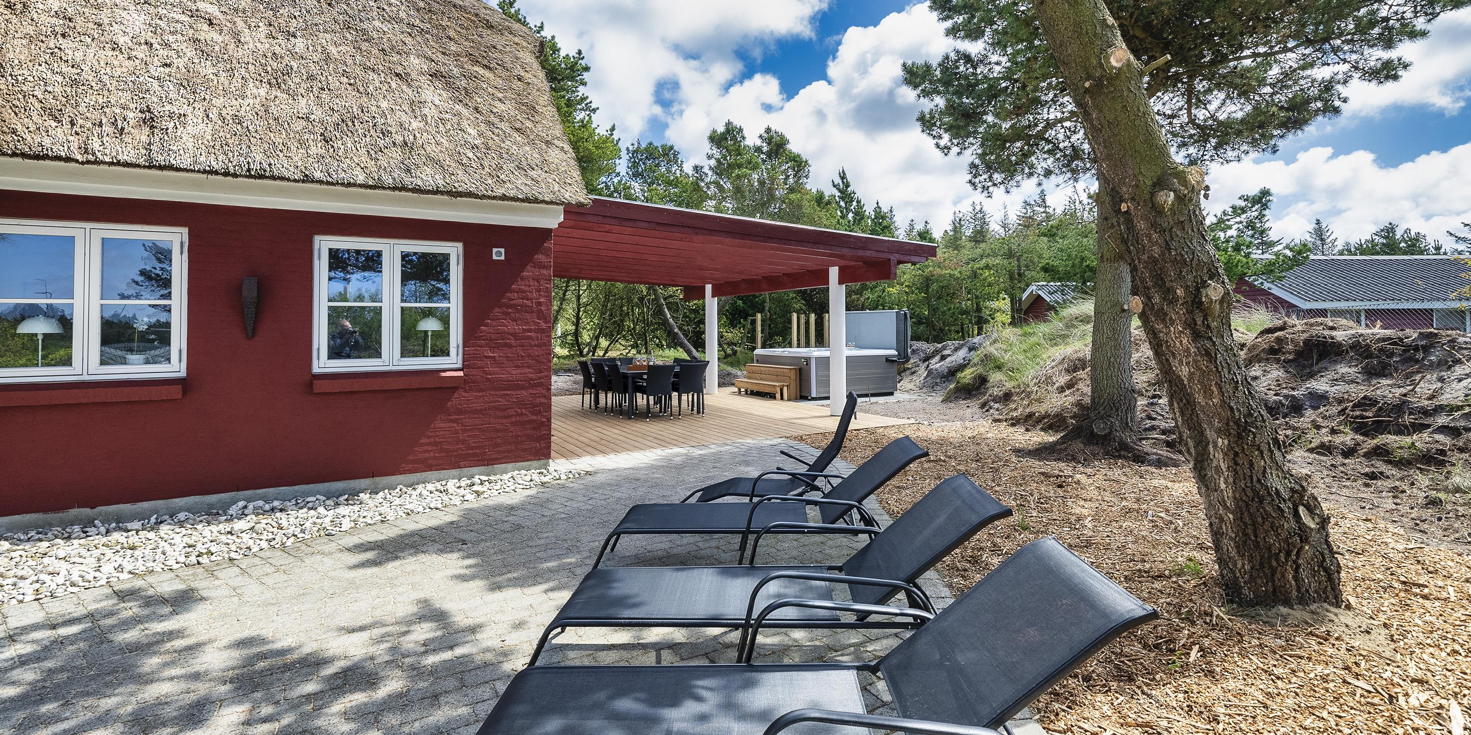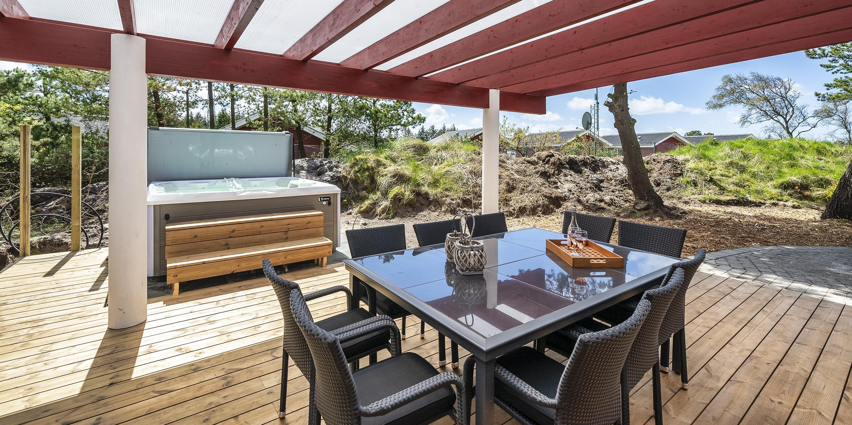 Sommerhuset byder på en skøn atmosfære, gennemgående åbent plan og med store panoramavinduer mod haven. De udvendige faciliteter byder på dejlig stor overdækket terrasse, hvor aftner som forår/efteråret kan nydes. I forbindelse med den overdækkede terrasse forefindes der en ude jacuzzi og en udebruser med kold vand. Jacuzzien er godt skærmet af med et sejl. Sommerhuset ligger på en 1663 m2 stor grund som er fuldt indhegnet, med flere terrasser, en have pavillon og en gynge til de små. Haven er afgrænset med en vold mod vejen. Hele herligheden ligger 4 min. kørsel fra Vejers bymidte der byder på flere restauranter, pizzeria, 2 købmænd, et dropskogeri med udsalg af is og softice og m.m.