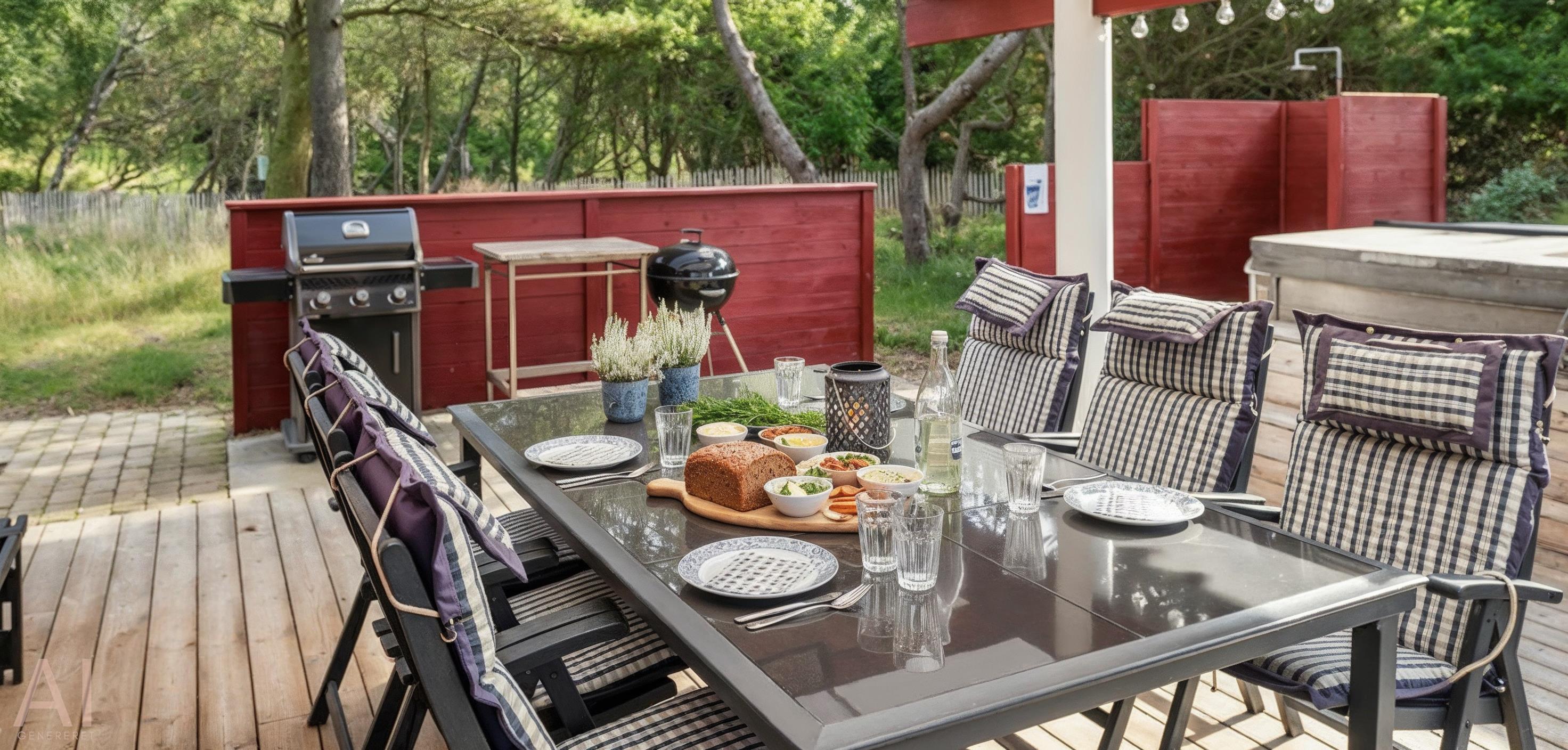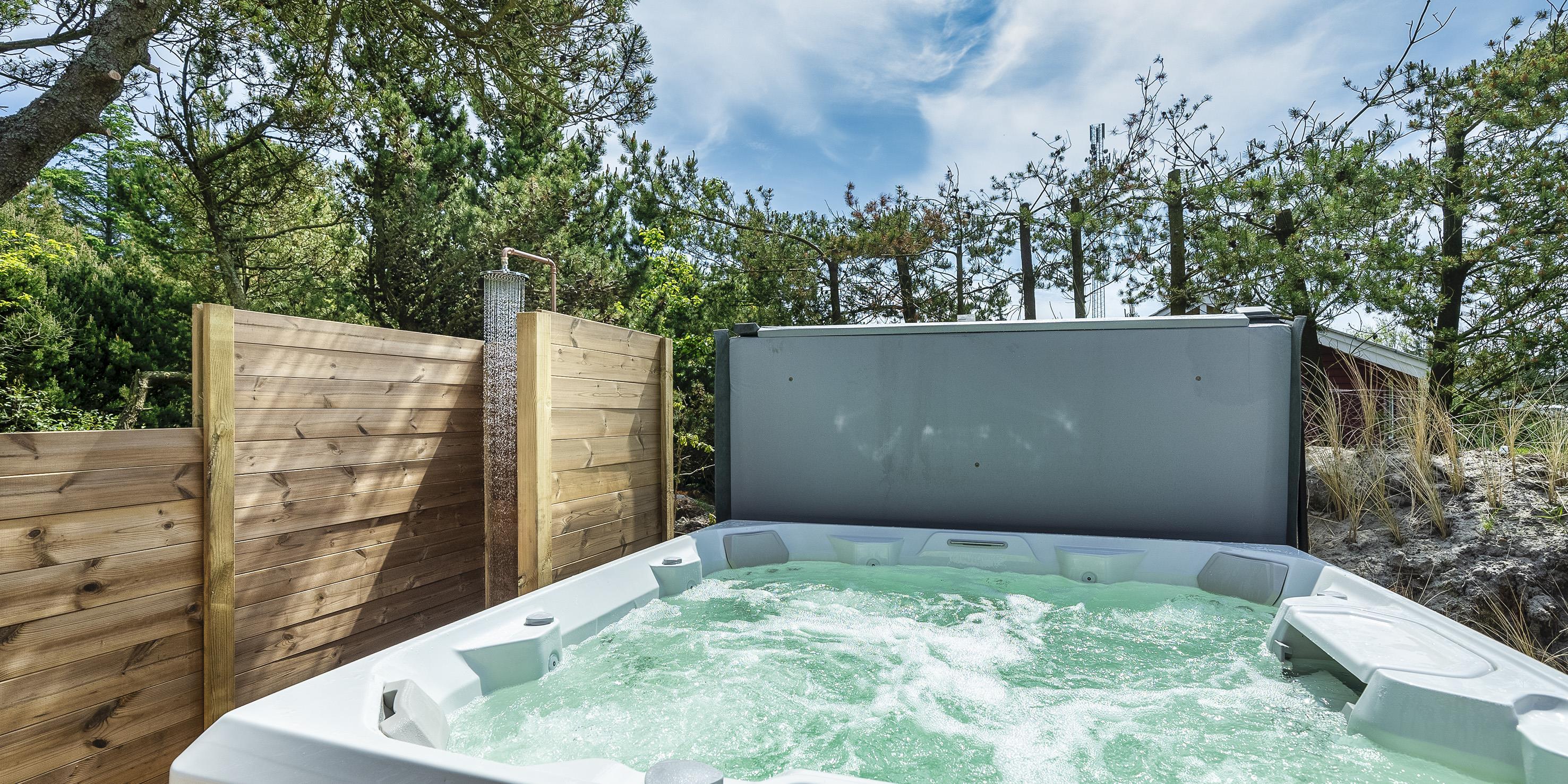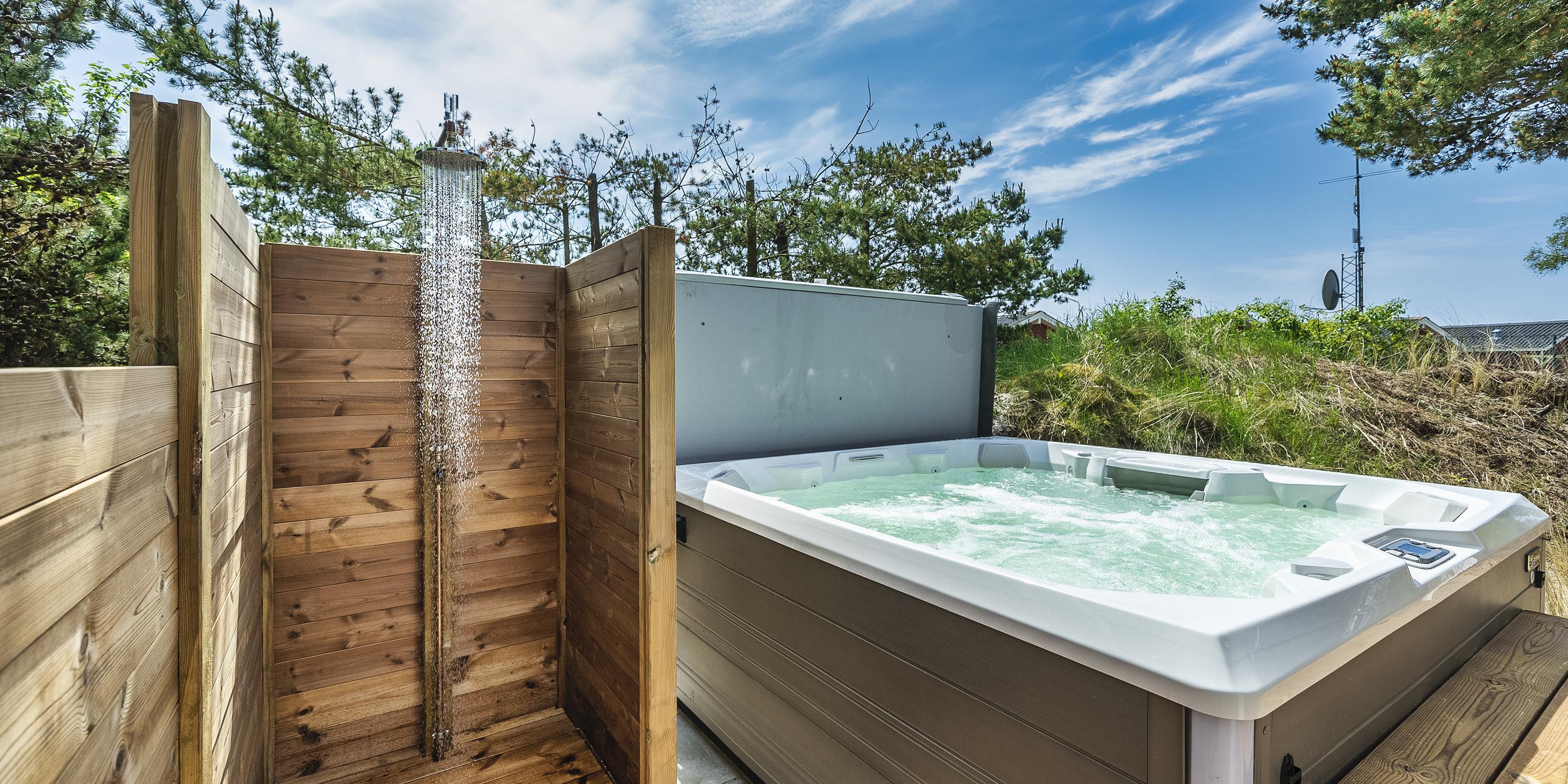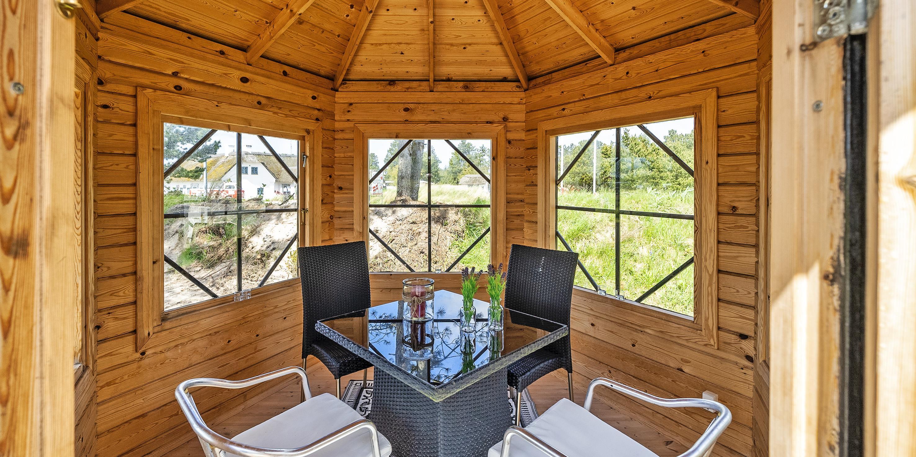 Sommerhuset byder på en skøn atmosfære, gennemgående åbent plan og med store panoramavinduer mod haven. De udvendige faciliteter byder på dejlig stor overdækket terrasse, hvor aftner som forår/efteråret kan nydes. I forbindelse med den overdækkede terrasse forefindes der en ude jacuzzi og en udebruser med kold vand. Jacuzzien er godt skærmet af med et sejl. Sommerhuset ligger på en 1663 m2 stor grund som er fuldt indhegnet, med flere terrasser, en have pavillon og en gynge til de små. Haven er afgrænset med en vold mod vejen. Hele herligheden ligger 4 min. kørsel fra Vejers bymidte der byder på flere restauranter, pizzeria, 2 købmænd, et dropskogeri med udsalg af is og softice og m.m.