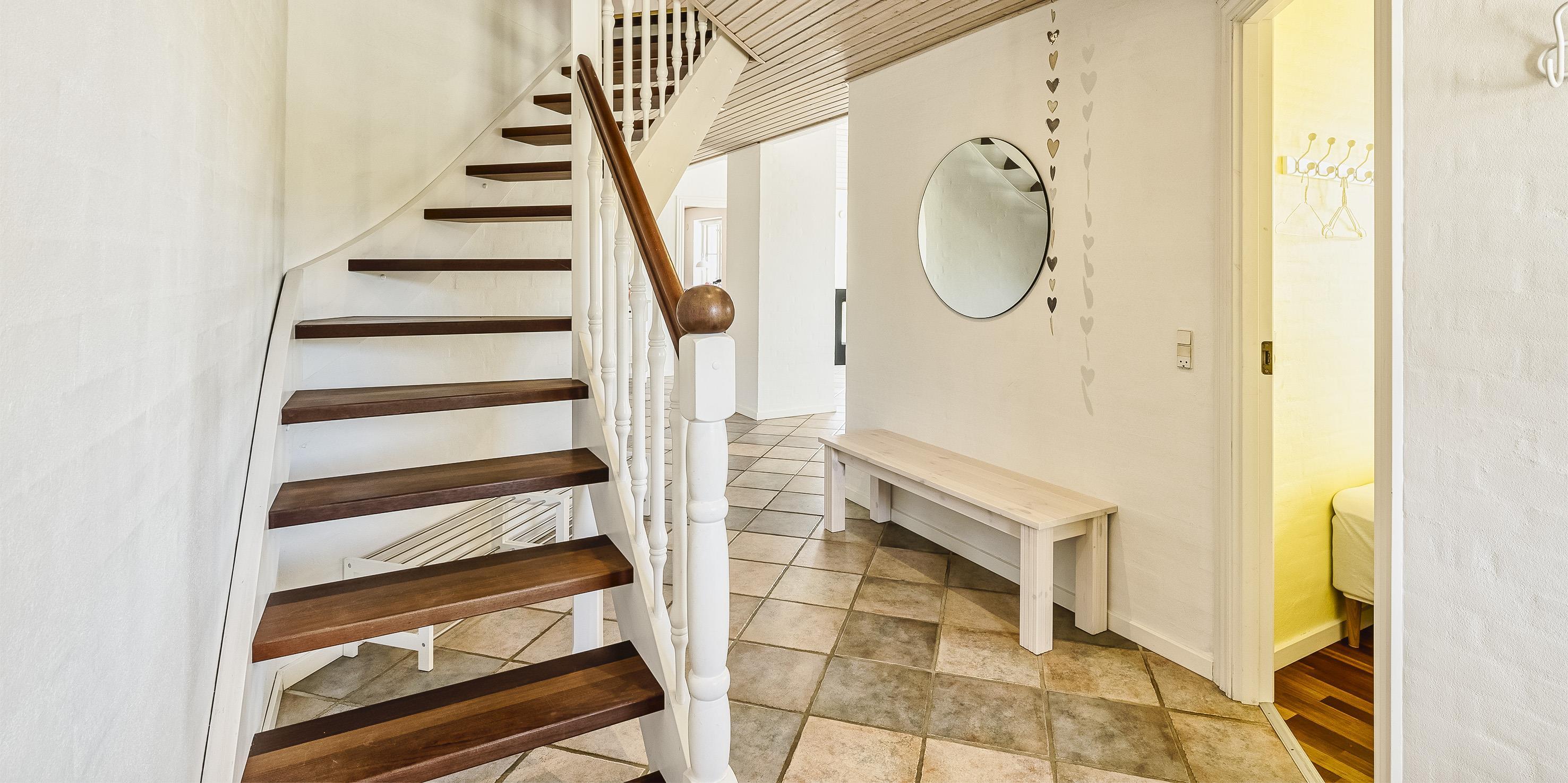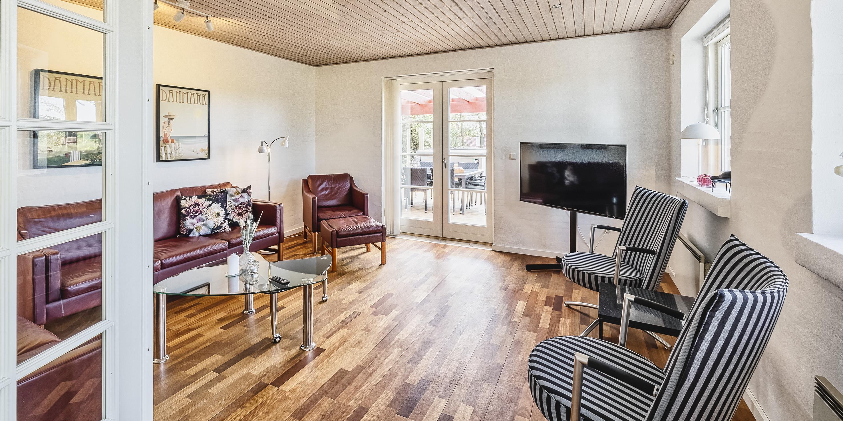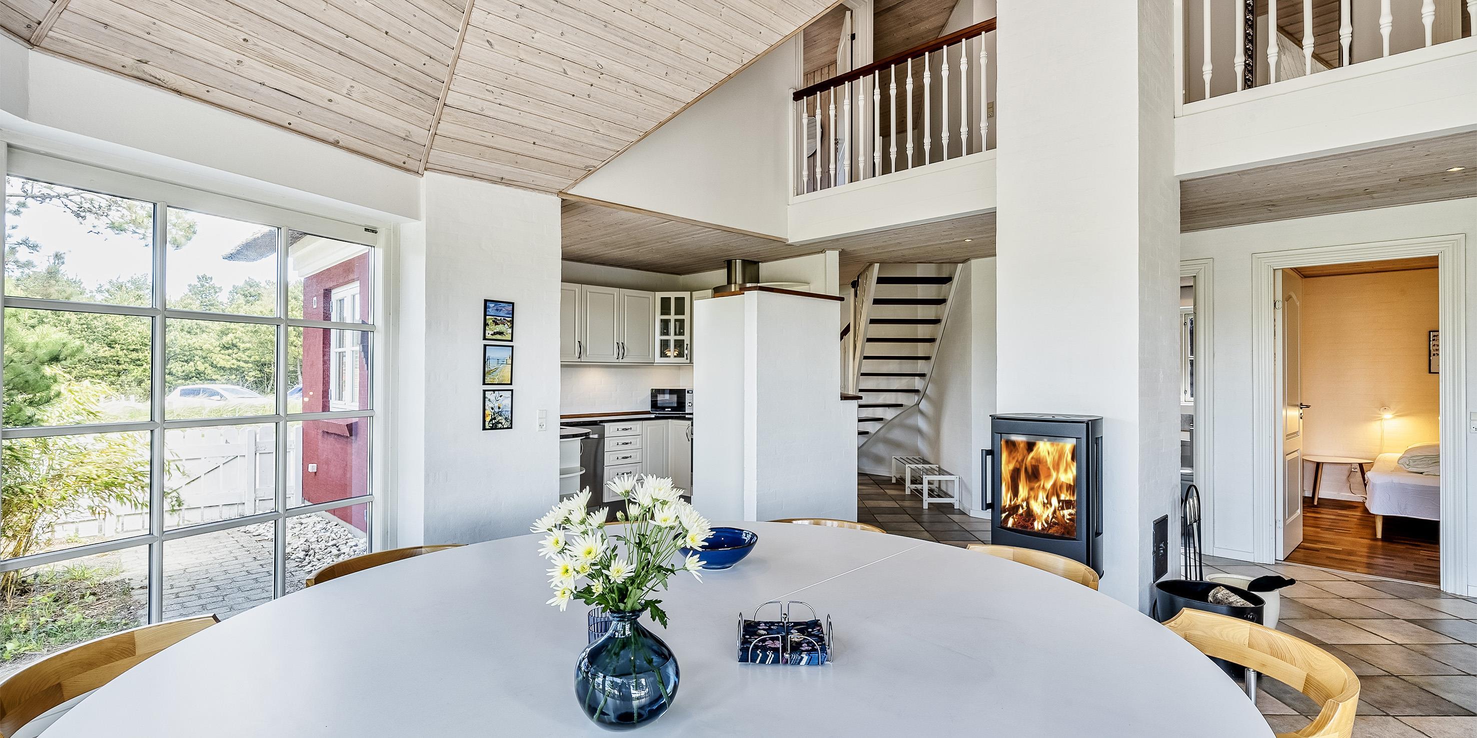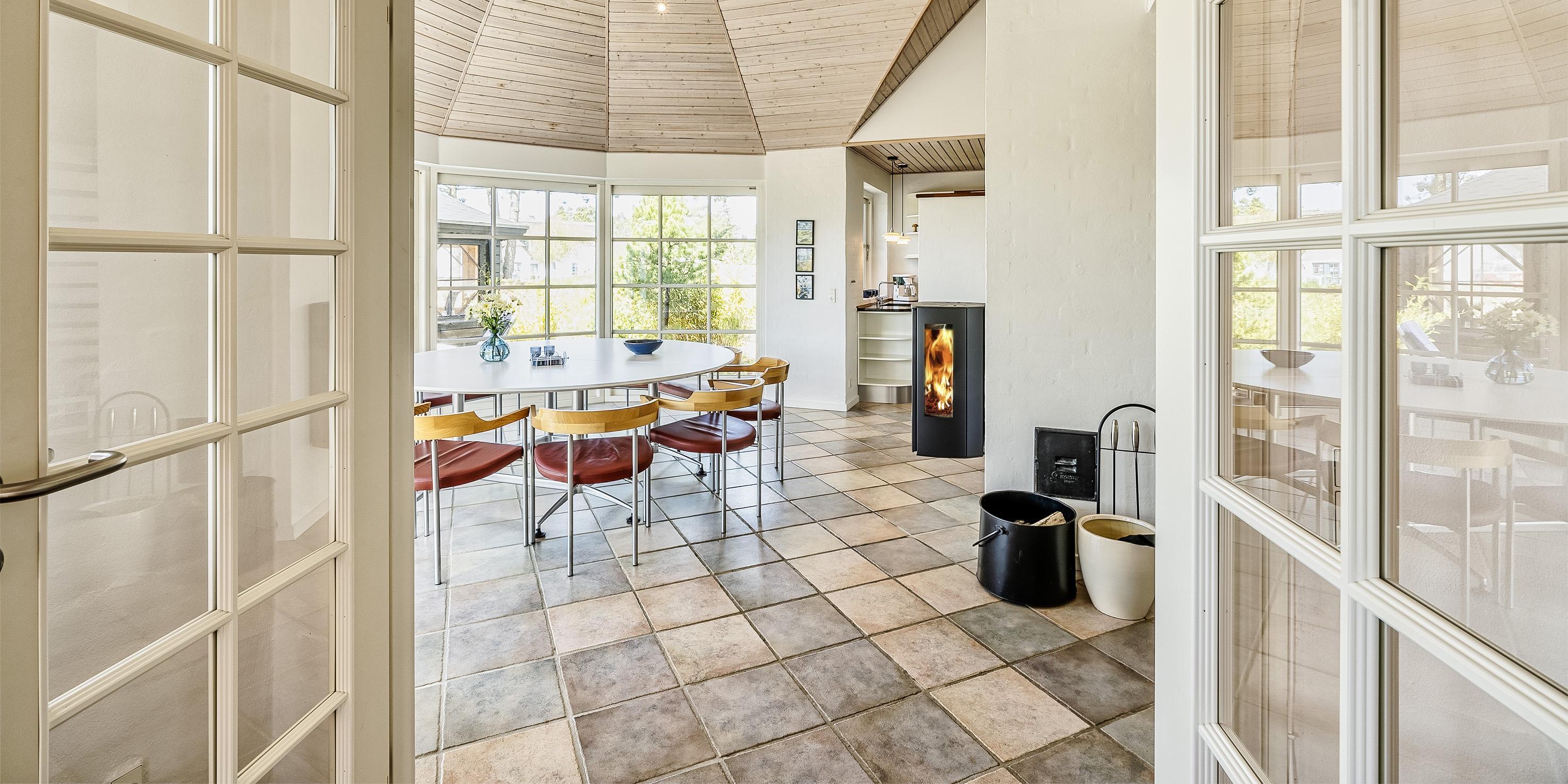 Sommerhuset: Entre indgangsparti med god plads til garderoben og ekstra opbevaring. Fra indgangspartiet forefindes der et bryggers med vaskemaskine og tørretumbler. Fra indgangspartiet kommer man ind til huset køkken-alrum med loft til kip, rummet fremstår lyst og dejligt med et stort vinduesparti. Køkkenet fremstår med alt komfort såsom opvaskemaskine, mikroovn, indbygningsovn, kogeplade, emhætte og et køleskab. Køkkenet er i åben forbindelse med alrummet. Her forefindes et stort spisebord ved det runde vinduesparti og med kig til brændeovnen. Dejlig opholdsstue med fjernsyn med google Chromecast, tv-pakke fra Stofa samt trådløs internetadgang. Herfra er der udgang til en dejlig terrasse miljø under den overdækkede terrasse og en stor ude jacuzzi. Dagen kan nydes fra morgen til aften på den store overdækkede terrasser og ydermere er der en syd-vestvendt fliseterrasse. Der er 5 rummelige soveværelser i huset: DS + DS + DS + 2S + 2S. I stueplan forefindes et stort badeværelse med wc, vask med underskab, bruseniche, sauna og en hjørnespa. Gæstetoilet med wc, bruser og bordplade med vask. Ydermere forefindes der et 49 kvm. aktivitetshus, der fremstår med en lille bar, billardbord, bordtennis, dartspil og et fodboldbord. Ydermere er rummet indrettet med en sofahjørne med smart-TV. Her forefindes en køl- og fryseskab.