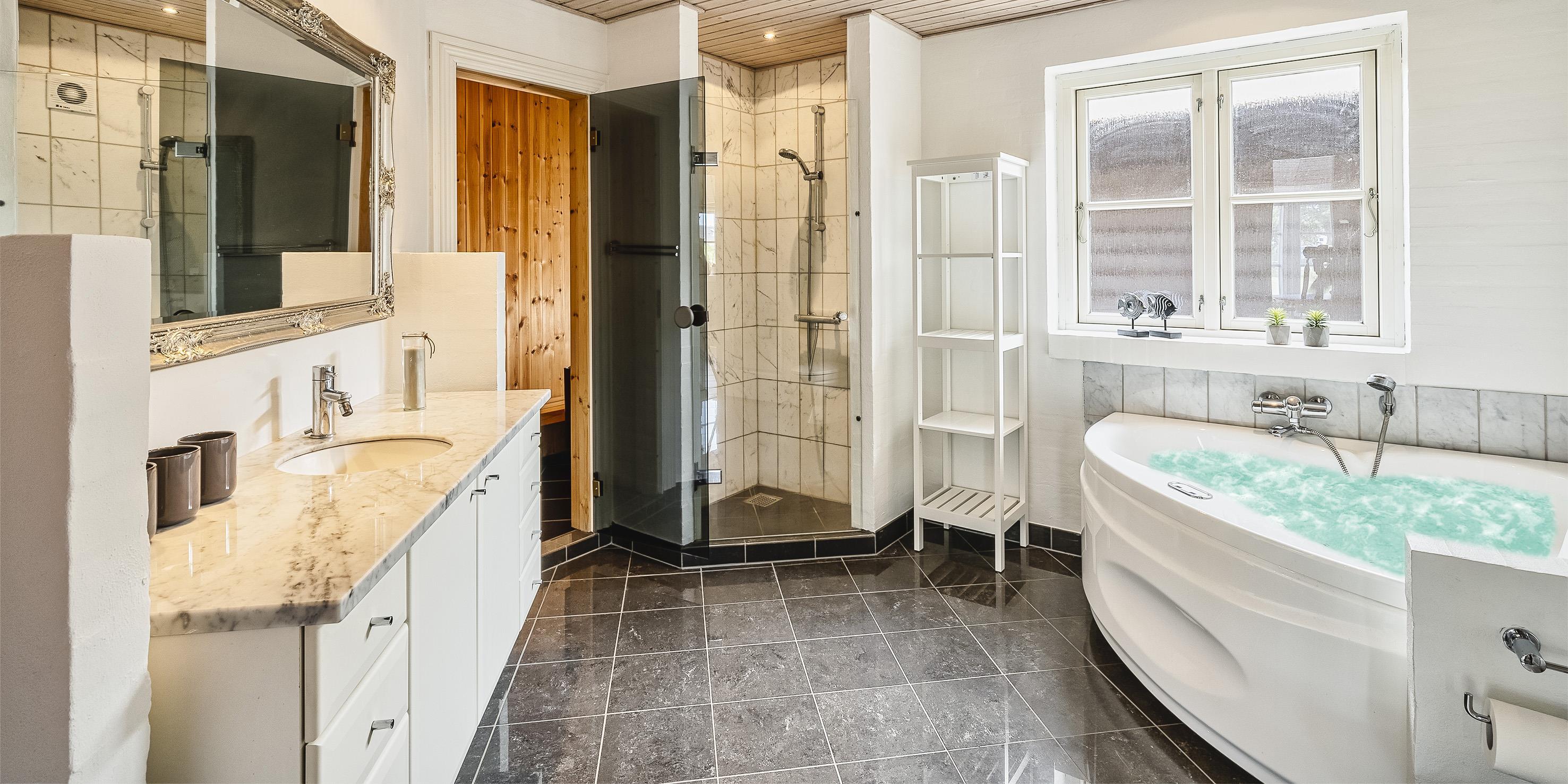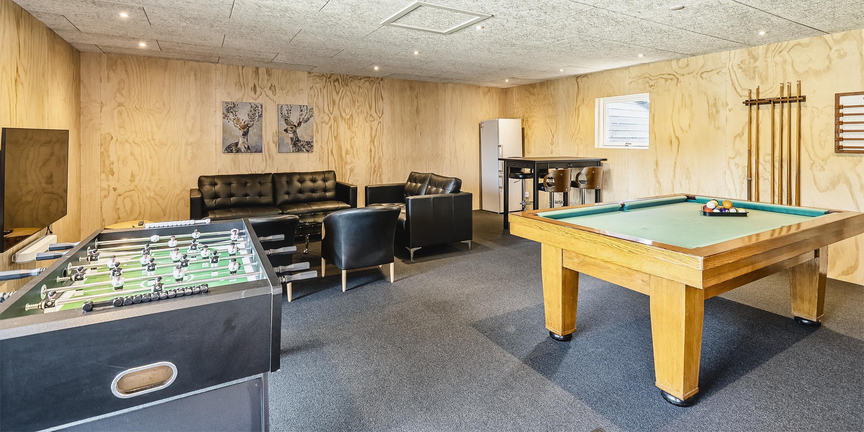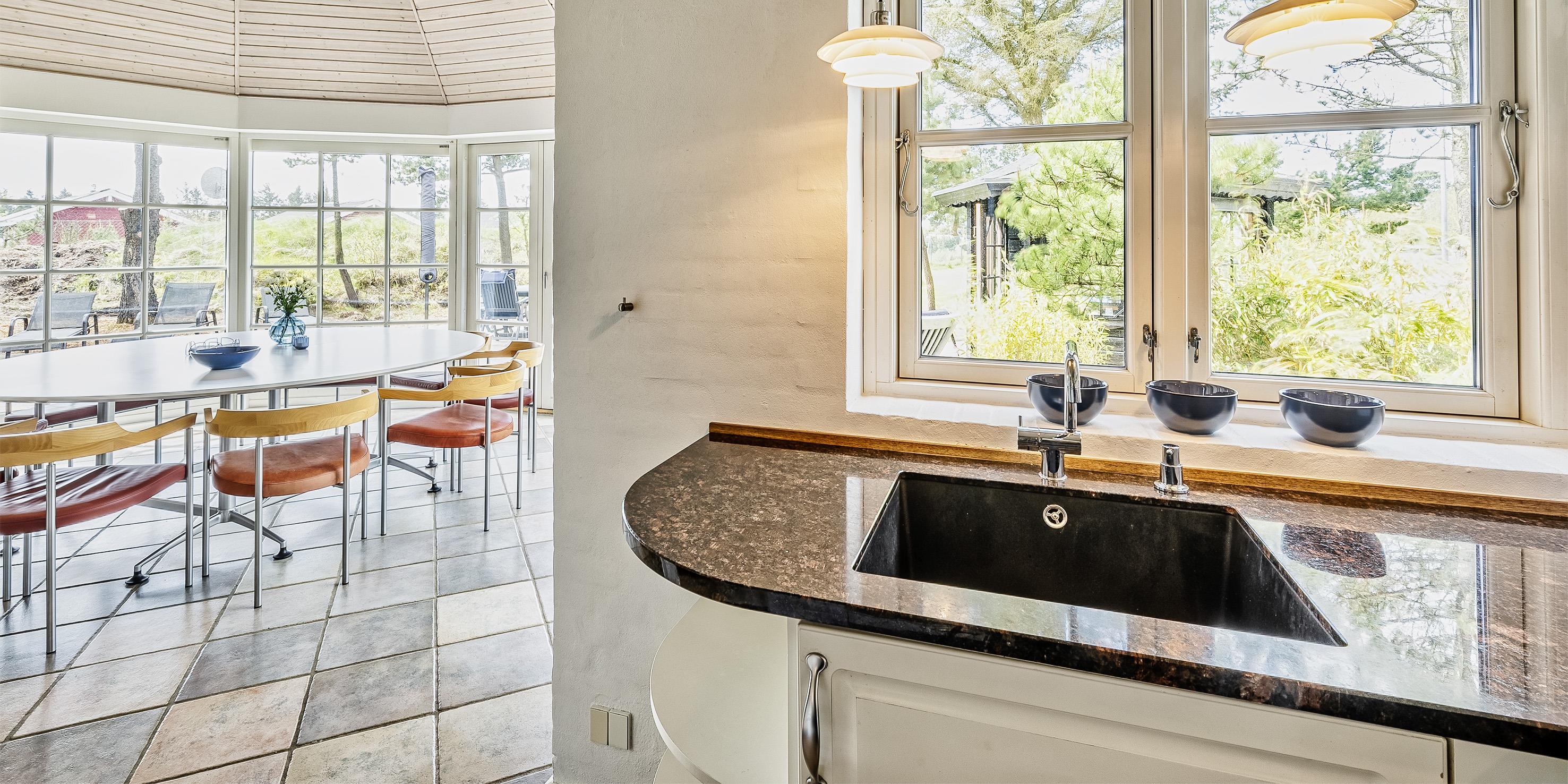 Sommerhuset: Entre indgangsparti med god plads til garderoben og ekstra opbevaring. Fra indgangspartiet forefindes der et bryggers med vaskemaskine og tørretumbler. Fra indgangspartiet kommer man ind til huset køkken-alrum med loft til kip, rummet fremstår lyst og dejligt med et stort vinduesparti. Køkkenet fremstår med alt komfort såsom opvaskemaskine, mikroovn, indbygningsovn, kogeplade, emhætte og et køleskab. Køkkenet er i åben forbindelse med alrummet. Her forefindes et stort spisebord ved det runde vinduesparti og med kig til brændeovnen. Dejlig opholdsstue med fjernsyn med google Chromecast, tv-pakke fra Stofa samt trådløs internetadgang. Herfra er der udgang til en dejlig terrasse miljø under den overdækkede terrasse og en stor ude jacuzzi. Dagen kan nydes fra morgen til aften på den store overdækkede terrasser og ydermere er der en syd-vestvendt fliseterrasse. Der er 5 rummelige soveværelser i huset: DS + DS + DS + 2S + 2S. I stueplan forefindes et stort badeværelse med wc, vask med underskab, bruseniche, sauna og en hjørnespa. Gæstetoilet med wc, bruser og bordplade med vask. Ydermere forefindes der et 49 kvm. aktivitetshus, der fremstår med en lille bar, billardbord, bordtennis, dartspil og et fodboldbord. Ydermere er rummet indrettet med en sofahjørne med smart-TV. Her forefindes en køl- og fryseskab.