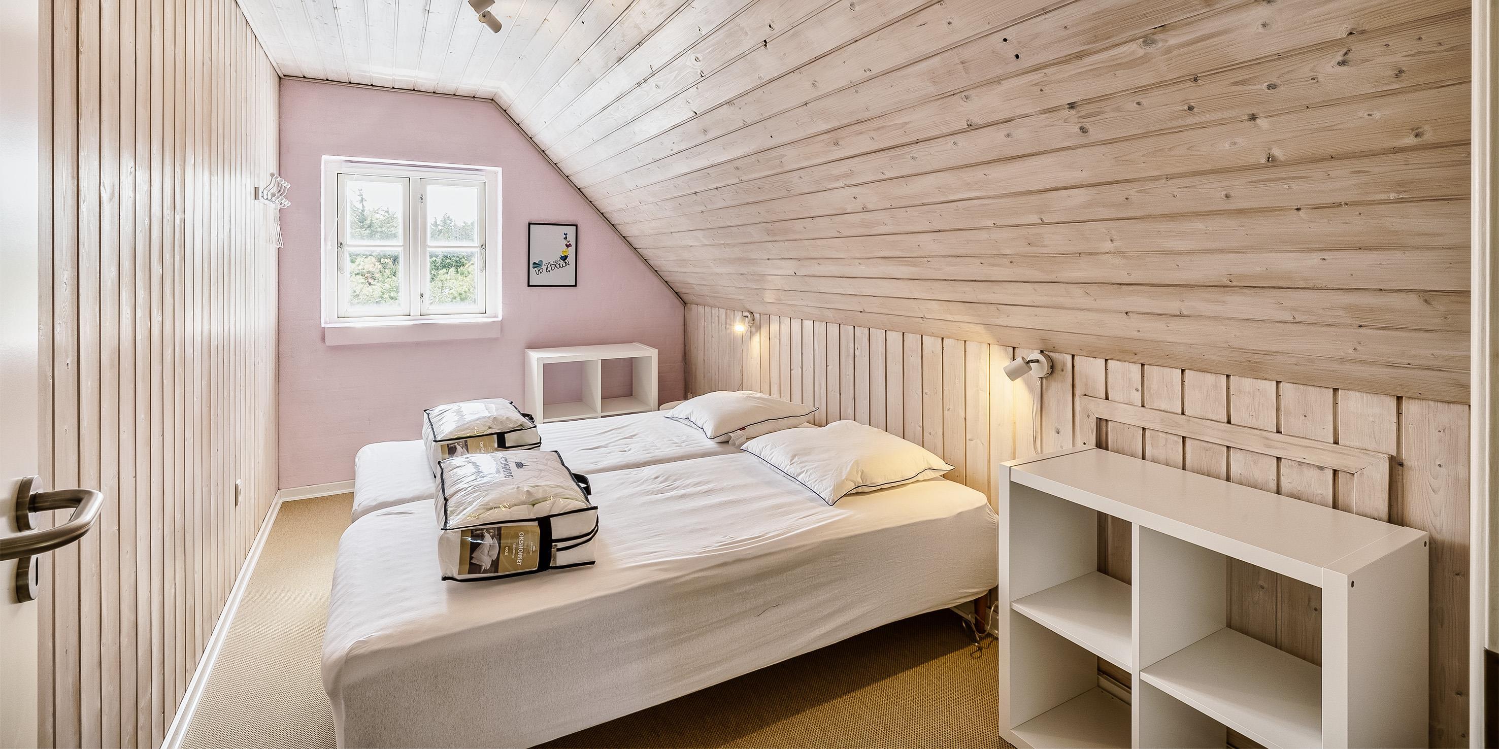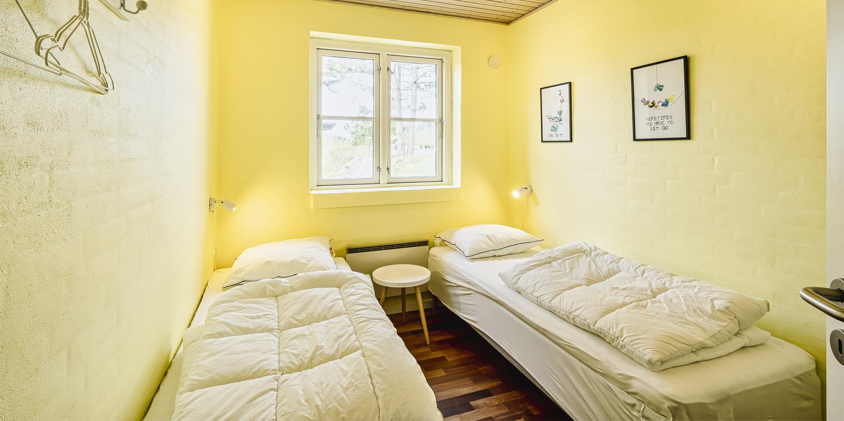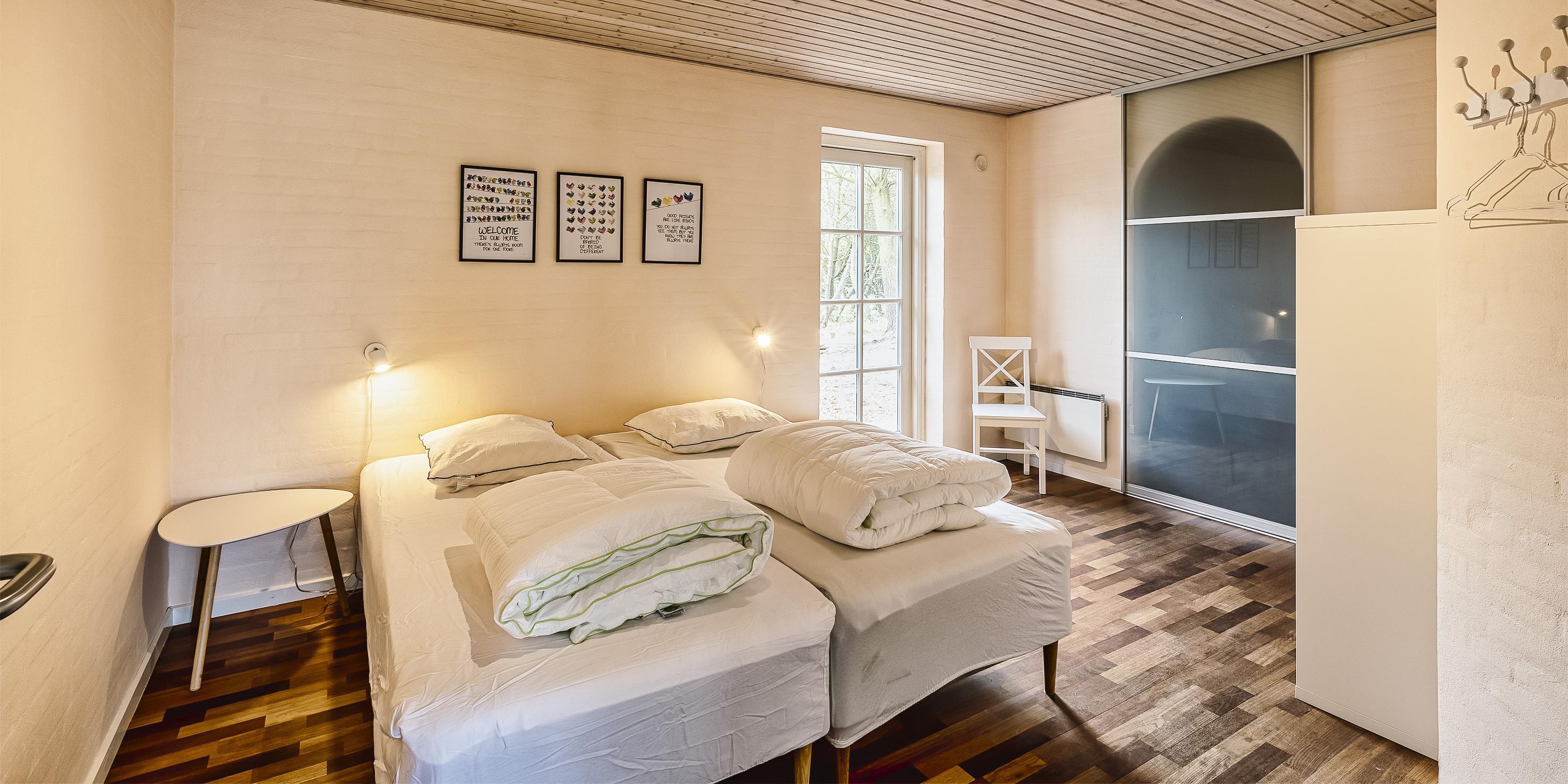 5 soveværelser. 3 med dobbeltseng 180x200 cm. 2 hver med 2 enkeltsenge (á 90x200 cm)