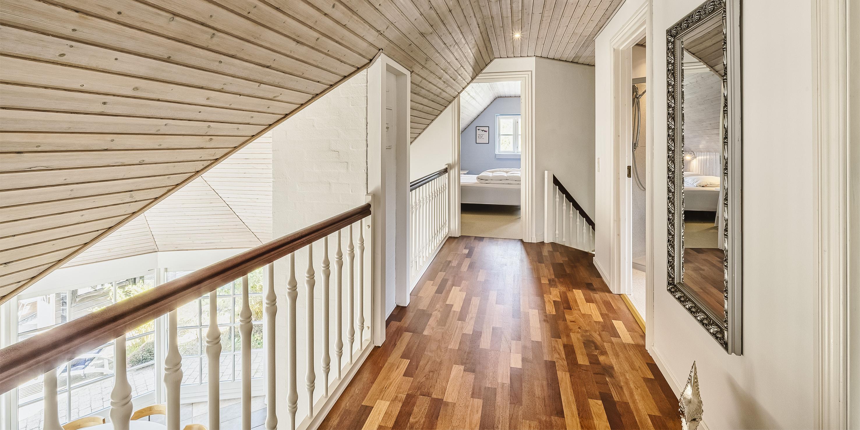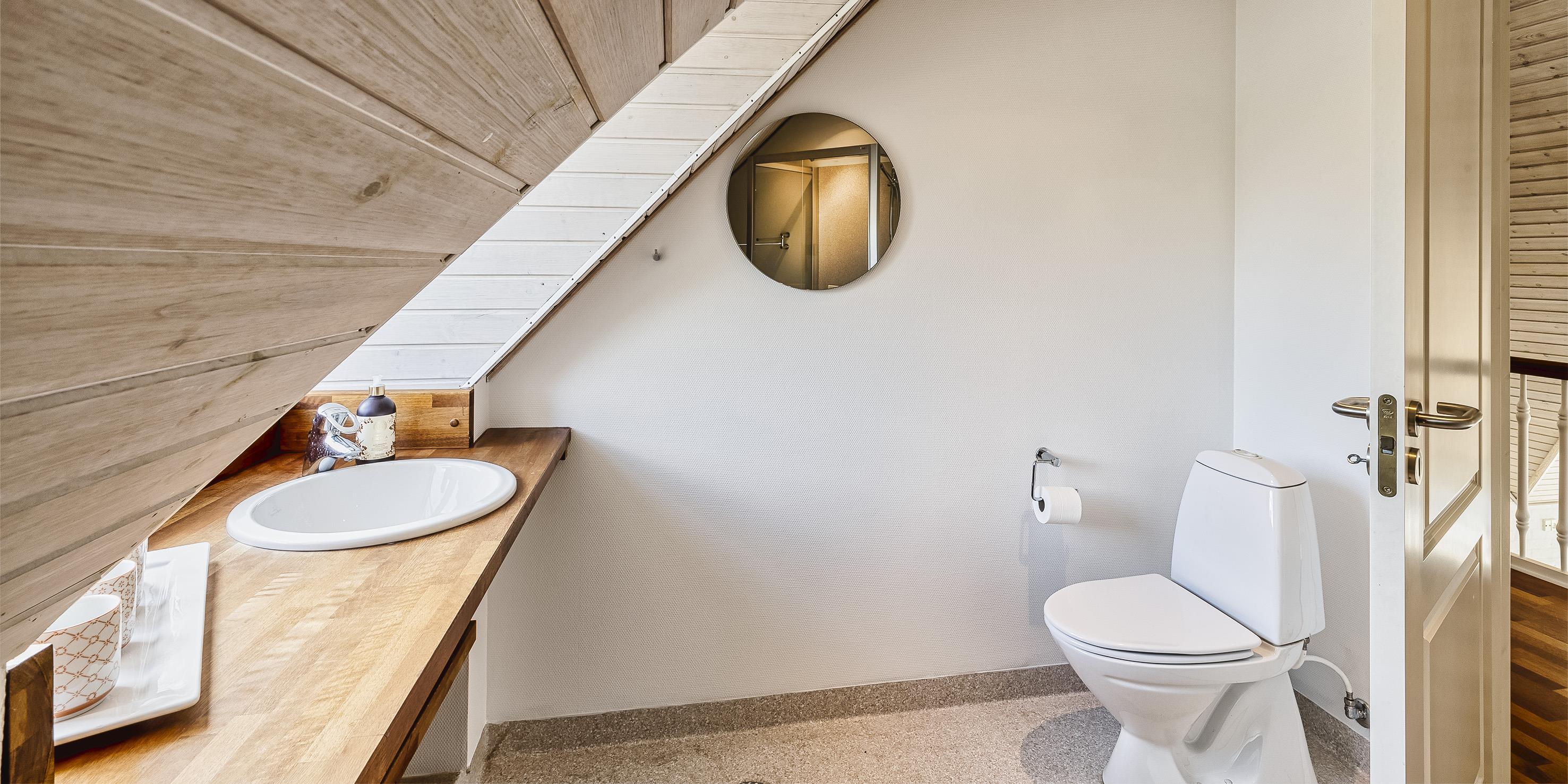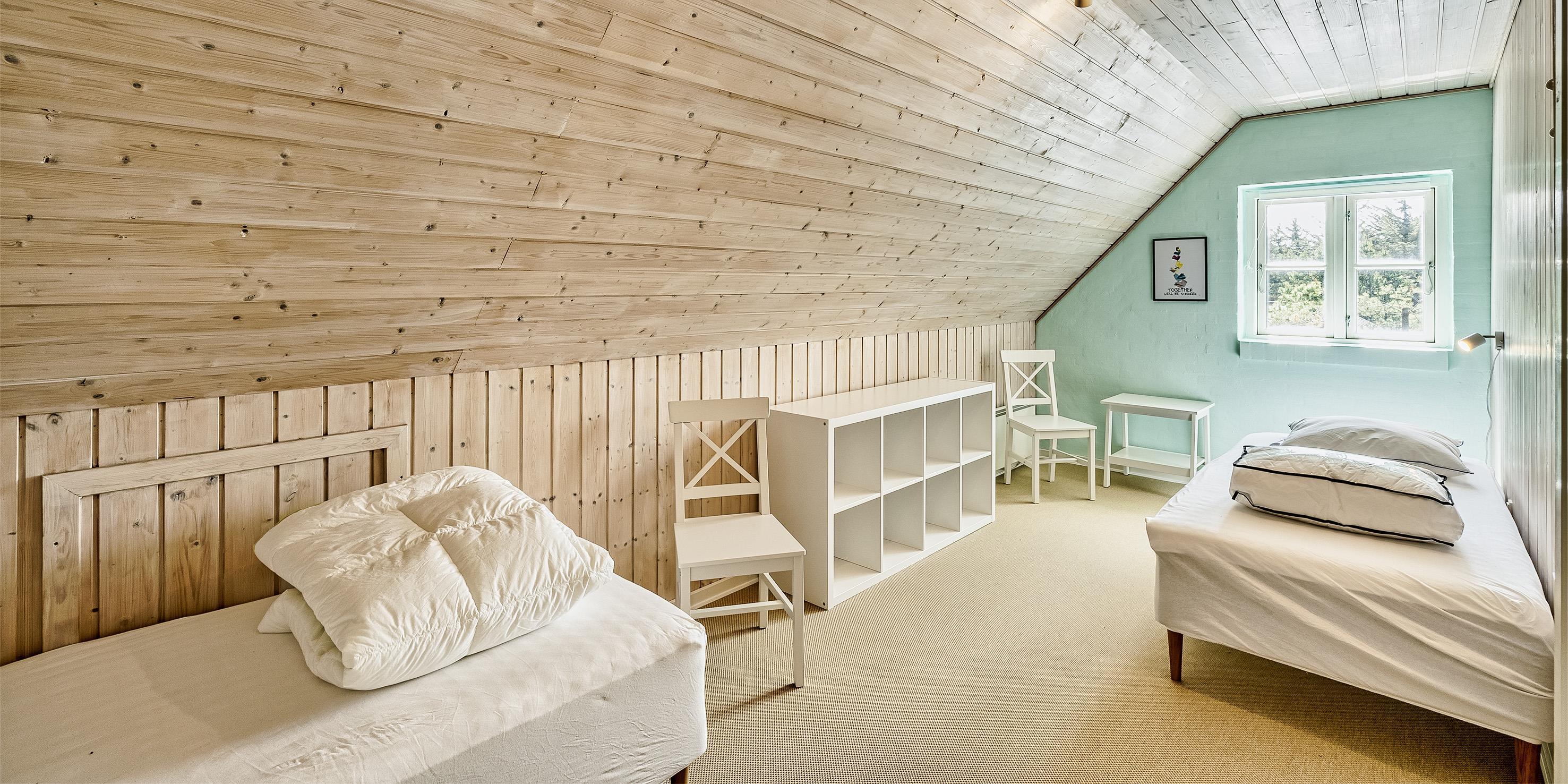 5 soveværelser. 3 med dobbeltseng 180x200 cm. 2 hver med 2 enkeltsenge (á 90x200 cm)