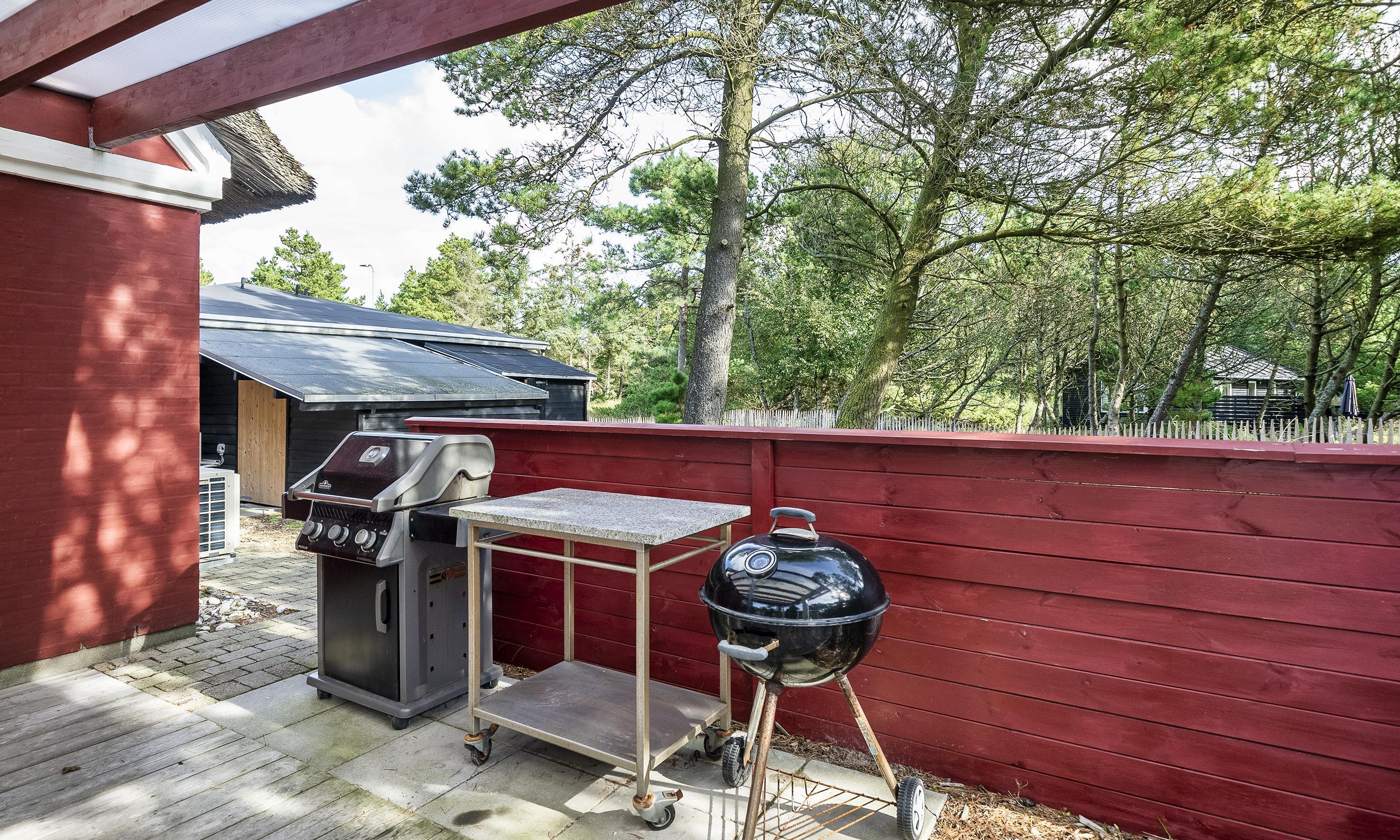 De udvendige faciliteter byder ydermere på en udejacuzzi, legeplads for børnene med gynger og en sandkasse. Der er stillet gasgril og kufglegril til rådighed - for garantere ikke for tilstanden af grillene. Der er 400 meter til nærmeste restaurant og 100 meter til nærmeste købmand og en minigolfbane. Huset er tæt beliggende på et stort skov- og naturareal hvor kronvildtet kan opleves på tæt hold. Her er der rig mulighed for at nyde skovens ro på en løbetur eller på en gåtur og hen over efteråret byder skovbunden på mange spiselige svampe.