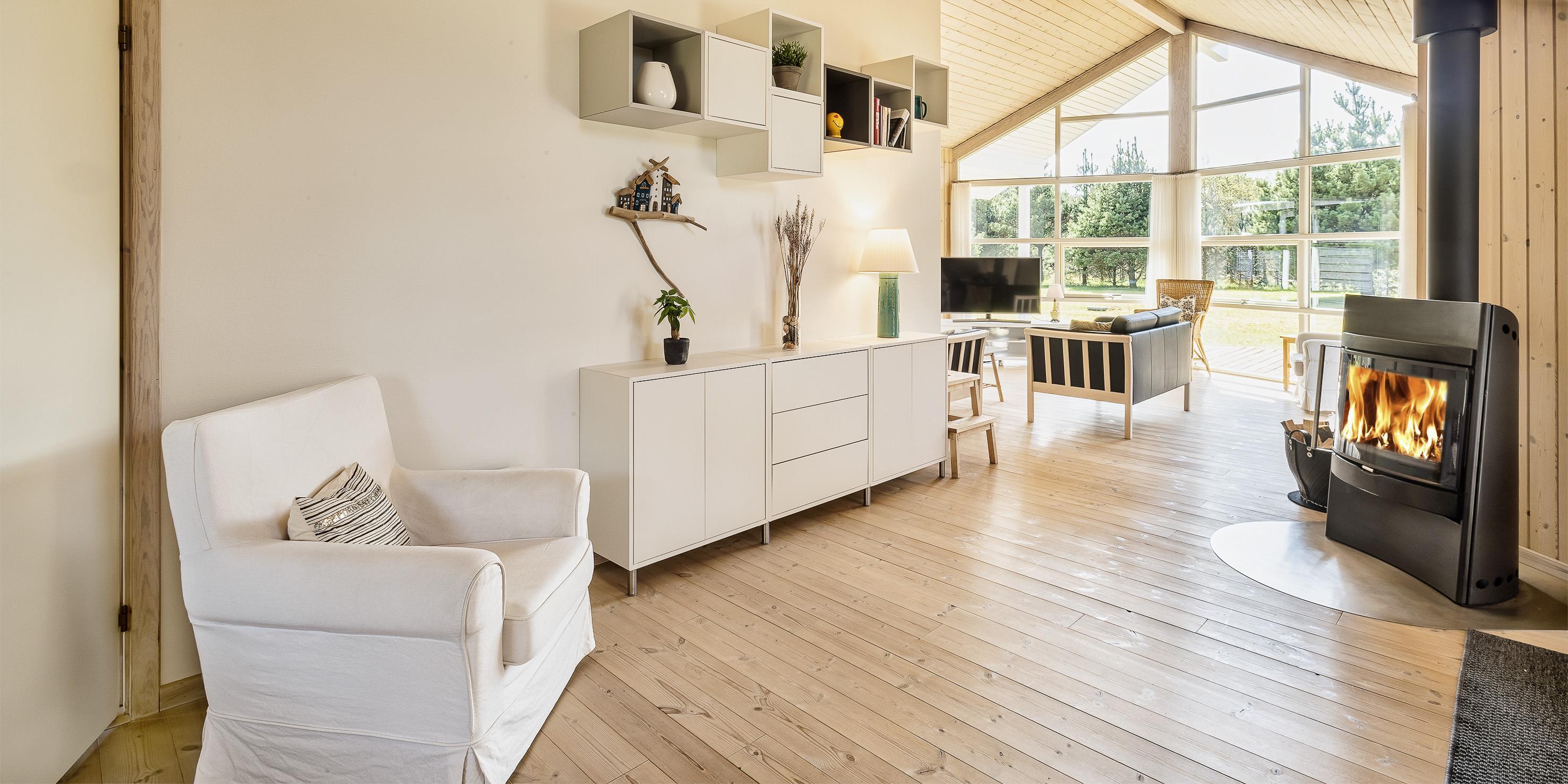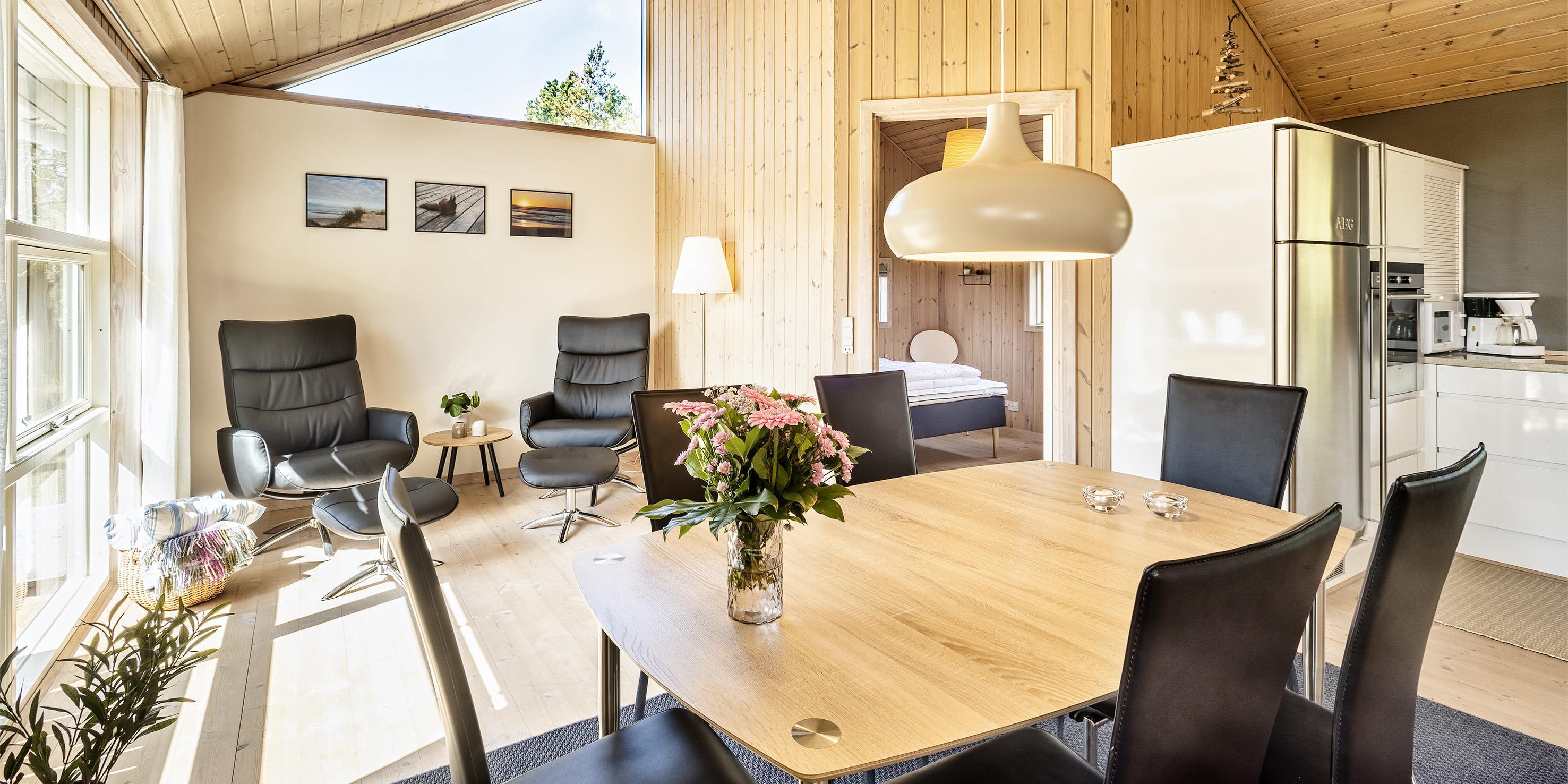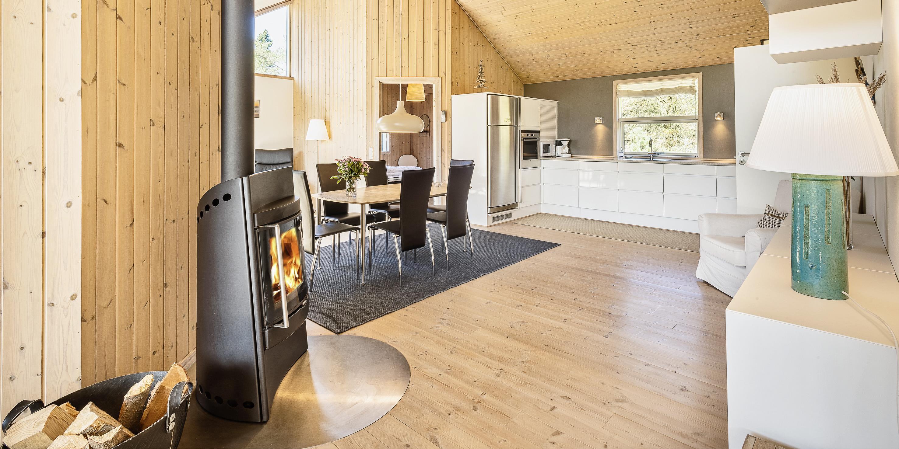 Huset indeholder: entre, med god garderobeplads og vaskemaskine og tørretumbler. Fra entreen kommer man ind til rummeligt køkkenalrummet, som ligger i åben forbindelse med spisestuen. Køkkenet er indrettet med alt komfort som køle-fryseskab, bageovn, mikroovn, opvaskemaskine og keramiske kogeplader. Spisestueafdelingen er indrettet med et stort spisebord, hvorfra der er kig til brændeovn. Opholdsstuen kommer i åben forbindelse med spisestuen, der ligeledes har kig til brændeovnen og er med store panoramavinduer, hvor udsigten kan nydes ud over haven. Fjernsyn med danske og udenlandske kanaler (Stofa, lille pak). Huset råder over 3 store soveværelser: DS + 2S + 2S. Masterbadeværelse med væghængt toilet, vaskearrangement, stor muret brusekabine.