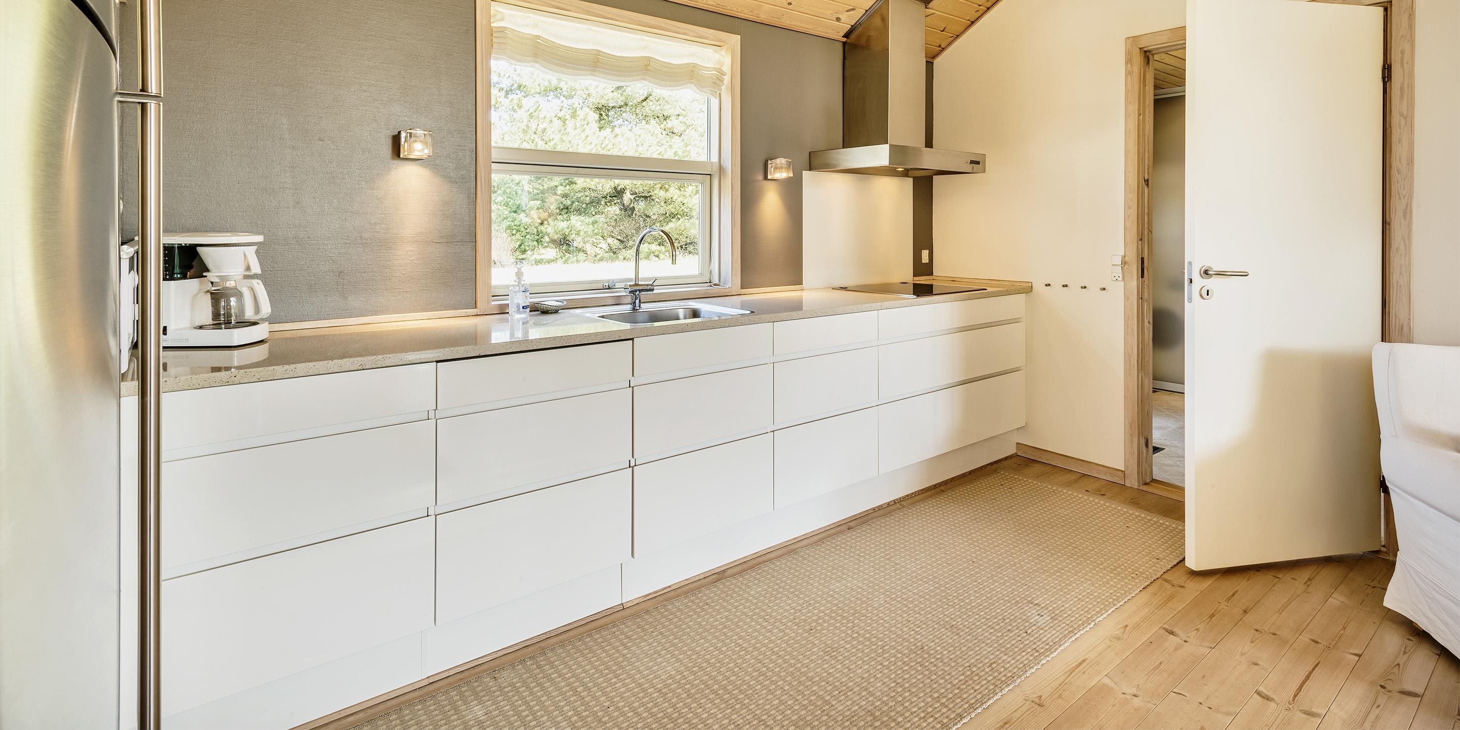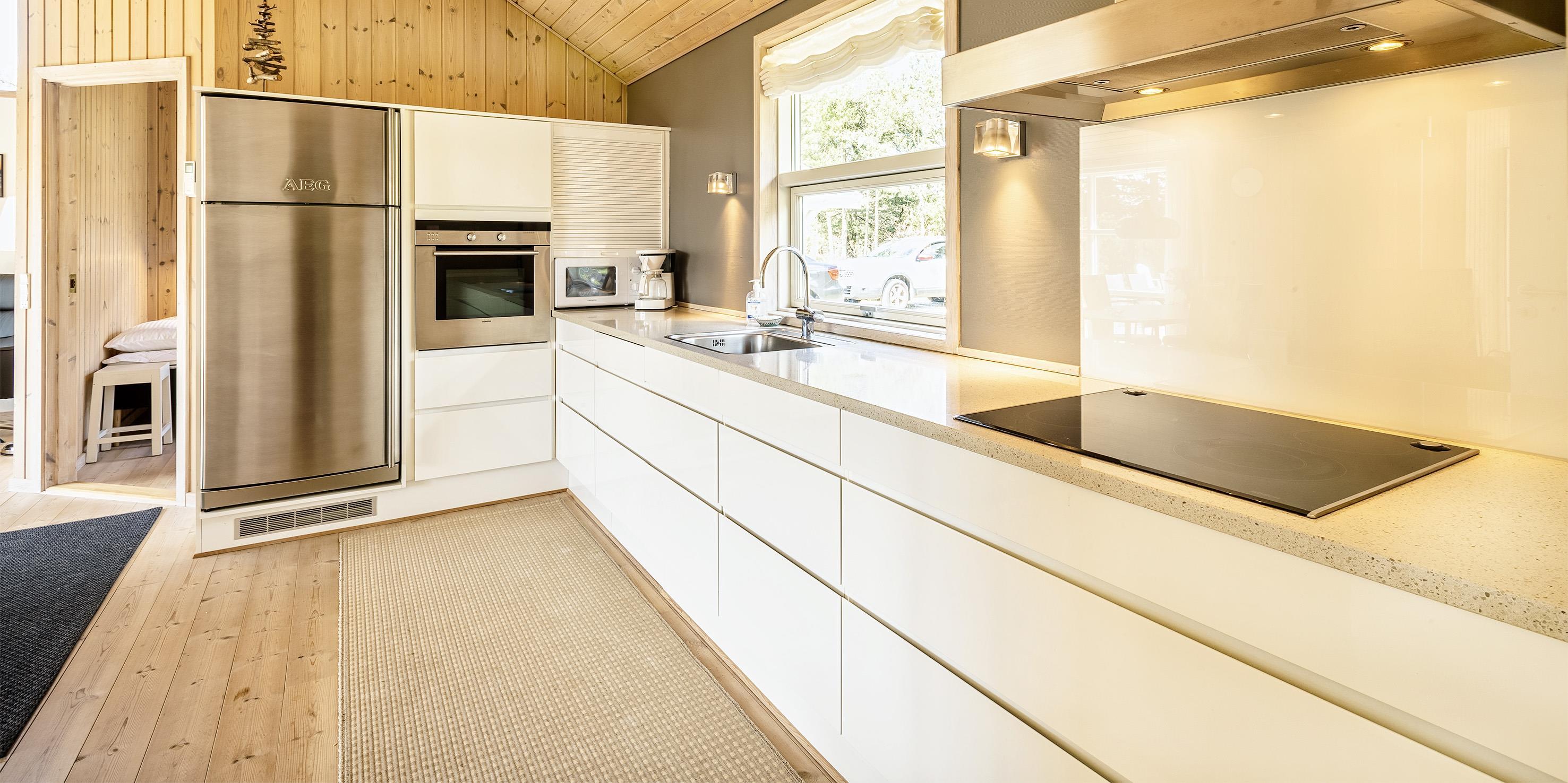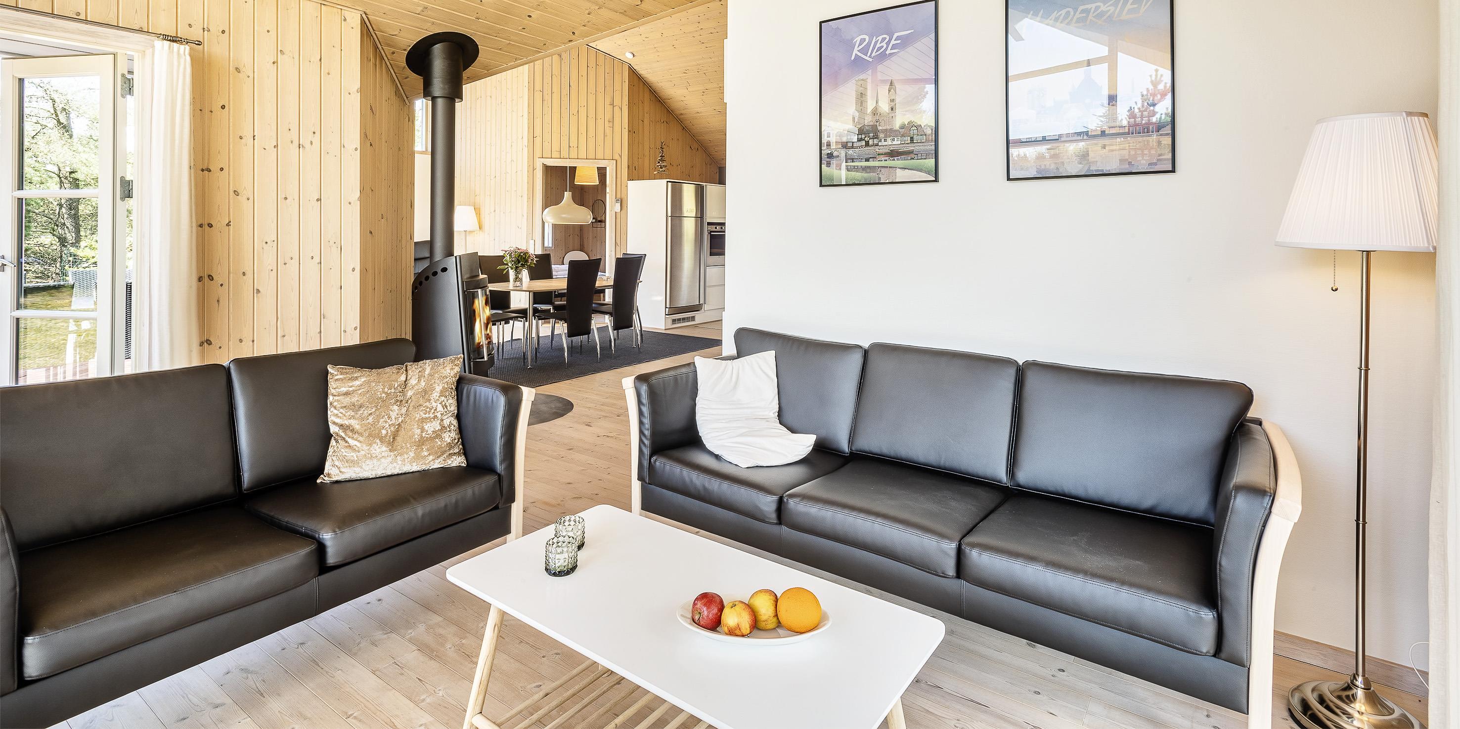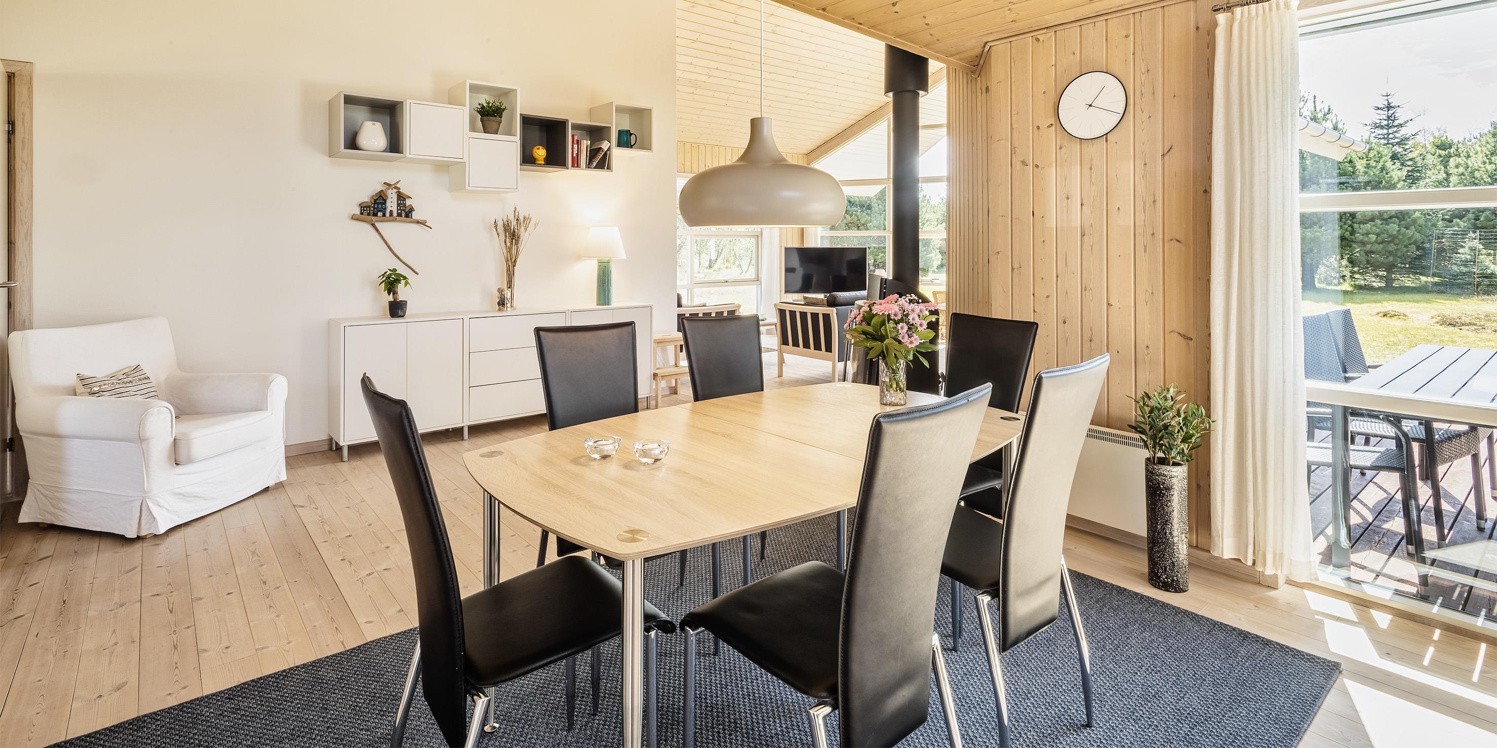 Huset indeholder: entre, med god garderobeplads og vaskemaskine og tørretumbler. Fra entreen kommer man ind til rummeligt køkkenalrummet, som ligger i åben forbindelse med spisestuen. Køkkenet er indrettet med alt komfort som køle-fryseskab, bageovn, mikroovn, opvaskemaskine og keramiske kogeplader. Spisestueafdelingen er indrettet med et stort spisebord, hvorfra der er kig til brændeovn. Opholdsstuen kommer i åben forbindelse med spisestuen, der ligeledes har kig til brændeovnen og er med store panoramavinduer, hvor udsigten kan nydes ud over haven. Fjernsyn med danske og udenlandske kanaler (Stofa, lille pak). Huset råder over 3 store soveværelser: DS + 2S + 2S. Masterbadeværelse med væghængt toilet, vaskearrangement, stor muret brusekabine.