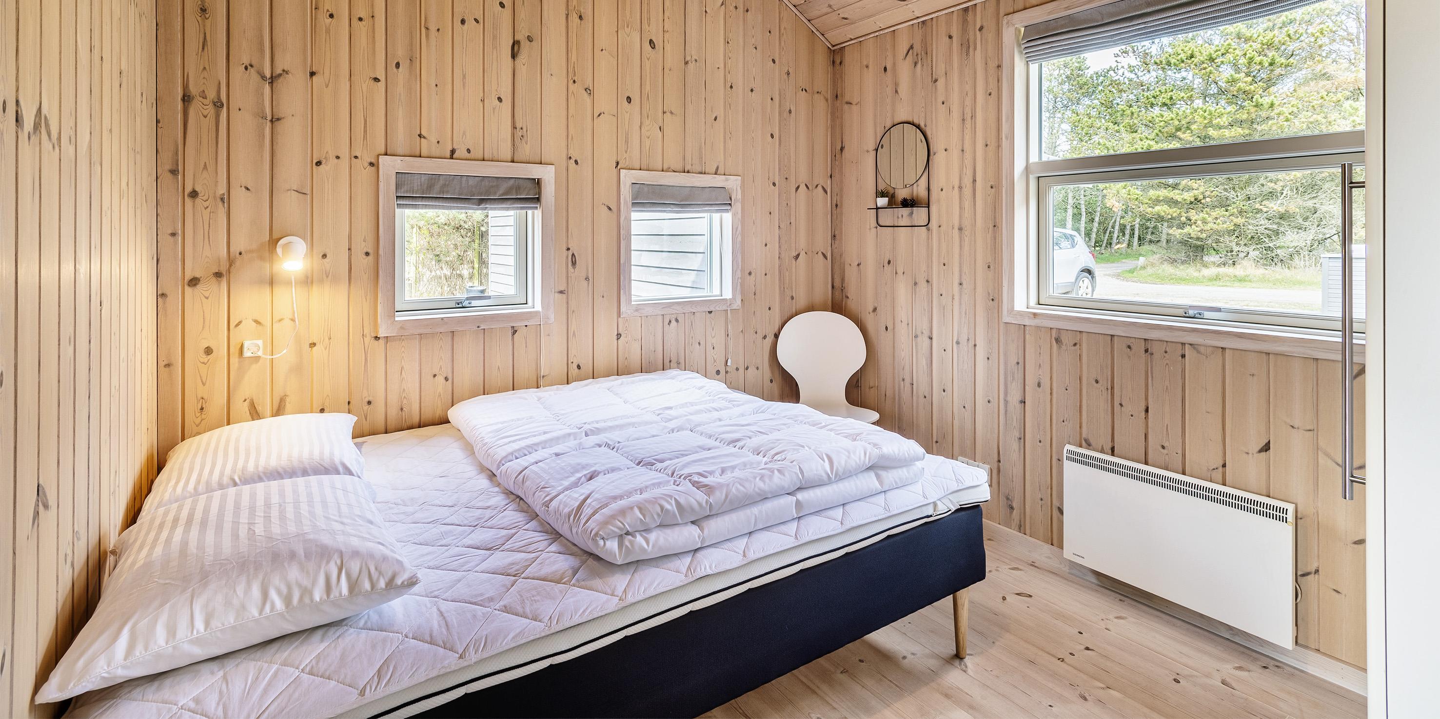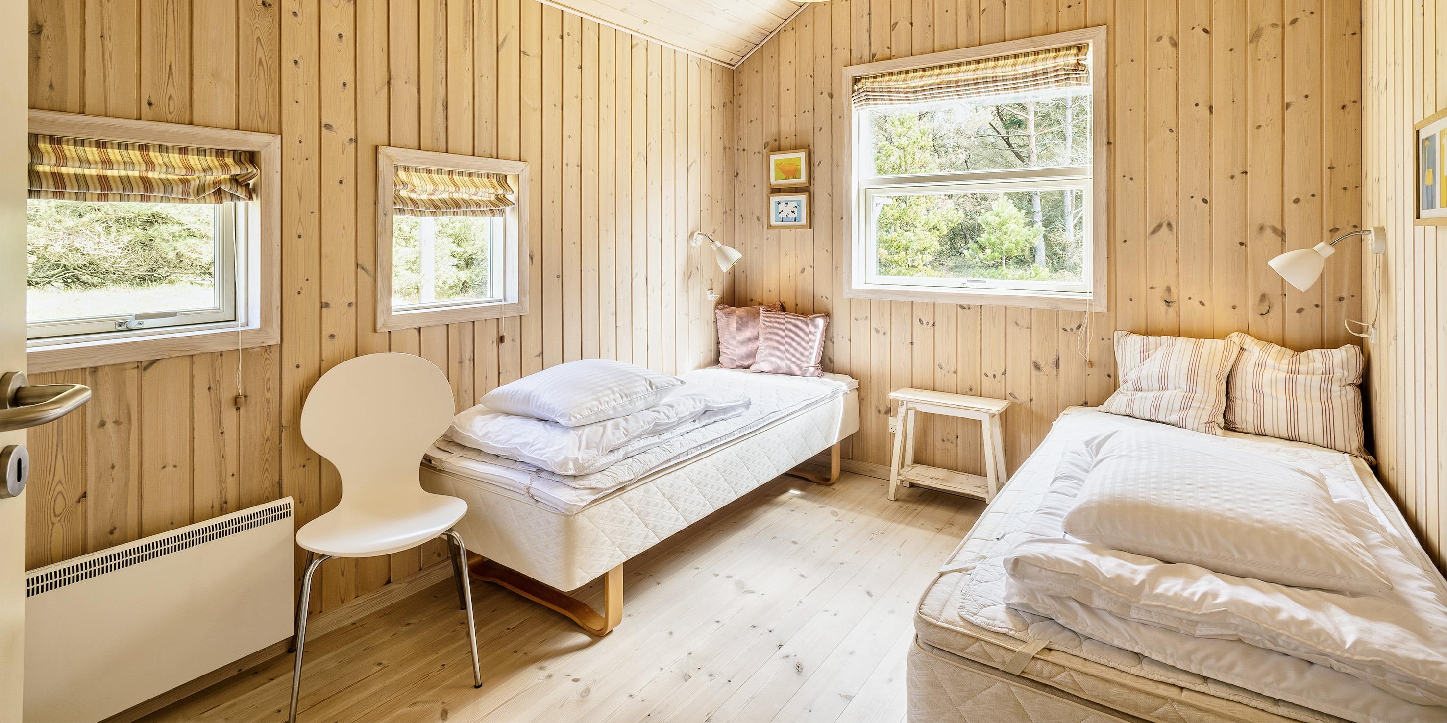 3 soveværelser. 1 med dobbeltseng 140x200 cm. 2 hver med 2 enkeltsenge (á 90x200 cm)