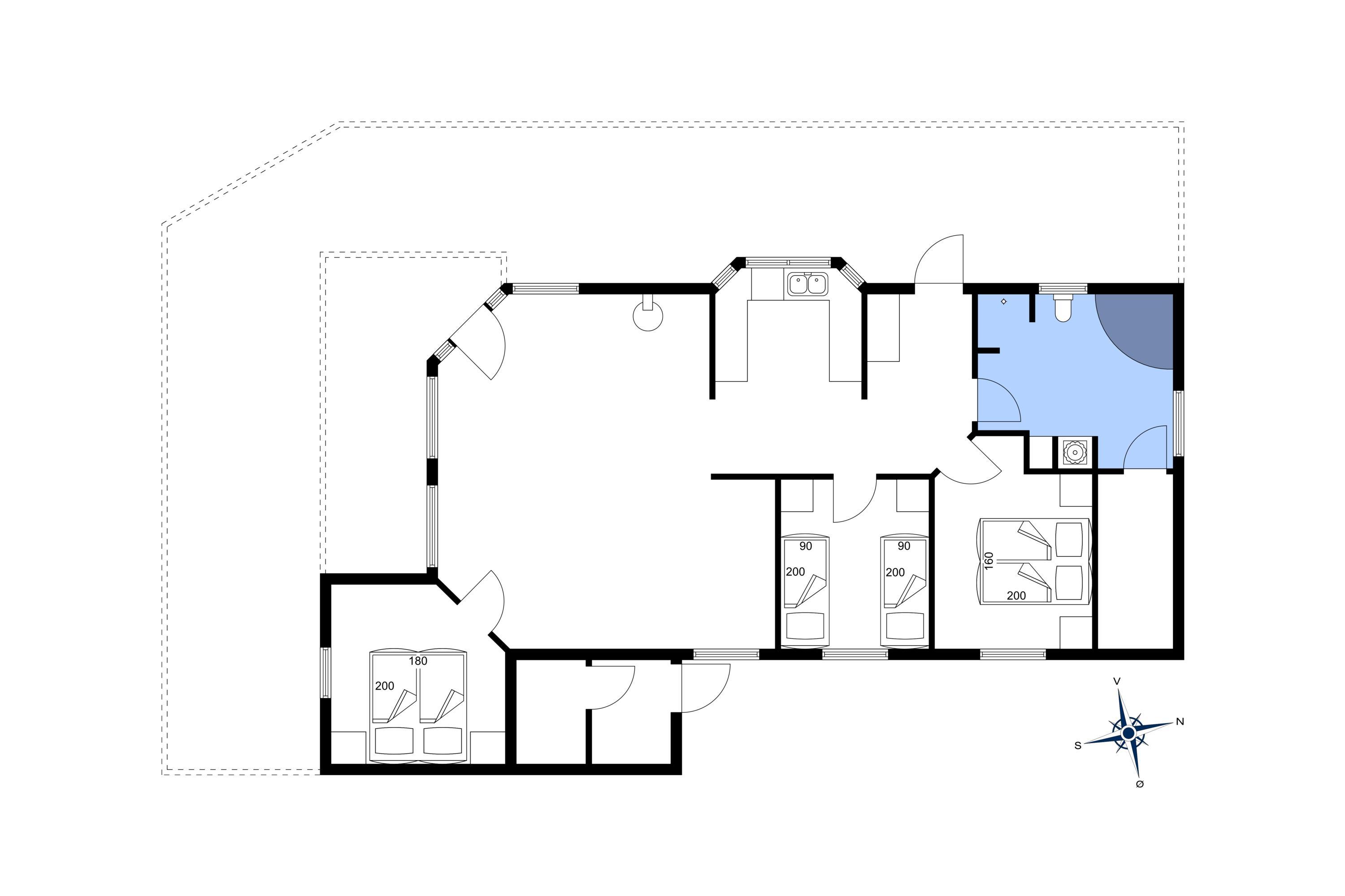 3 soveværelser. 2 med dobbeltseng 180x200 cm. 1 med 2 enkeltsenge (á 90x200 cm)