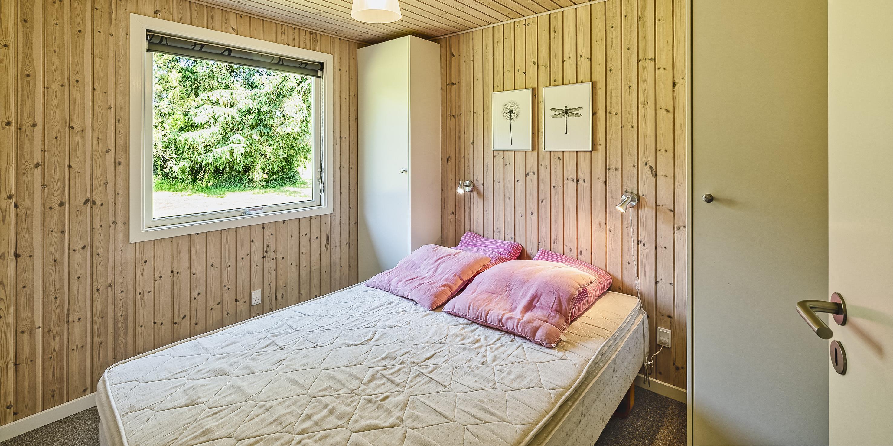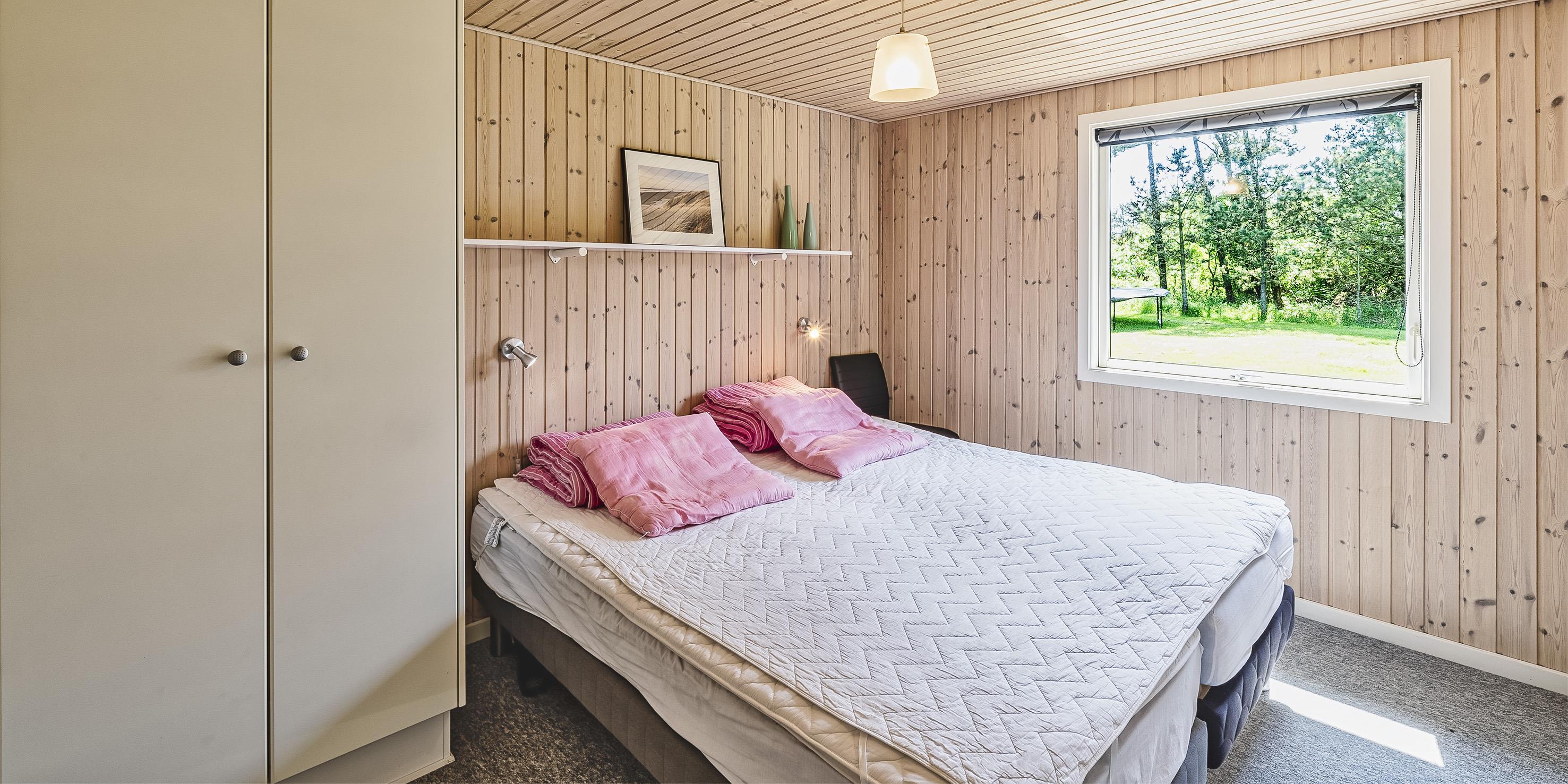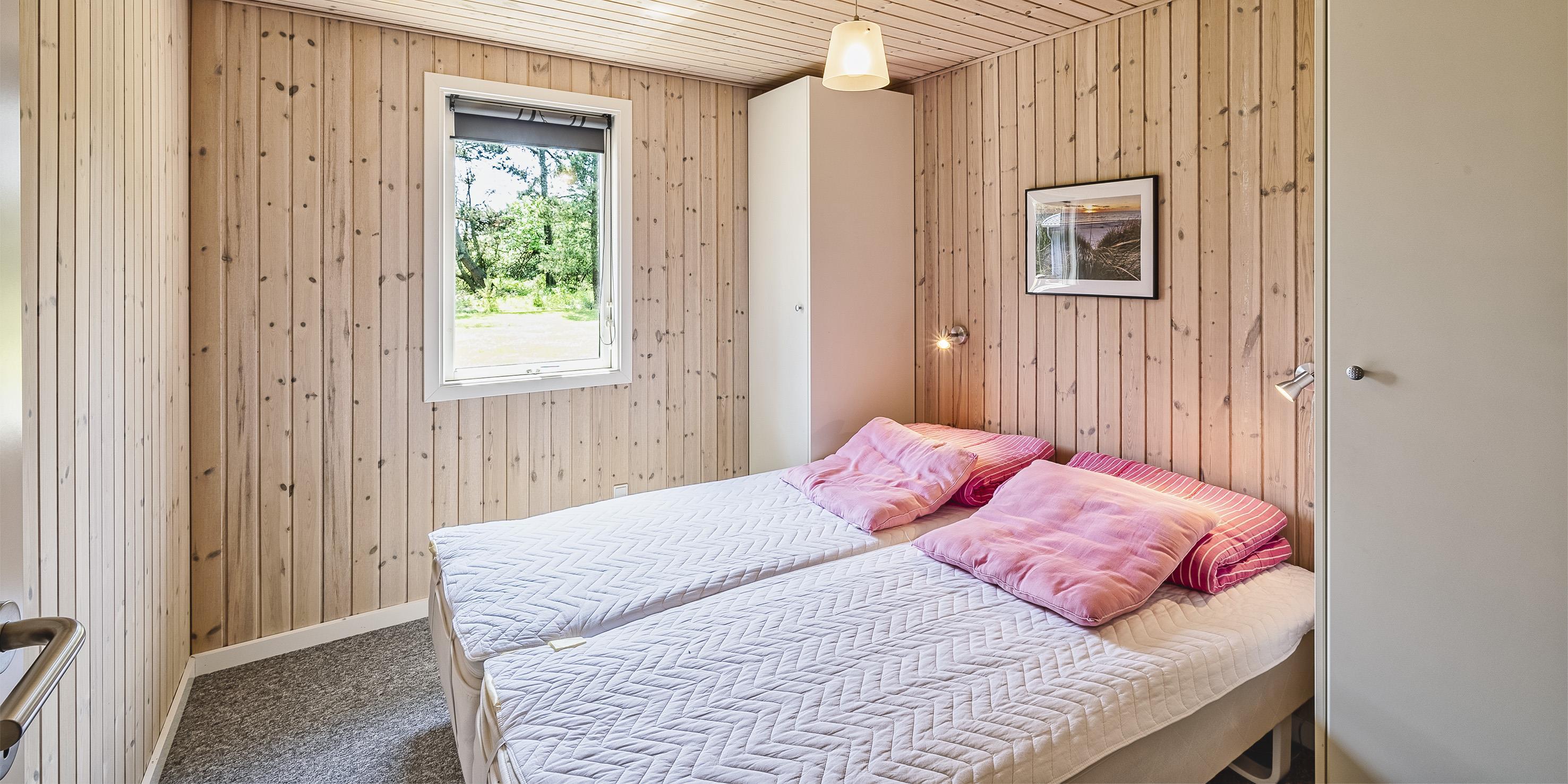 4 soveværelser. 2 med dobbeltseng 180x200 cm. 1 smal dobbeltseng 160x200 cm. 1 med 1 enkeltsenge (á 90x200 cm)